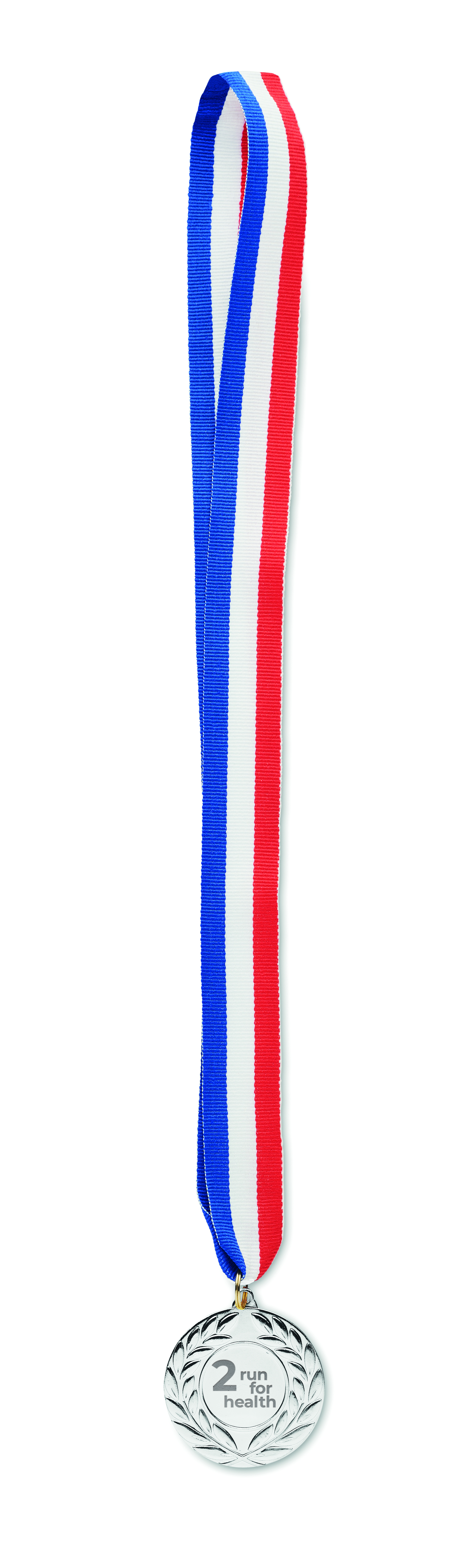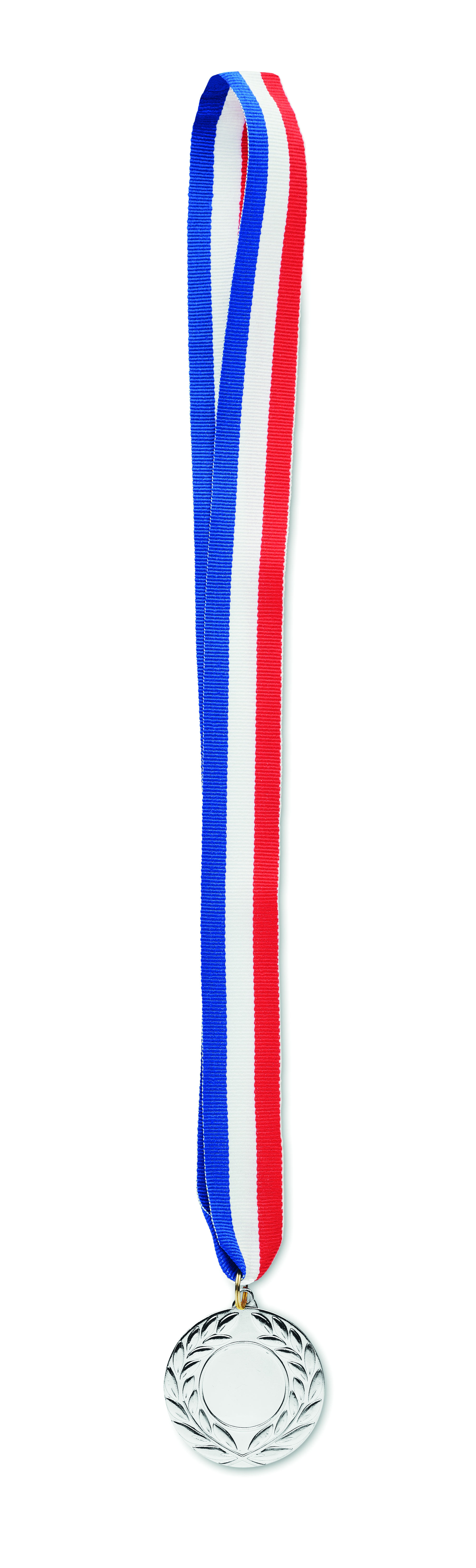 Medal wykonany z żelaza z poliestrowym paskiem w kolorach niebieskim, białym i czerwonym. Średnica 5 cm