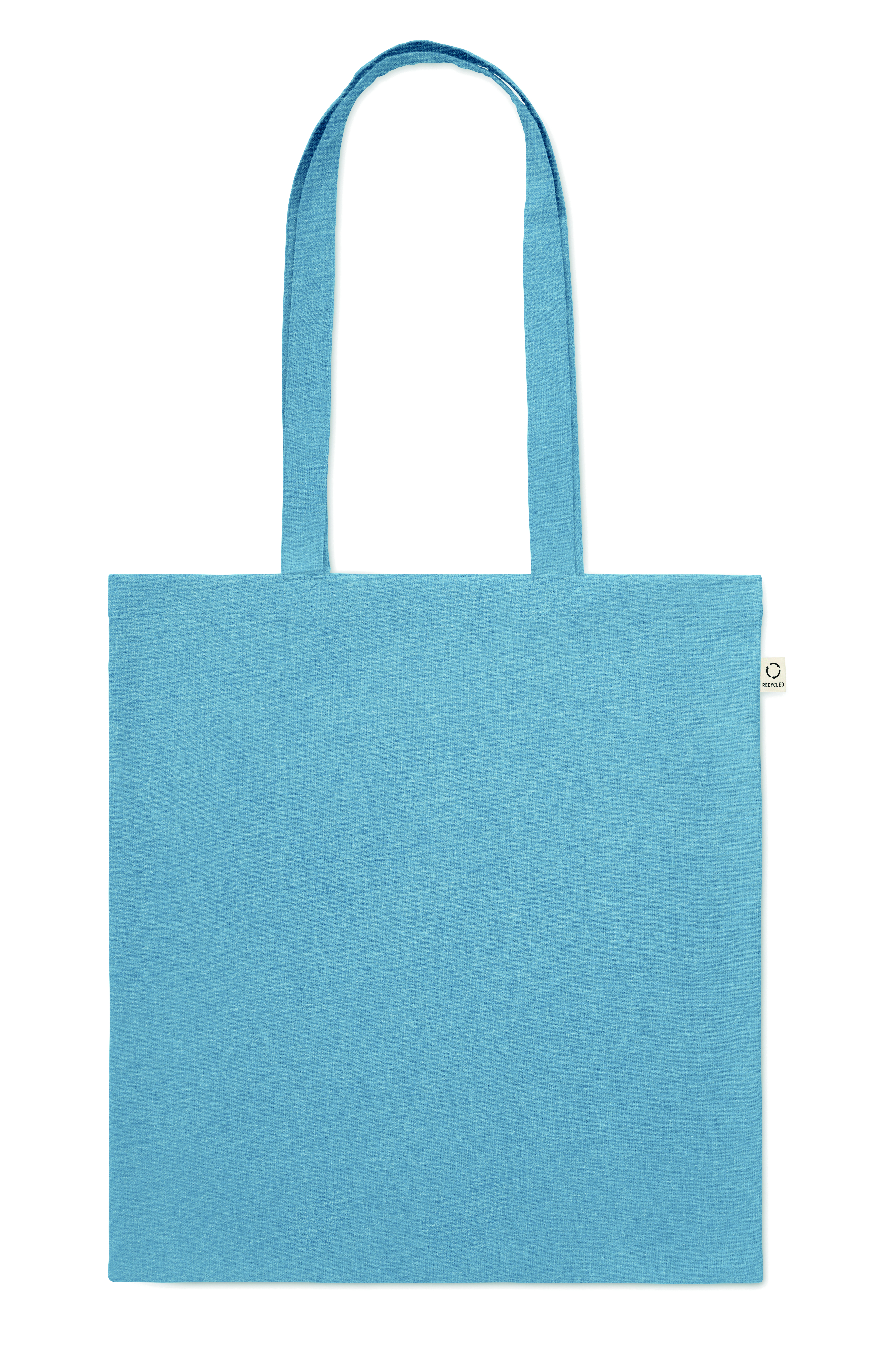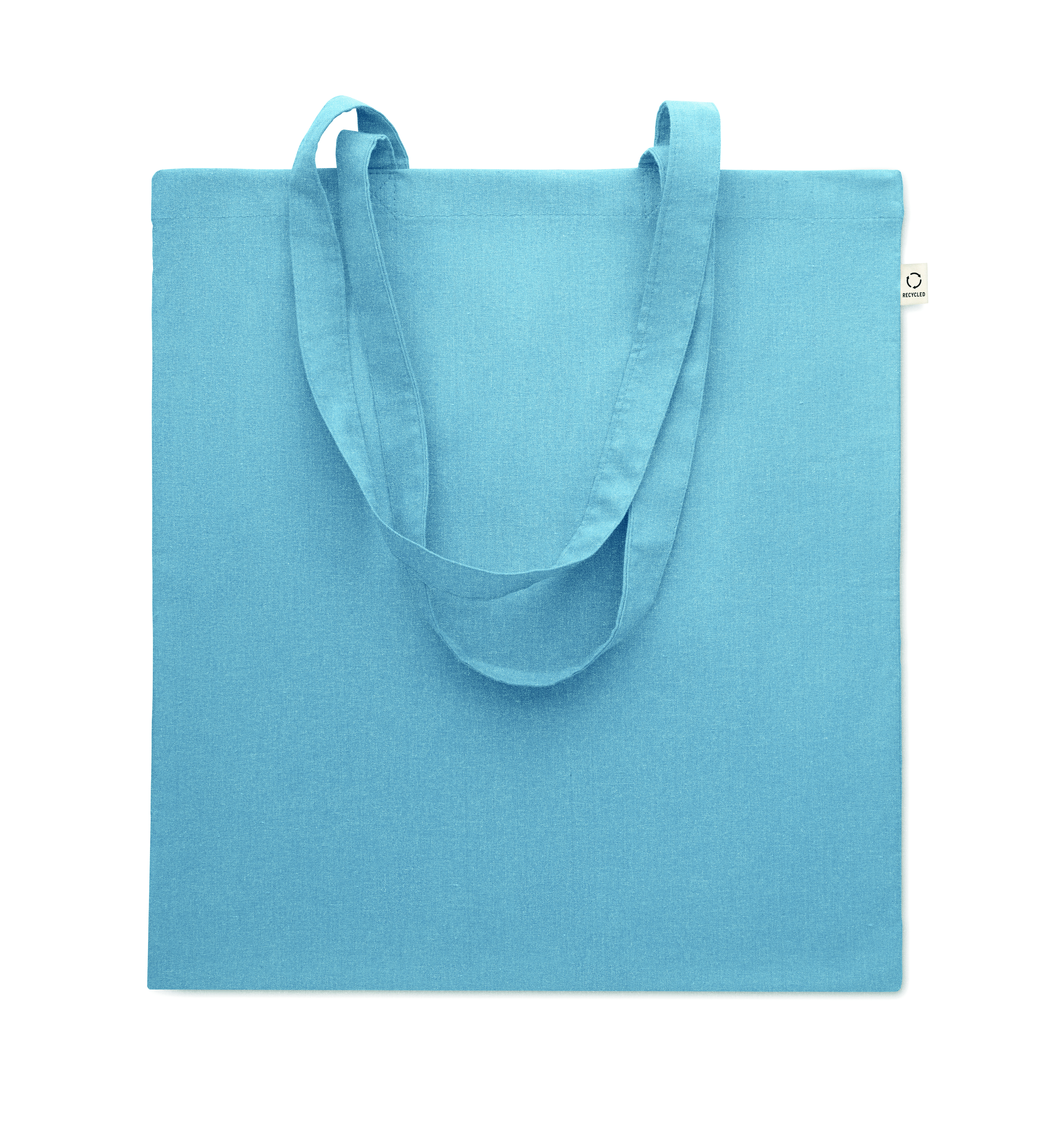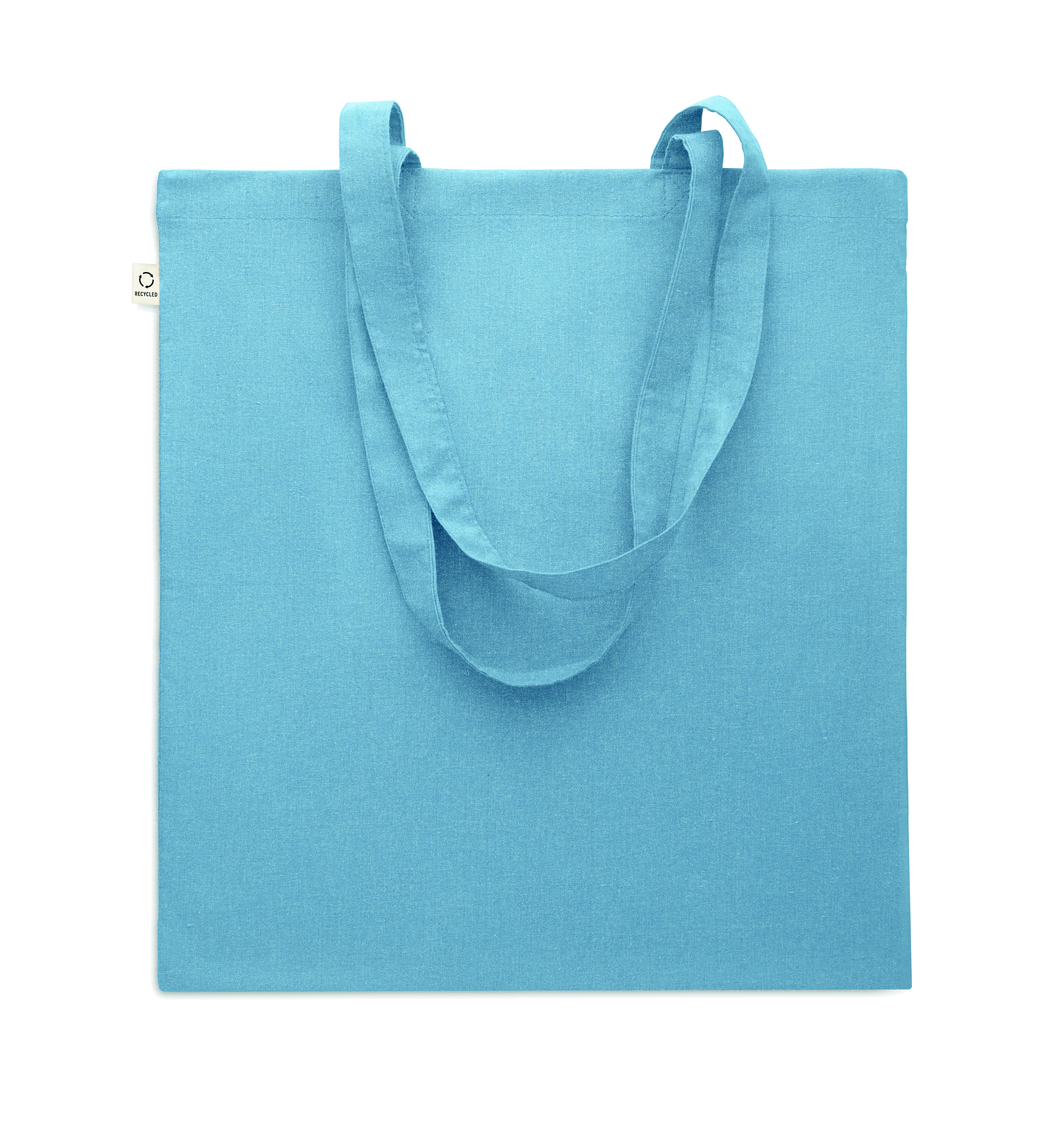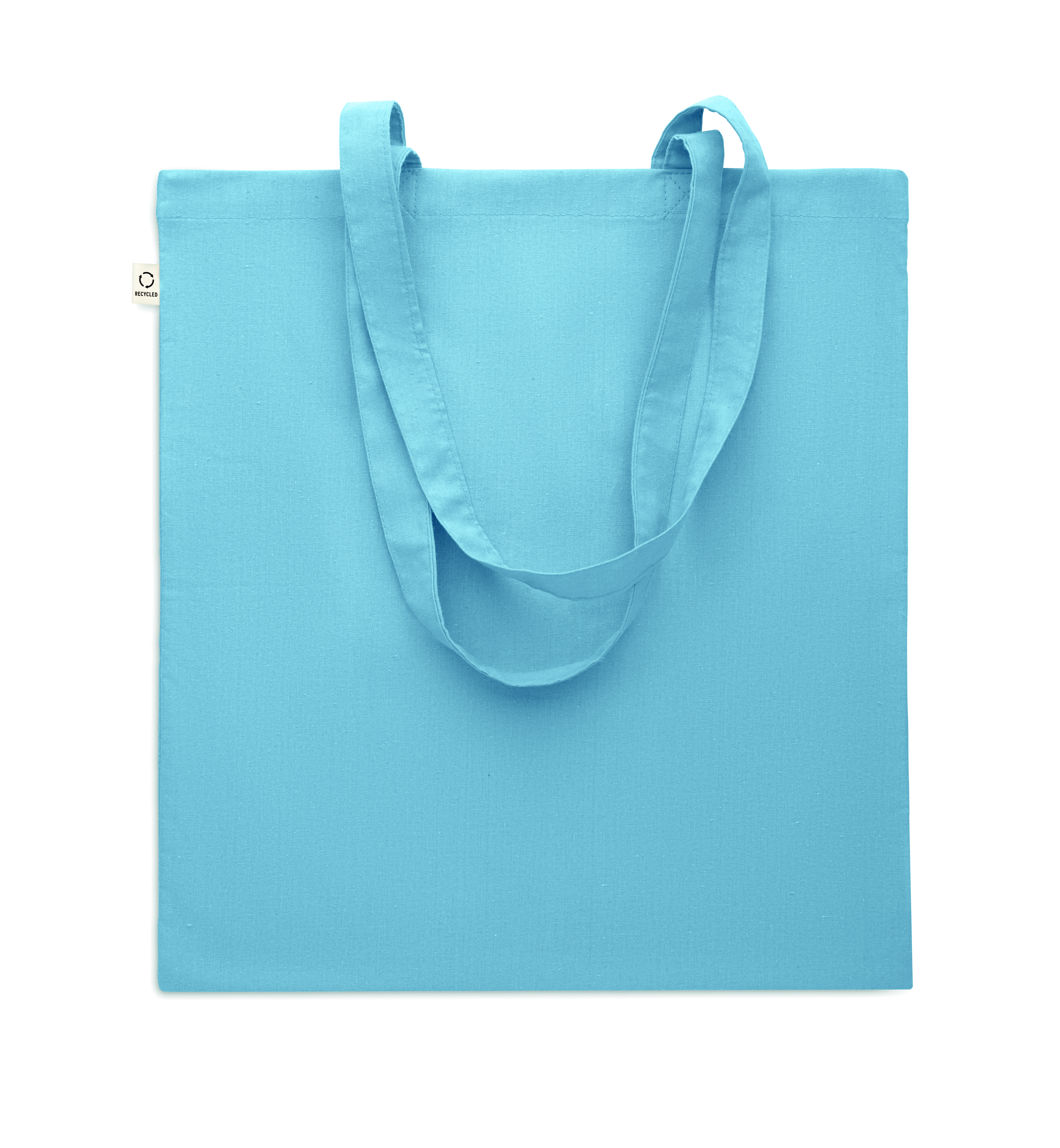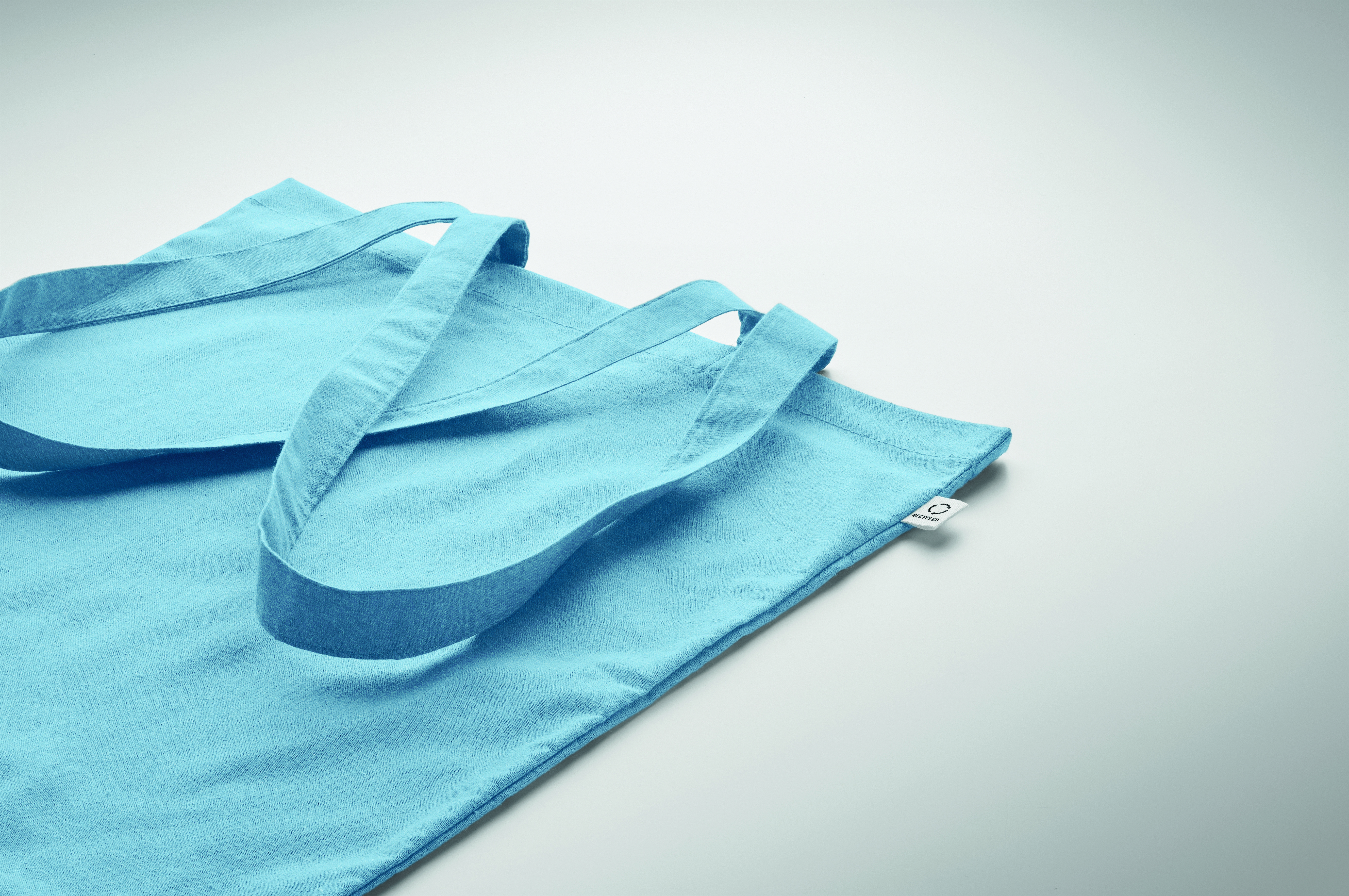 Bawełniana torba na zakupy z prekonsumenckiego recyklingu (70% bawełny z recyklingu i 30% RPET) z długimi uchwytami. 140 gr/m². Ten produkt może się kurczyć po zadrukowaniu.