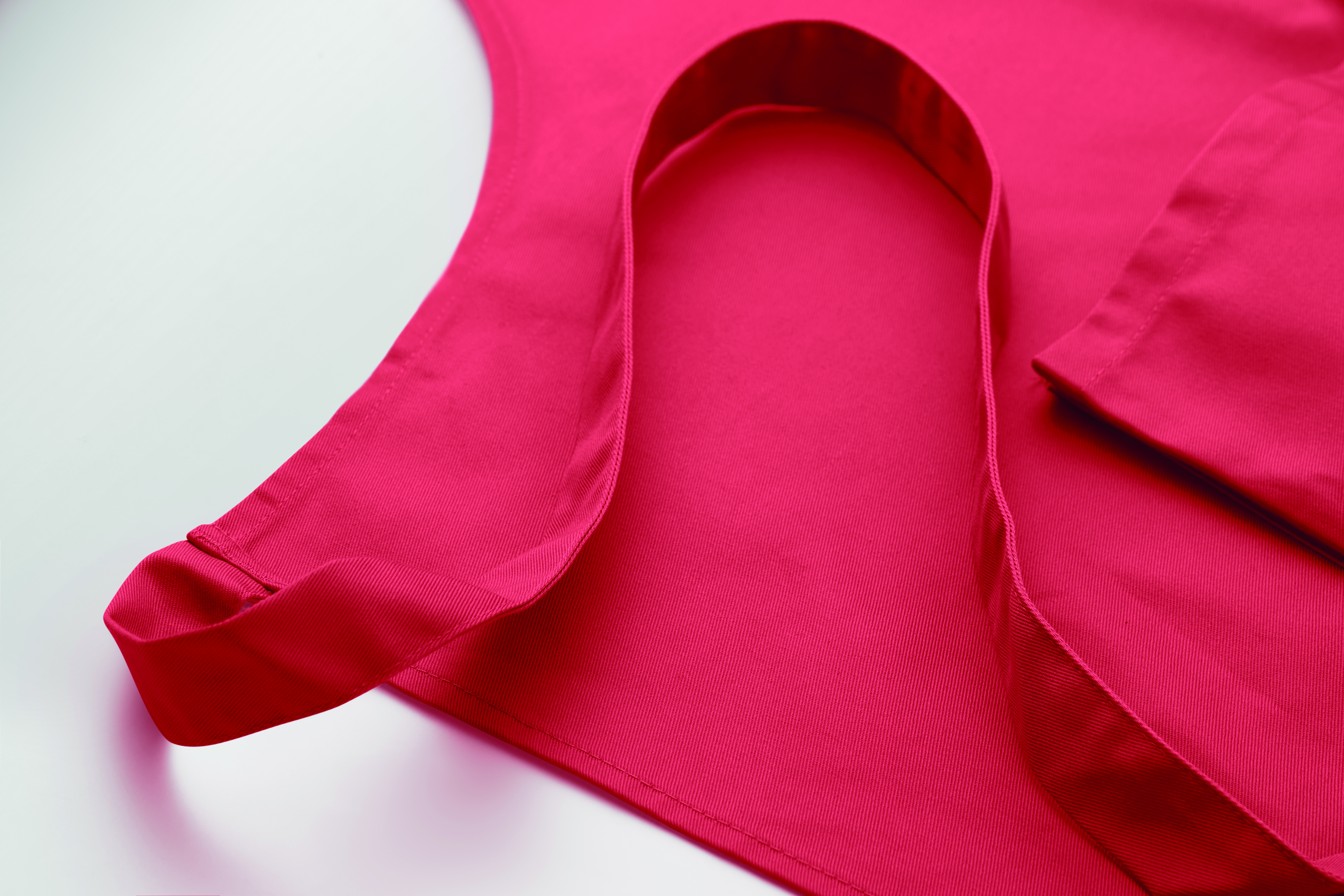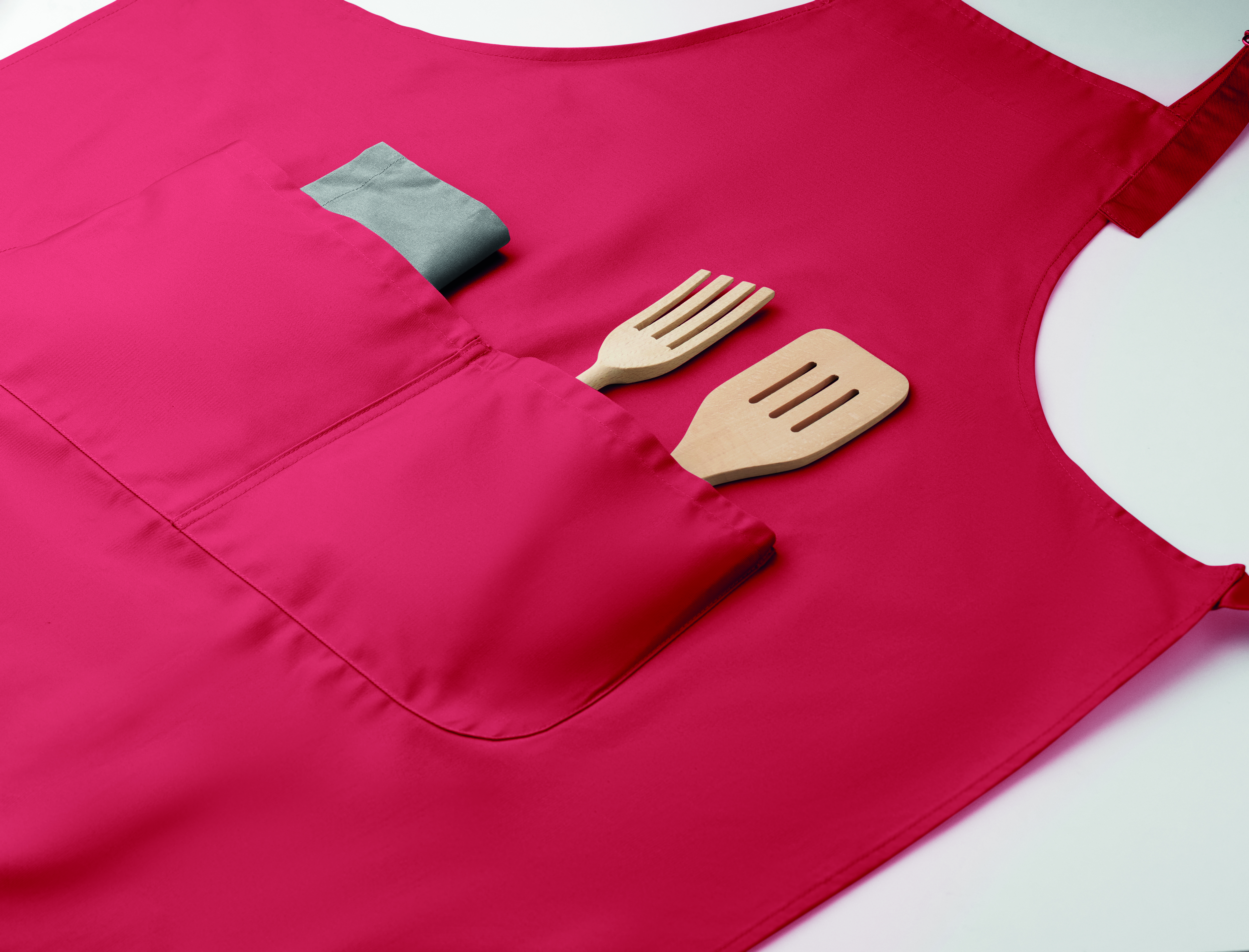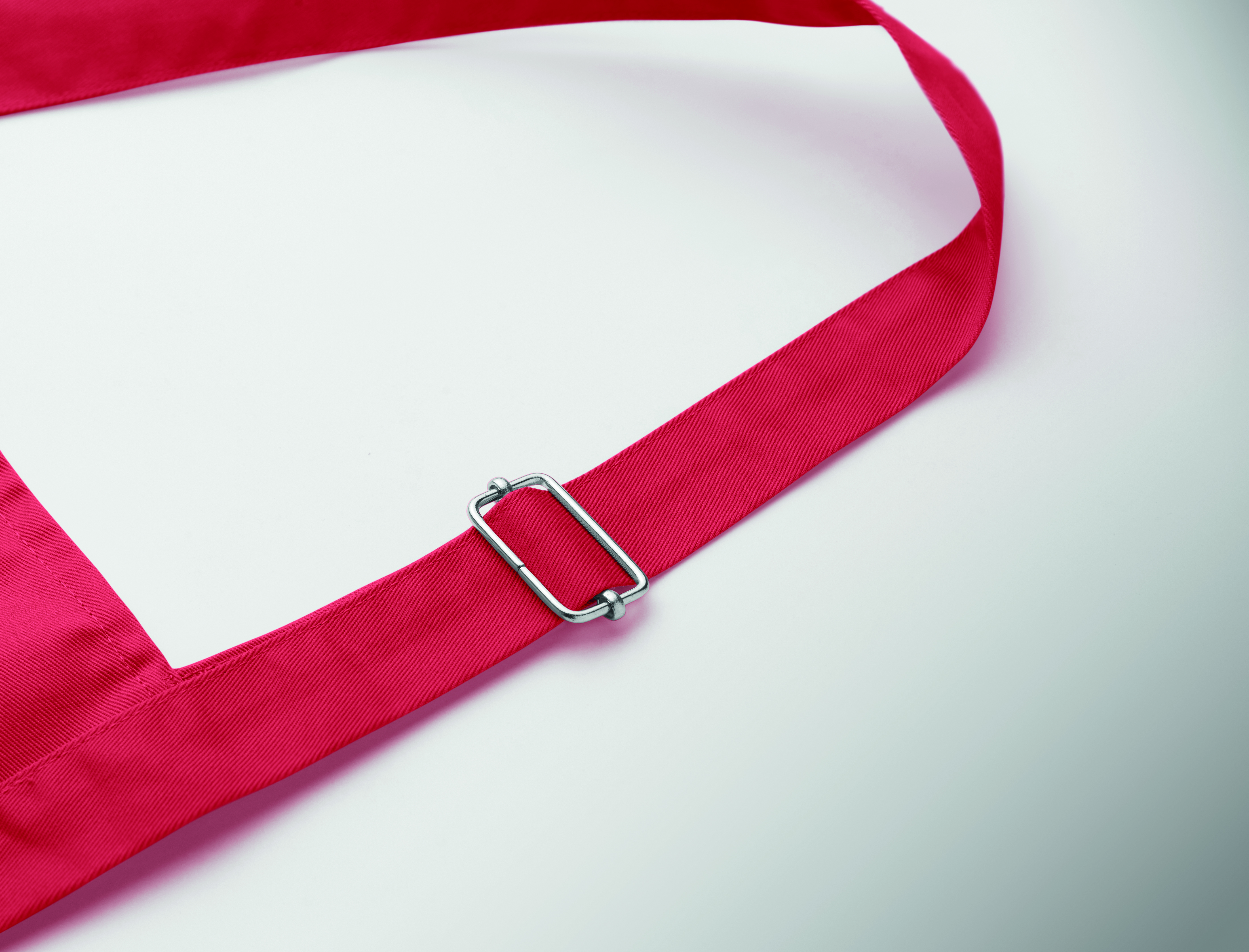 Długi, regulowany fartuch kuchenny z polibawełny 240 gr/m² (35% bawełny, 65% poliestru) z dwiema przednimi kieszeniami i regulowanym paskiem z metalową klamrą.
