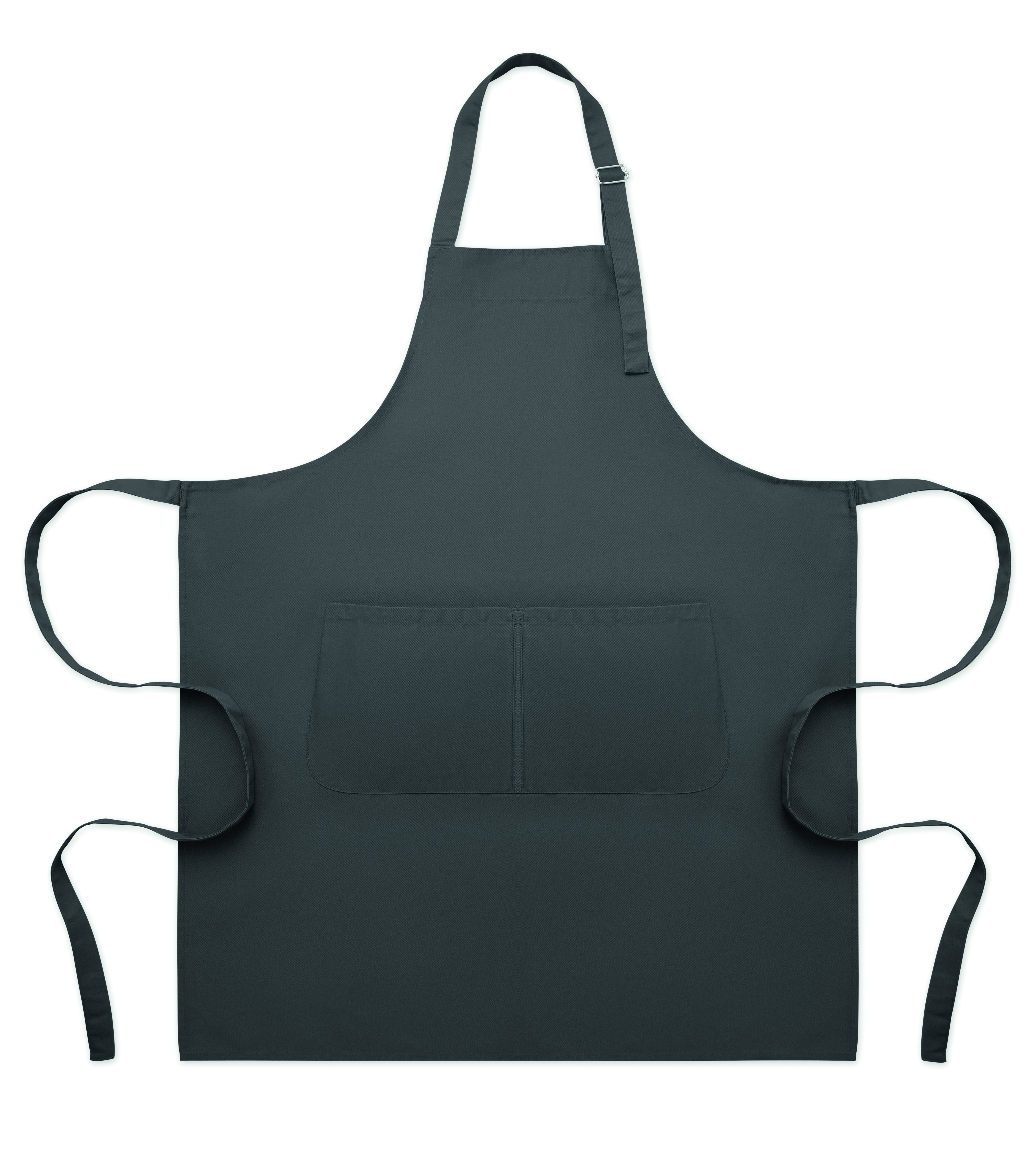 Długi, regulowany fartuch kuchenny z polibawełny 240 gr/m² (35% bawełny, 65% poliestru) z dwiema przednimi kieszeniami i regulowanym paskiem z metalową klamrą.