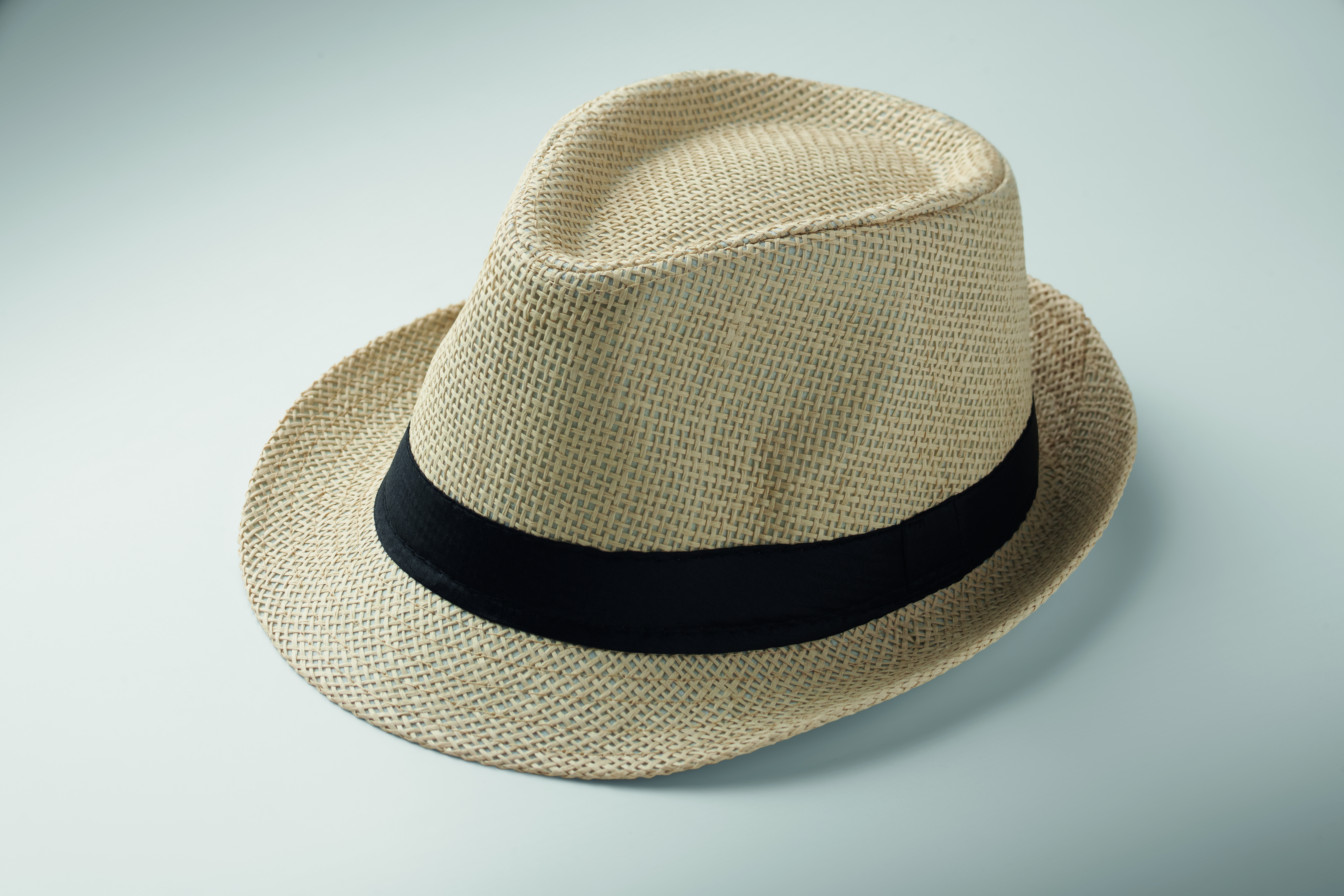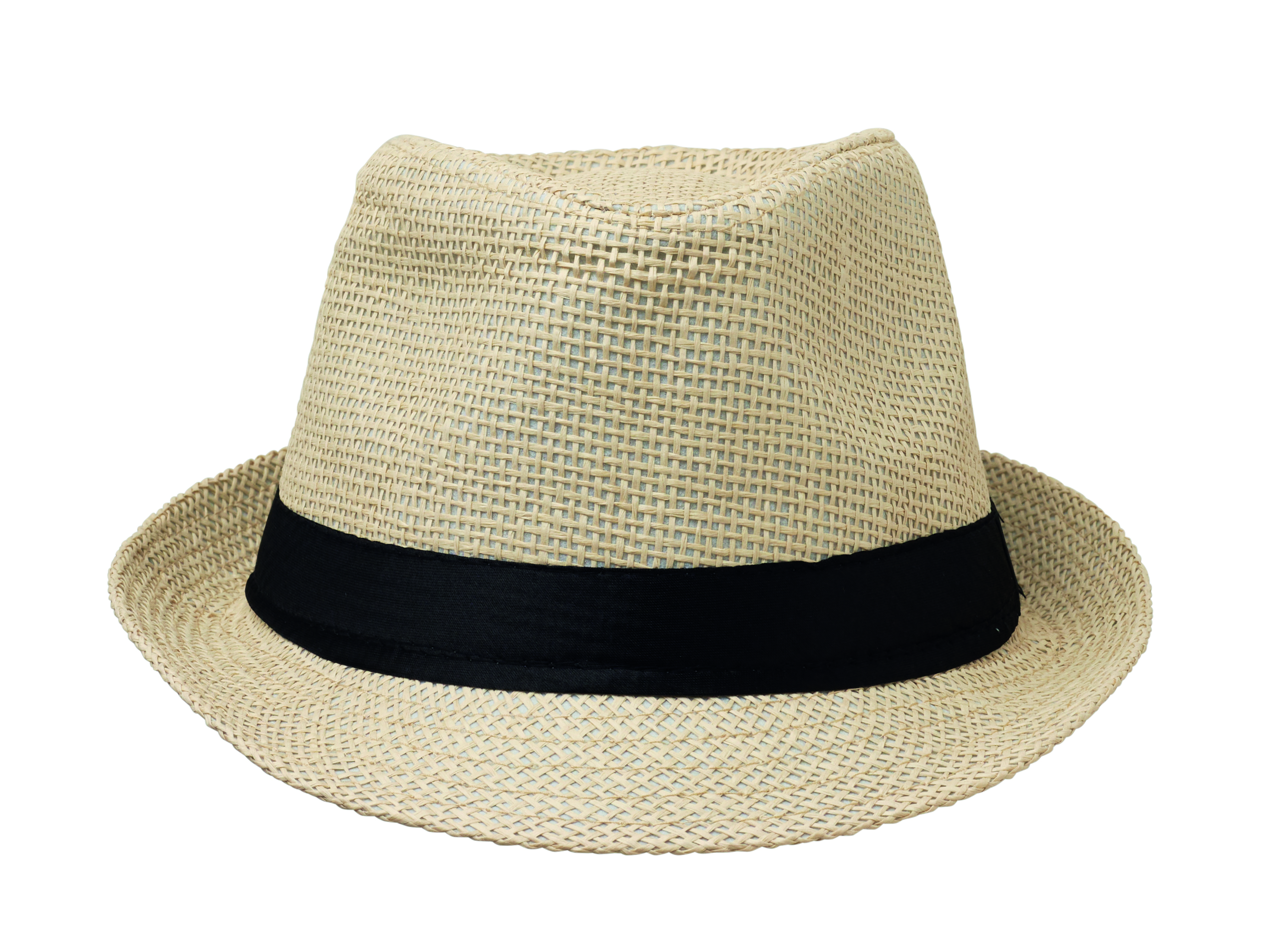 Papierowy kapelusz słomkowy z czarną opaską poliestrową. W przypadku zamówień bez nadruku opaska nie będzie przymocowana do kapelusza.