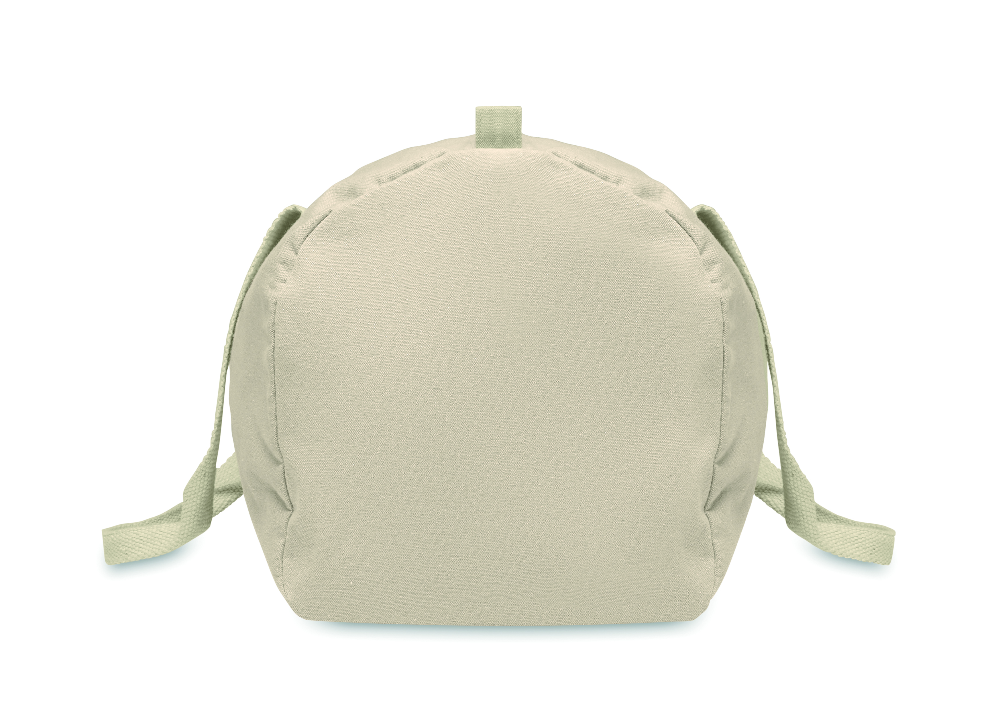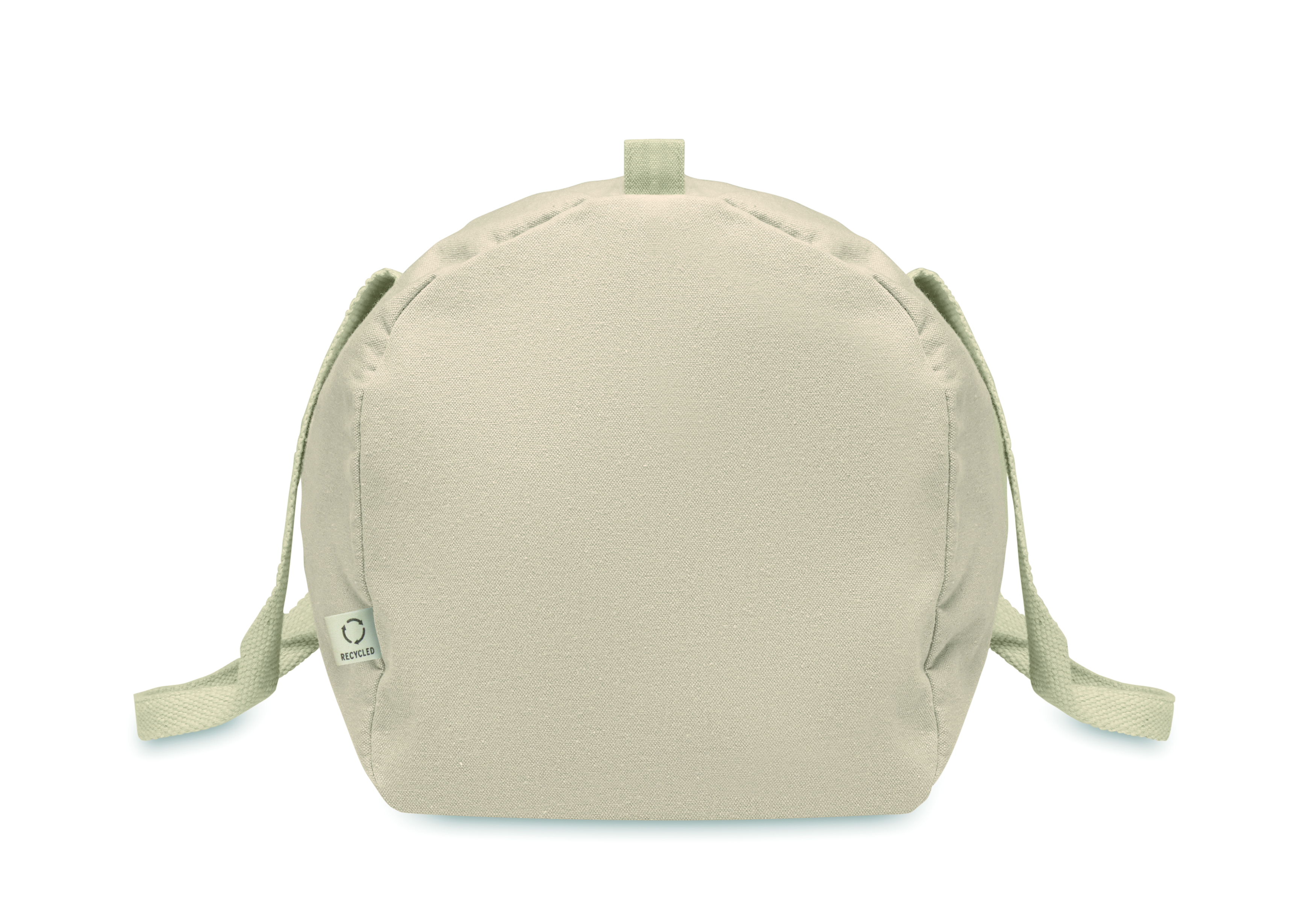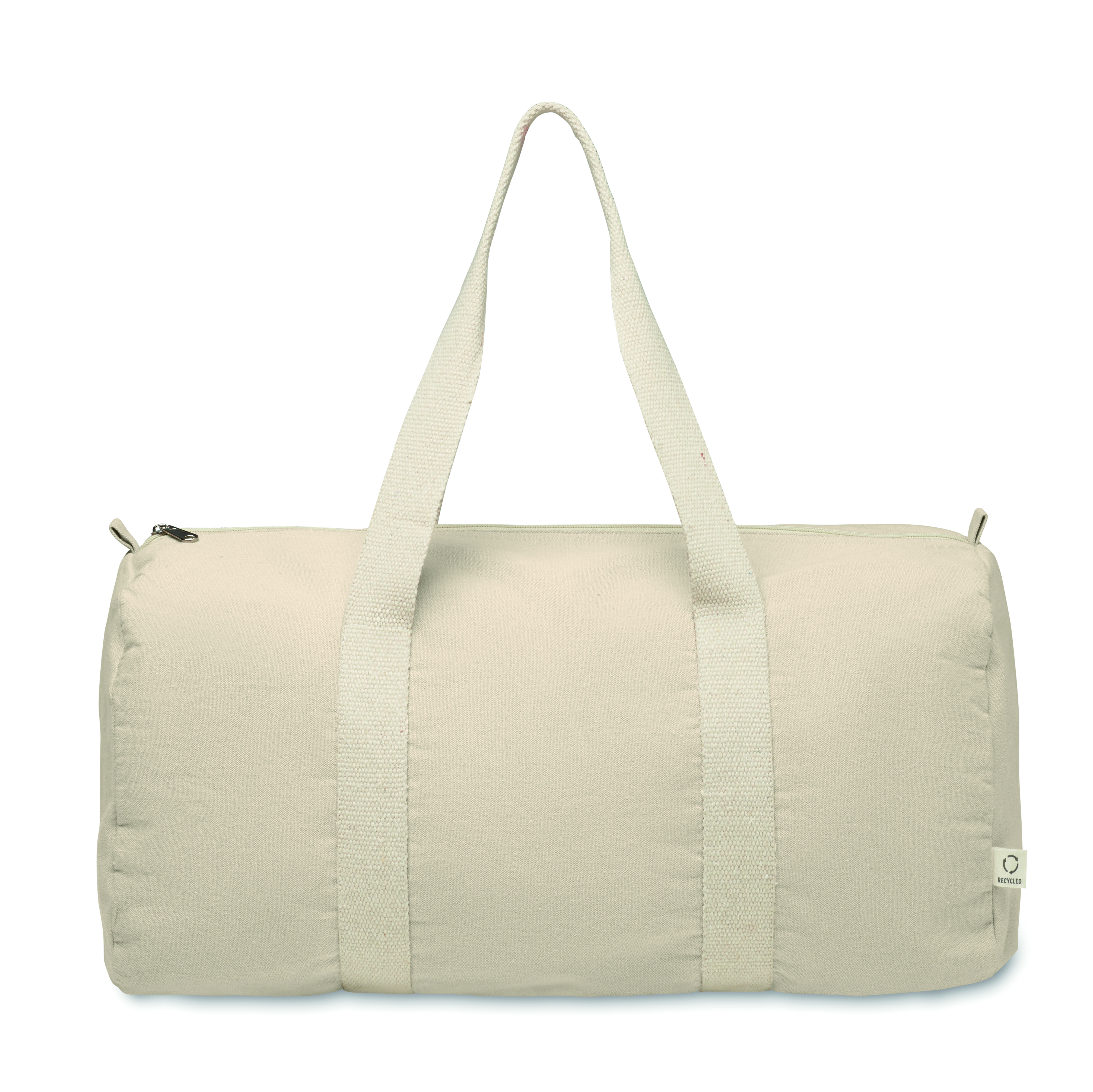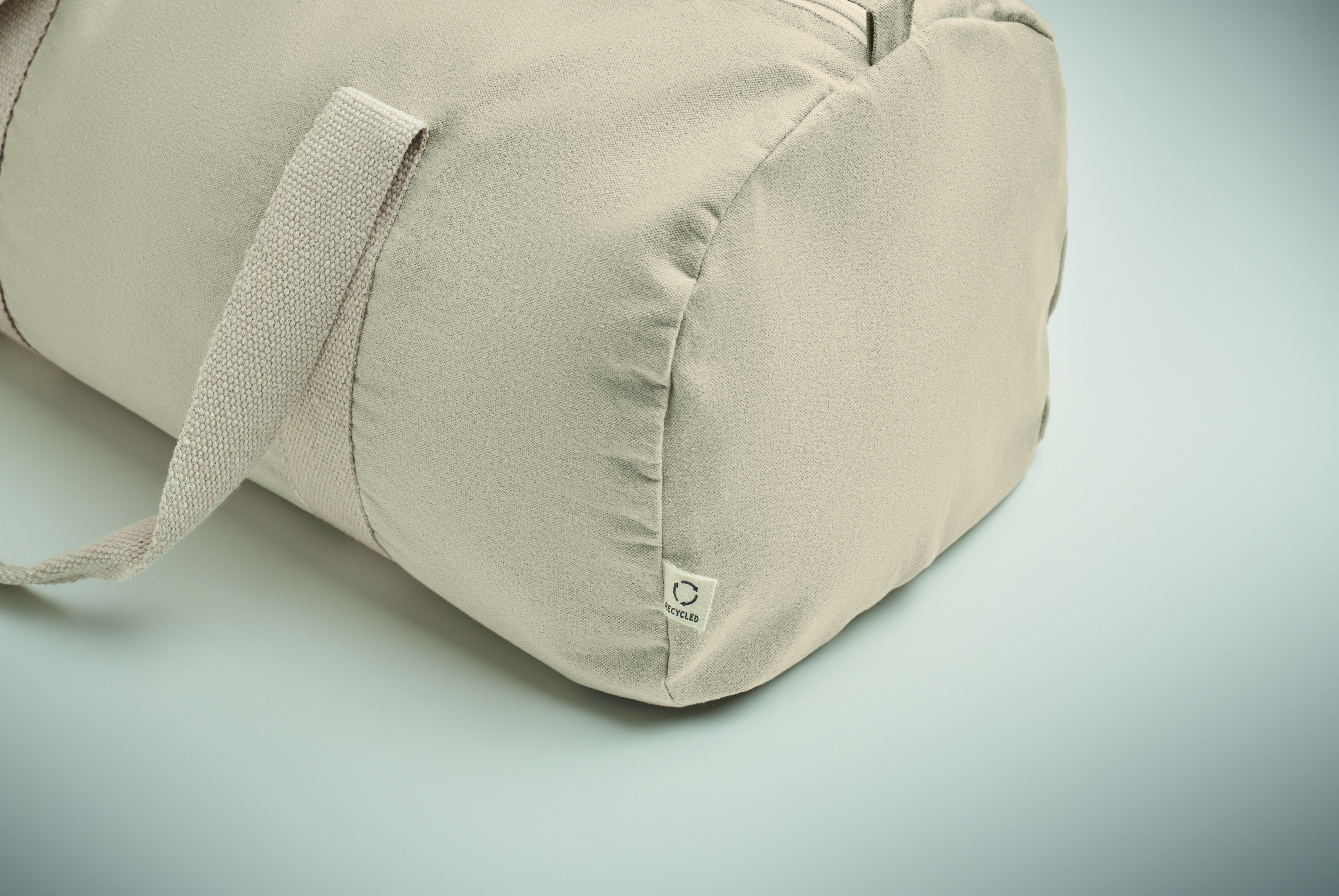 Torba sportowa i podróżna z zapinaną na zamek przegrodą boczną i zapinaną na zamek kieszenią wewnętrzną z bawełny z recyklingu 320 gr/m² (80%) i poliestru z recyklingu (20%) z długimi uchwytami.