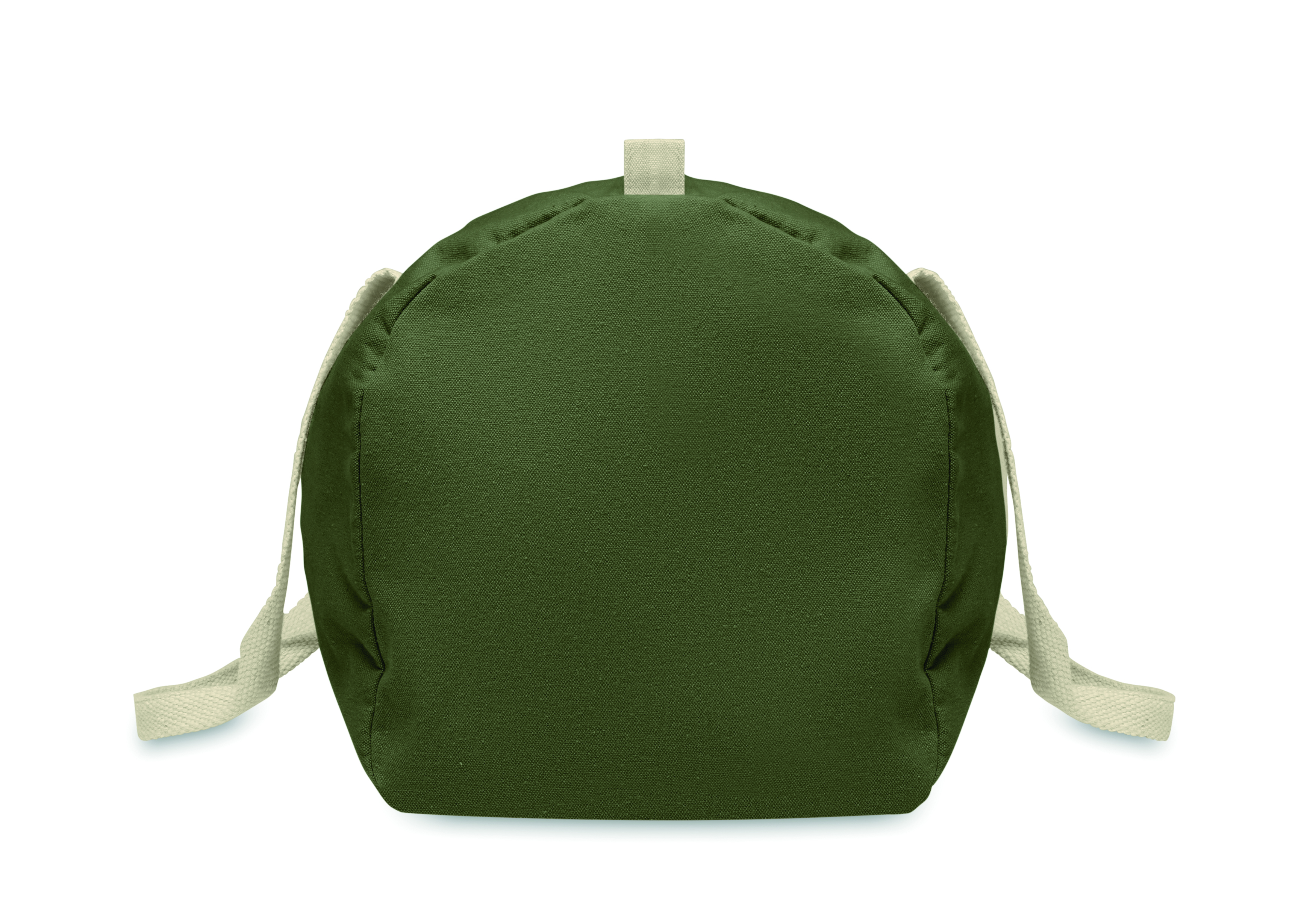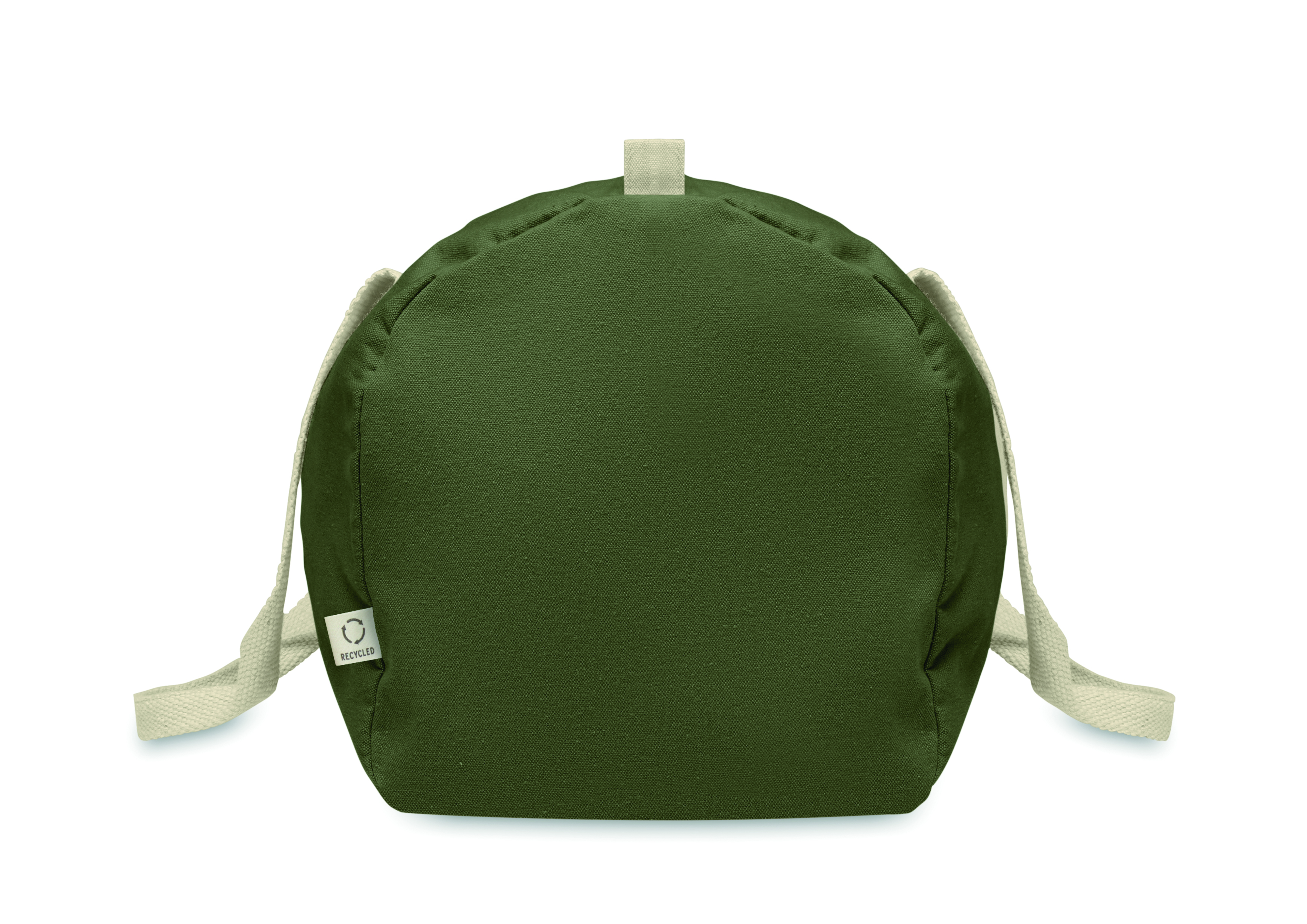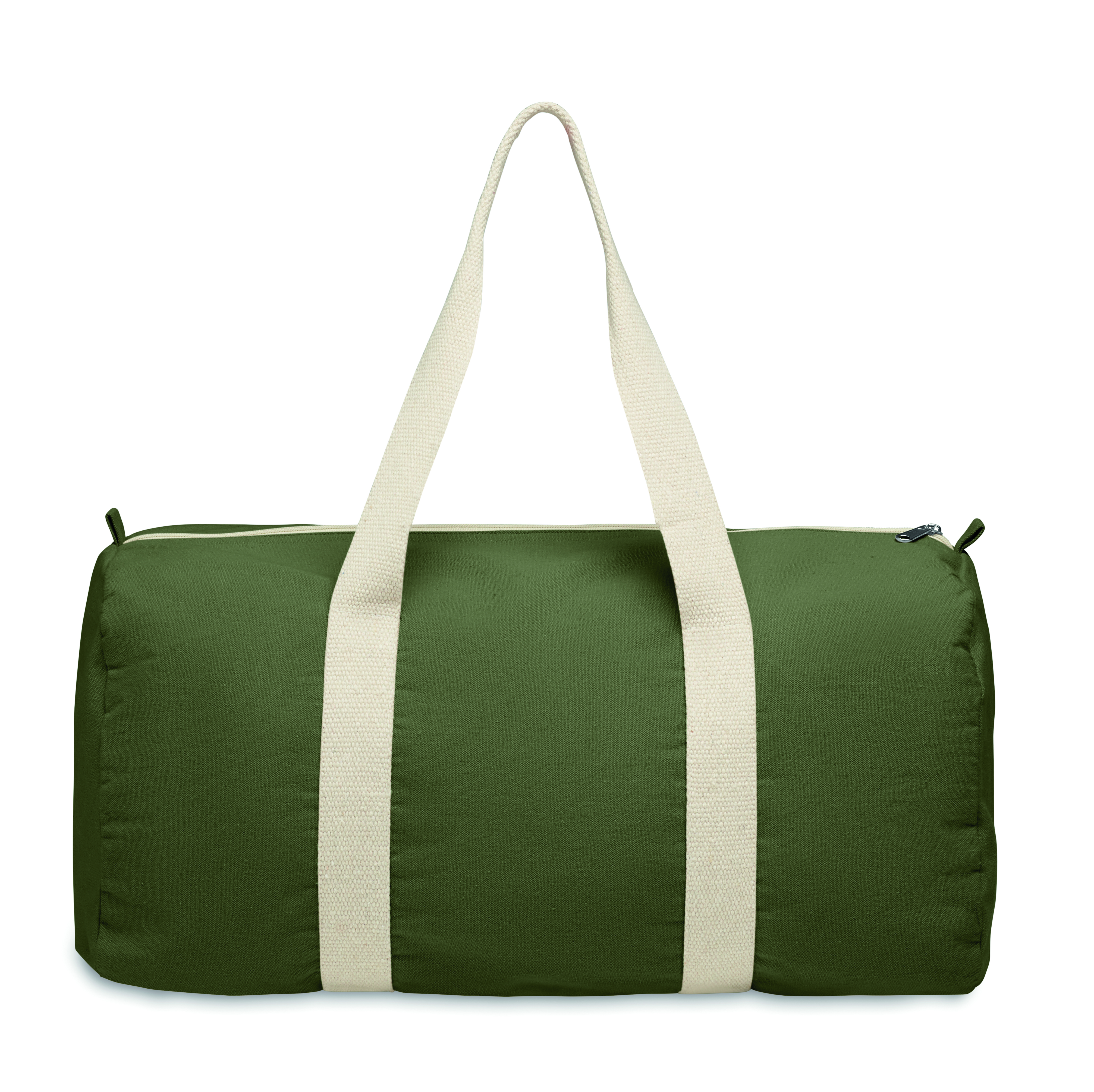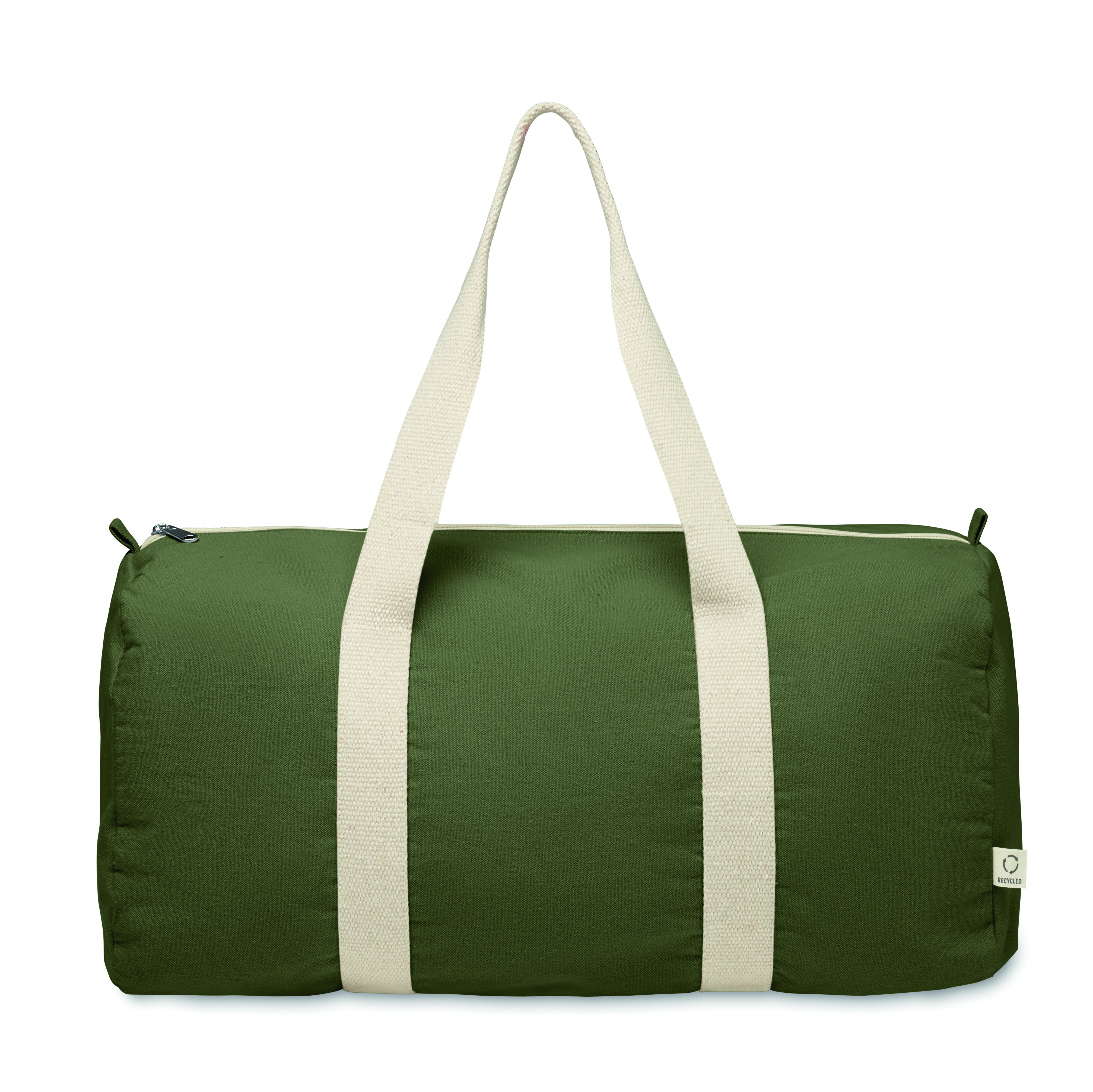 Torba sportowa i podróżna z zapinaną na zamek przegrodą boczną i zapinaną na zamek kieszenią wewnętrzną z bawełny z recyklingu 320 gr/m² (80%) i poliestru z recyklingu (20%) z długimi uchwytami.