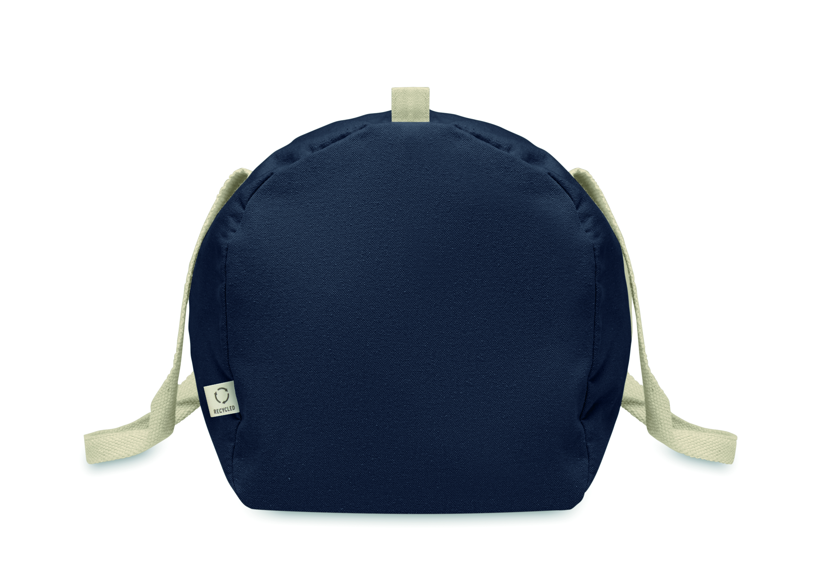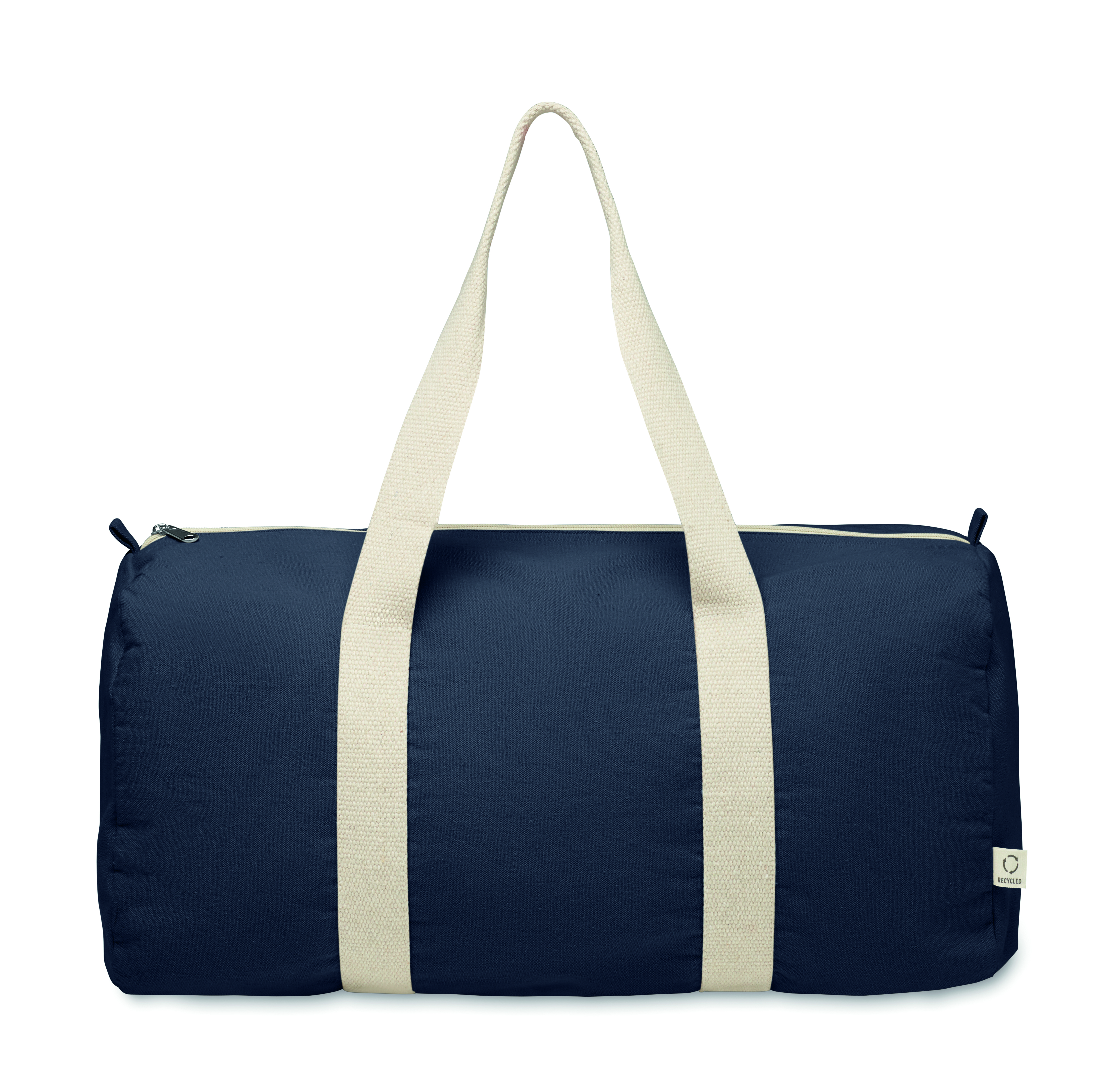 Torba sportowa i podróżna z zapinaną na zamek przegrodą boczną i zapinaną na zamek kieszenią wewnętrzną z bawełny z recyklingu 320 gr/m² (80%) i poliestru z recyklingu (20%) z długimi uchwytami.