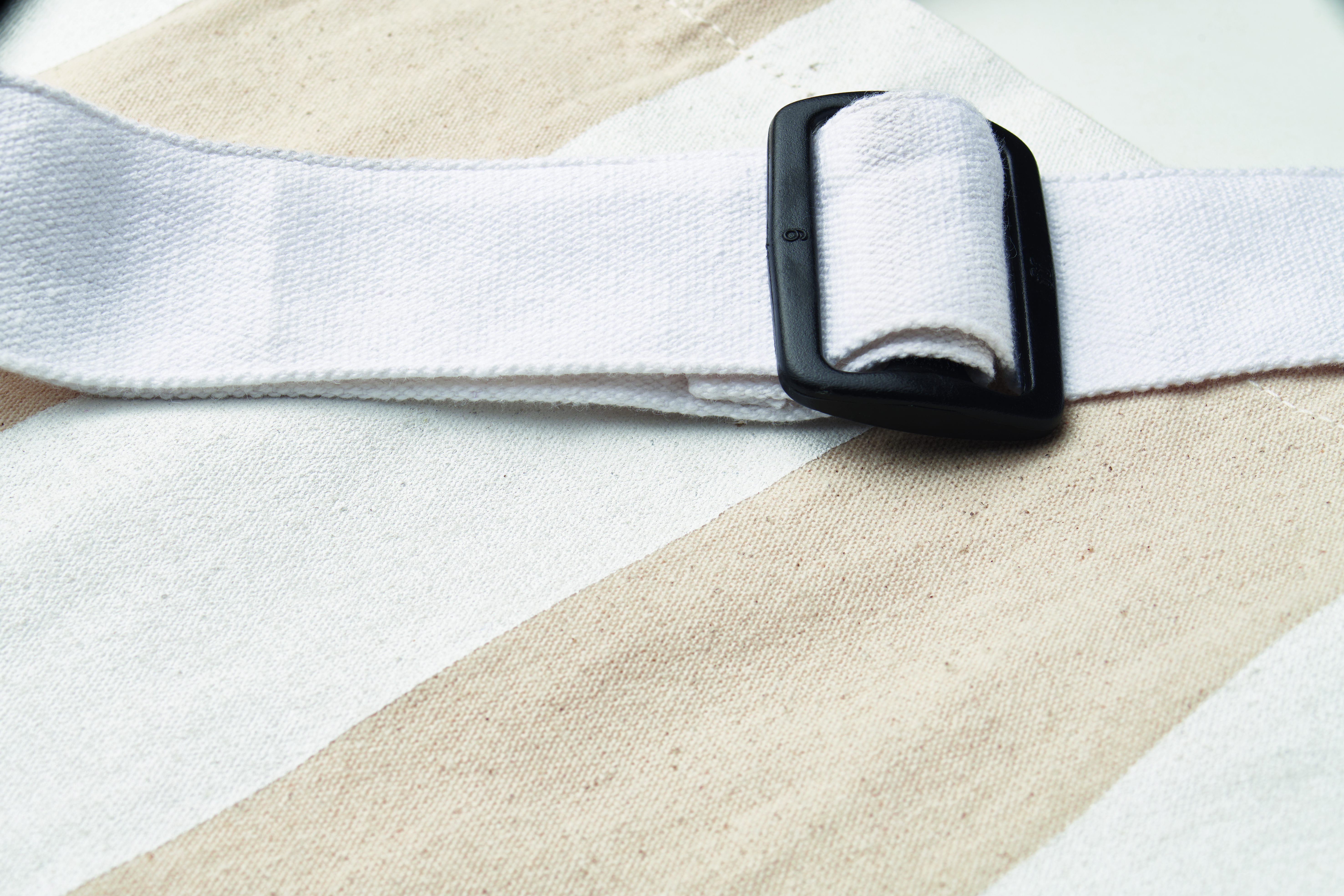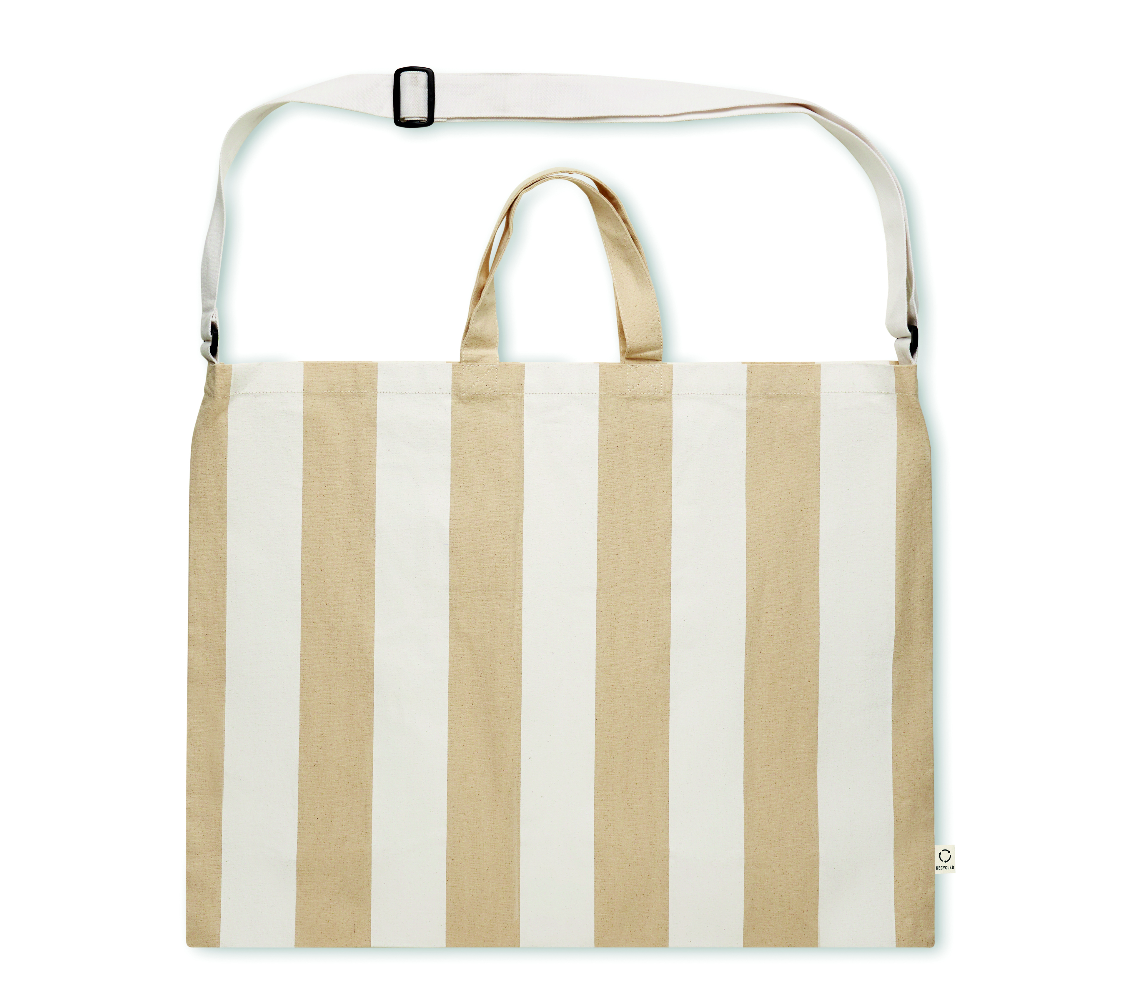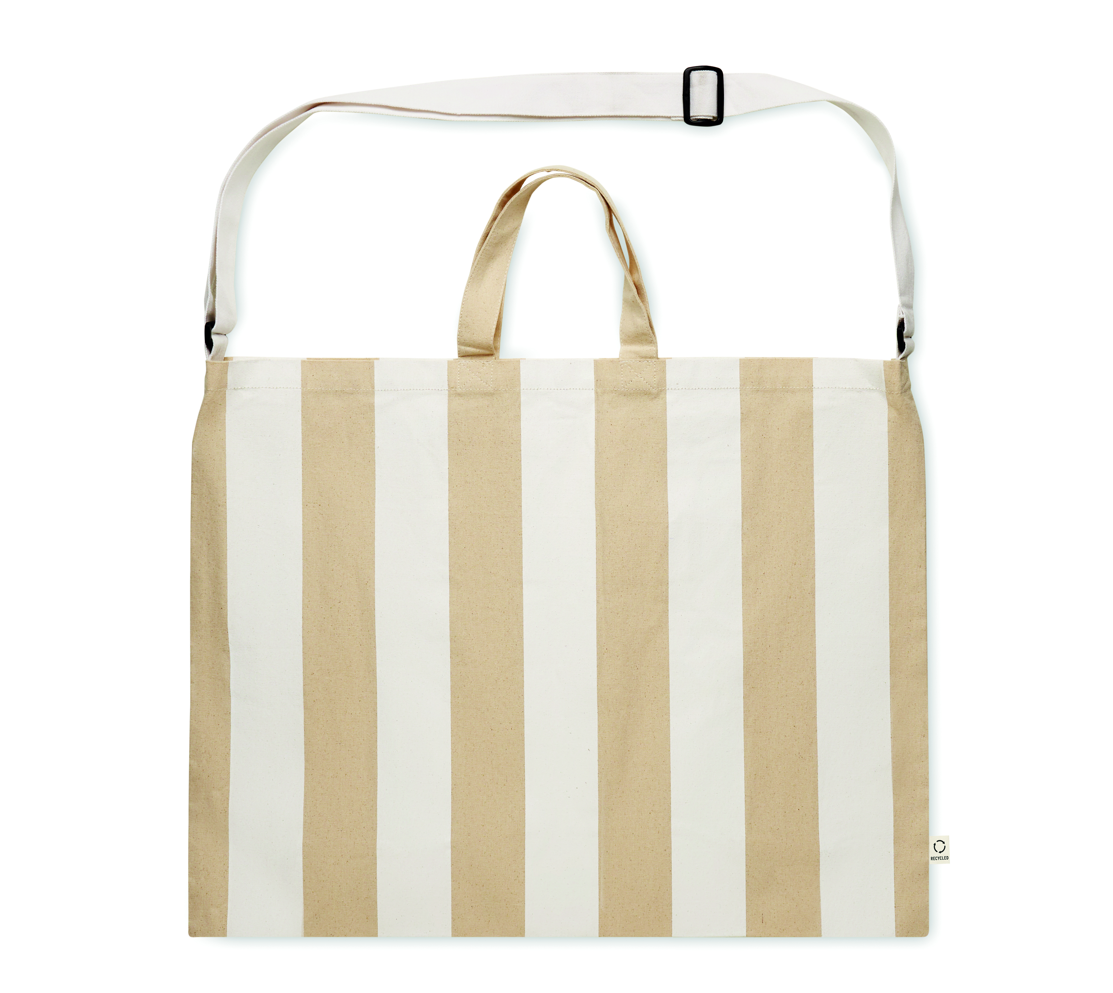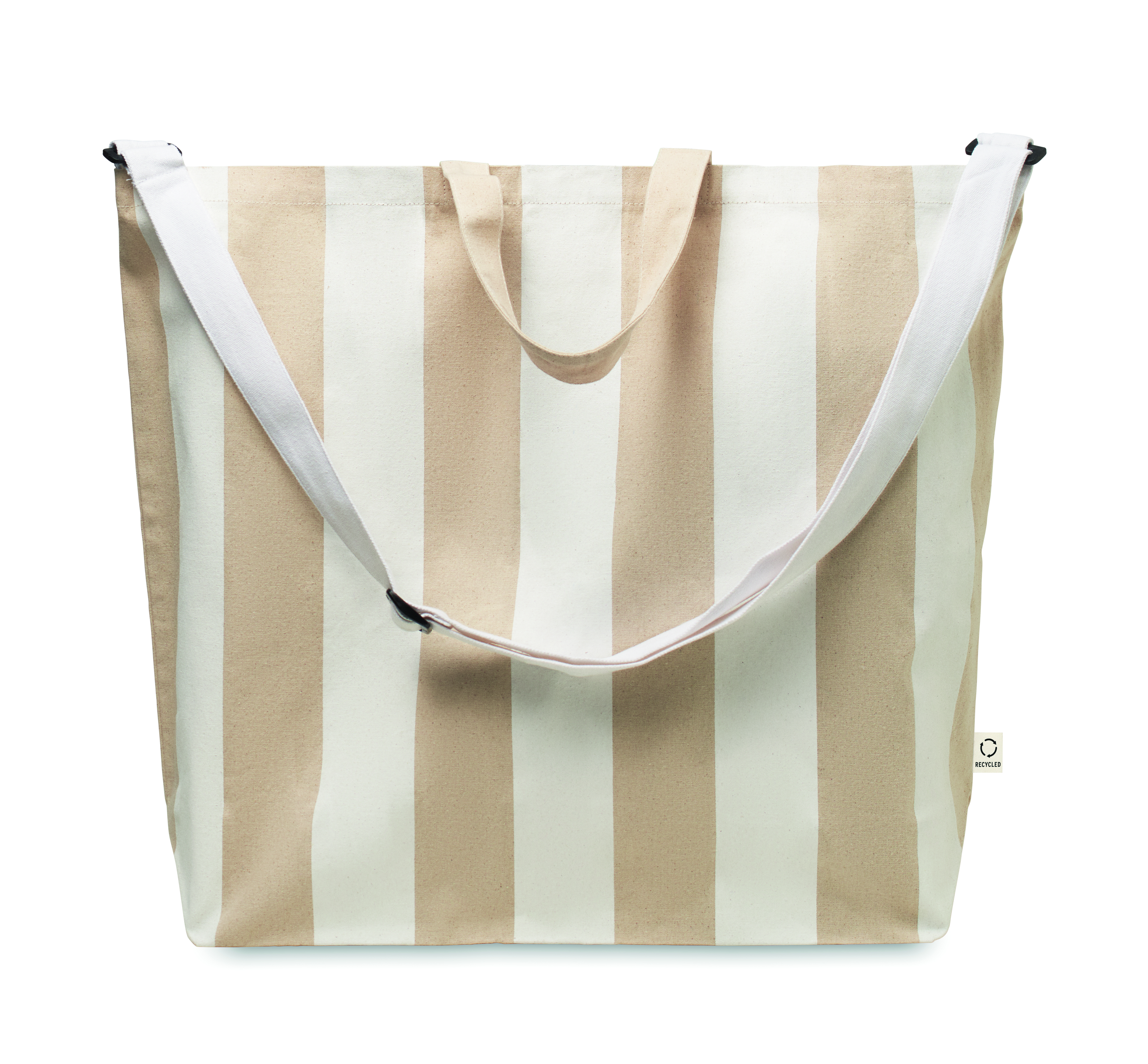 Bardzo duża torba plażowa w paski wykonana z bawełny z recyklingu (80%) i poliestru z recyklingu (20%) o gramaturze 280 gr/m² z wewnętrzną kieszenią. Krótkie uchwyty i jeden duży regulowany pasek na ramię.