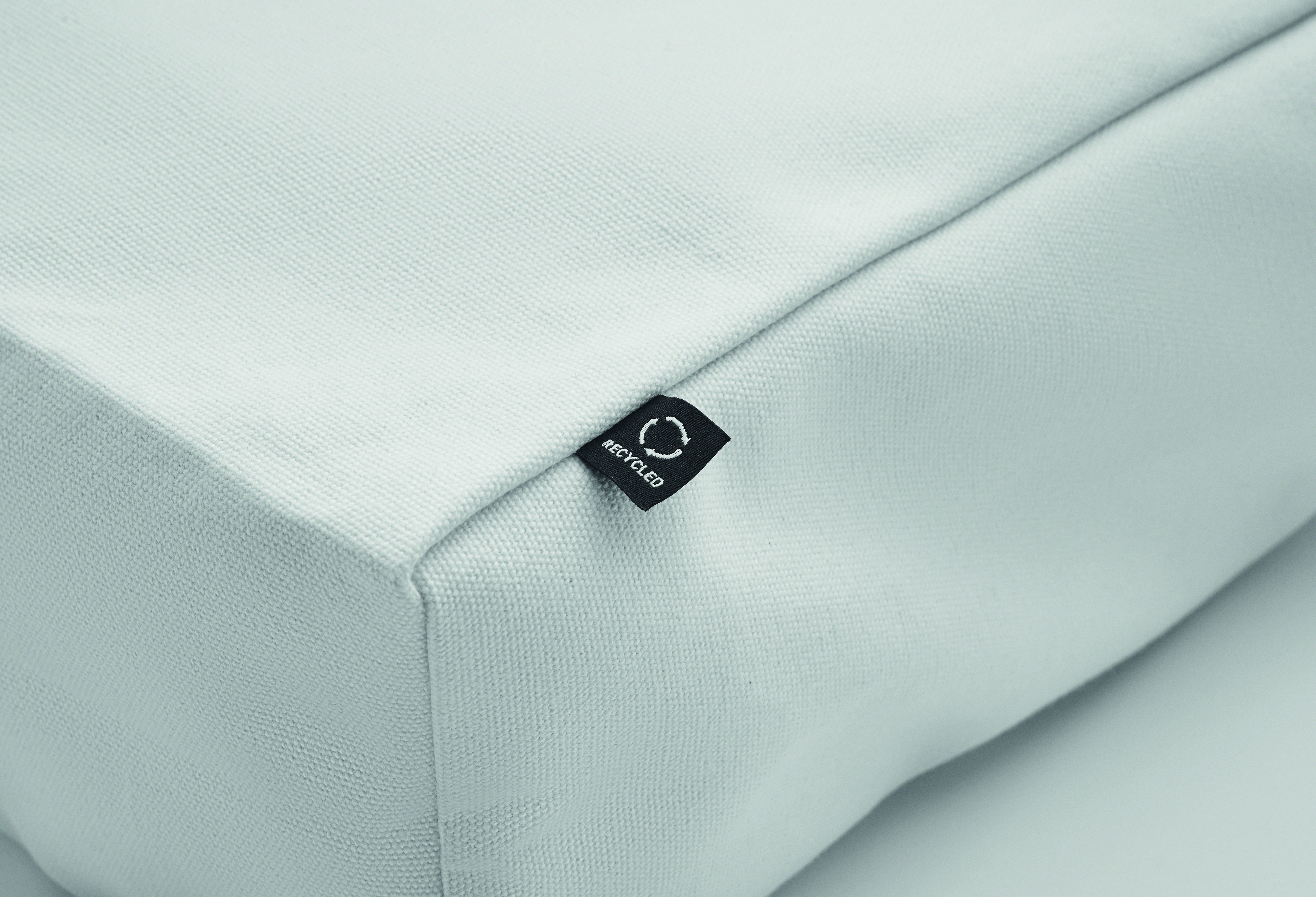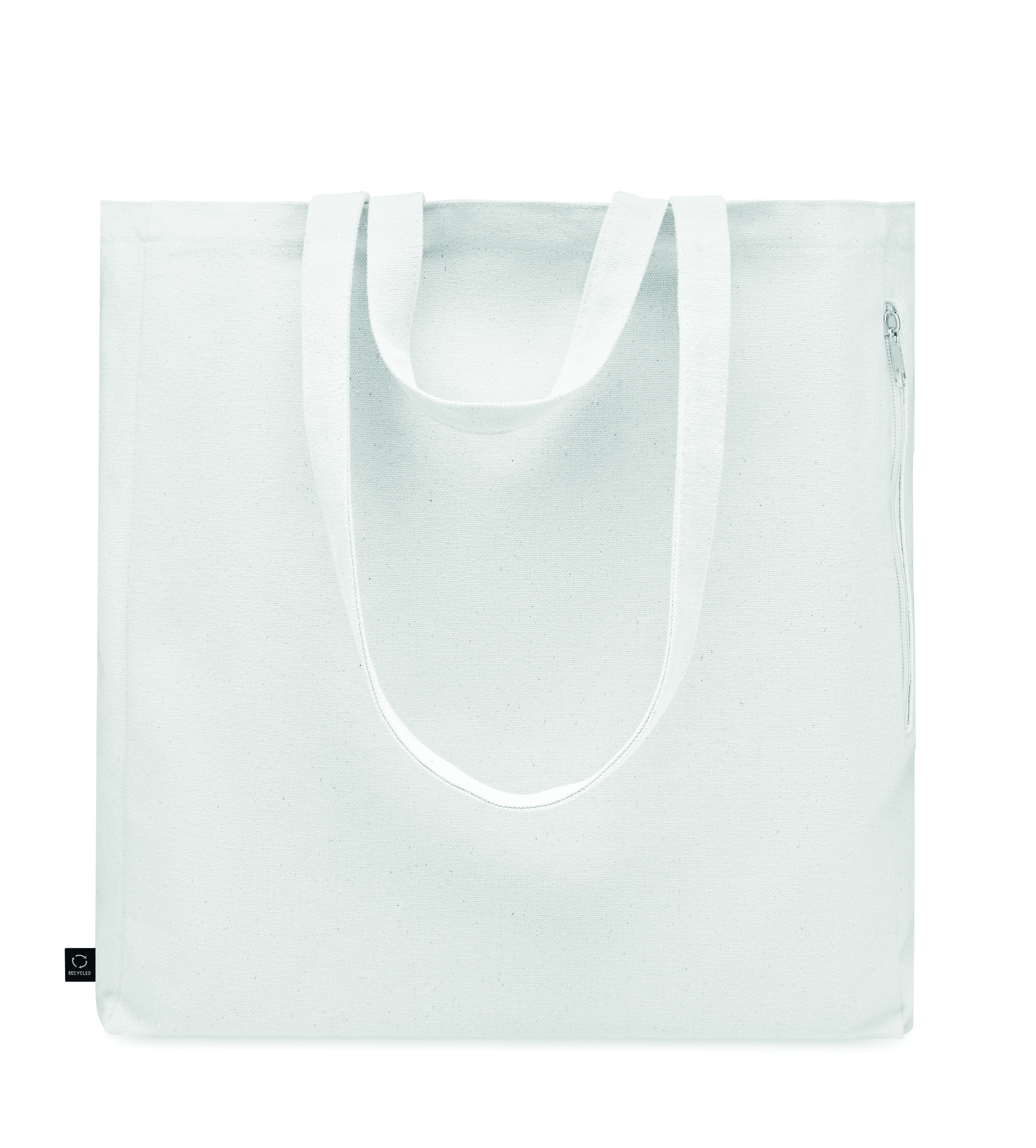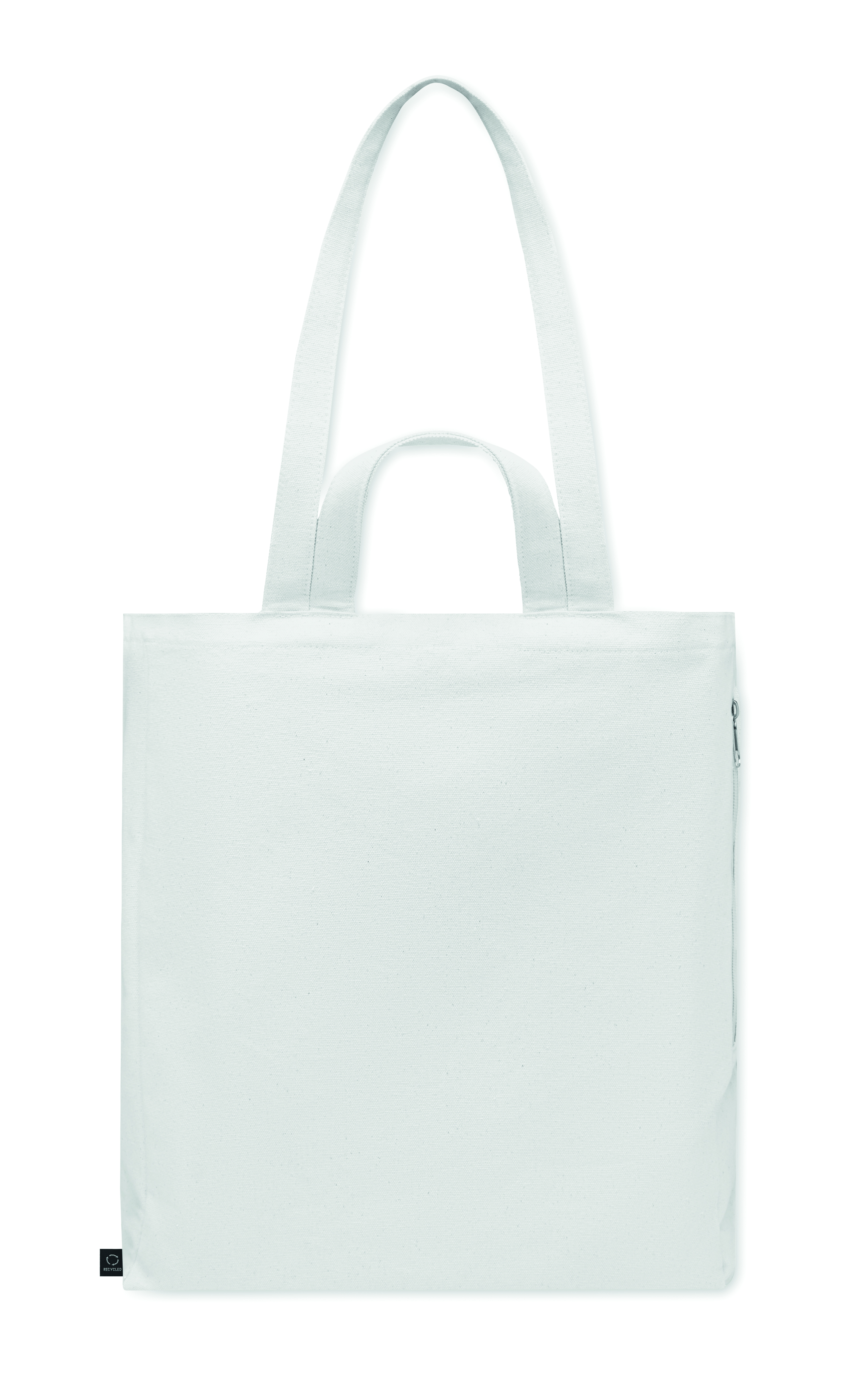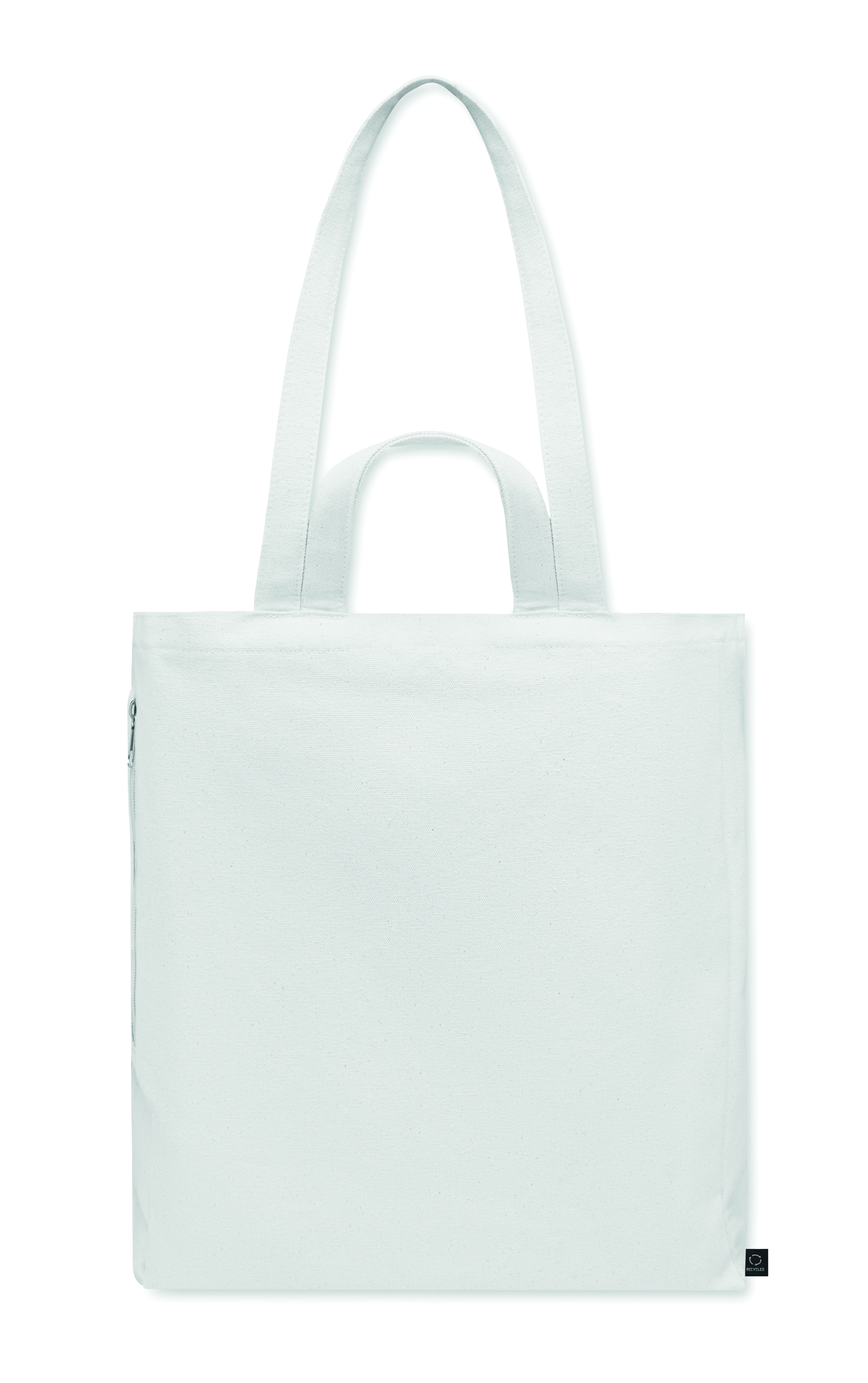 Torba zakupowa lub plażowa z polibawełny z recyklingu (70% bawełna z recyklingu, 30% poliester z recyklingu) z krótkimi i długimi uchwytami. 380 gr/m².