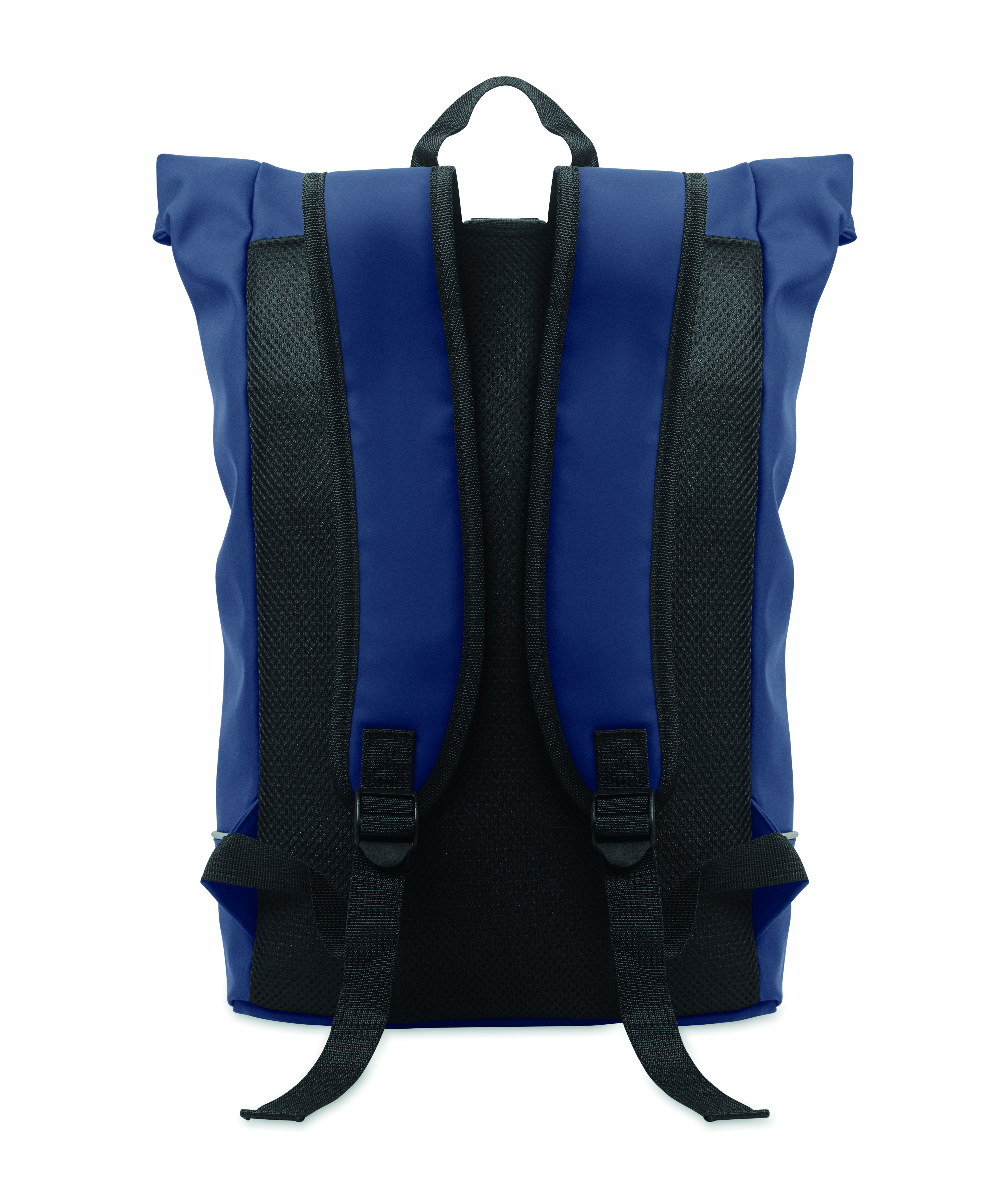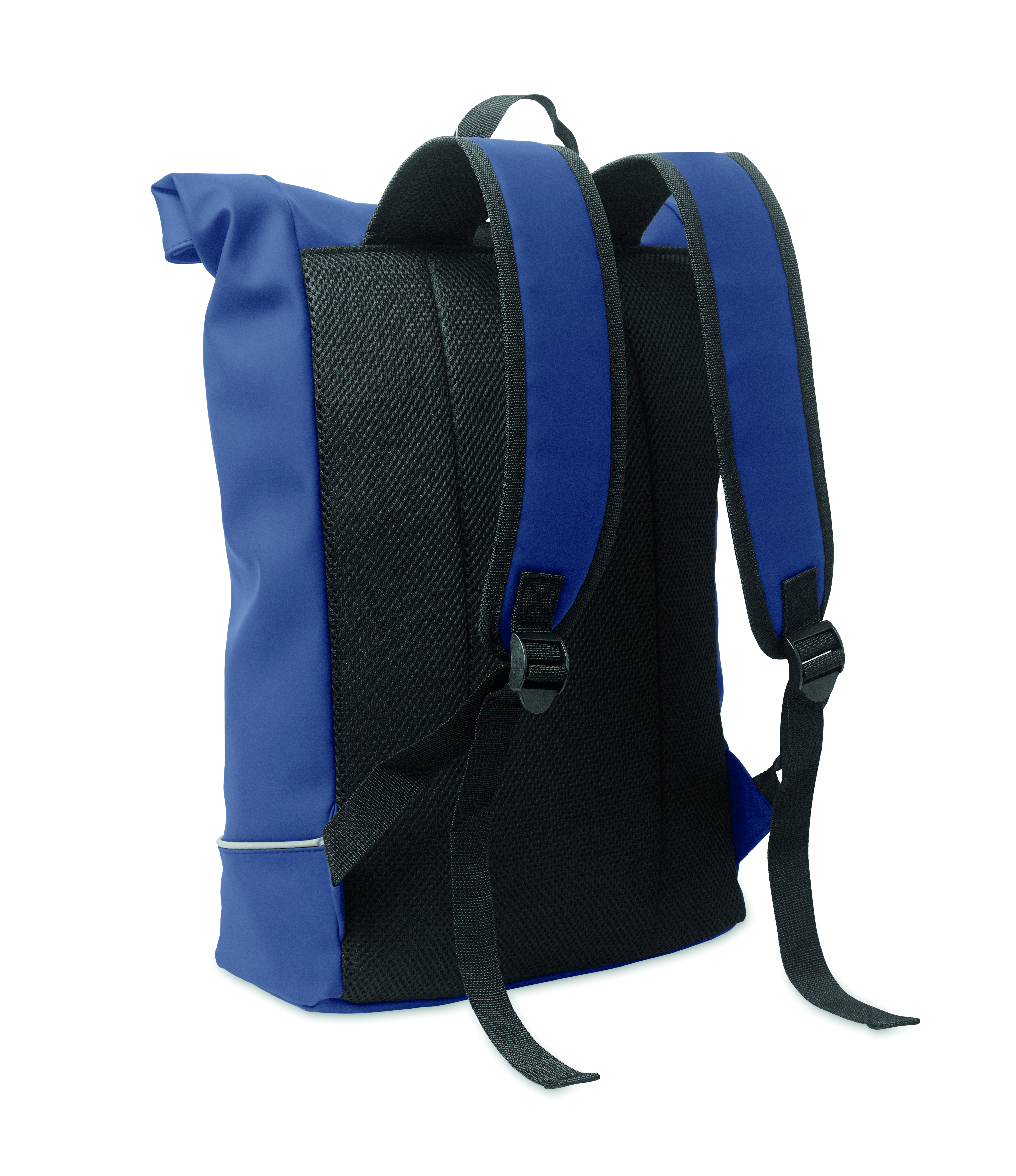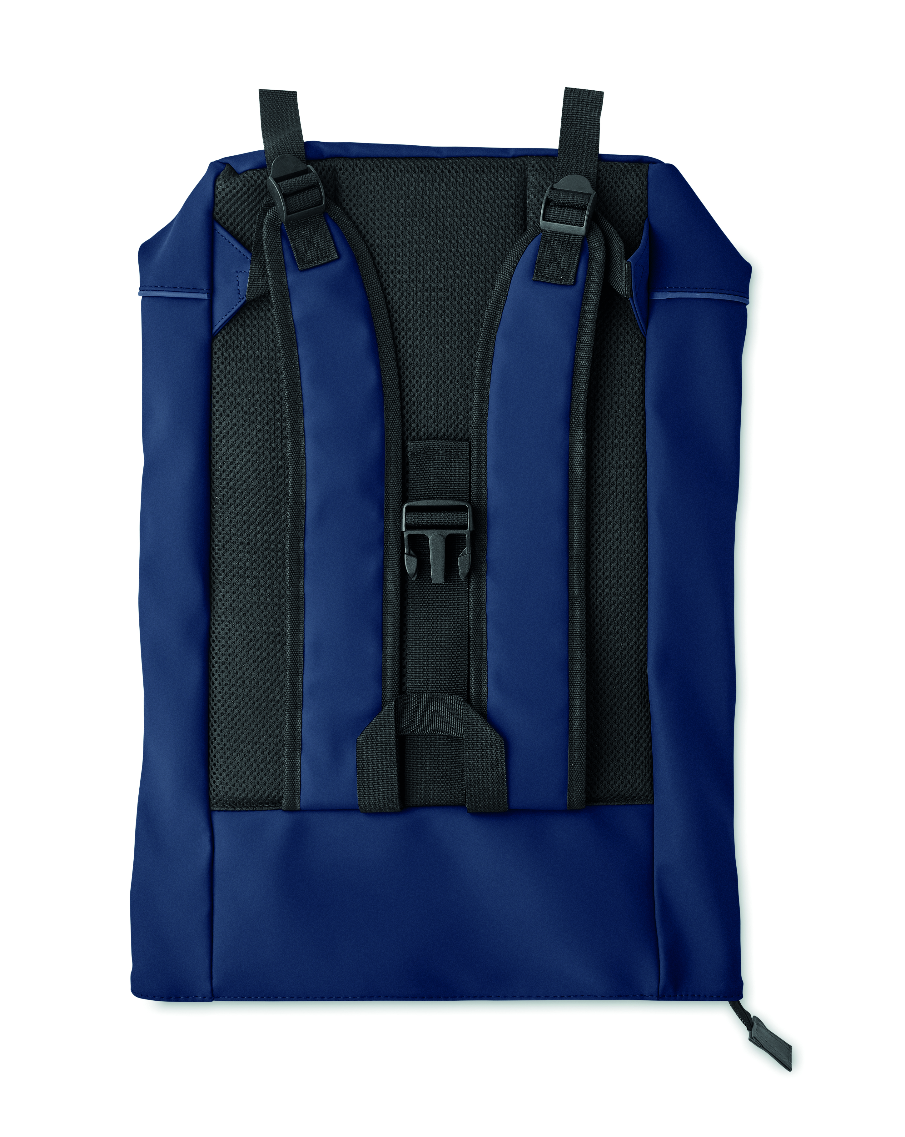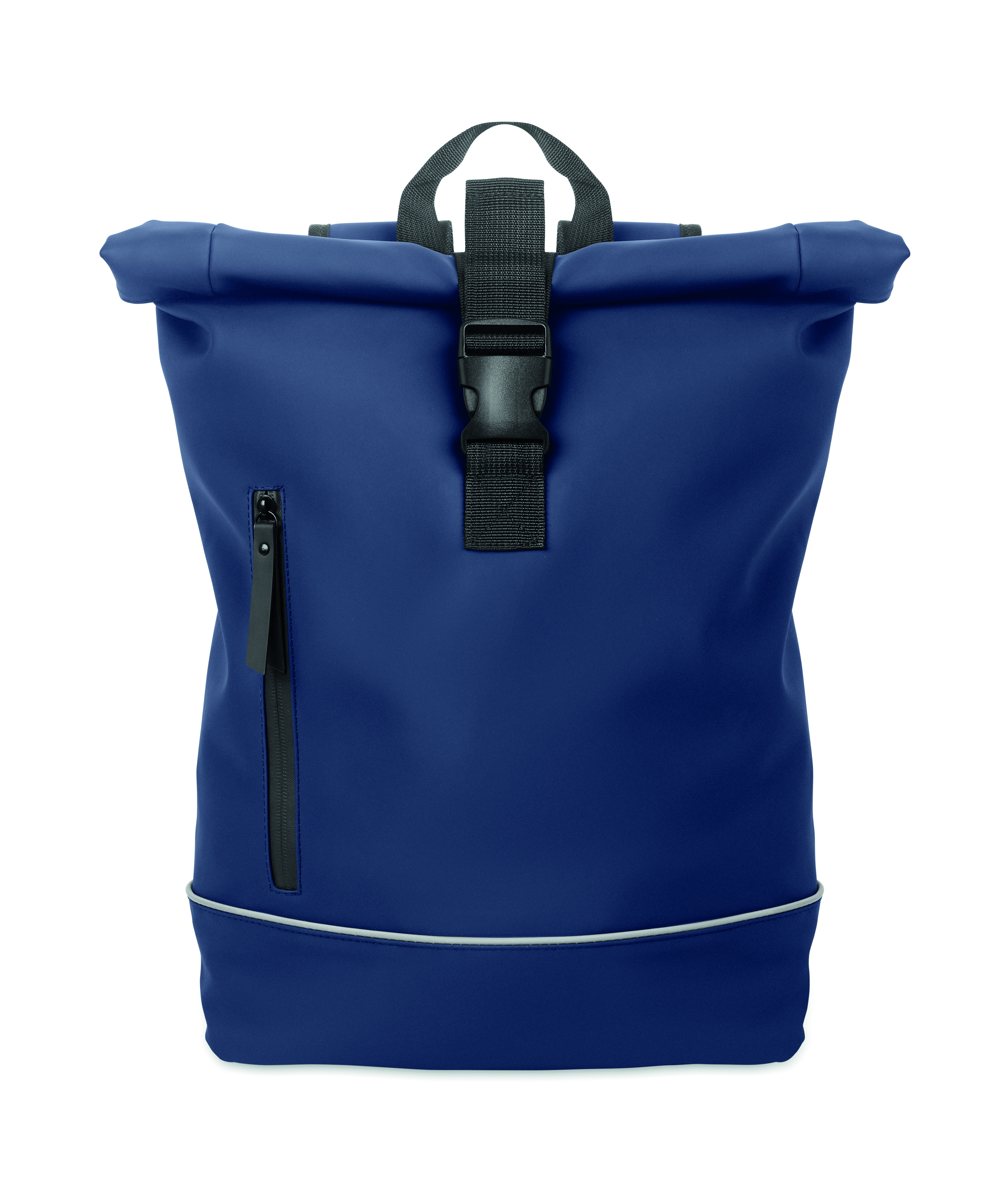 15-calowy plecak na laptopa z miękkiego PU z wyściełanym tyłem i wzmocnieniem podstawy z odblaskowym paskiem. Wodoodporna kieszeń przednia zapinana na zamek. Podszewka z poliestru 210D RPET.