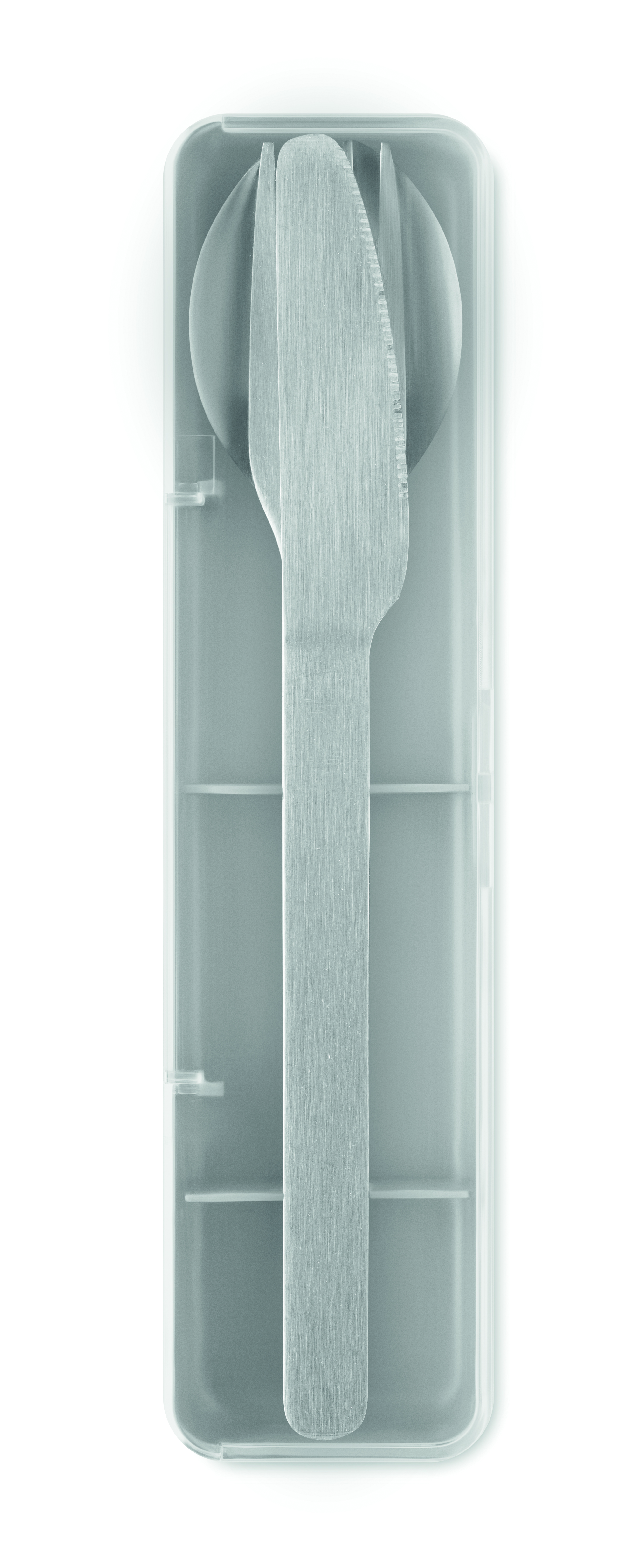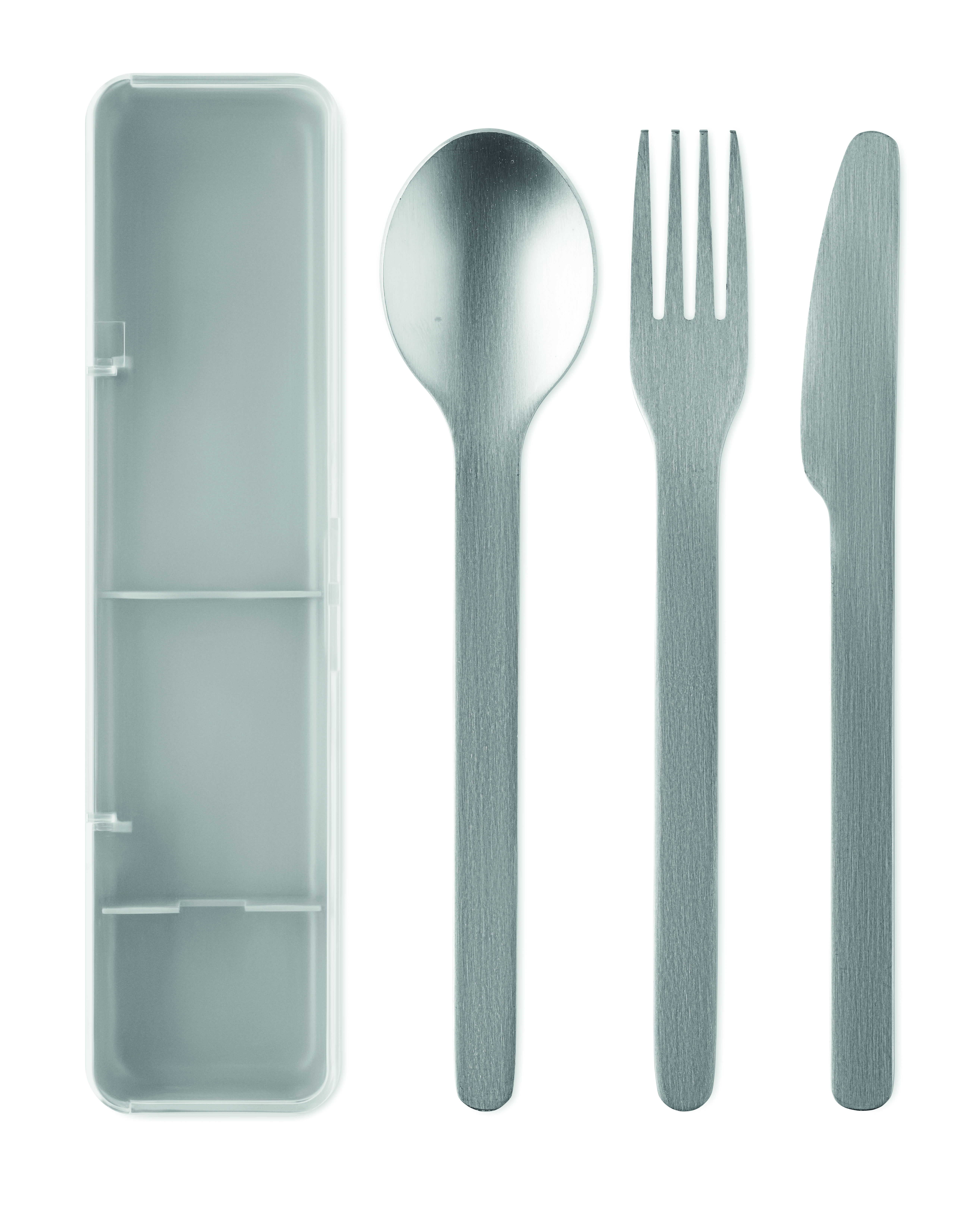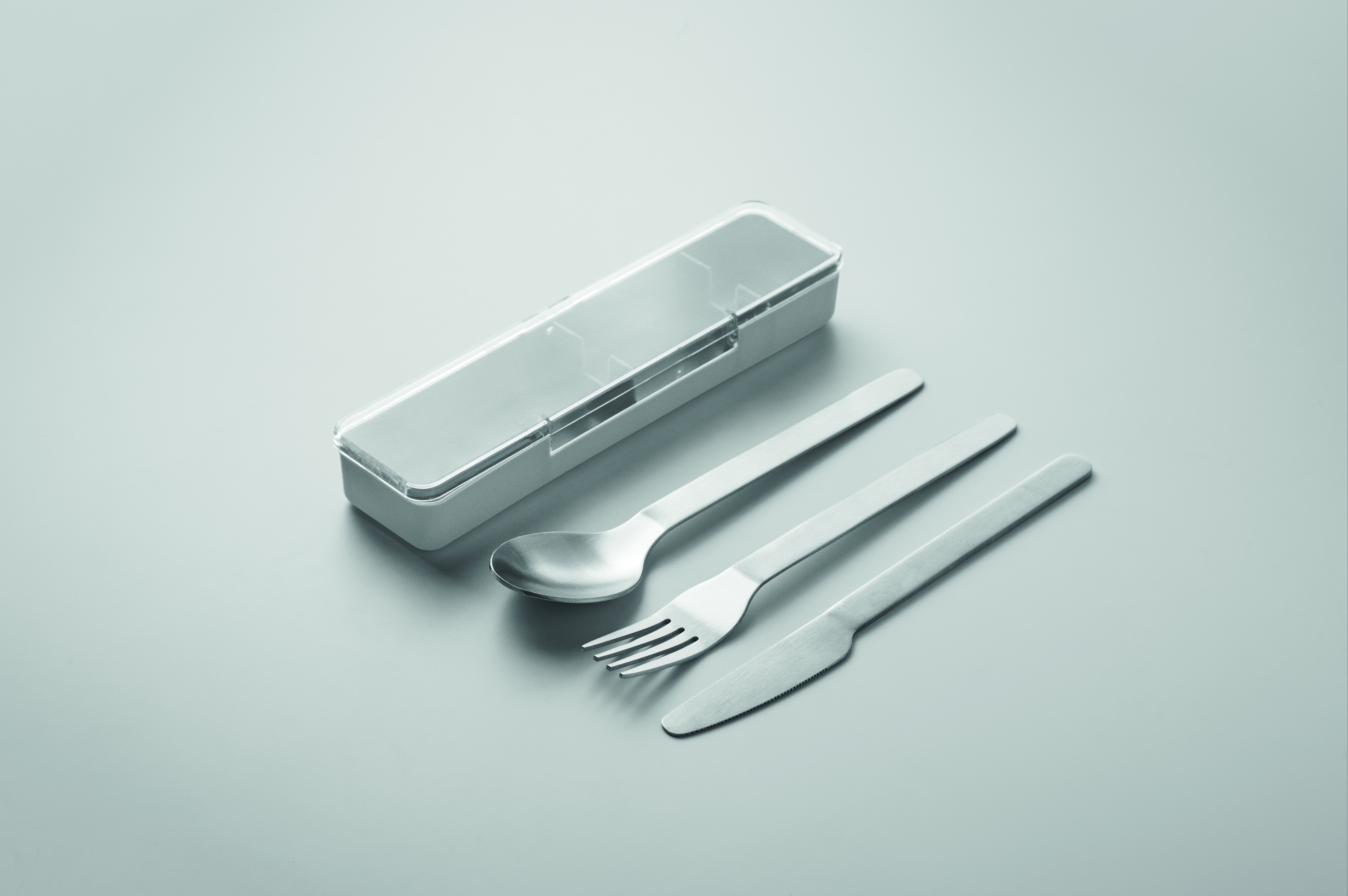 Zestaw sztućców ze stali nierdzewnej z etui z PP. Zestaw zawiera widelec, nóż i łyżkę.