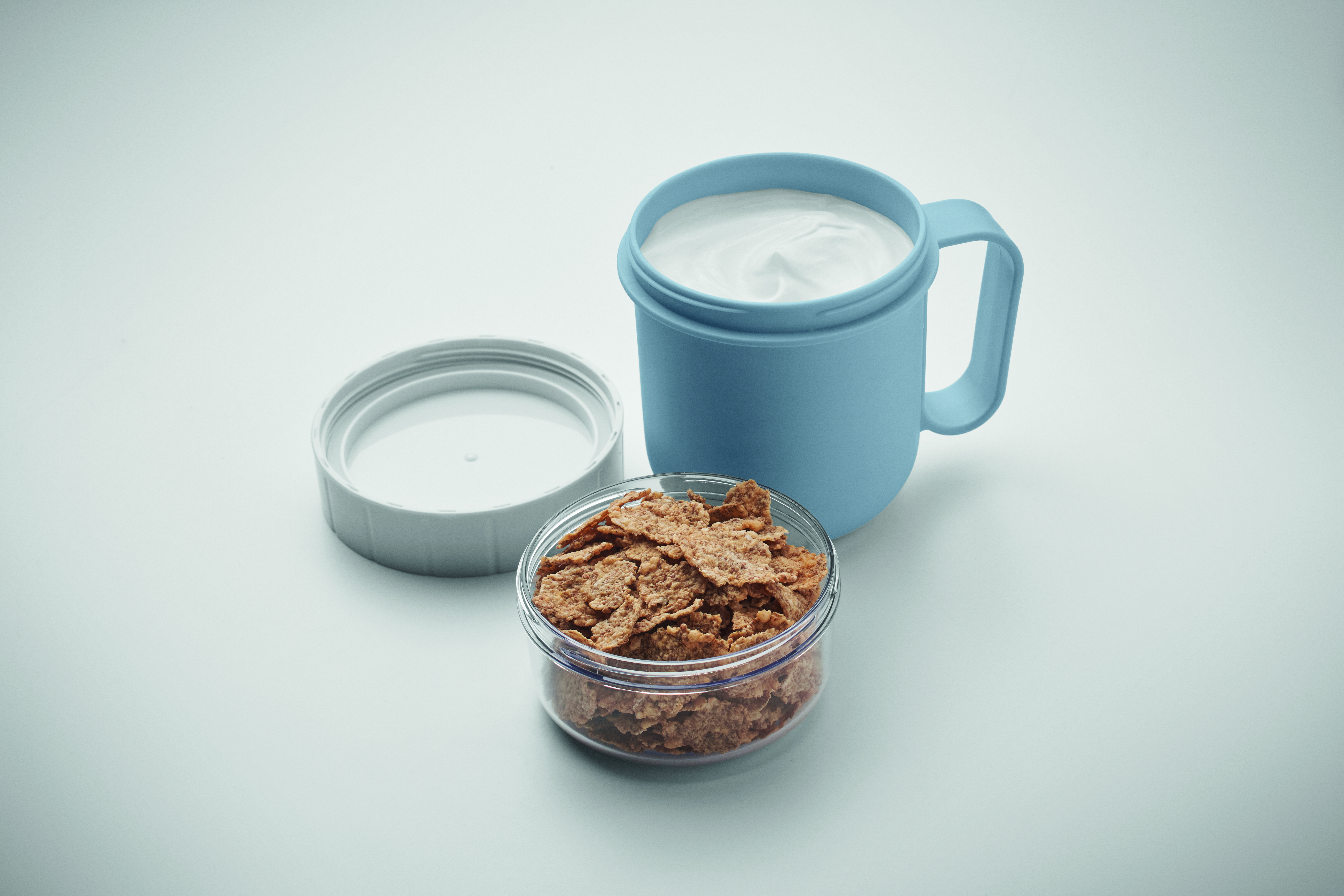 Kubek na śniadanie lub brunch w pojemniku z pokrywką PP i PS. Składa się z 2 oddzielnych pojemników do przechowywania składników oddzielnie. Pojemność: 450 ml i 160 ml. Nie przecieka.