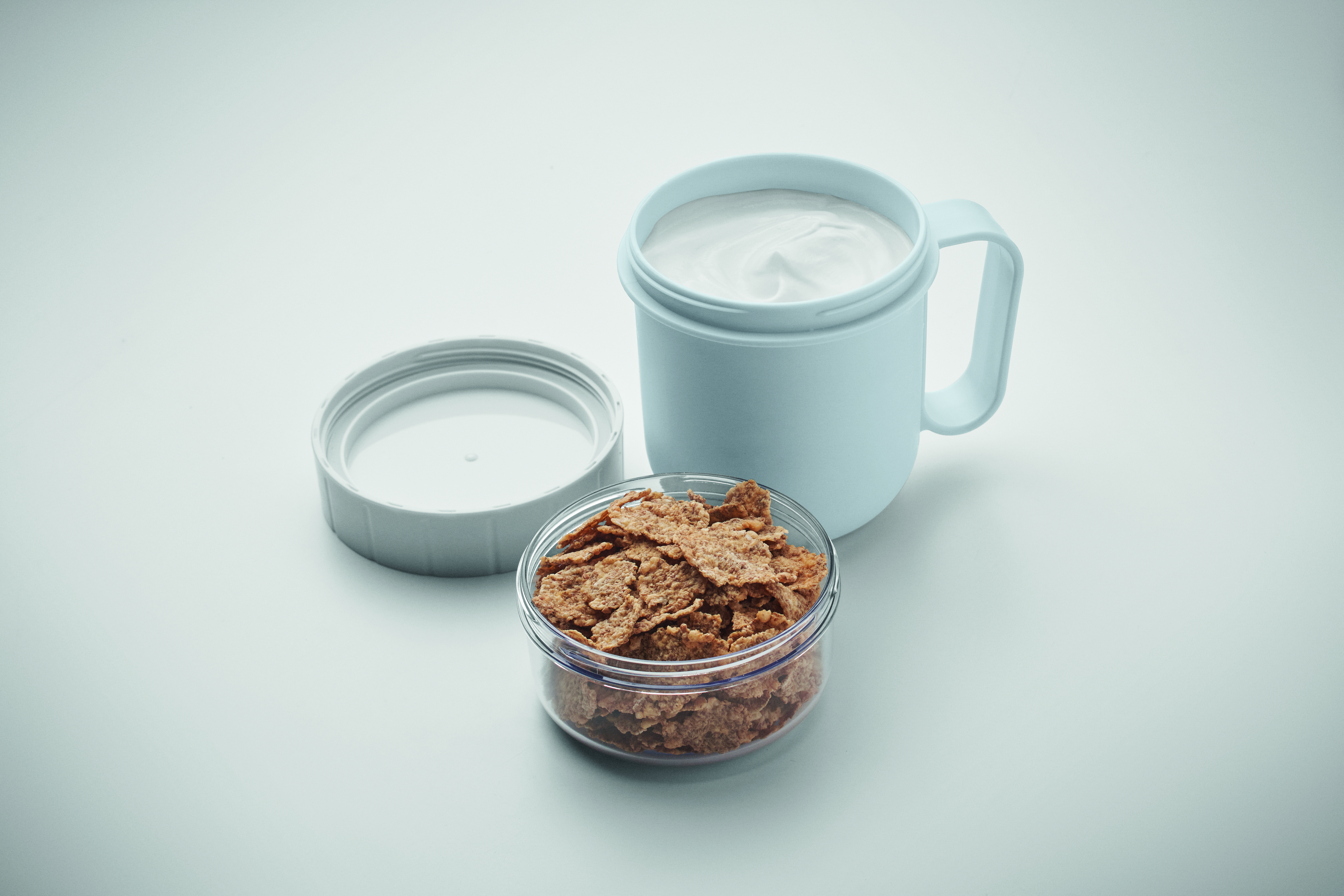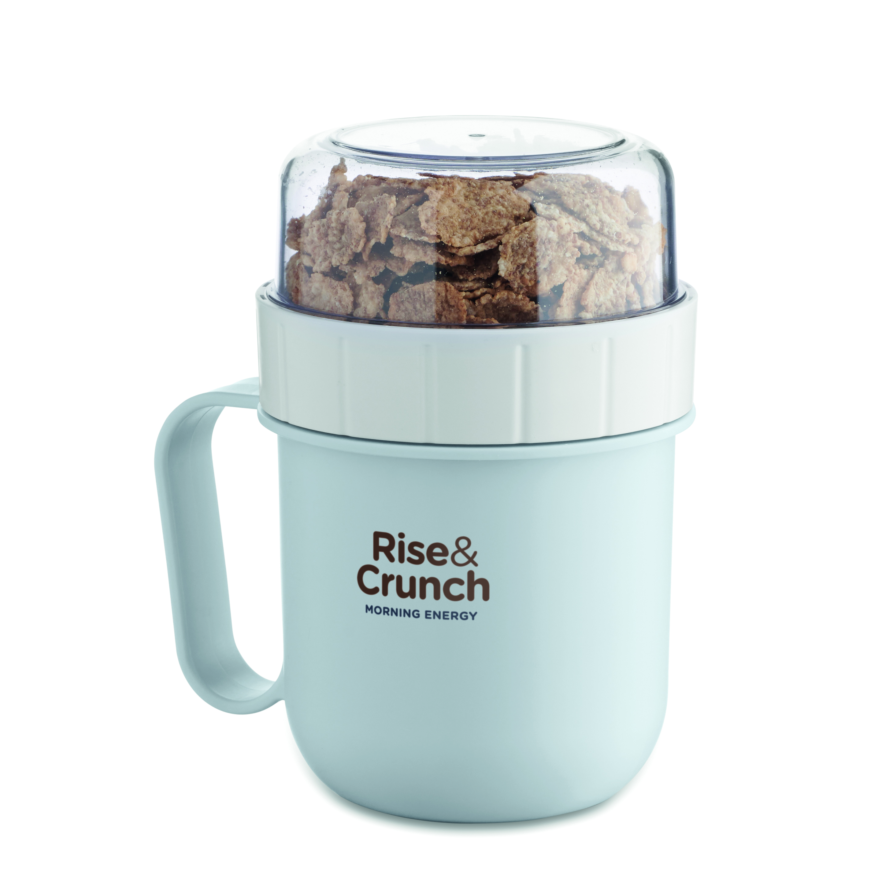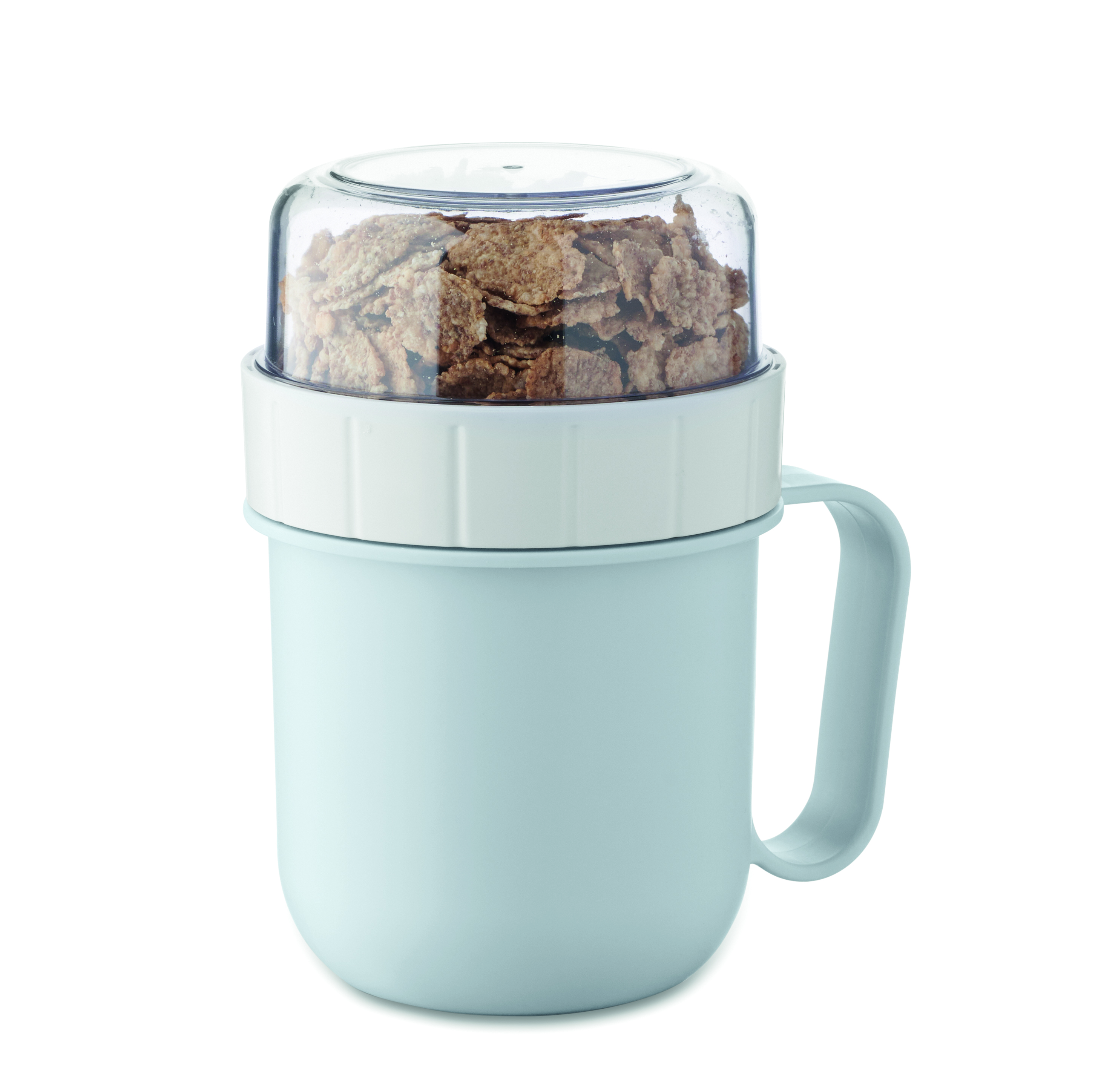 Kubek na śniadanie lub brunch w pojemniku z pokrywką PP i PS. Składa się z 2 oddzielnych pojemników do przechowywania składników oddzielnie. Pojemność: 450 ml i 160 ml. Nie przecieka.