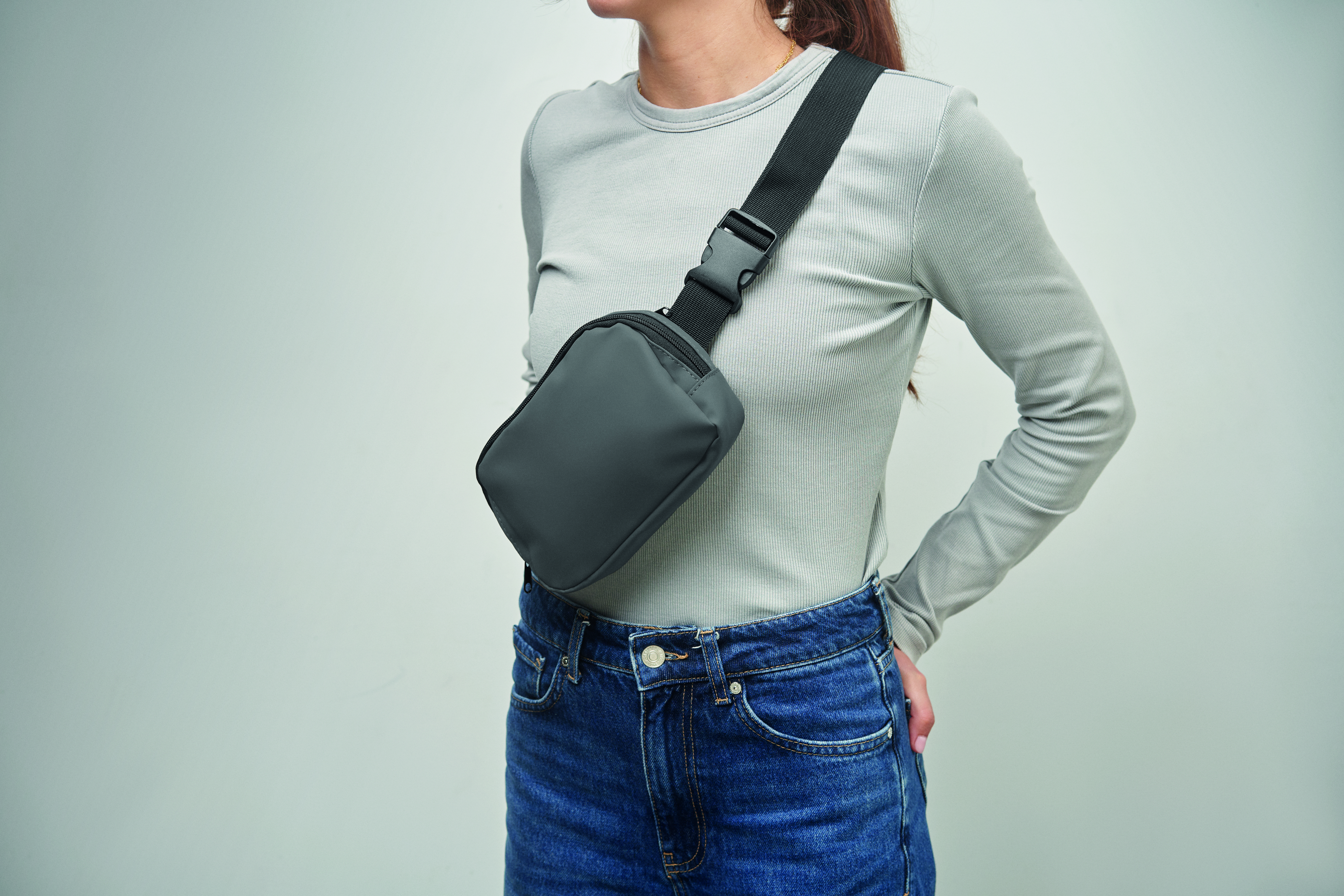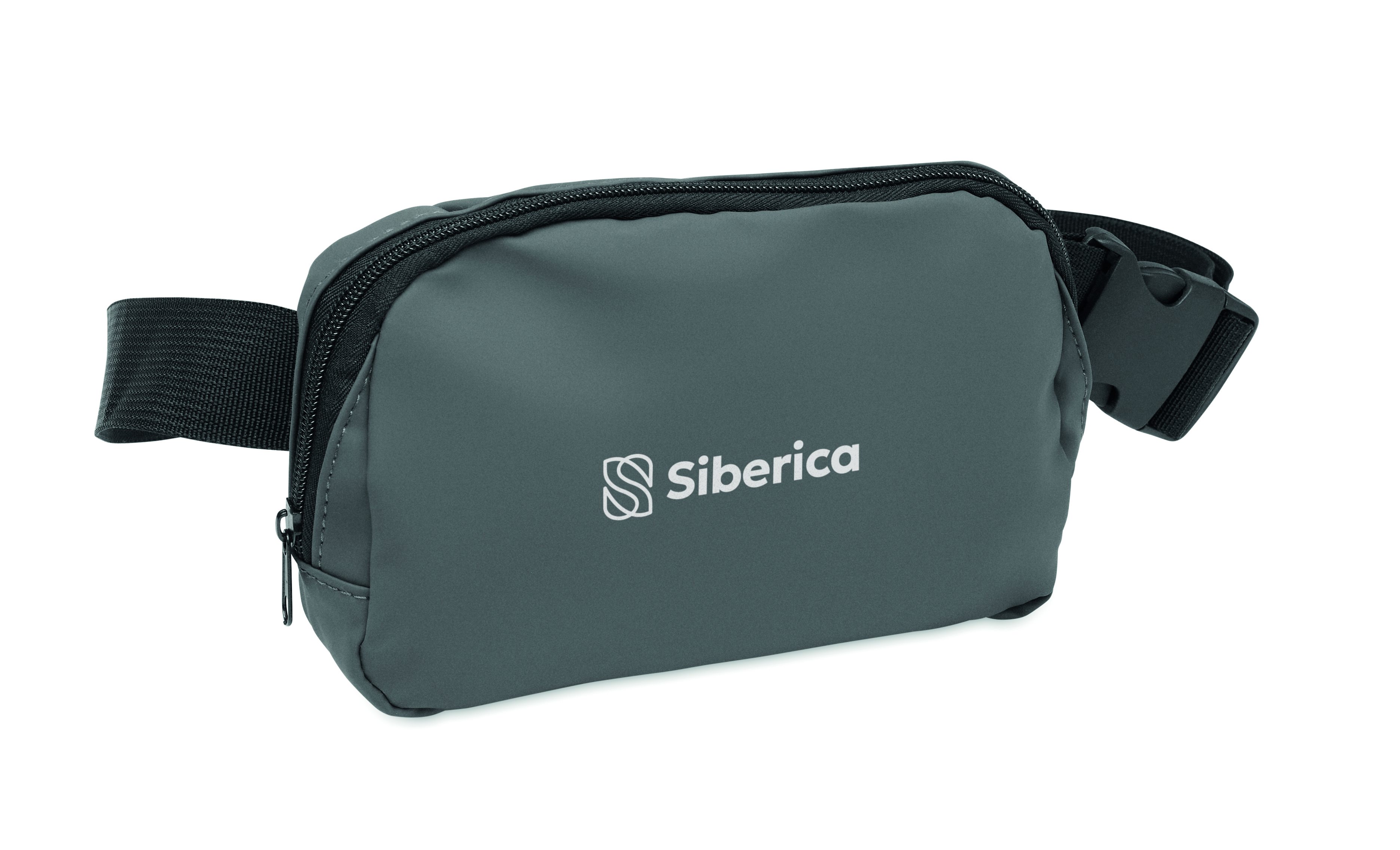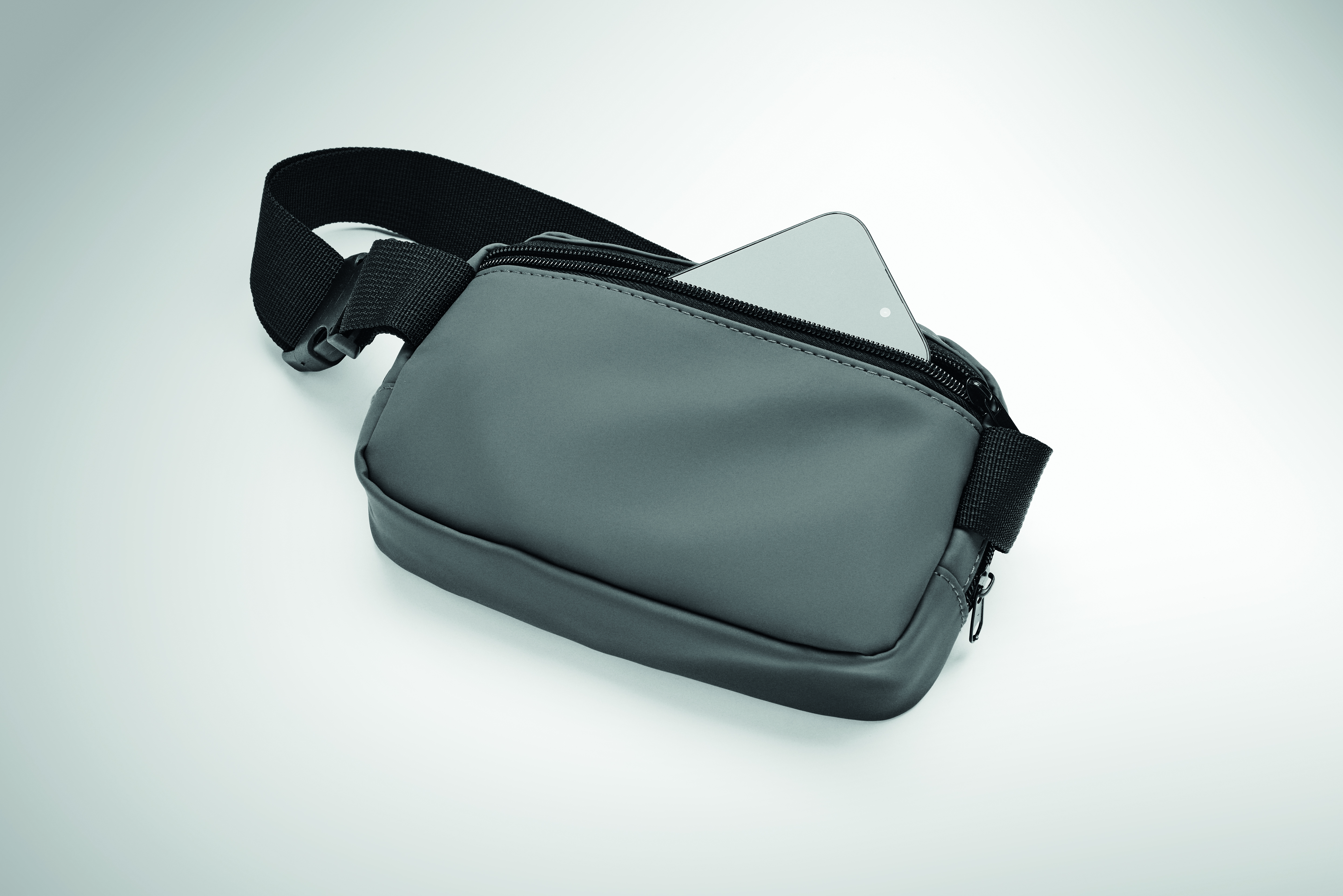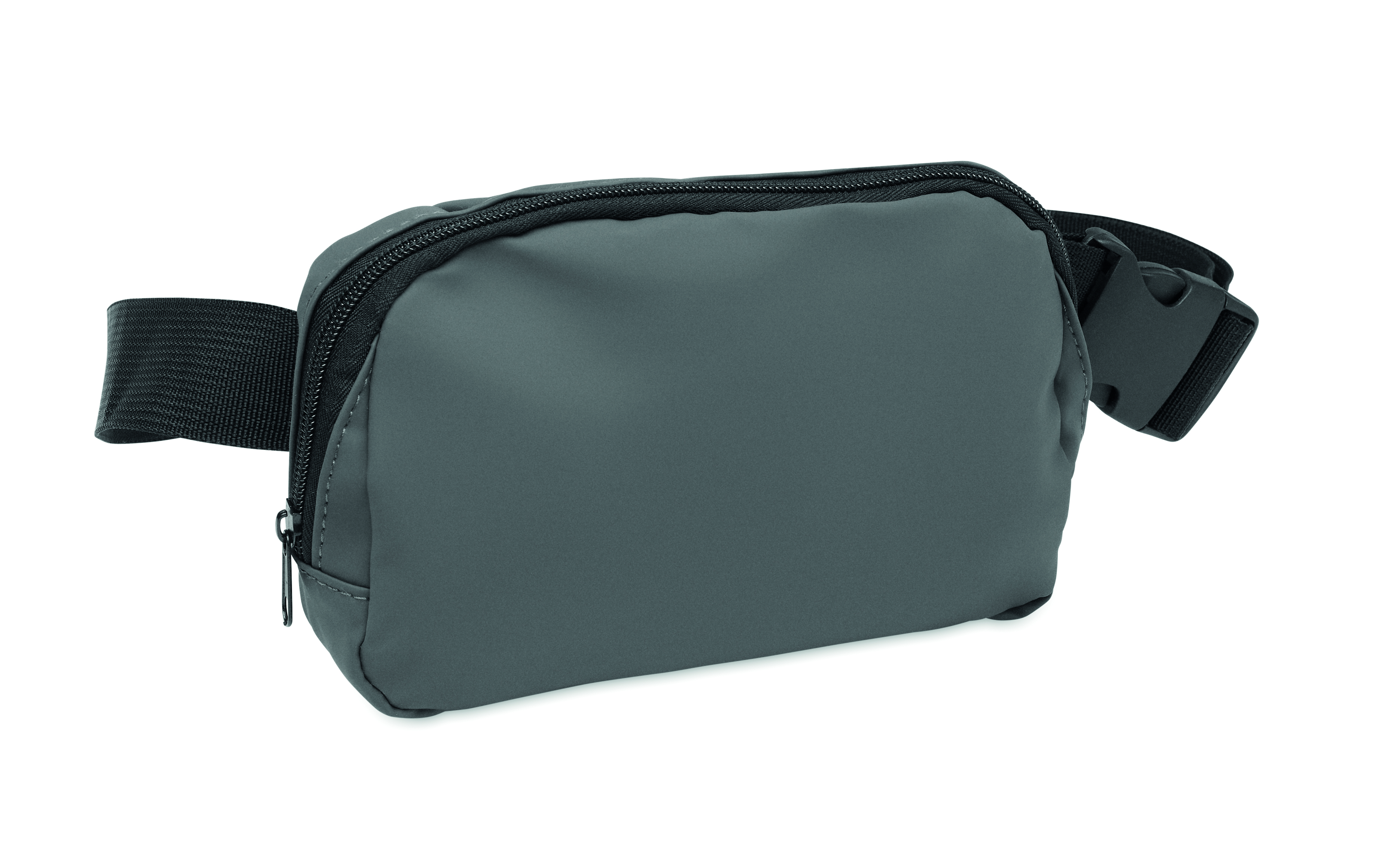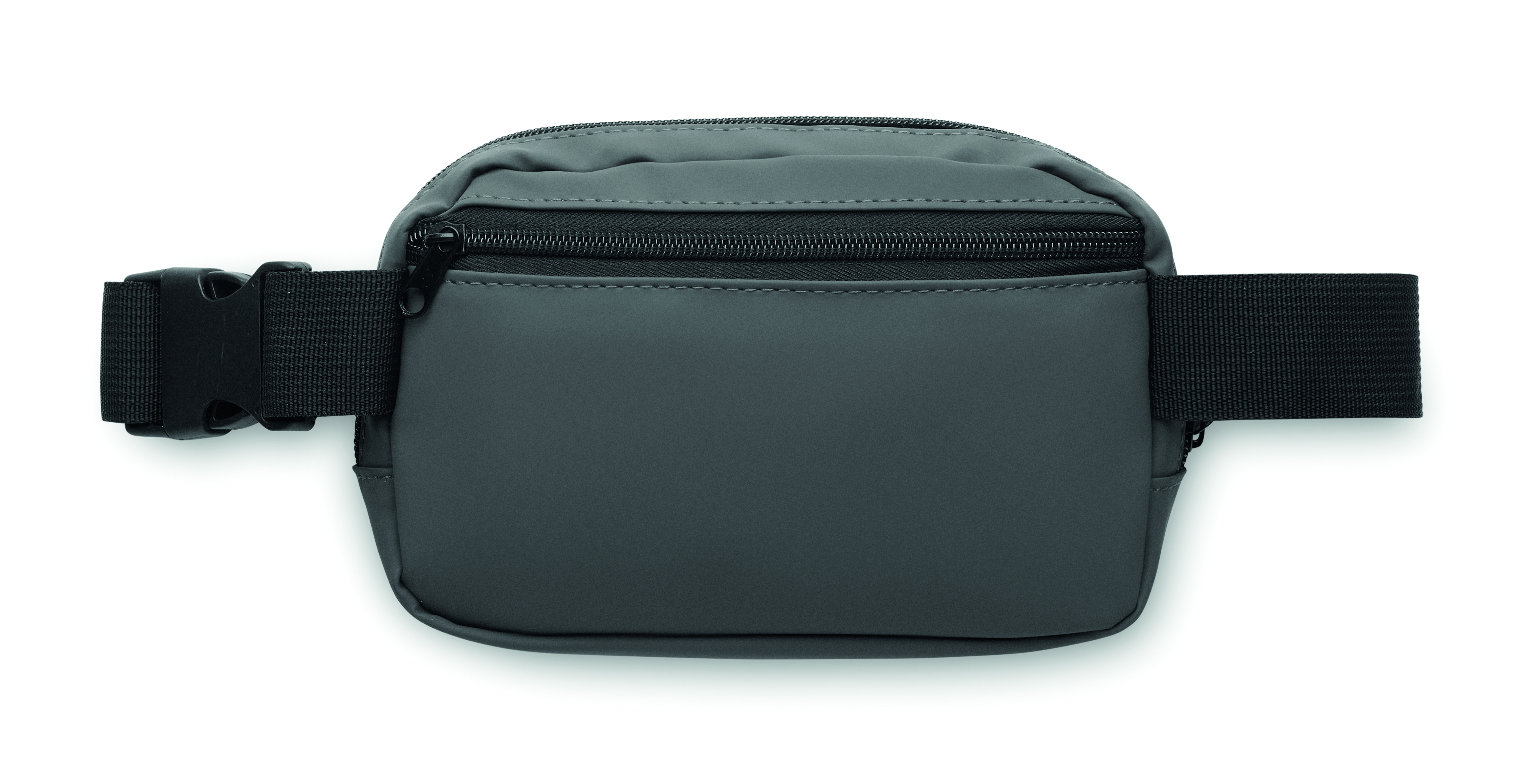 Torba biodrowa, nerka (cross body) z miękkiego PU z podszewką z poliestru 210D RPET. 1 główna kieszeń zapinana na zamek, 1 tylna kieszeń zapinana na zamek i wewnętrzna przegroda z siateczki.
