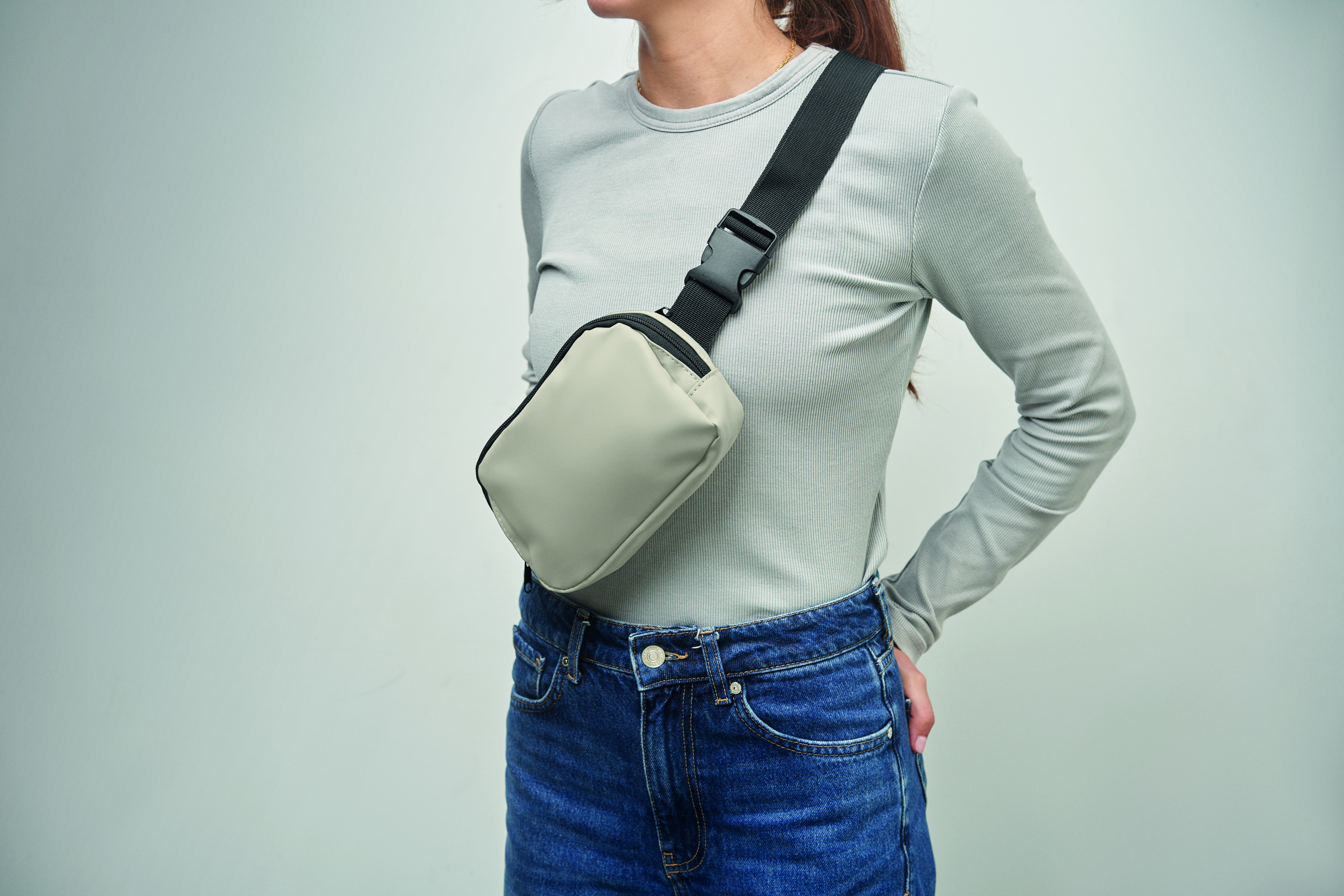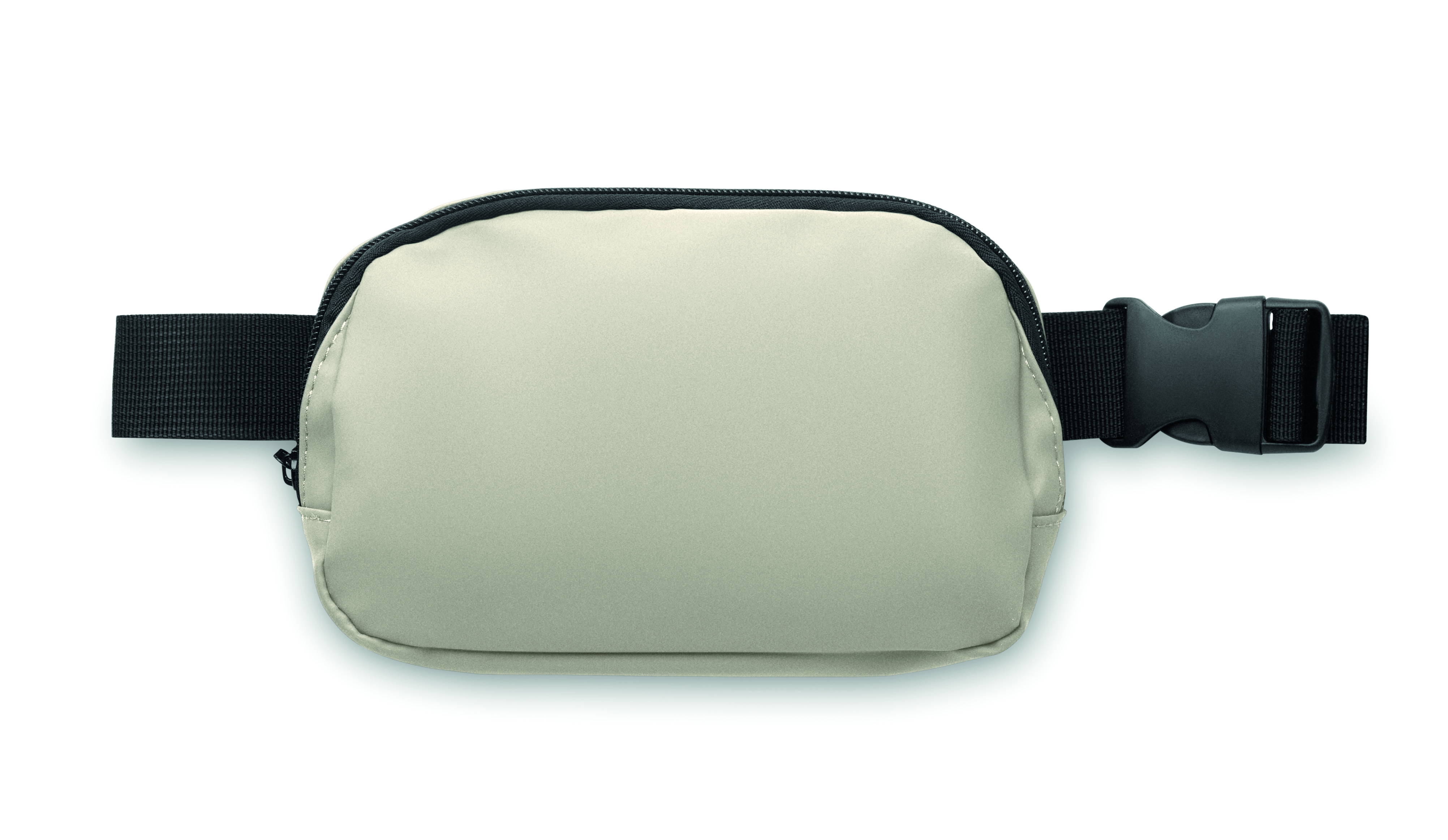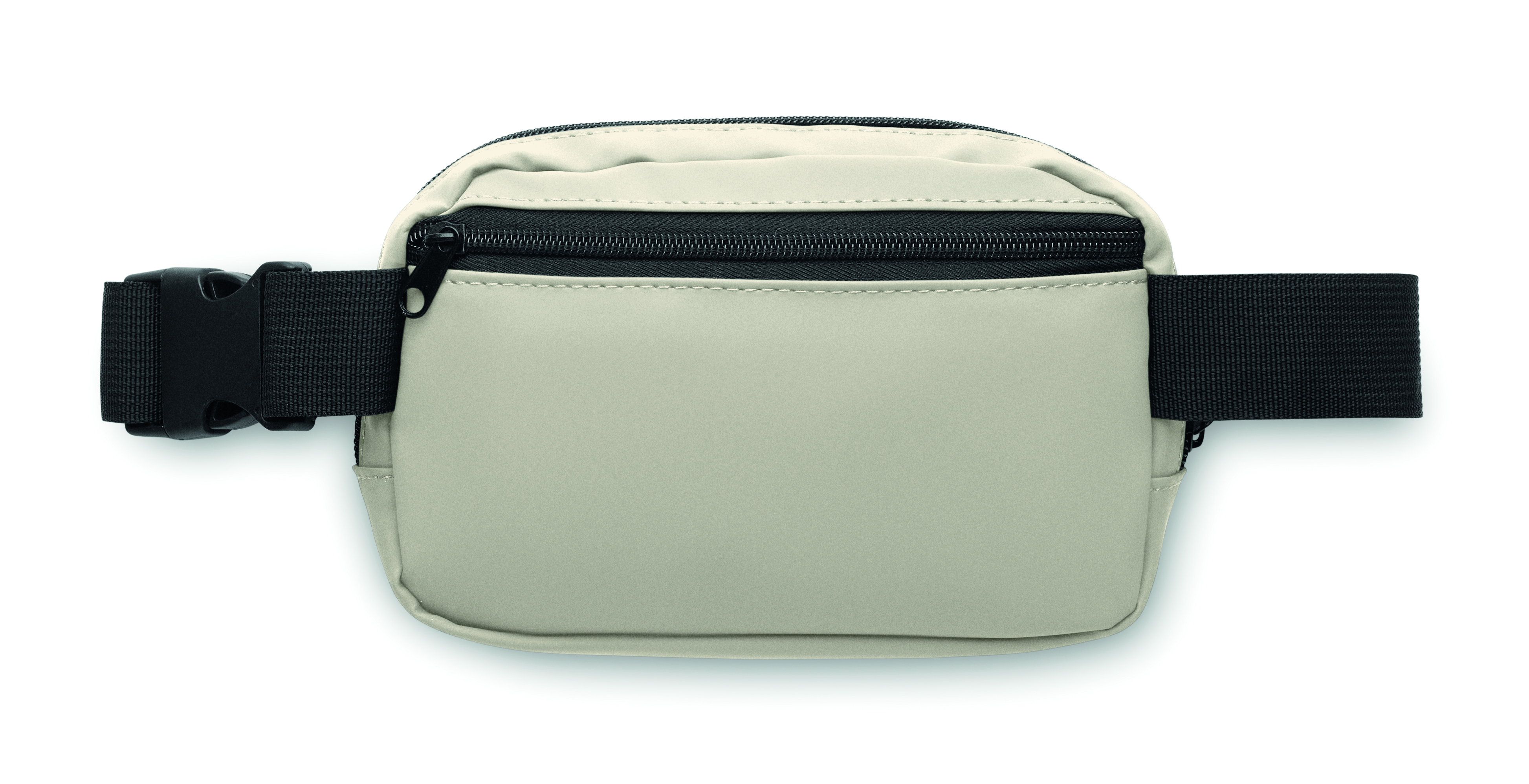 Torba biodrowa, nerka (cross body) z miękkiego PU z podszewką z poliestru 210D RPET. 1 główna kieszeń zapinana na zamek, 1 tylna kieszeń zapinana na zamek i wewnętrzna przegroda z siateczki.