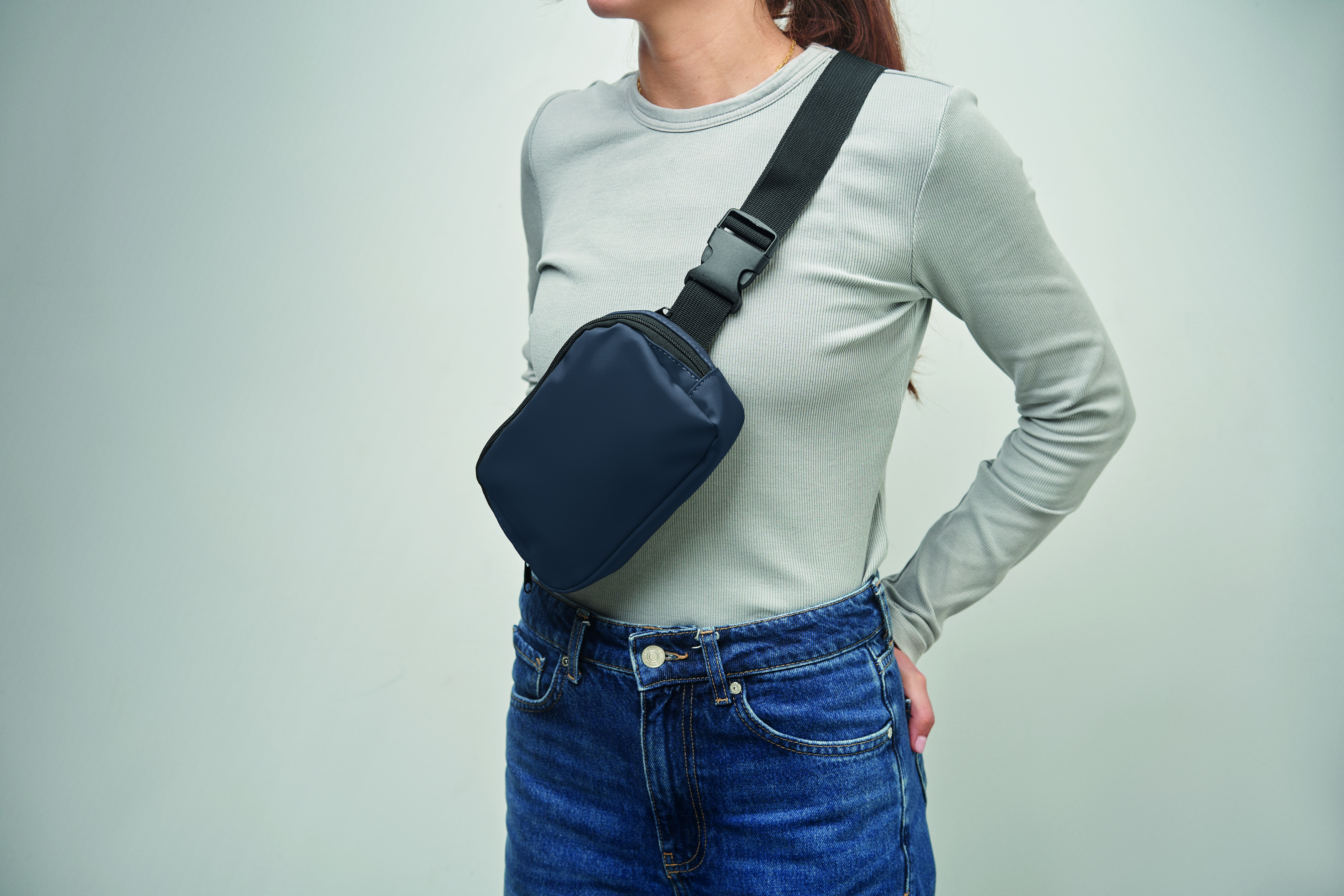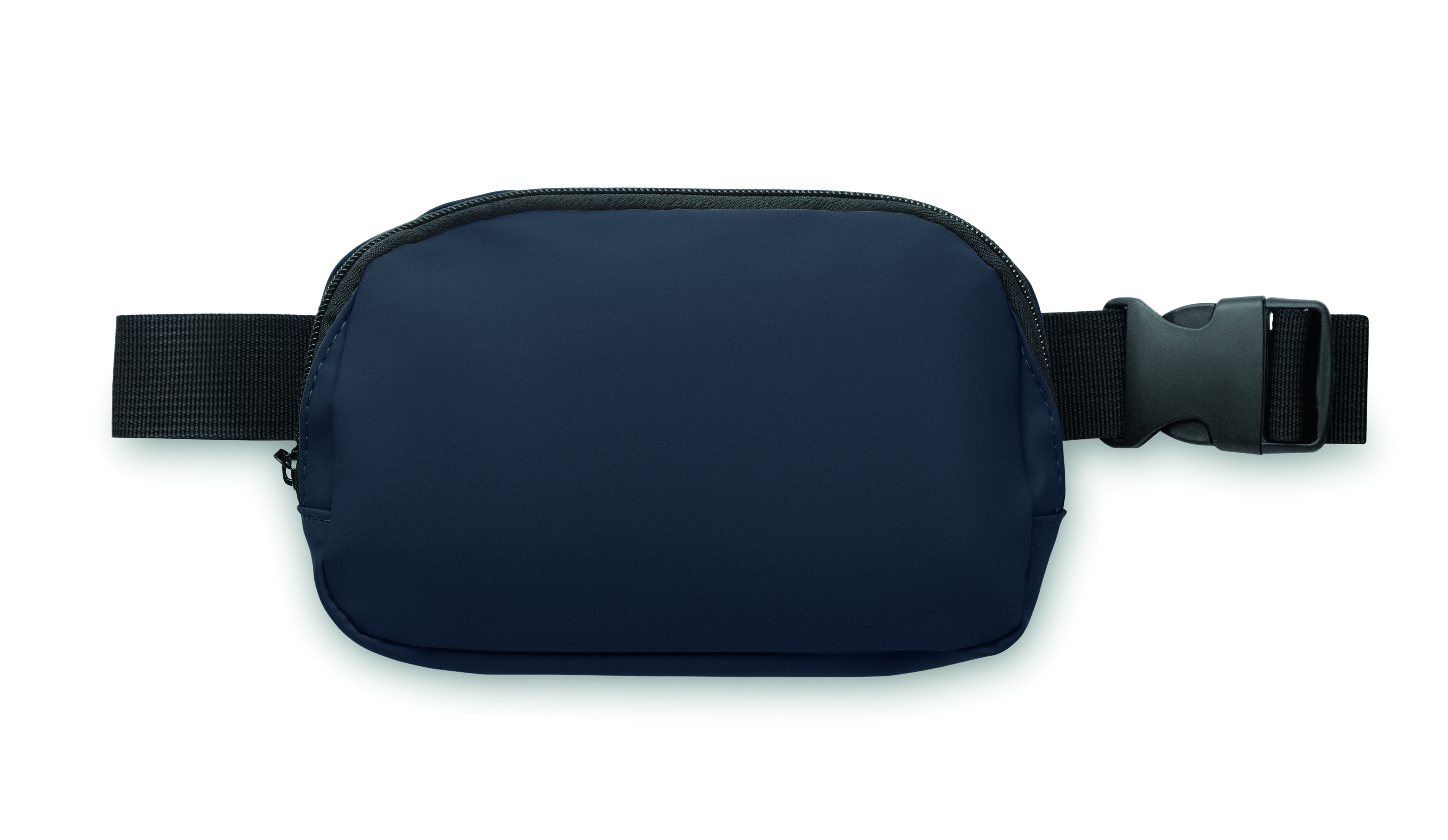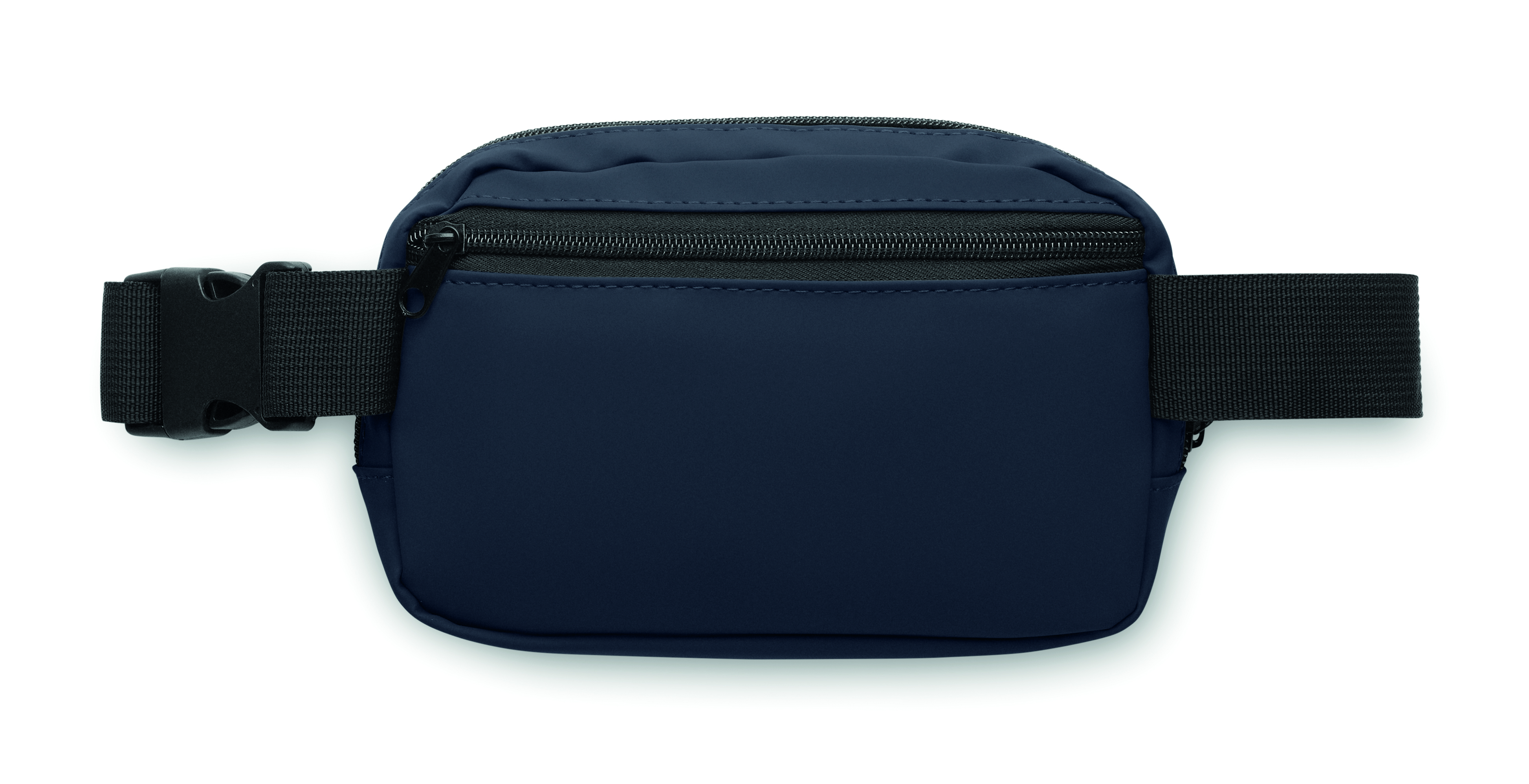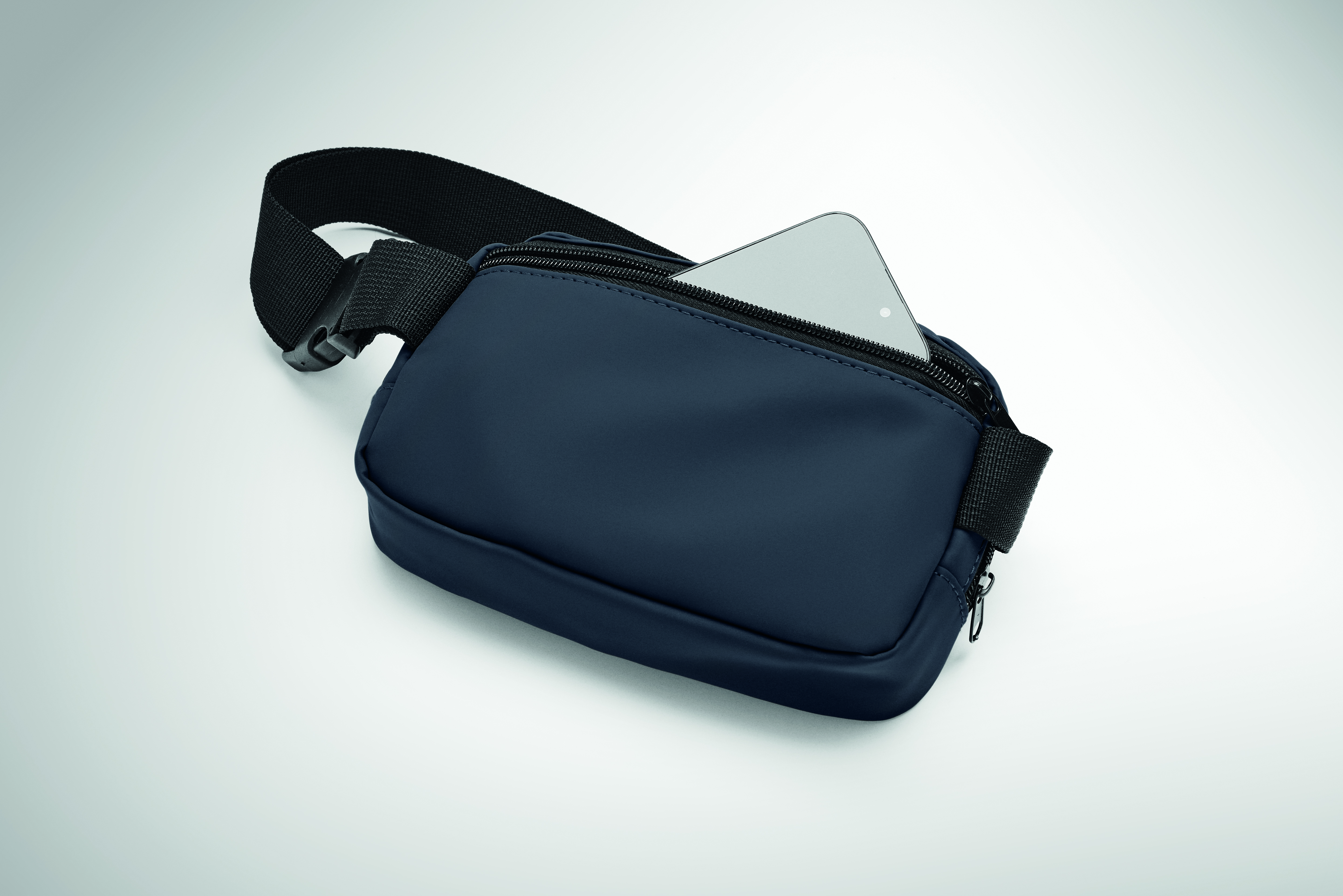 Torba biodrowa, nerka (cross body) z miękkiego PU z podszewką z poliestru 210D RPET. 1 główna kieszeń zapinana na zamek, 1 tylna kieszeń zapinana na zamek i wewnętrzna przegroda z siateczki.