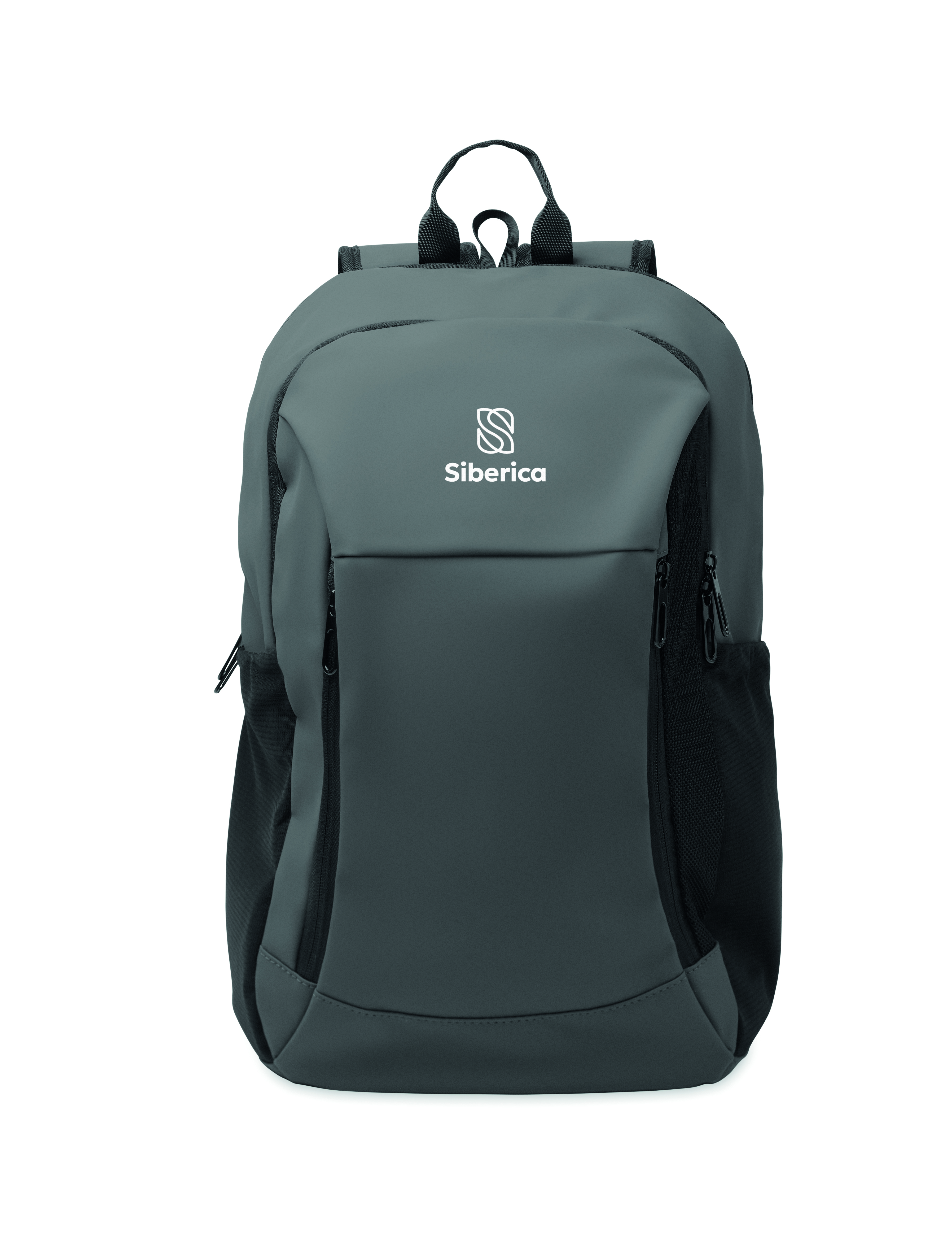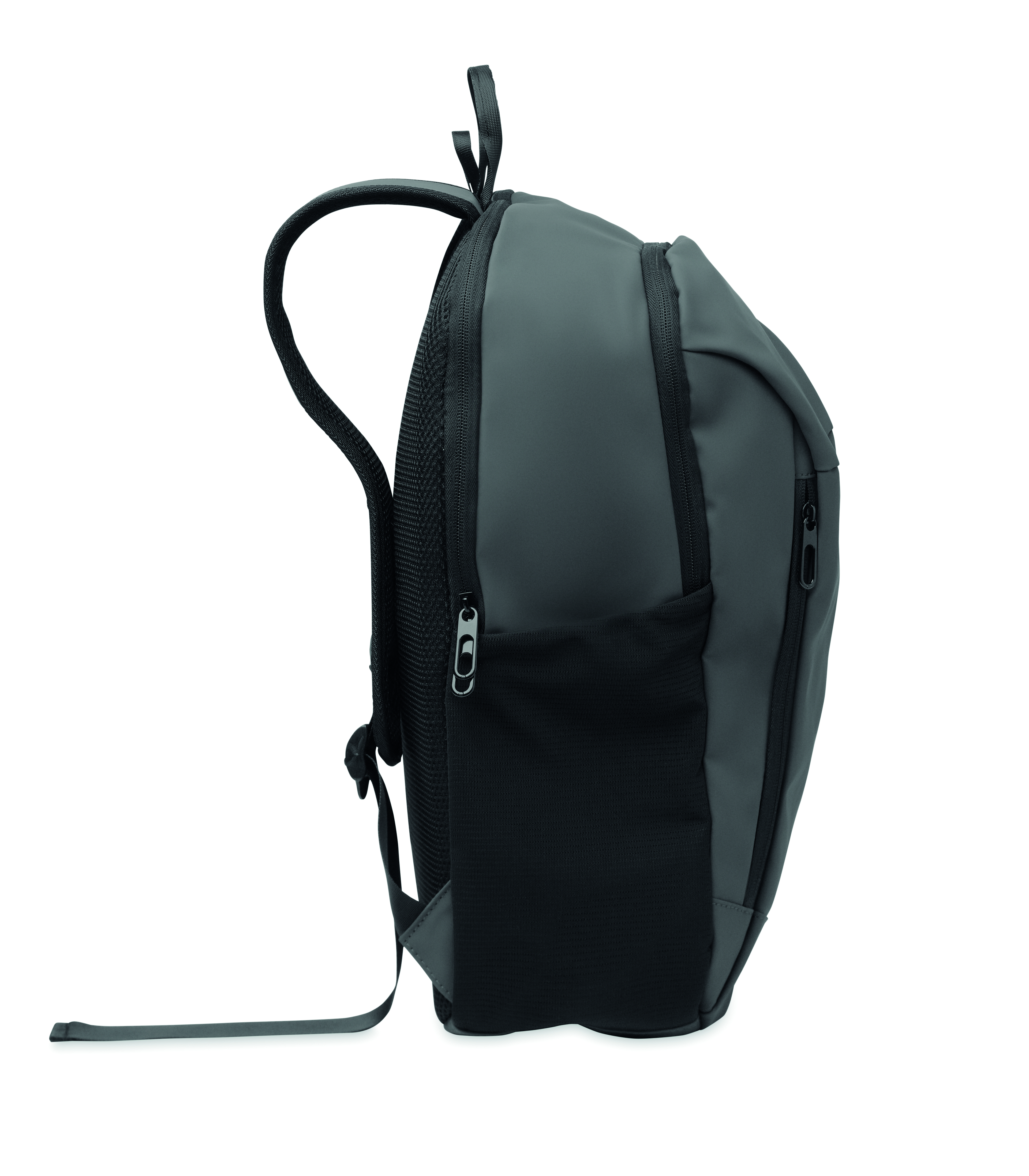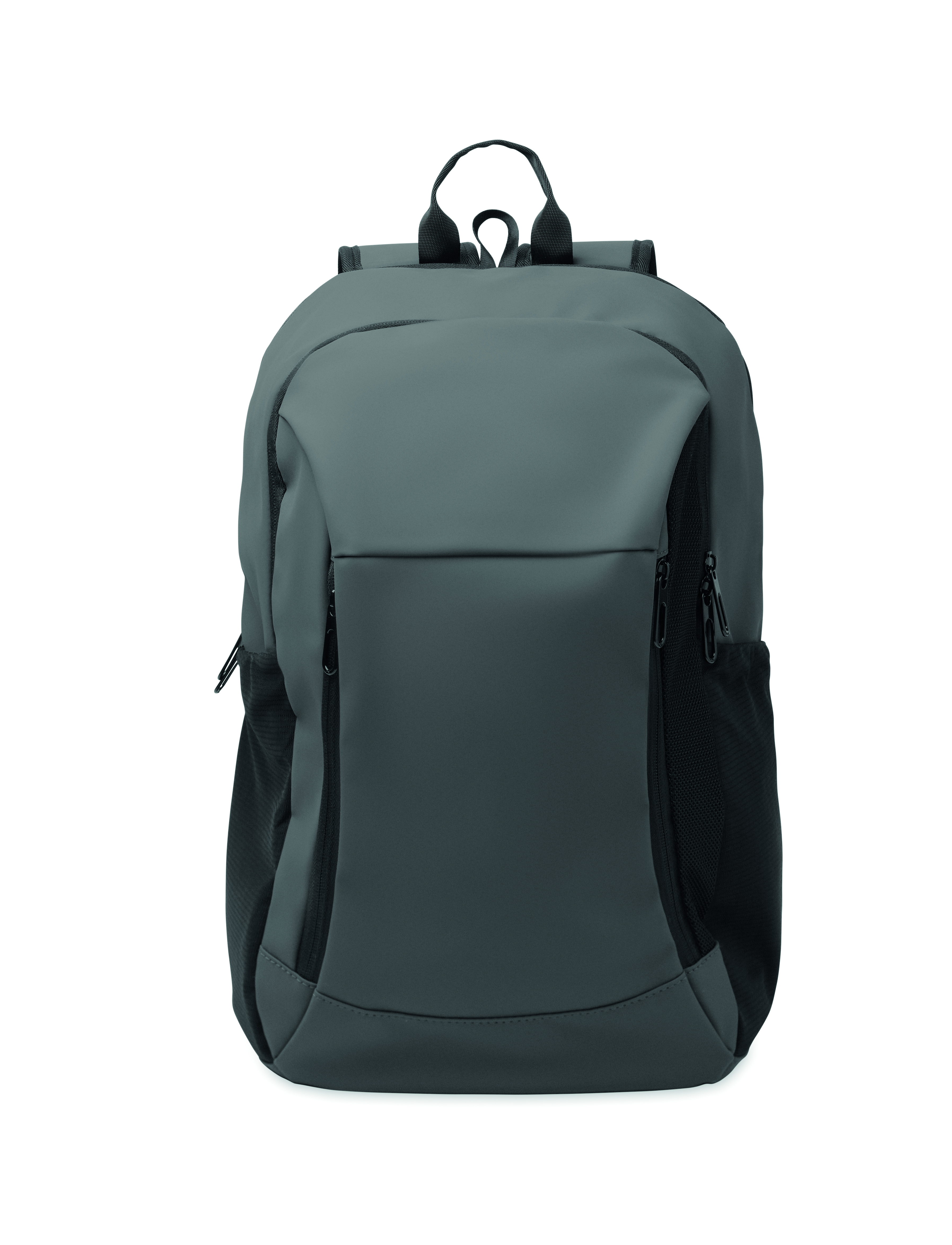 Plecak na laptopa 15 cali z miękkiego PU z wyściełanym tyłem i ukrytą komorą główną zapinaną na zamek. 1 przednia kieszeń zapinana na zamek, 2 przednie boczne kieszenie zapinane na zamek i 2 boczne kieszenie z elastycznej siatki. Podszewka z RPET 210D.