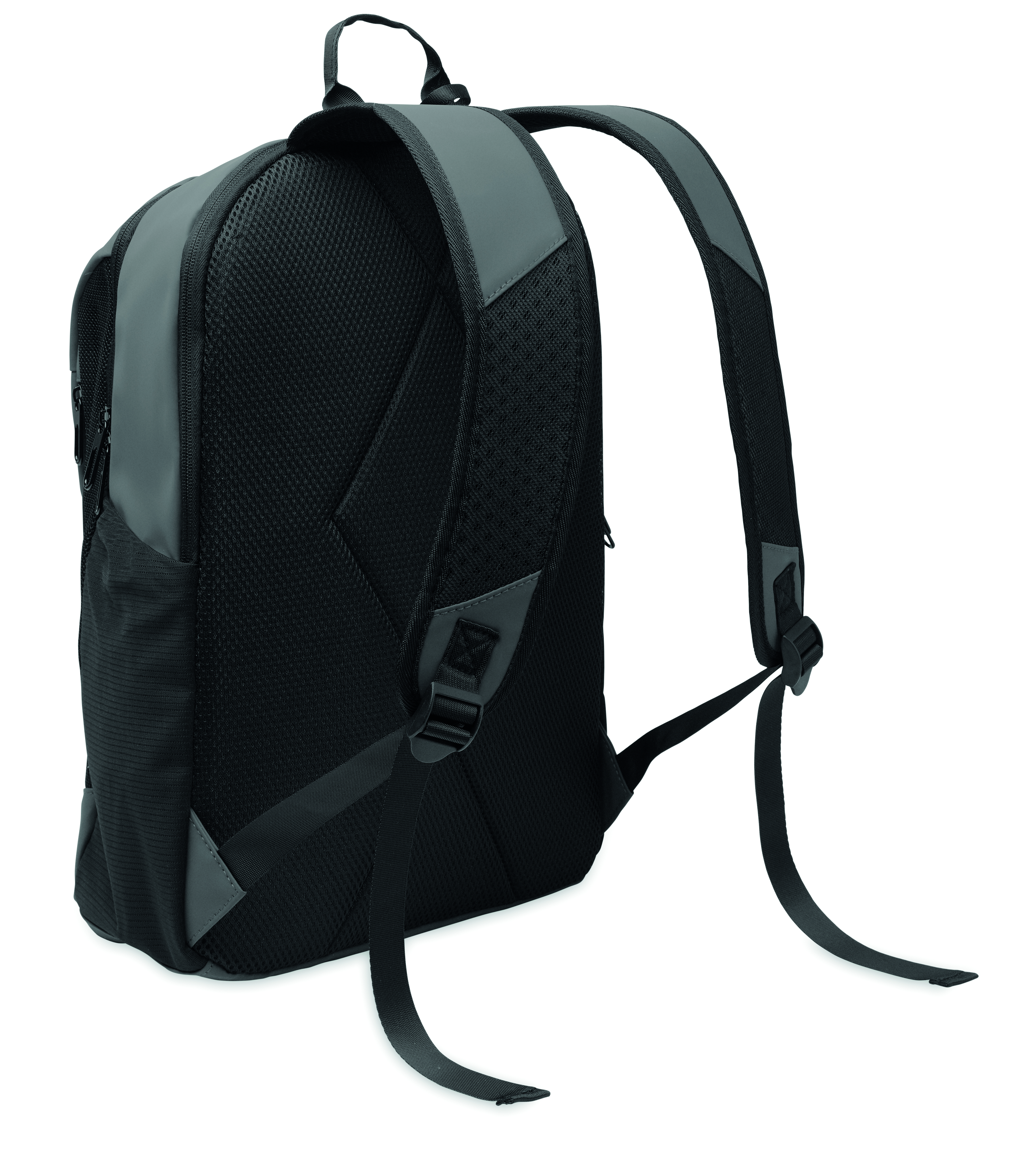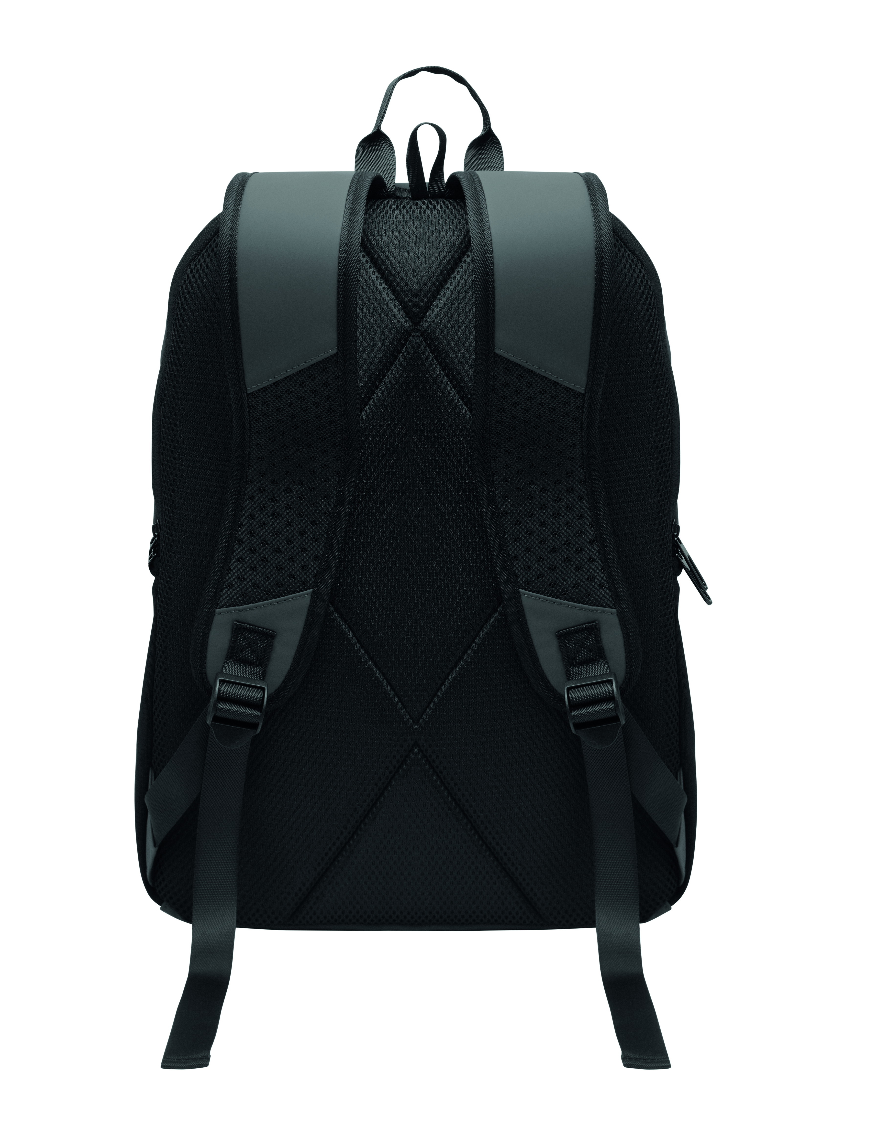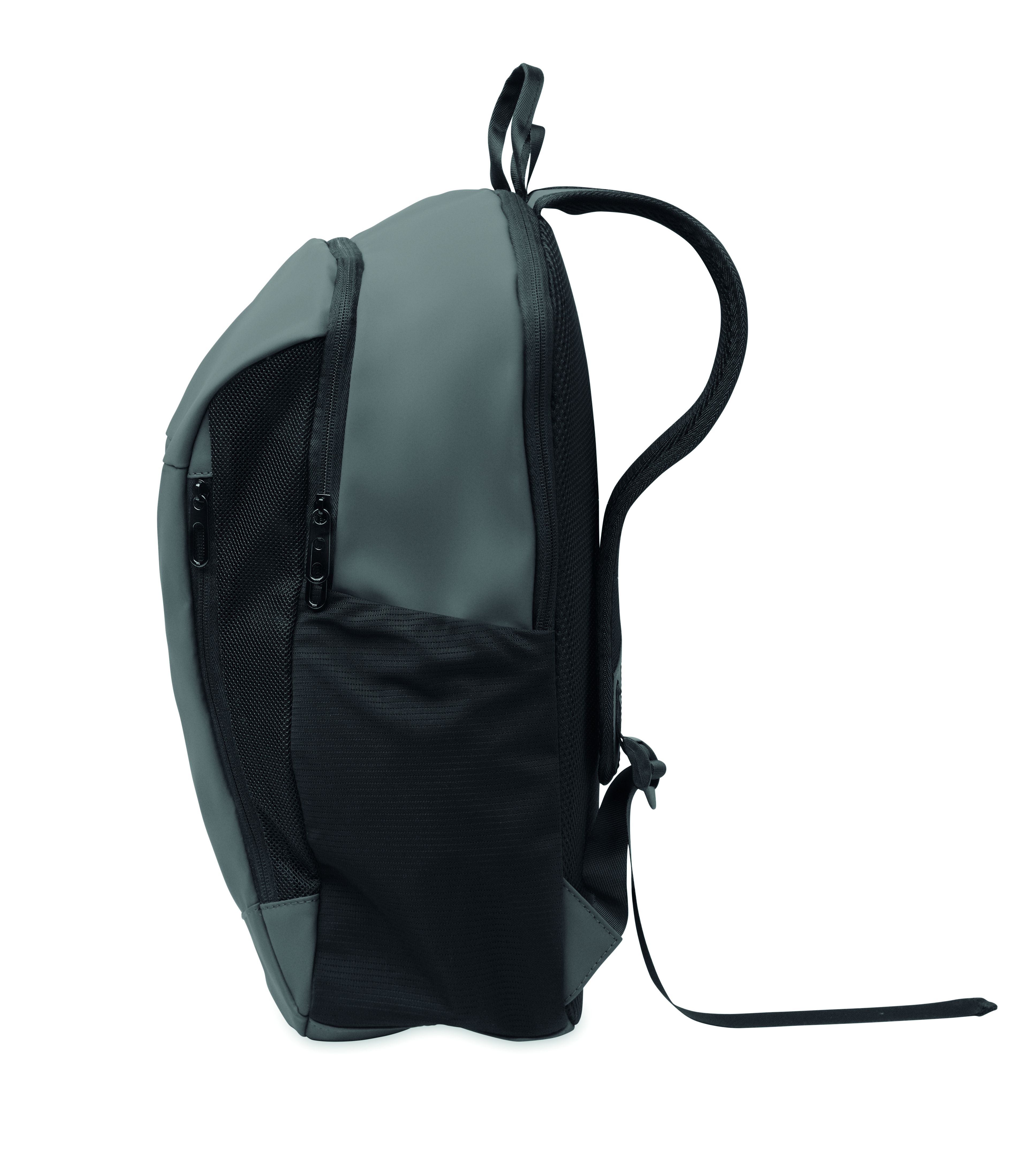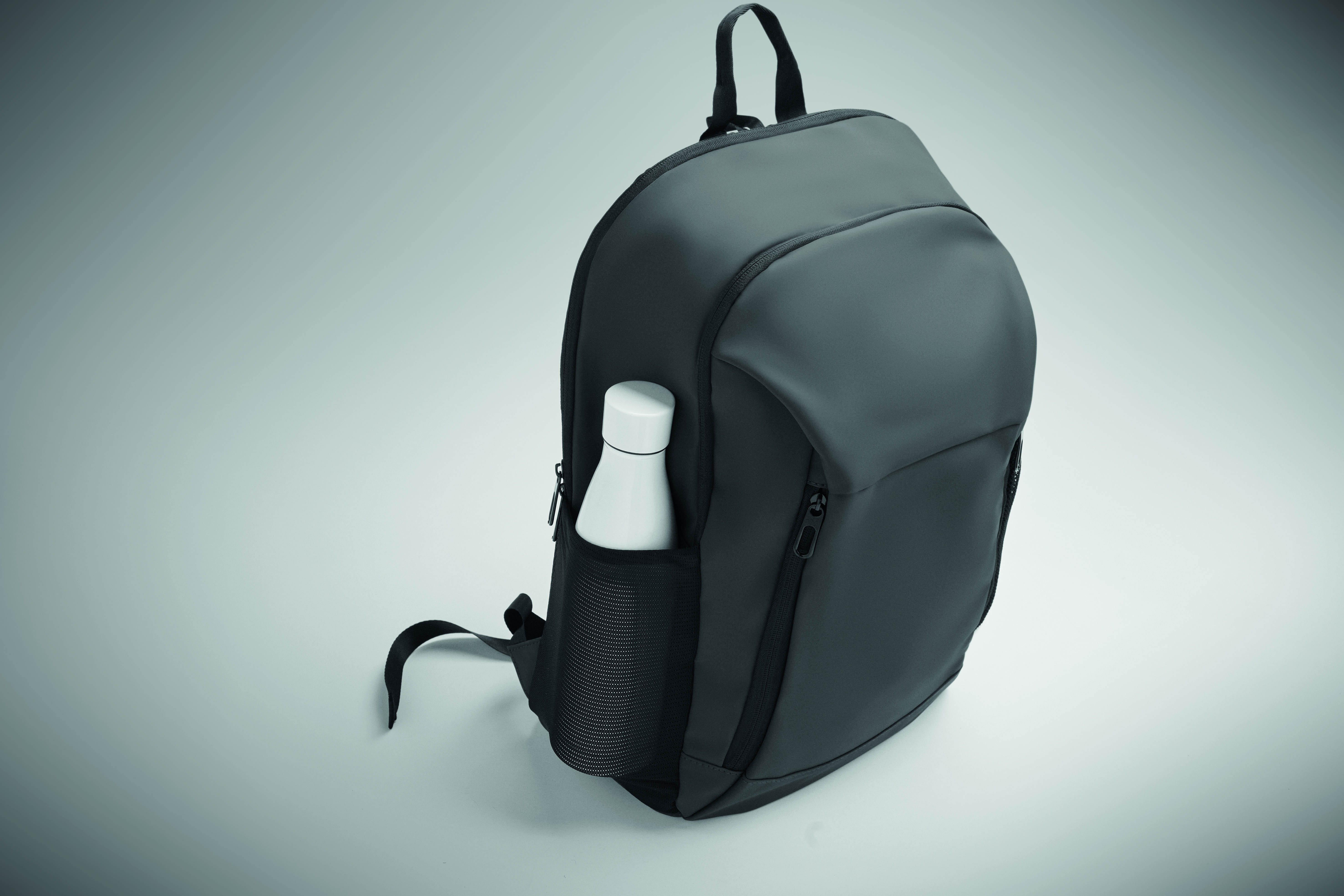 Plecak na laptopa 15 cali z miękkiego PU z wyściełanym tyłem i ukrytą komorą główną zapinaną na zamek. 1 przednia kieszeń zapinana na zamek, 2 przednie boczne kieszenie zapinane na zamek i 2 boczne kieszenie z elastycznej siatki. Podszewka z RPET 210D.