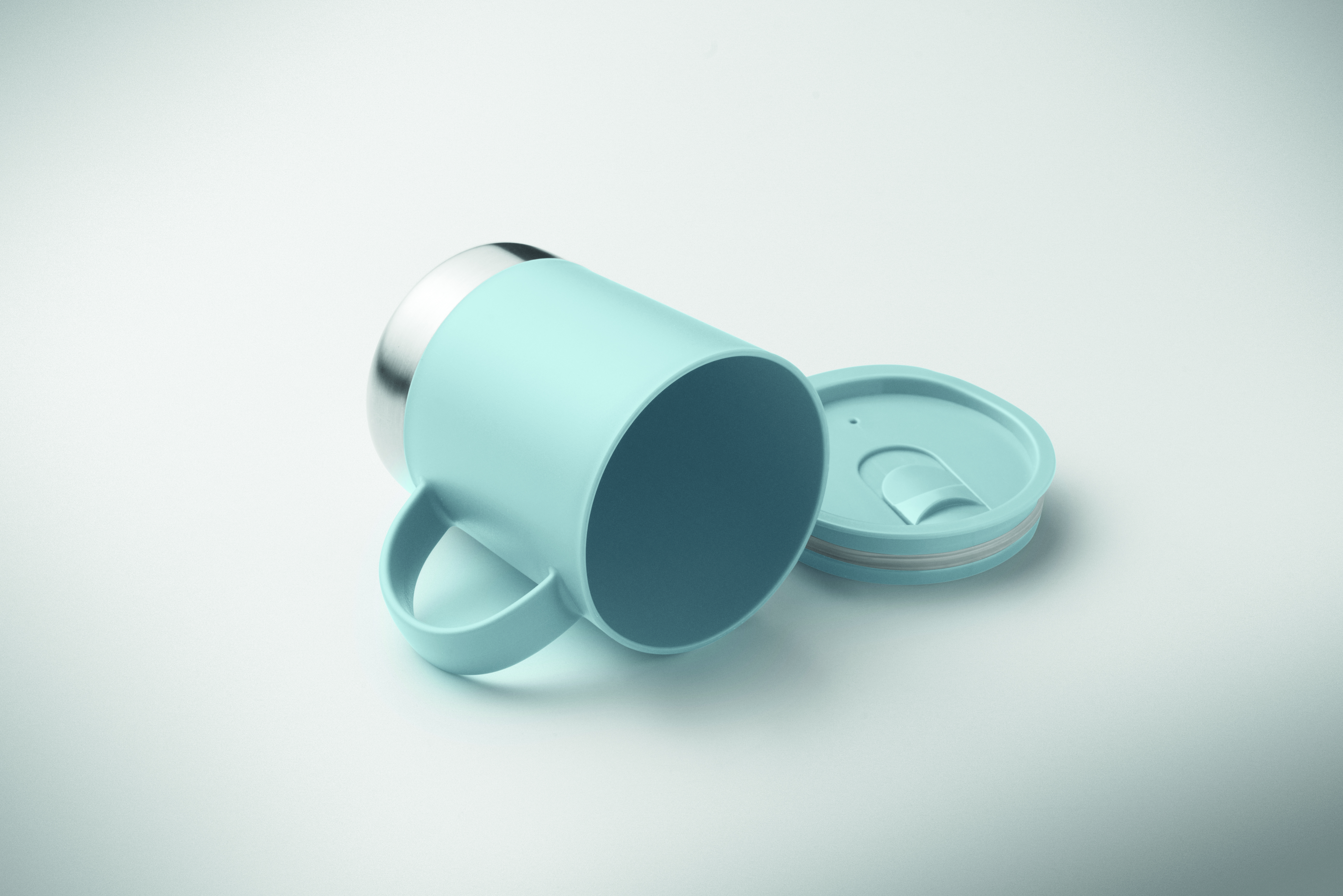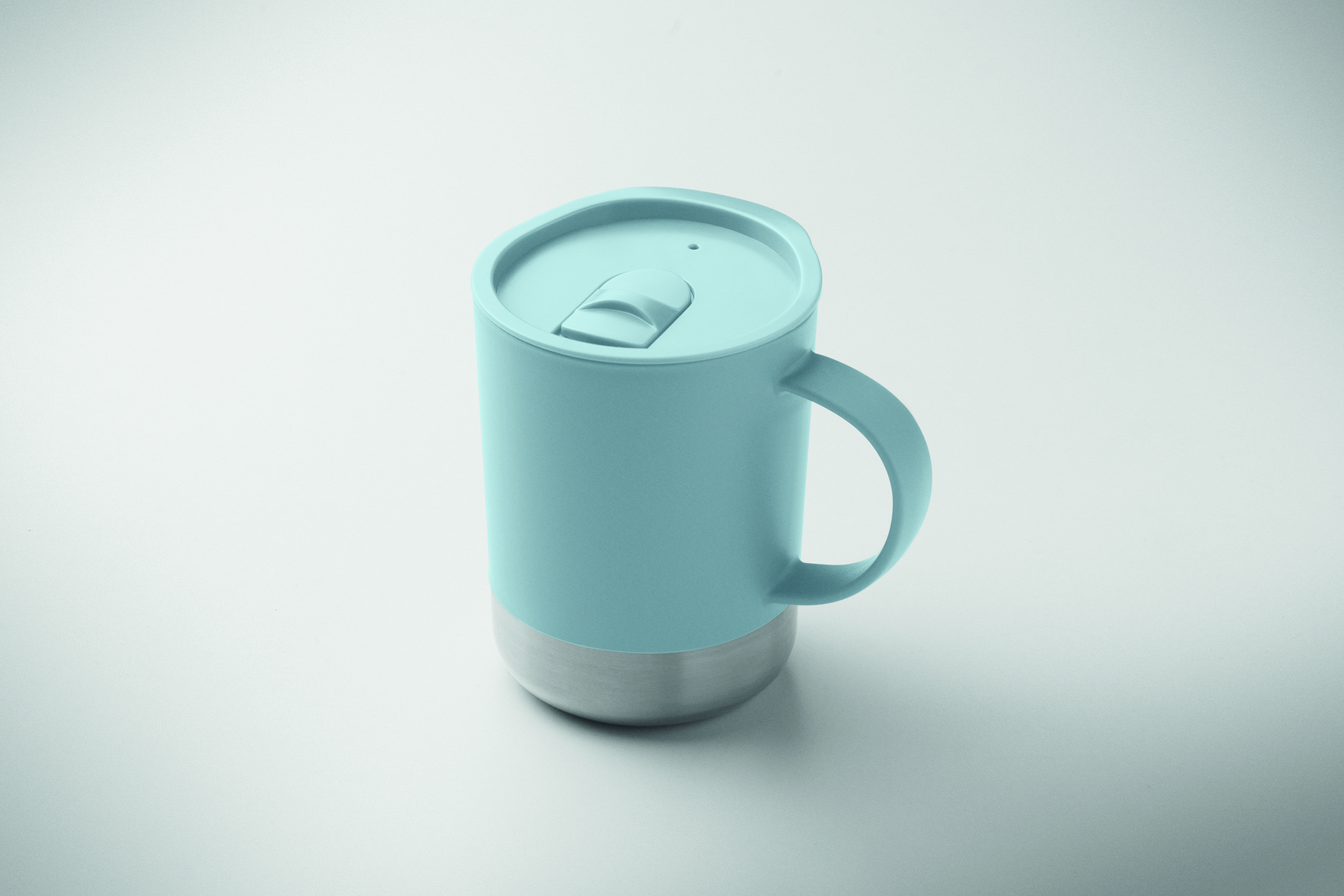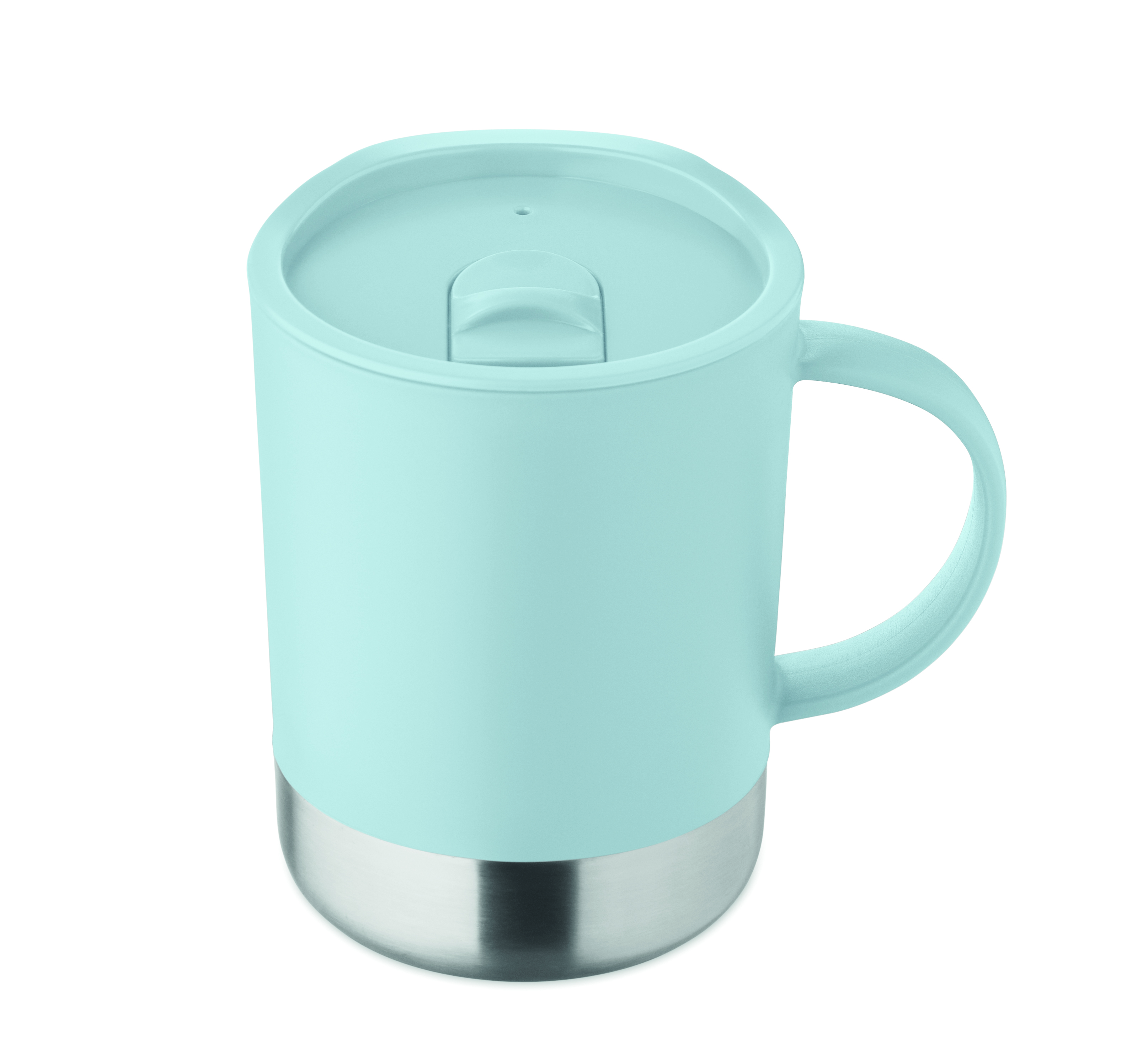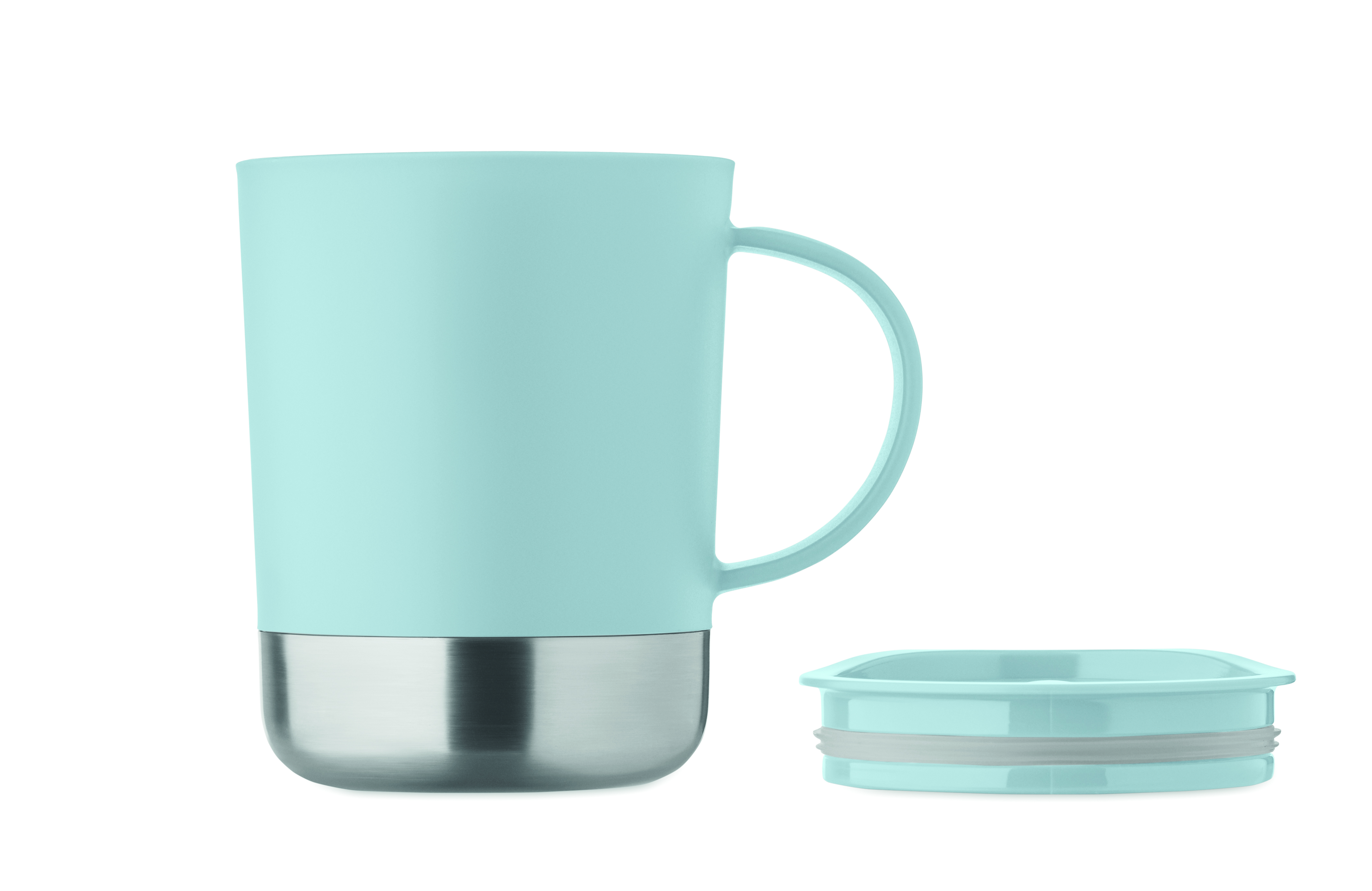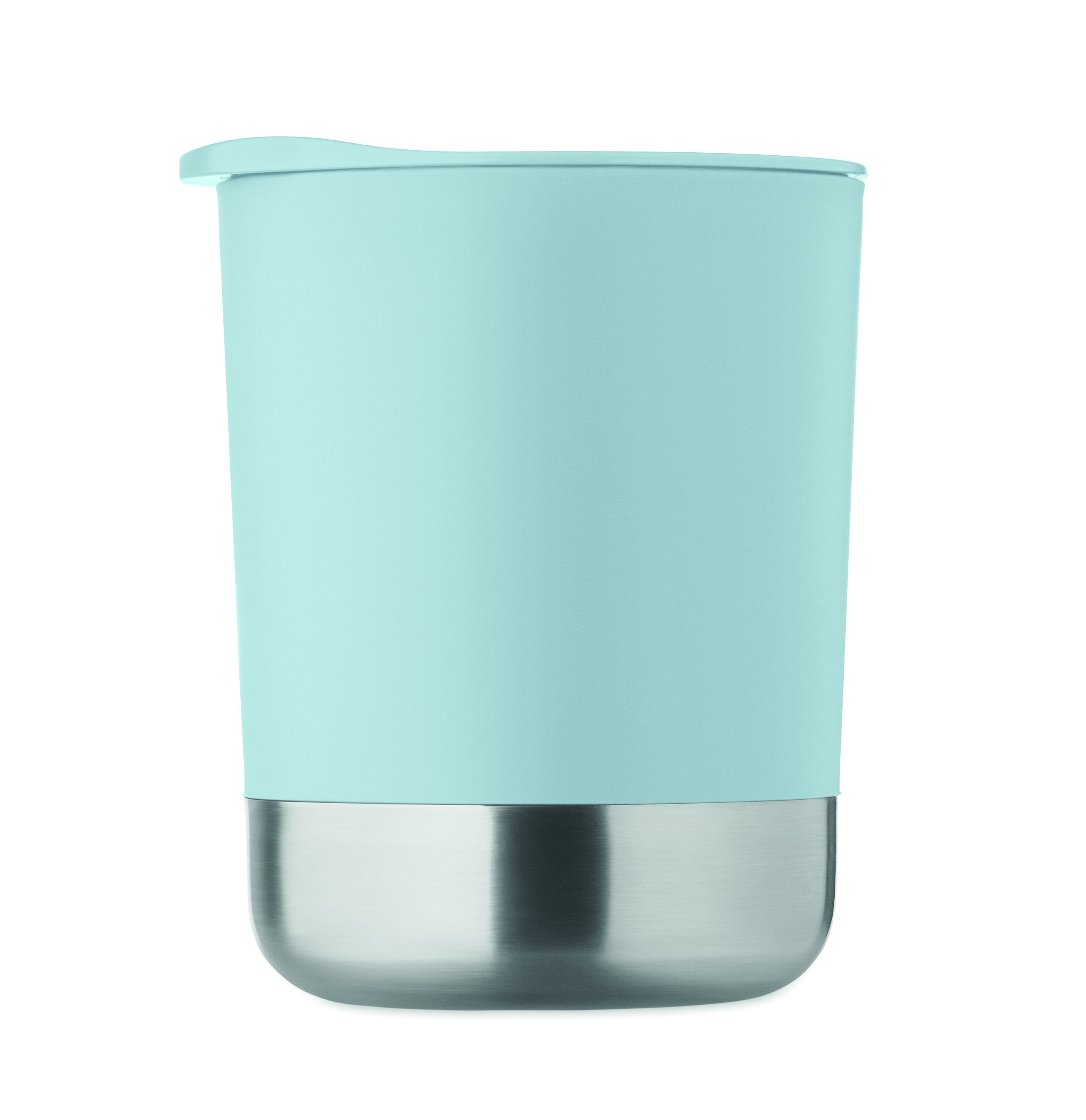 Kubek z PP z podstawą z recyklingowanej stali nierdzewnej (90% stali nierdzewnej z recyklingu i 10% stali nierdzewnej) i przesuwaną pokrywką z PP. Pojemność: 300 ml.