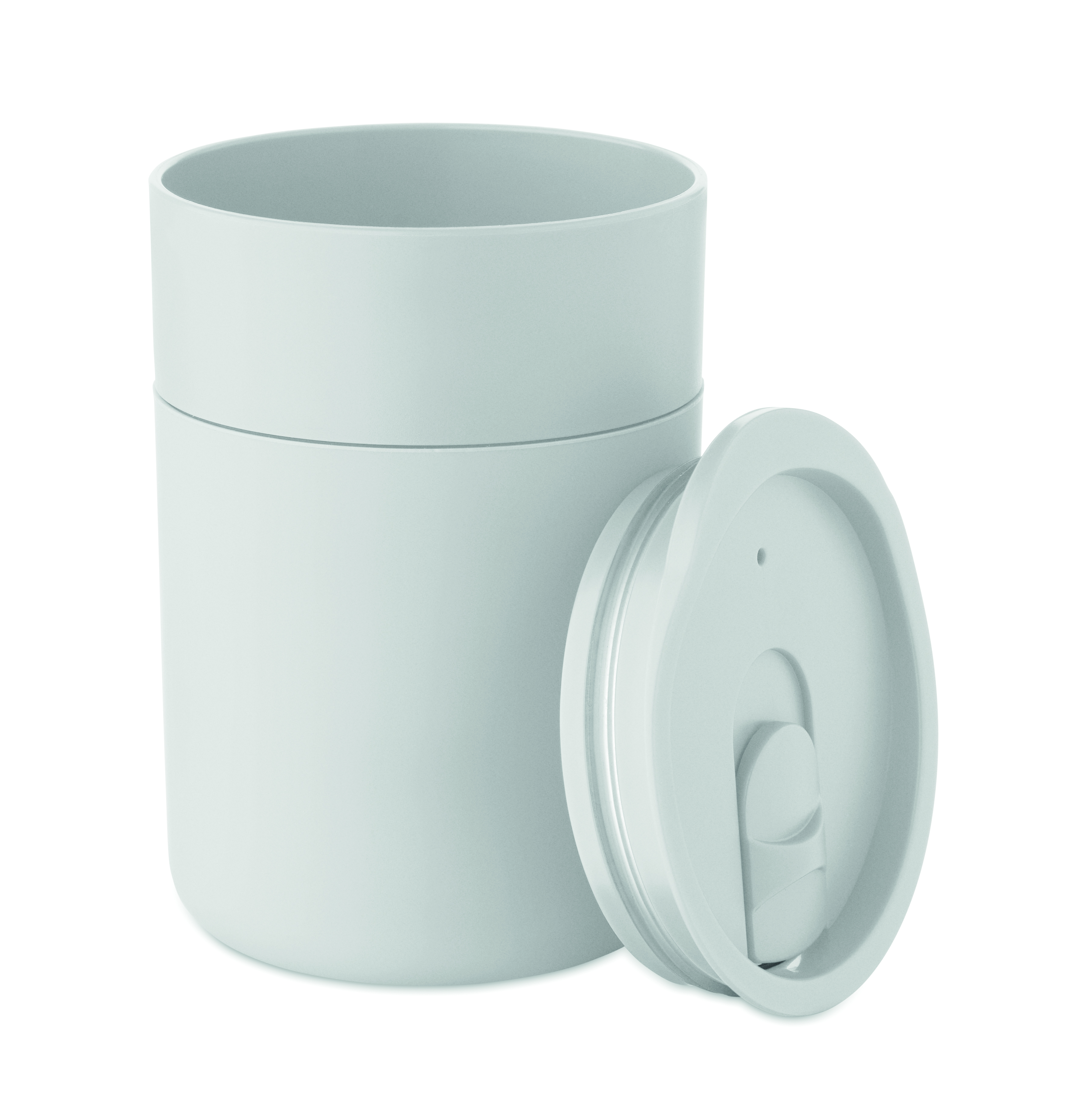 Kubek z PP z silikonową osłoną i przesuwaną pokrywką z PP. Pojemność: 330 ml. Ponieważ jest to kubek jednościenny, nadal może dochodzić do wymiany ciepła.