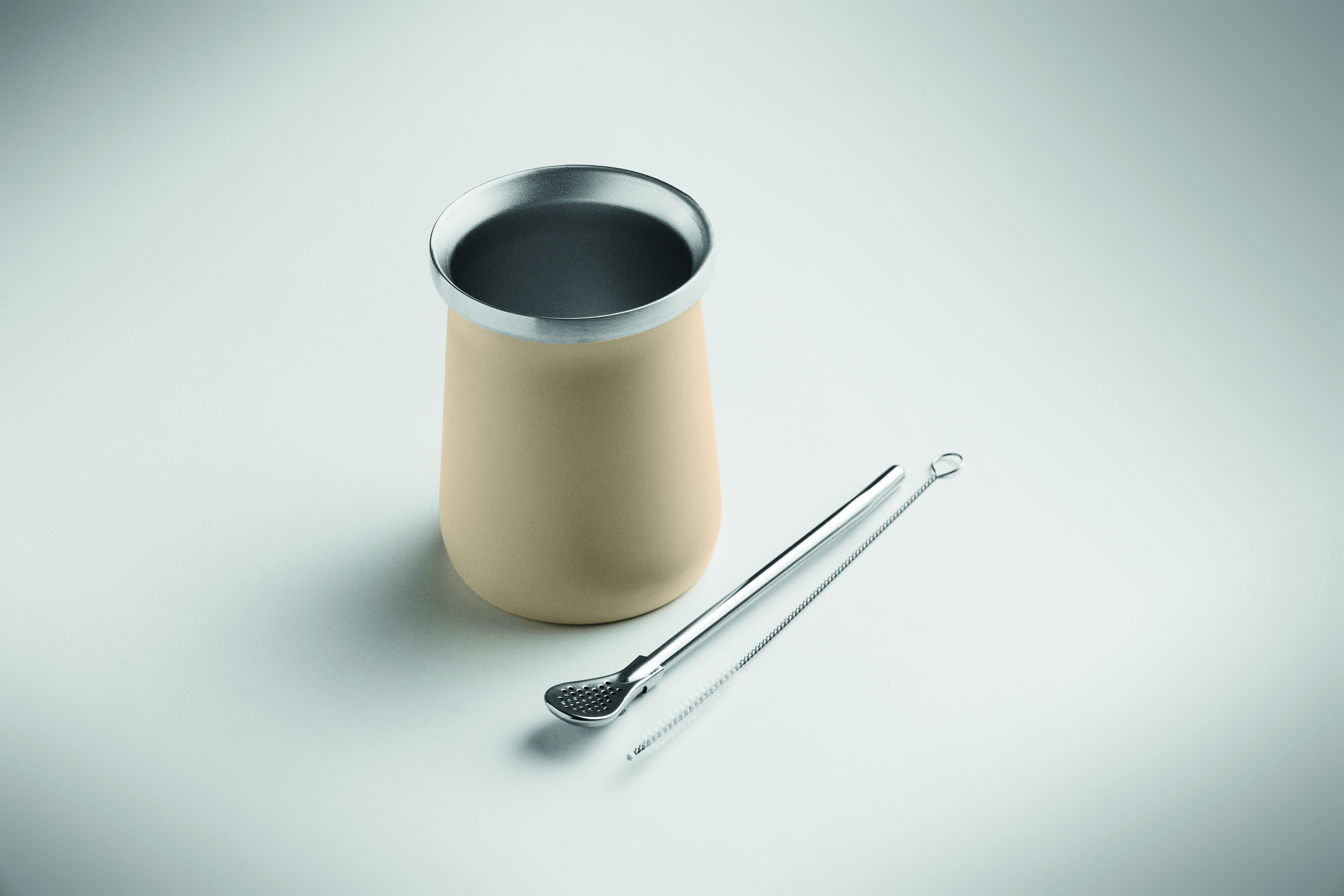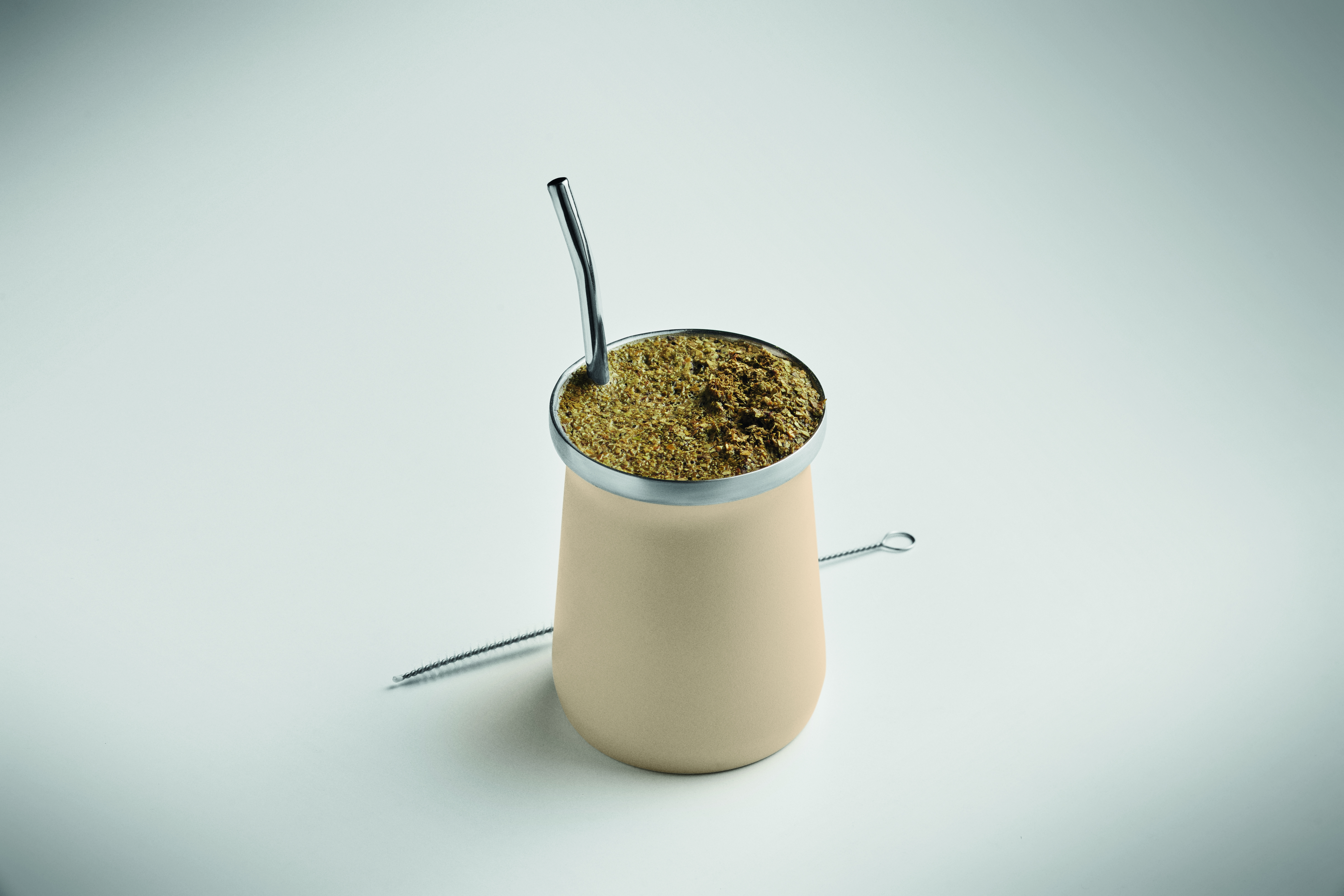 Kubek do yerby 2 ścianki stal nierdzewna z recyklingu (90% stal nierdzewna z recyklingu i 10% stal nierdzewne). Ma słomkę bombilla ze stali nierdzewnej i szczoteczkę do czyszczenia. Pojemność: 240 ml.