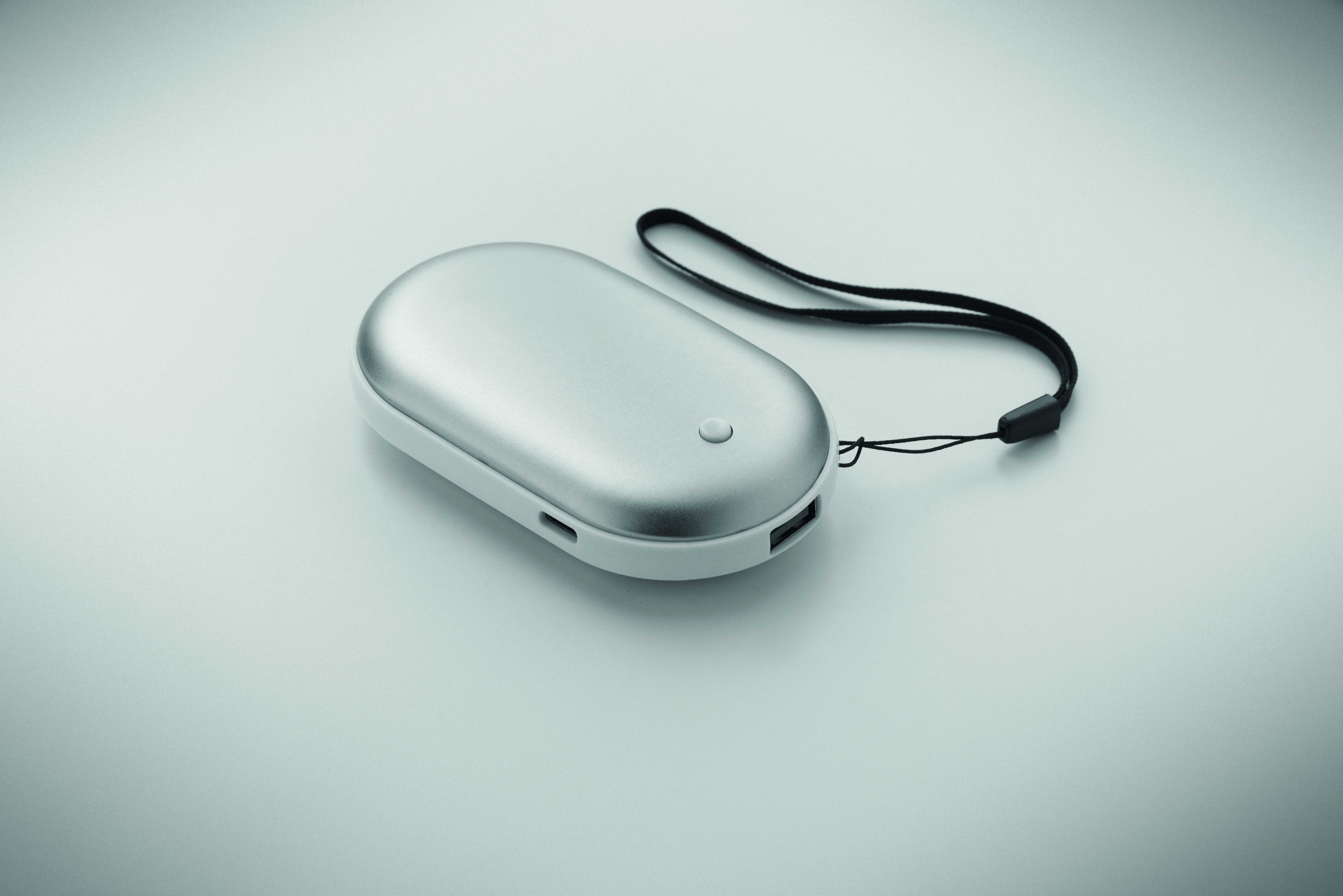 Aluminiowy elektryczny ogrzewacz do rąk z 3 poziomami grzania (45°C, 50°C, 55°C) i powerbankiem 5000 mAh. Dwustronne ogrzewanie, wejście/wyjście typu C, wyjście USB-A i DC5V/2A oraz kabel w zestawie.