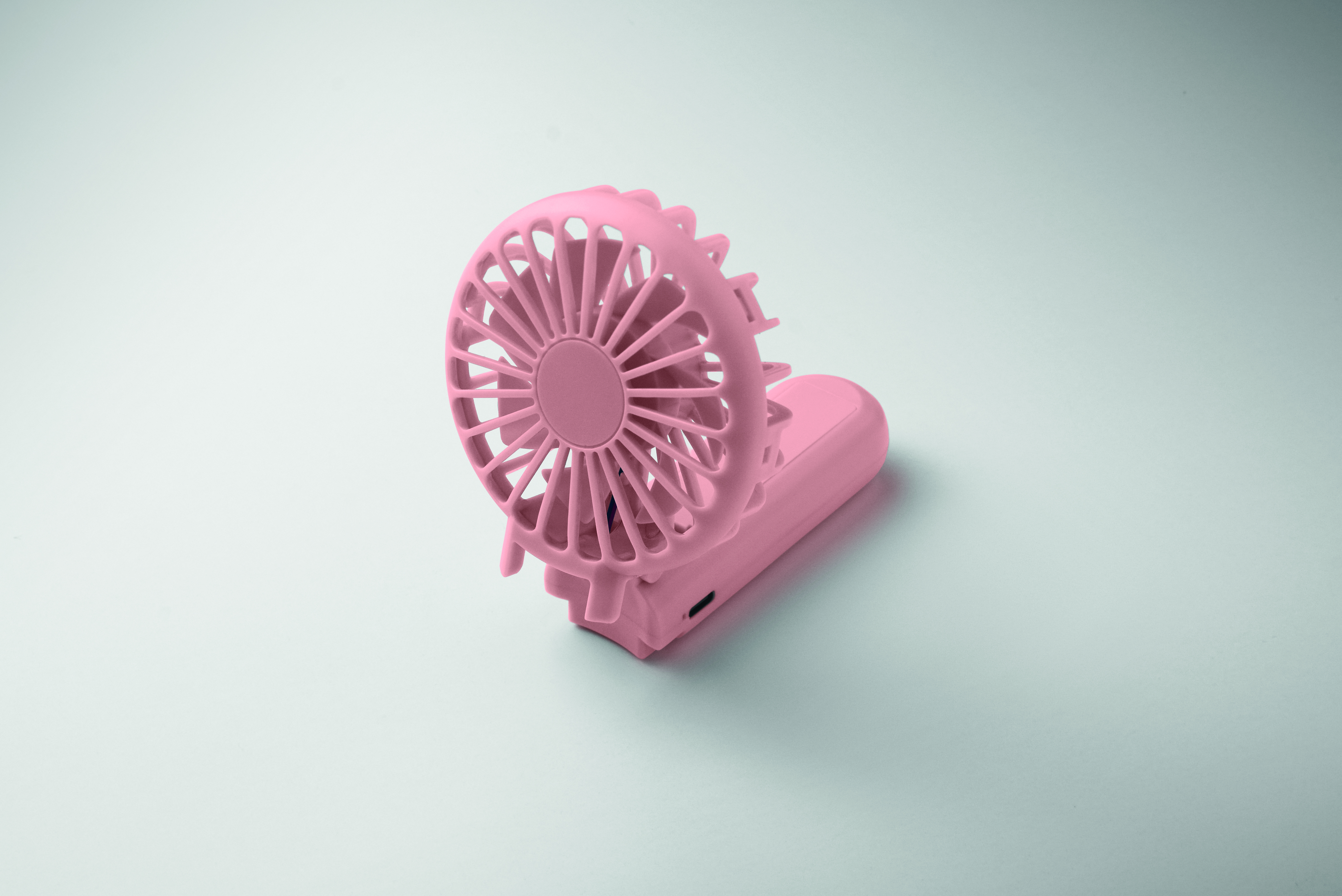 Przenośny, składany wentylator z ABS z 3 ustawieniami prędkości. Może być używany jako wentylator ręczny lub biurkowy. Zawiera 1 wymienną baterię litową 14500 o pojemności 500 mAh.