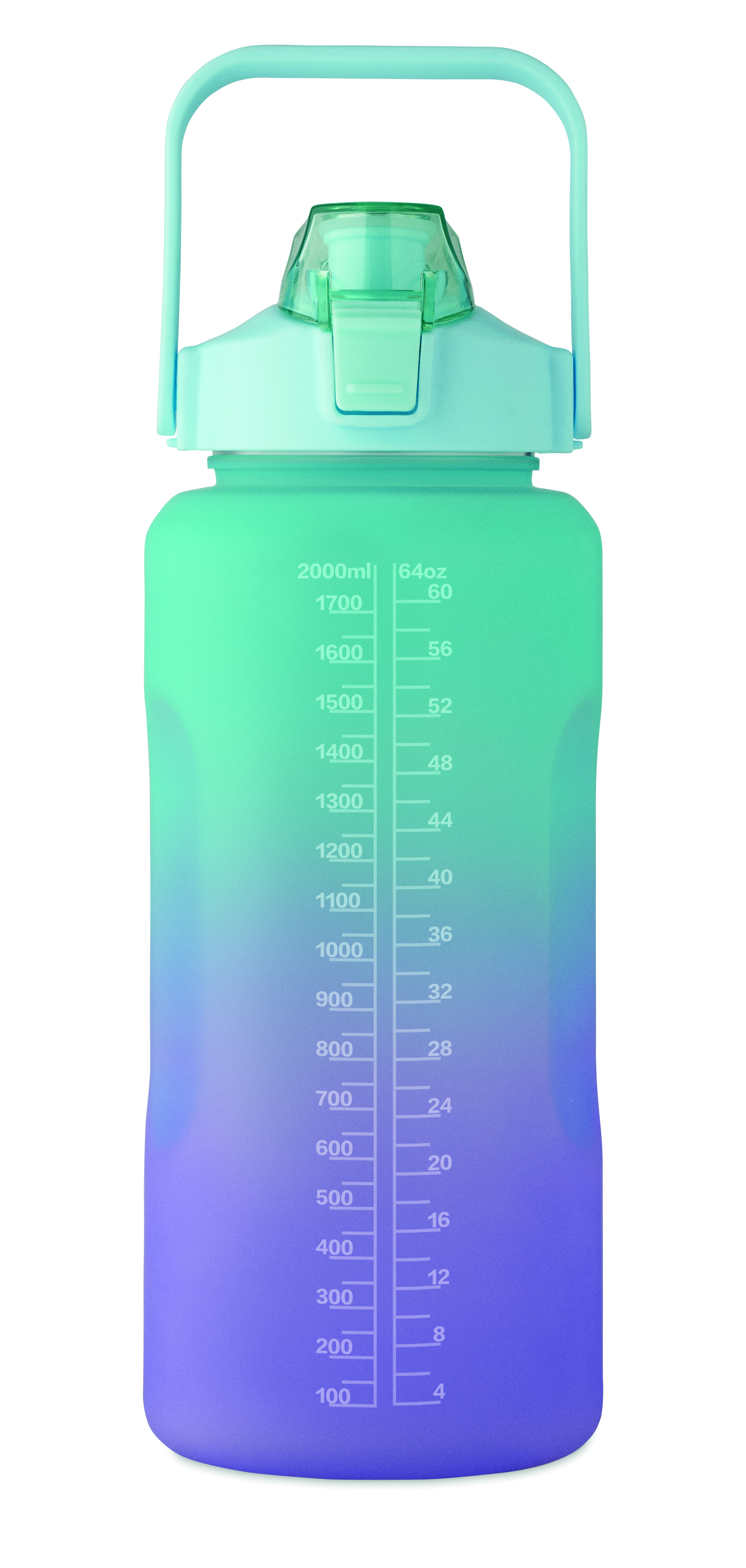Motywacyjna butelka na wodę z RPET. Posiada otwieraną jedną ręką klapkę ze słomką, blokadę bezpieczeństwa i uchwyt. Nie przecieka. Pojemność: 2000 ml