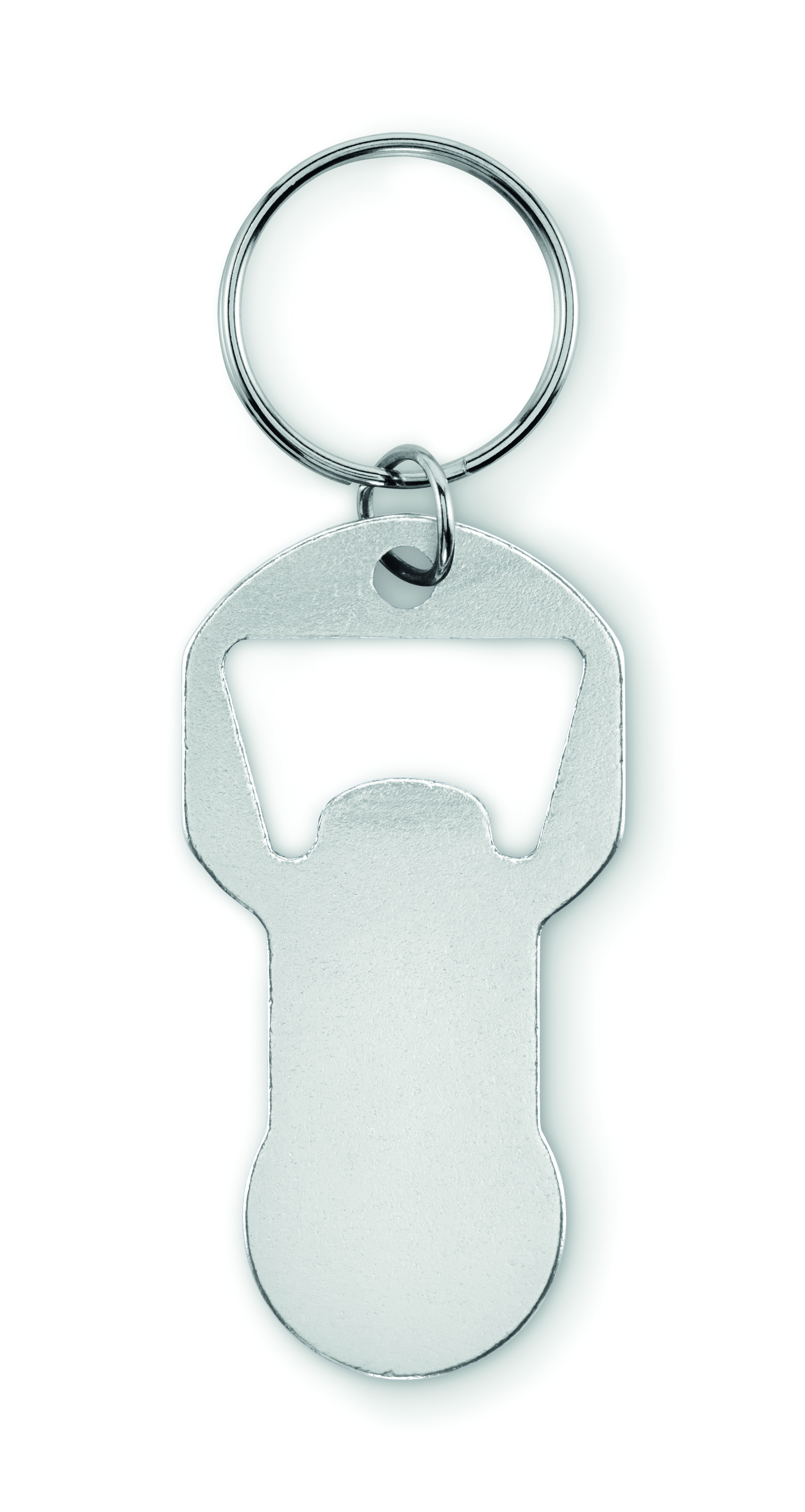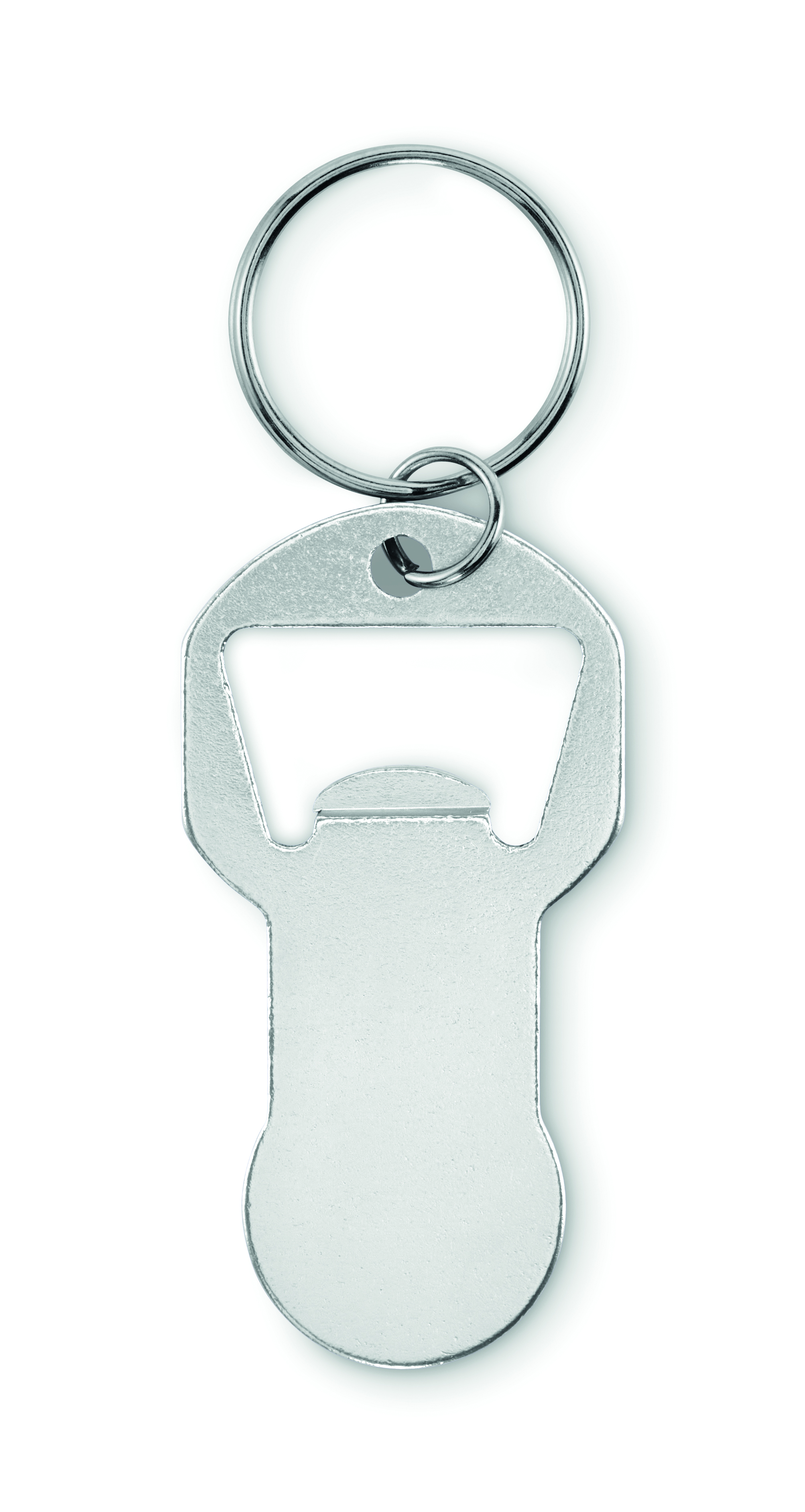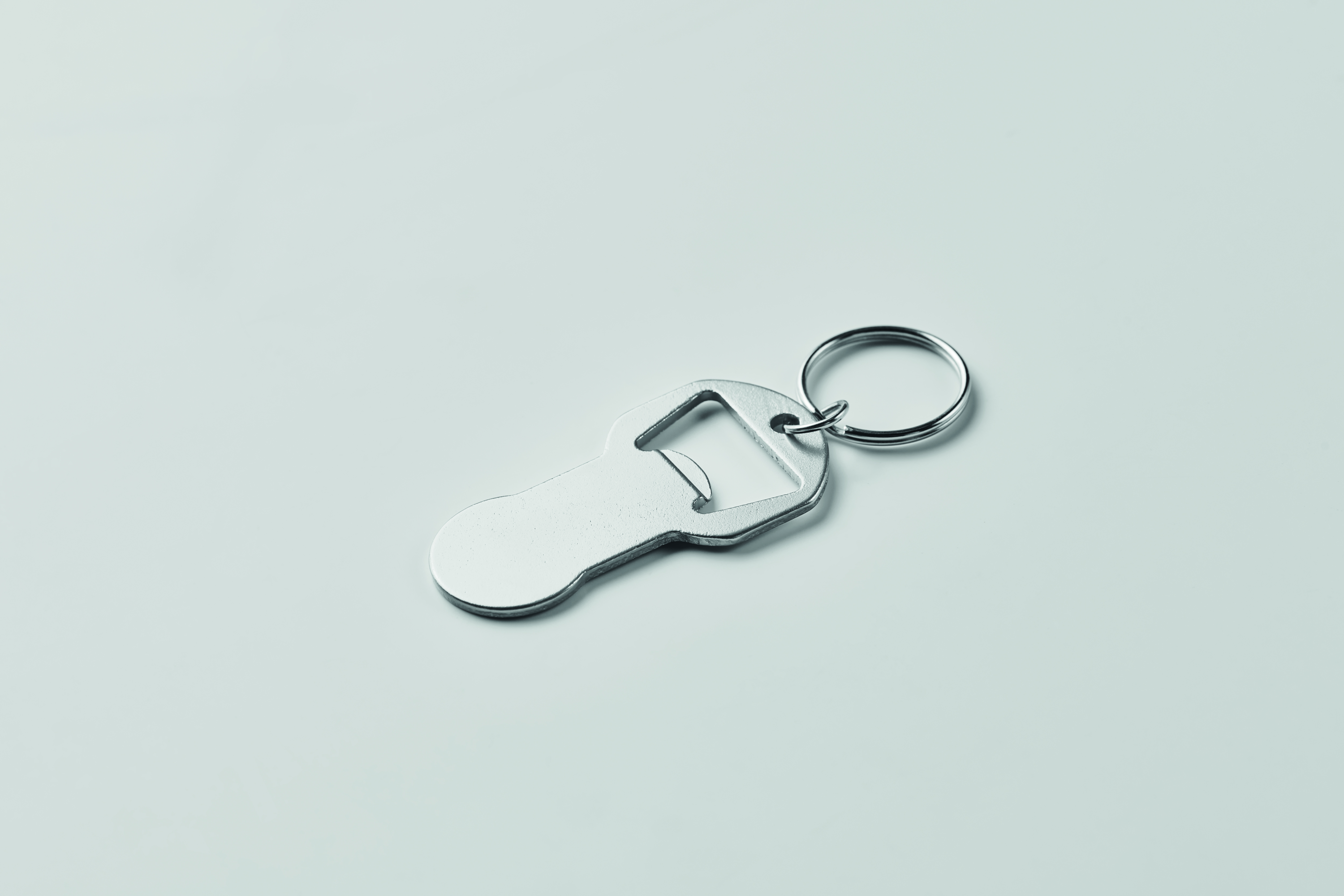 Brelok z otwieraczem do butelek wykonany z aluminium pochodzącego z recyklingu z żelaznym pierścieniem.