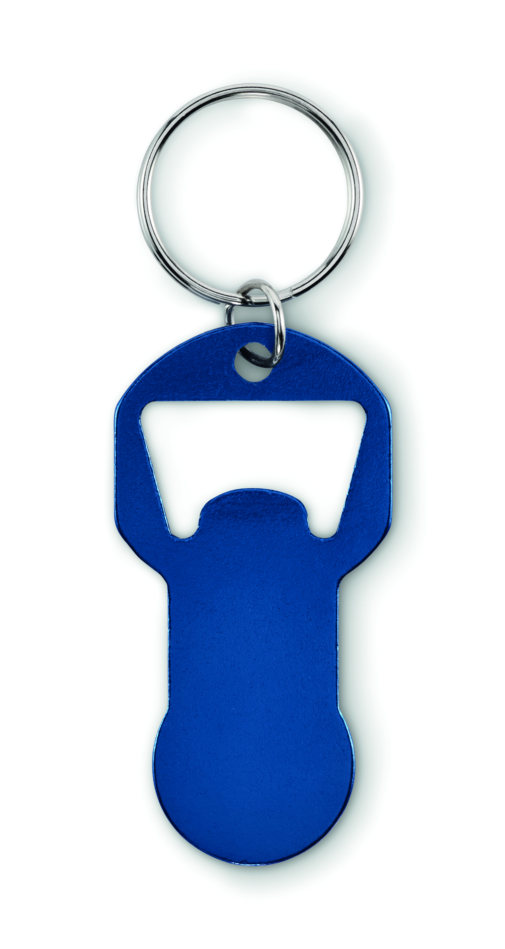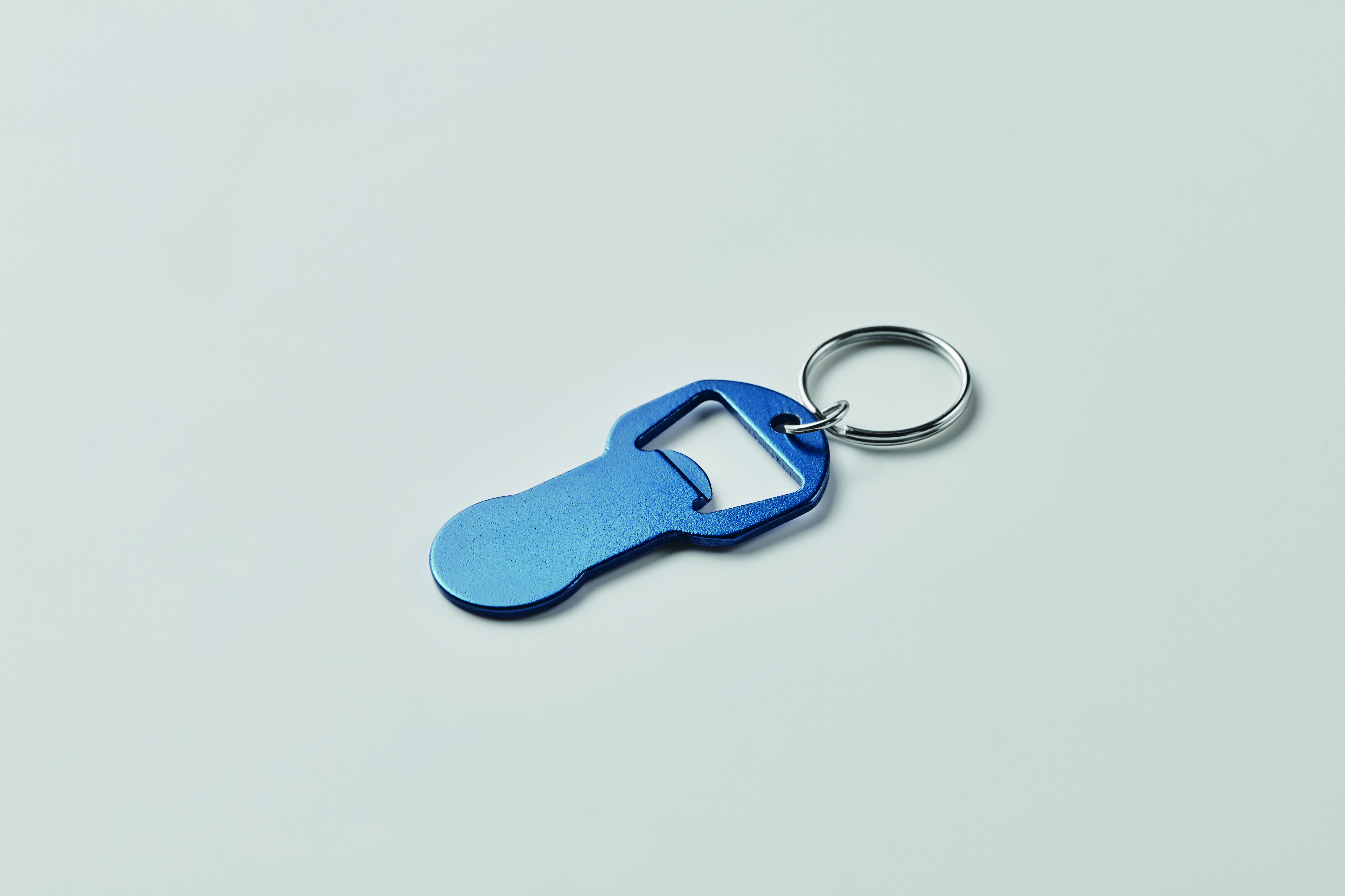 Brelok z otwieraczem do butelek wykonany z aluminium pochodzącego z recyklingu z żelaznym pierścieniem.