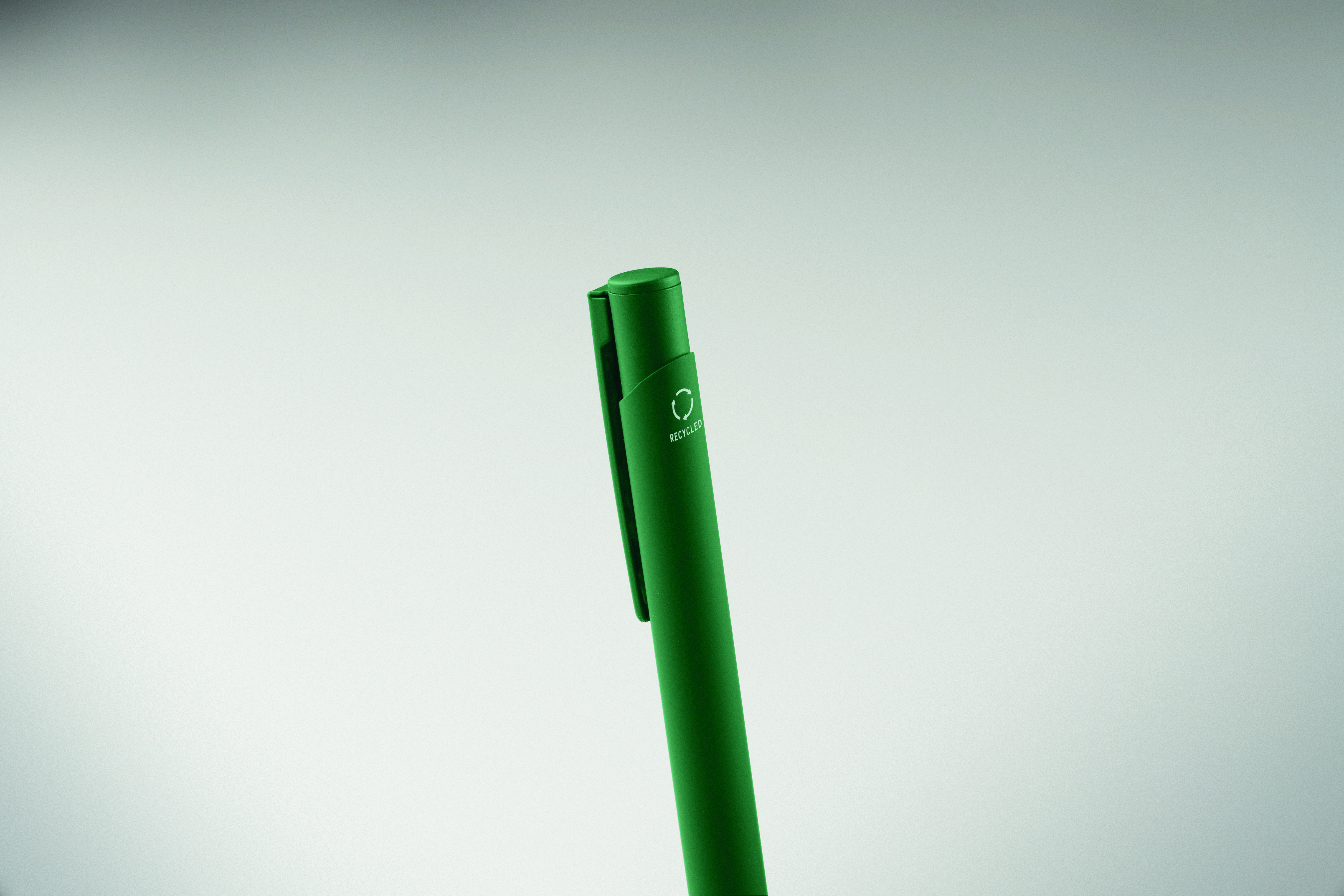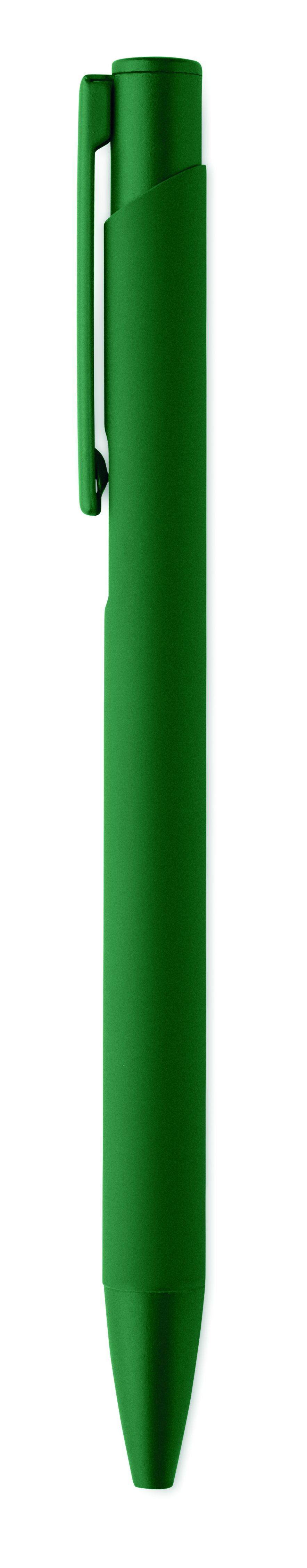 Długopis wciskany wykonany z aluminium pochodzącego z recyklingu, z żelaznym klipsem i kolorowym gumowanym korpusem. Niebieski tusz.