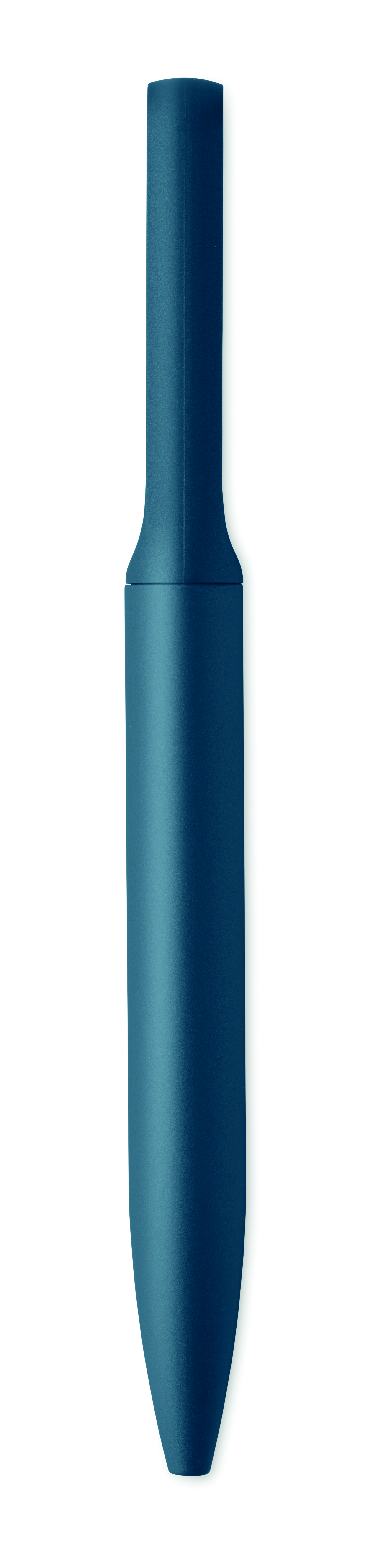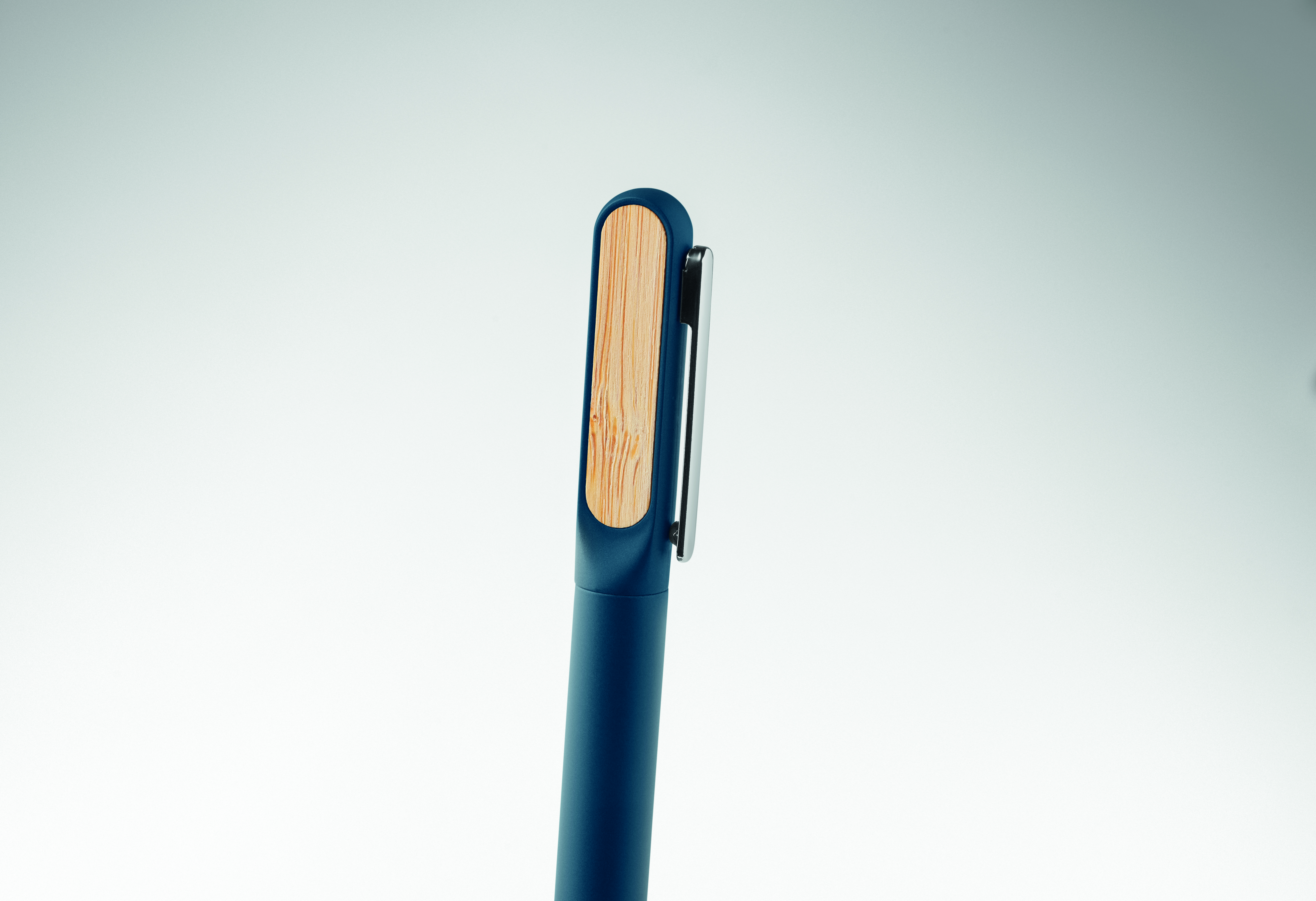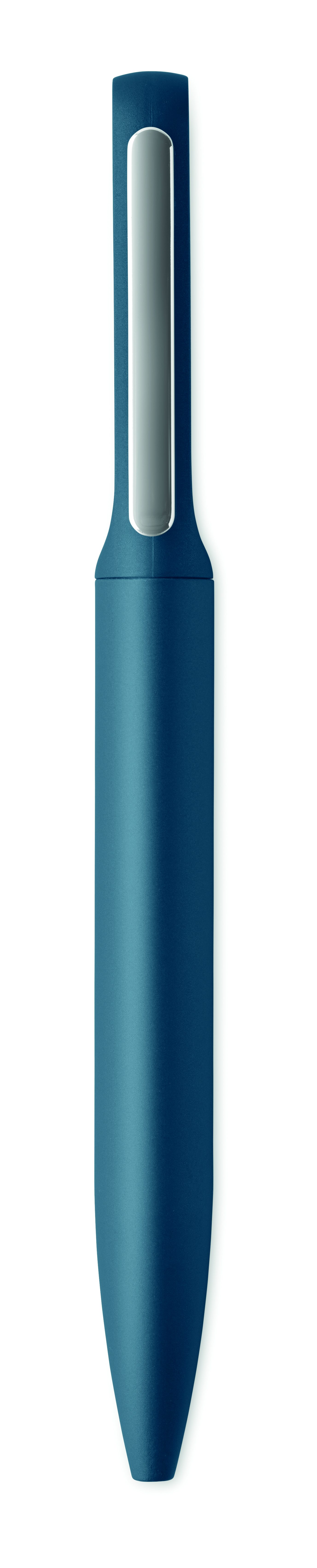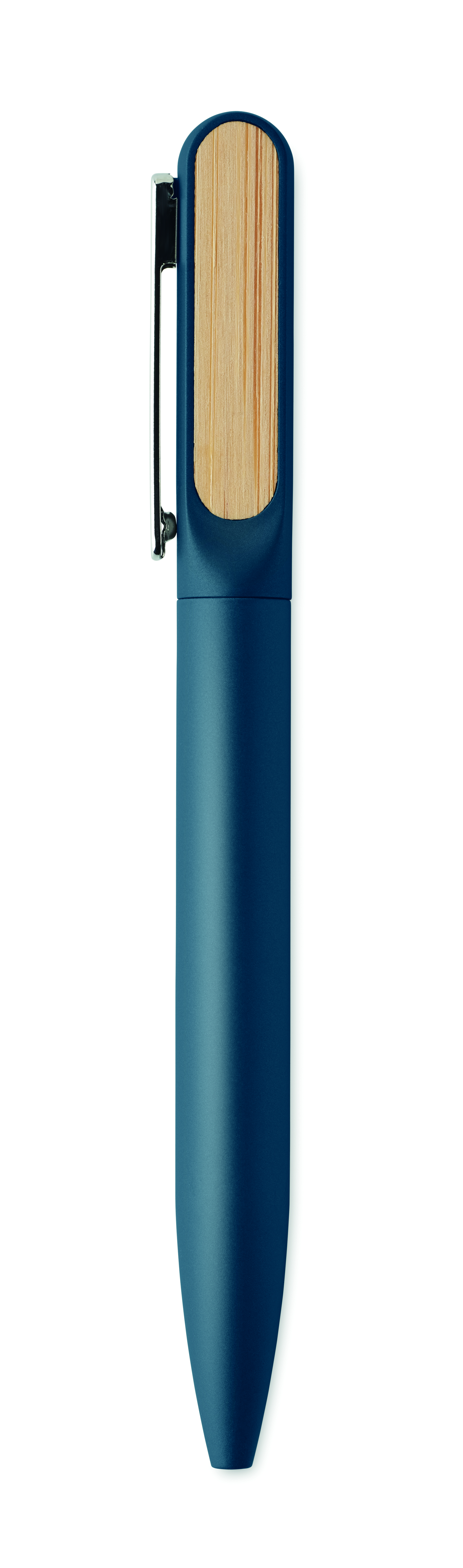 Obrotowy długopis z aluminiowym korpusem z recyklingu, częścią obrotową z recyklingowanego ABS i metalowym klipsem z bambusowym detalem. Niebieski tusz.