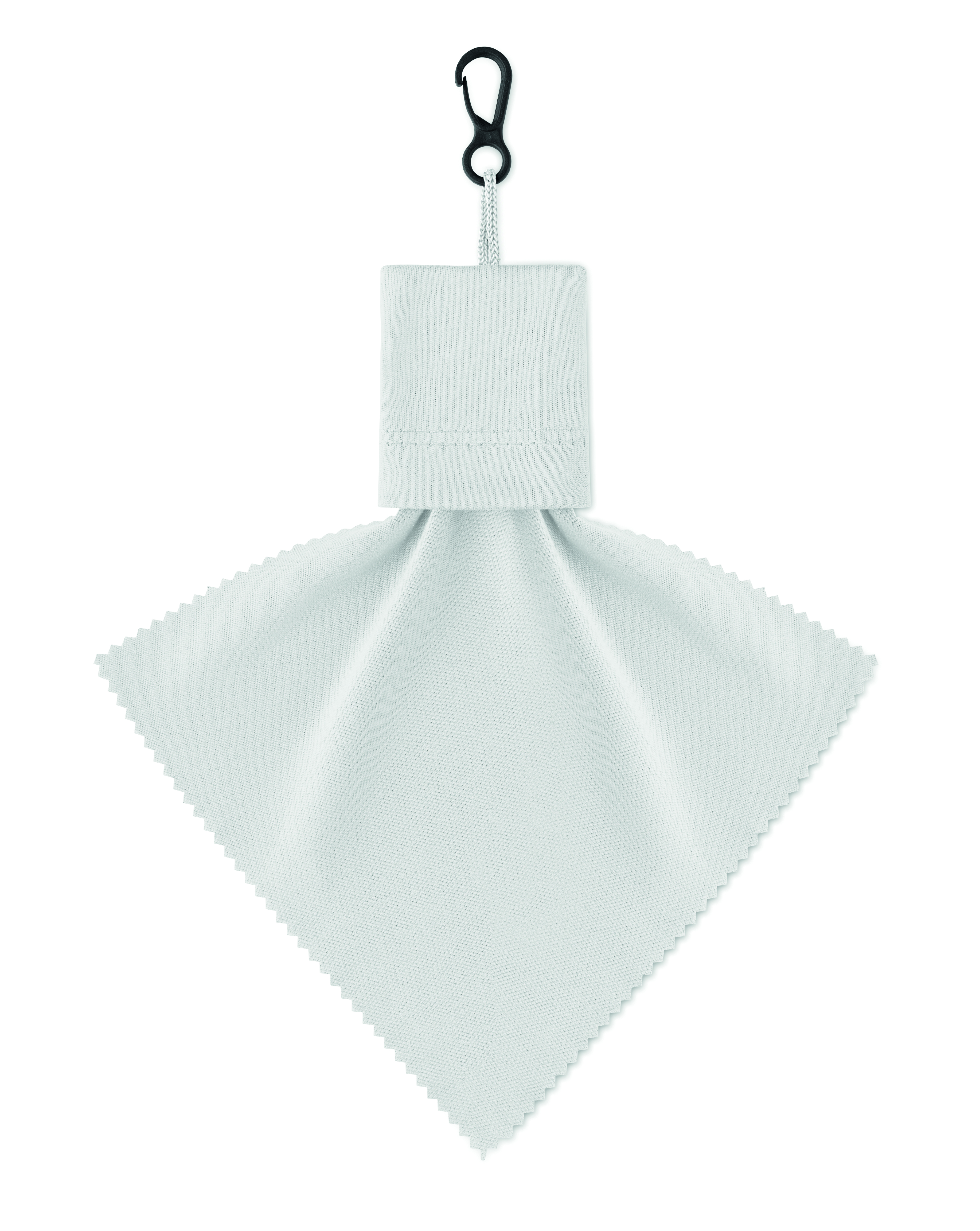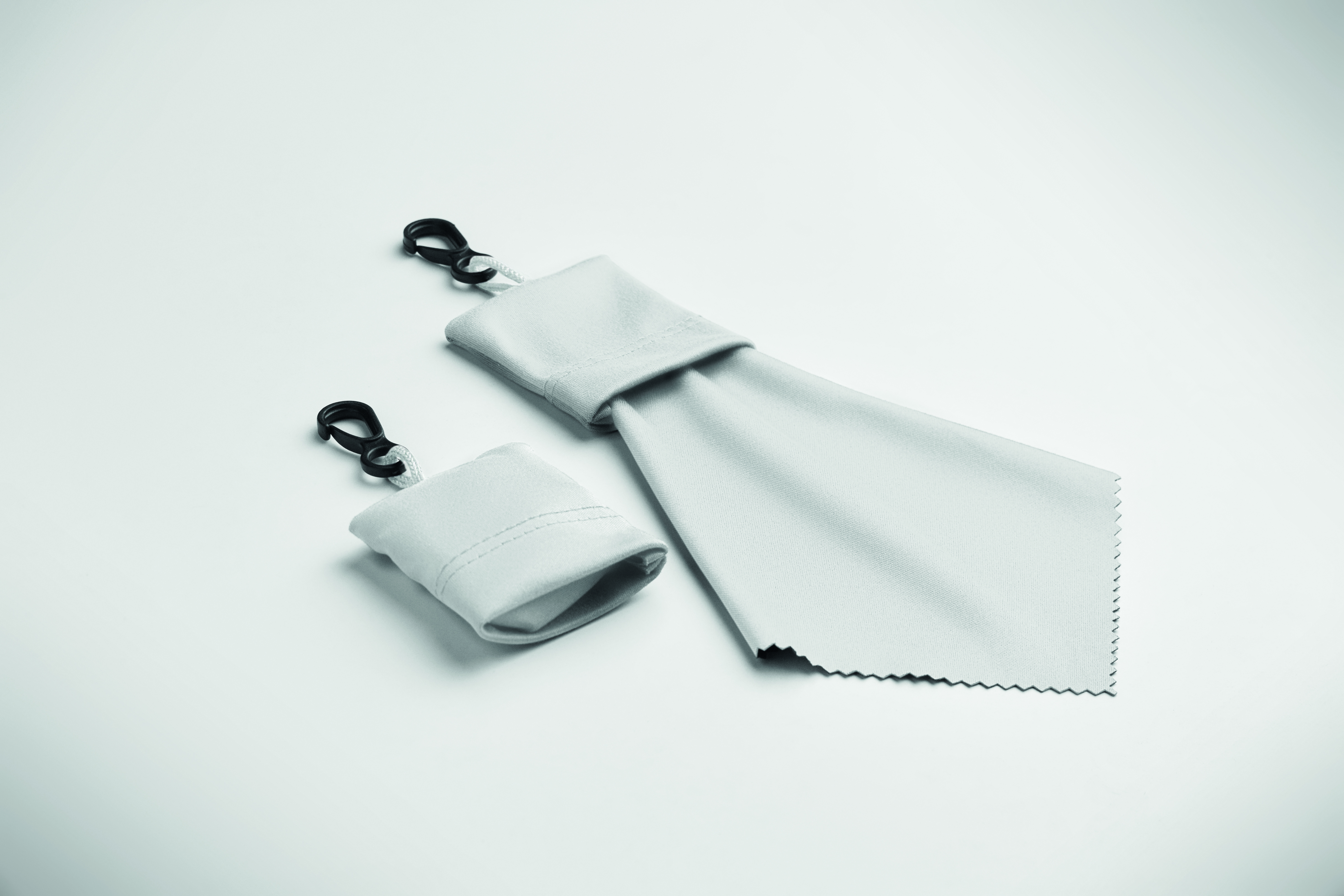 Ściereczka czyszcząca RPET z materiałowym woreczkiem z plastikowym haczykiem do zawieszania PP.
