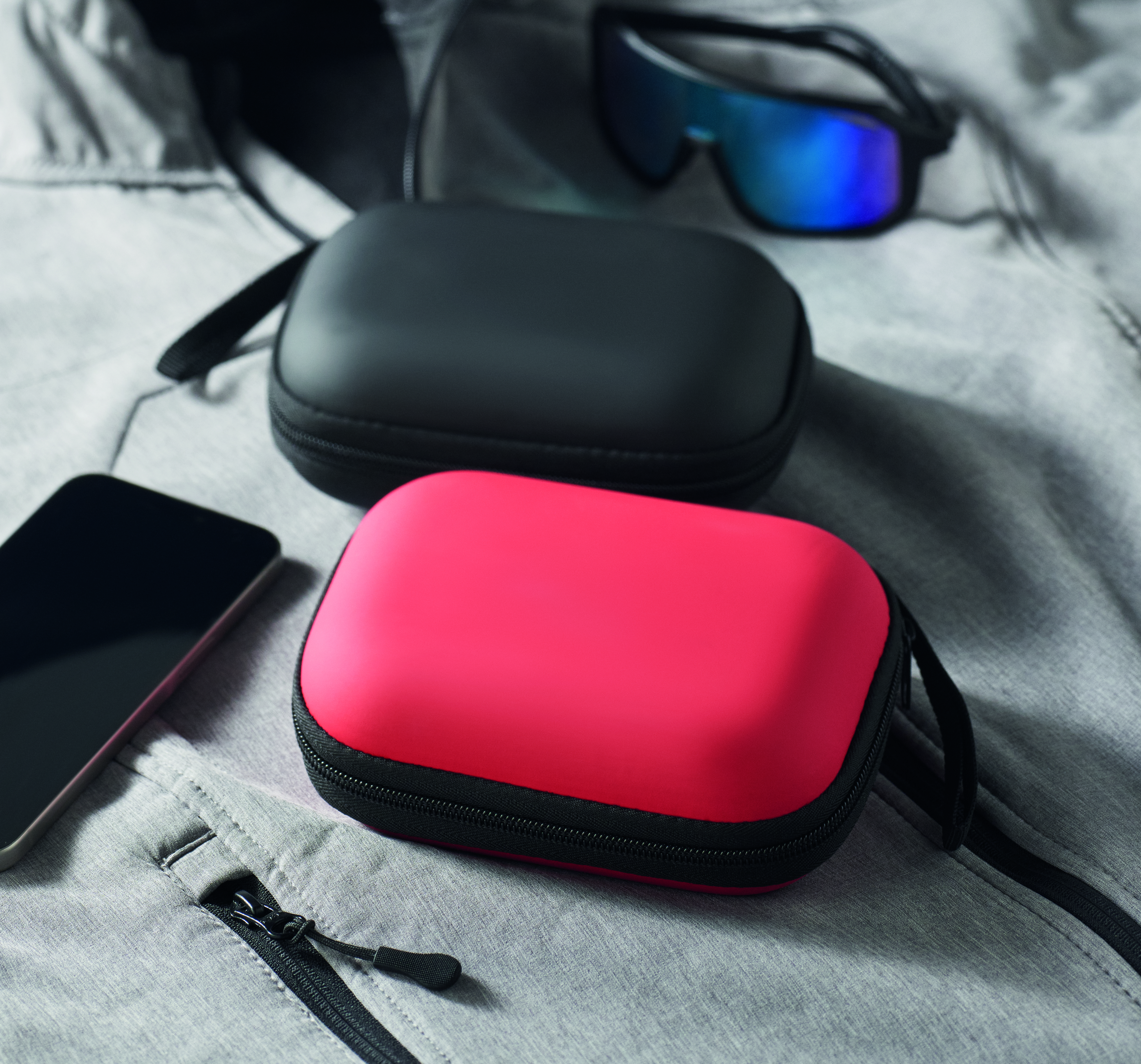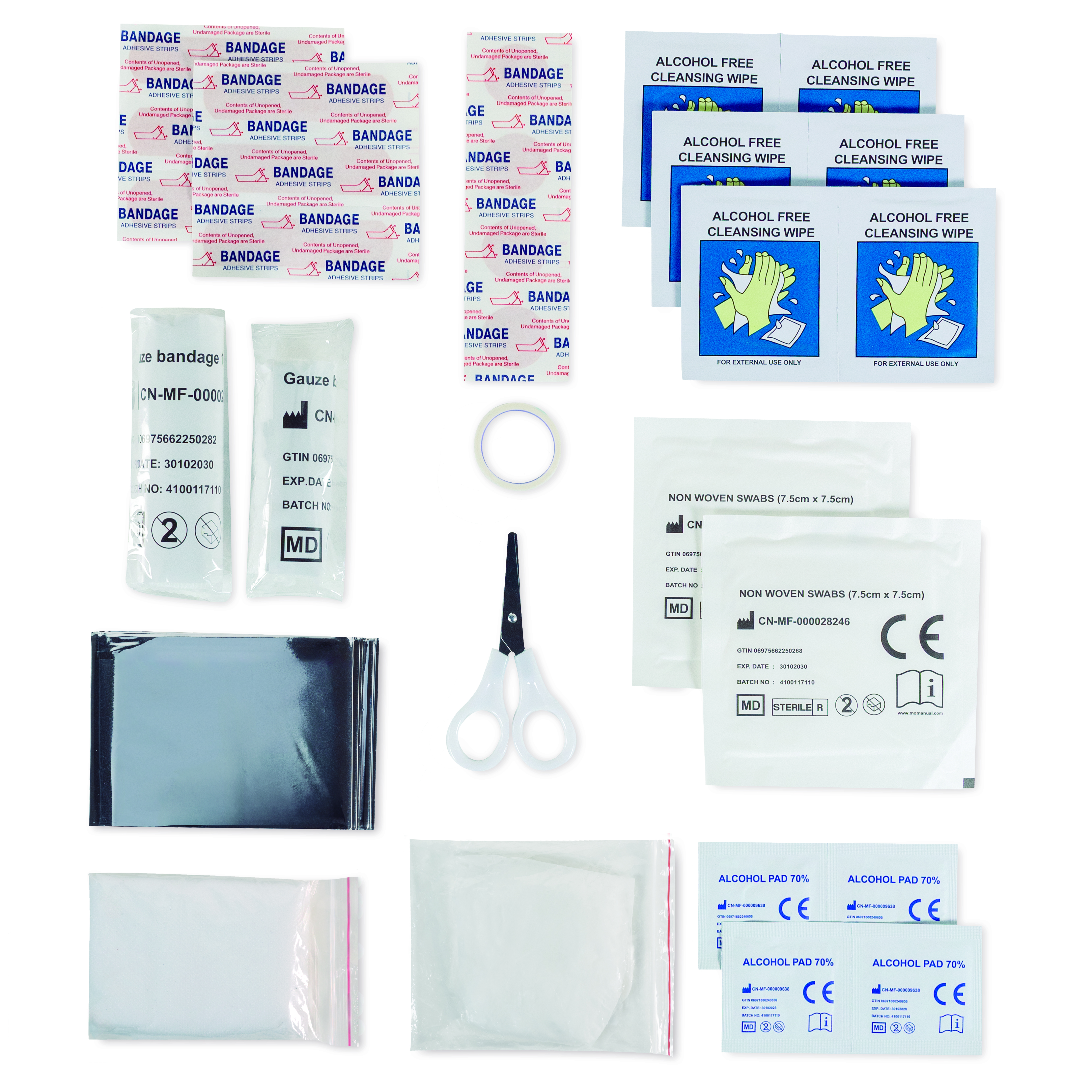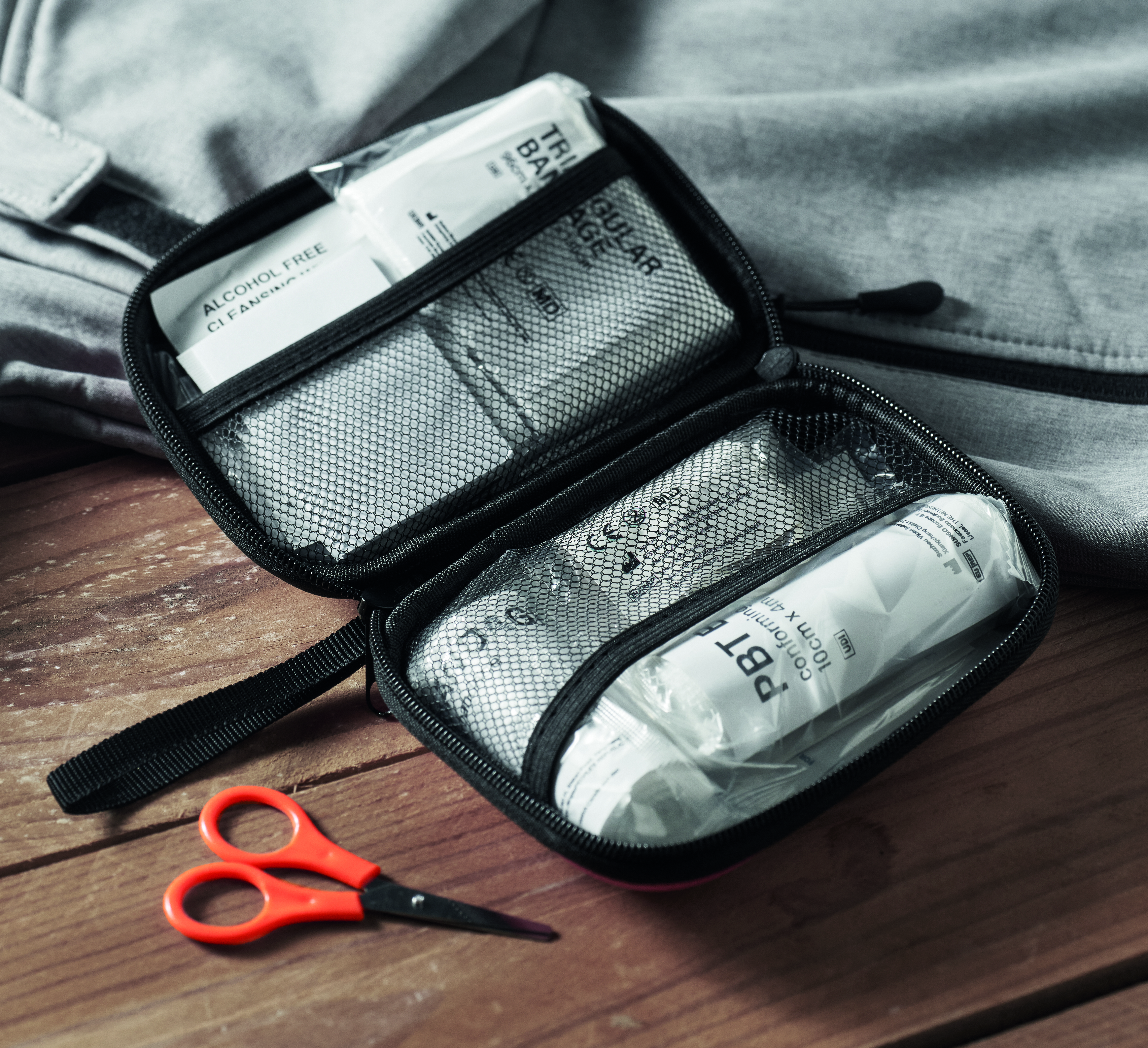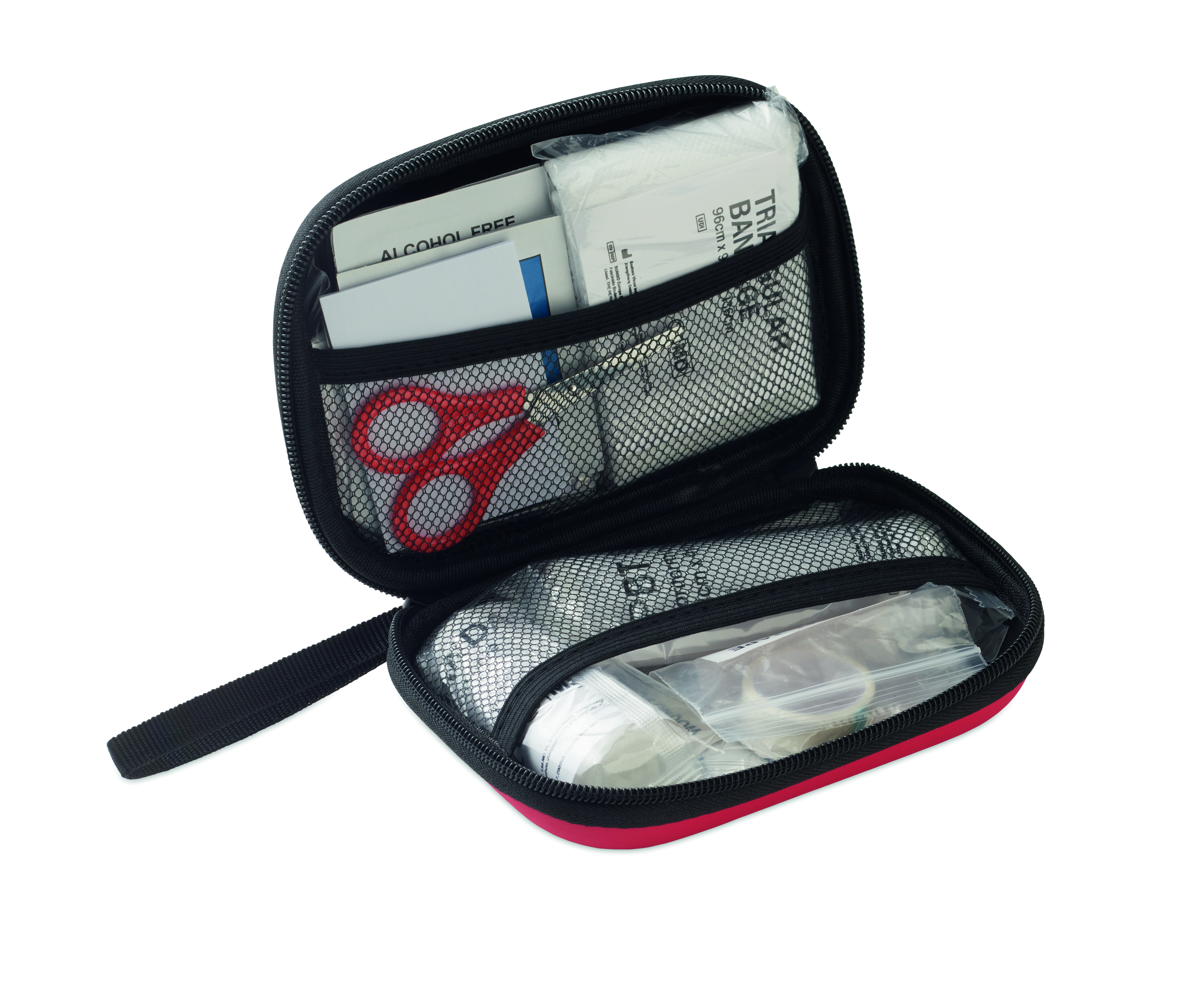 Apteczka pierwszej pomocy w twardym etui z PU. Zawiera 2 rękawiczki, 1 koc, 1 taśmę, 2 bandaże, 1 nożyczki, 4 waciki, 10 plastrów i 6 chusteczek czyszczących. Niedostępna w sprzedaży poza UE.