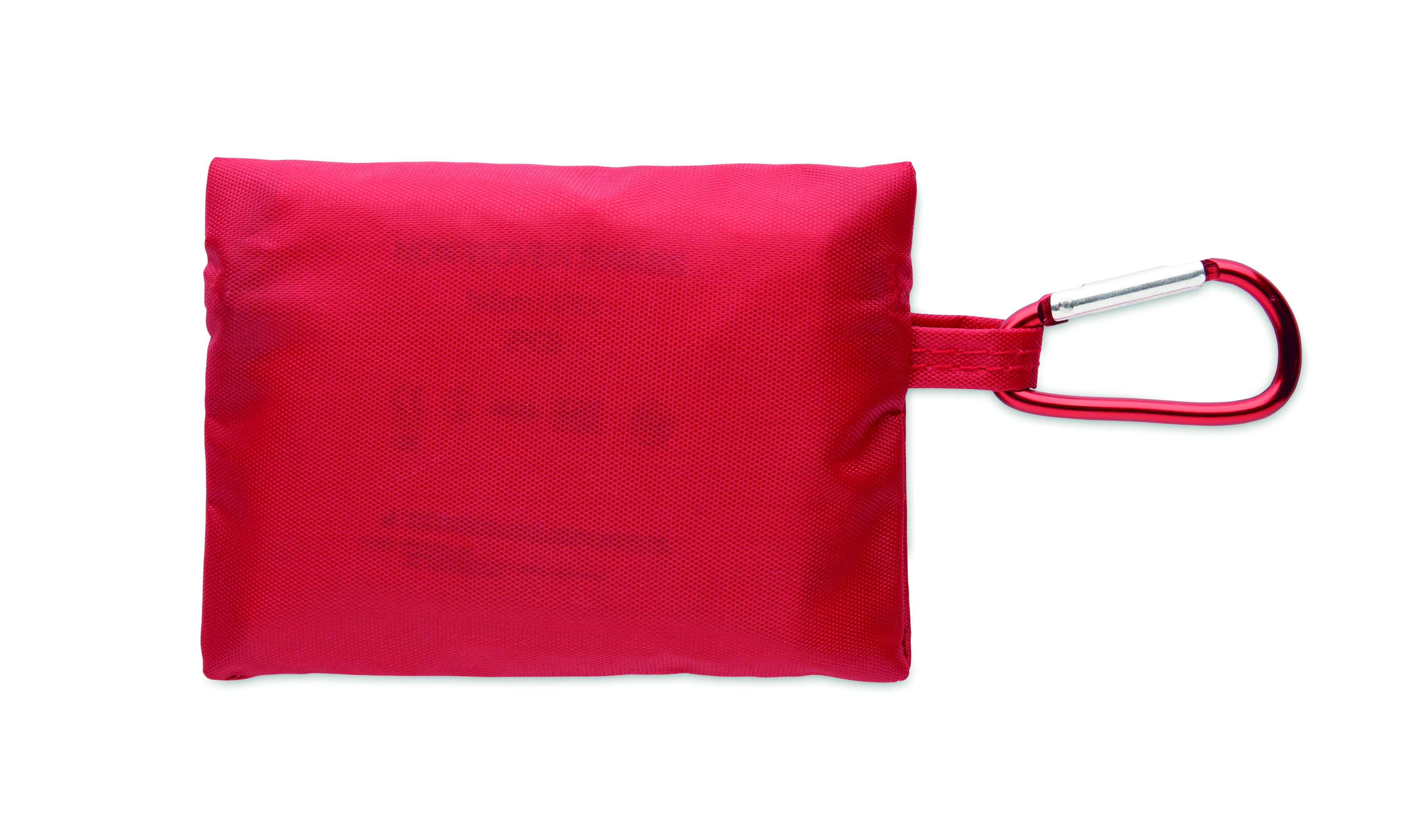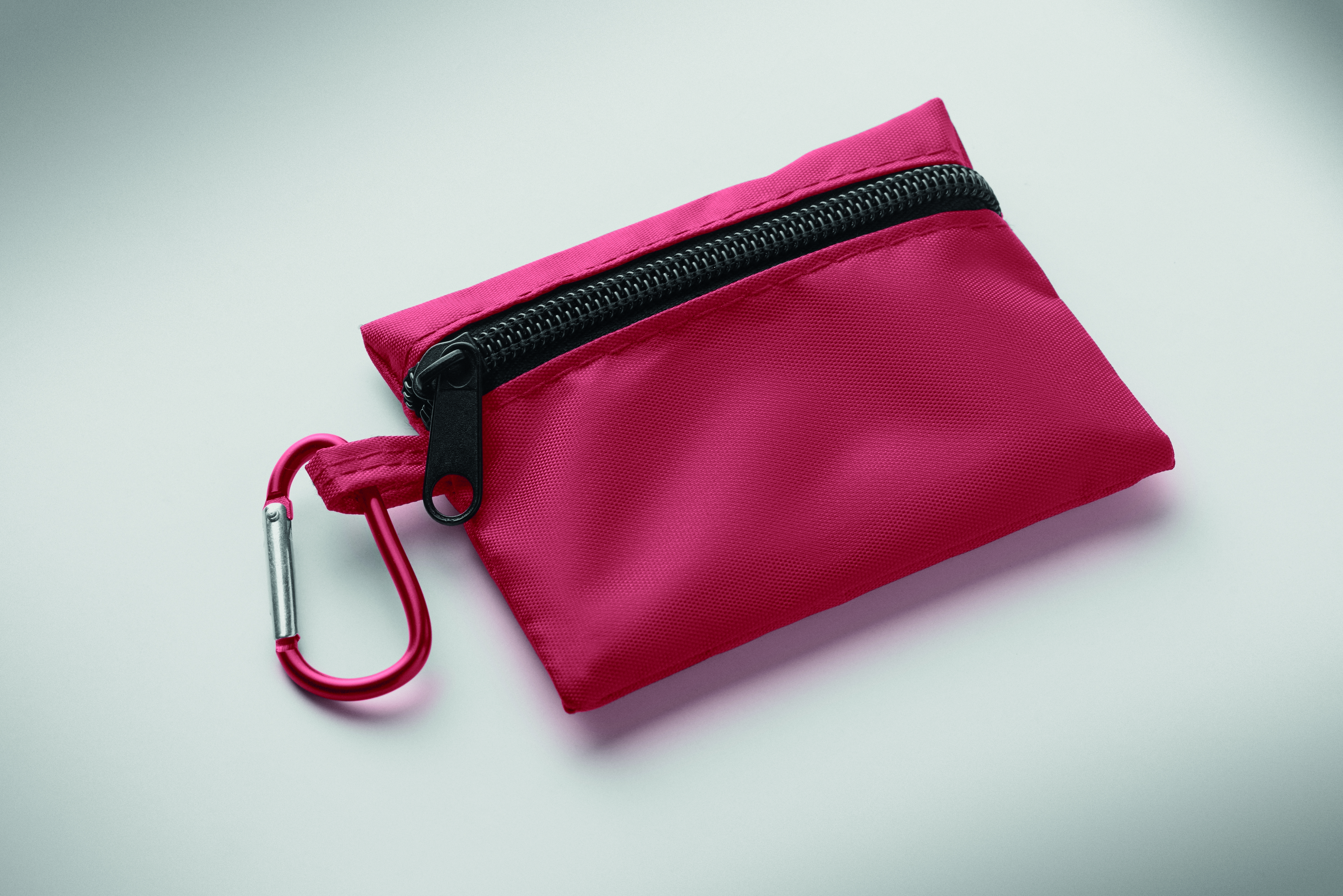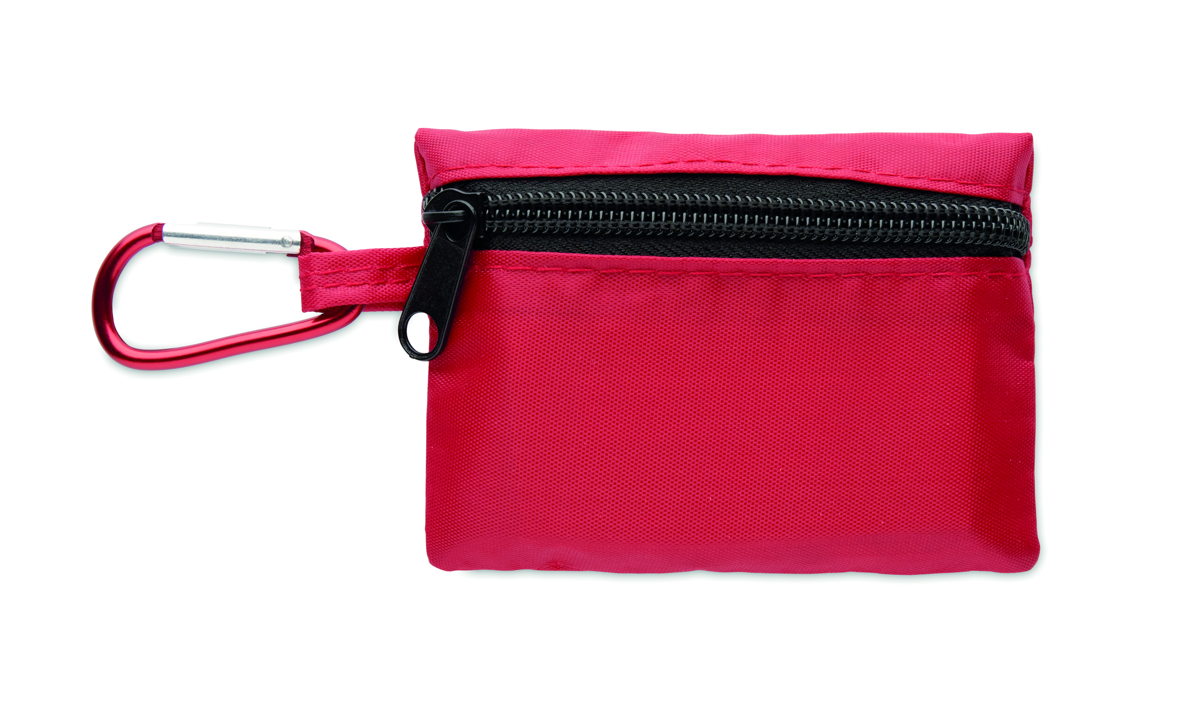 Kompaktowa apteczka pierwszej pomocy w etui z RPET z aluminiowym karabińczykiem. Zawiera 4 waciki nasączone alkoholem, 3 plastry, 2 bandaże, 2 gaziki, 1 taśmę i 1 nożyczki. Niedostępna w sprzedaży poza UE.