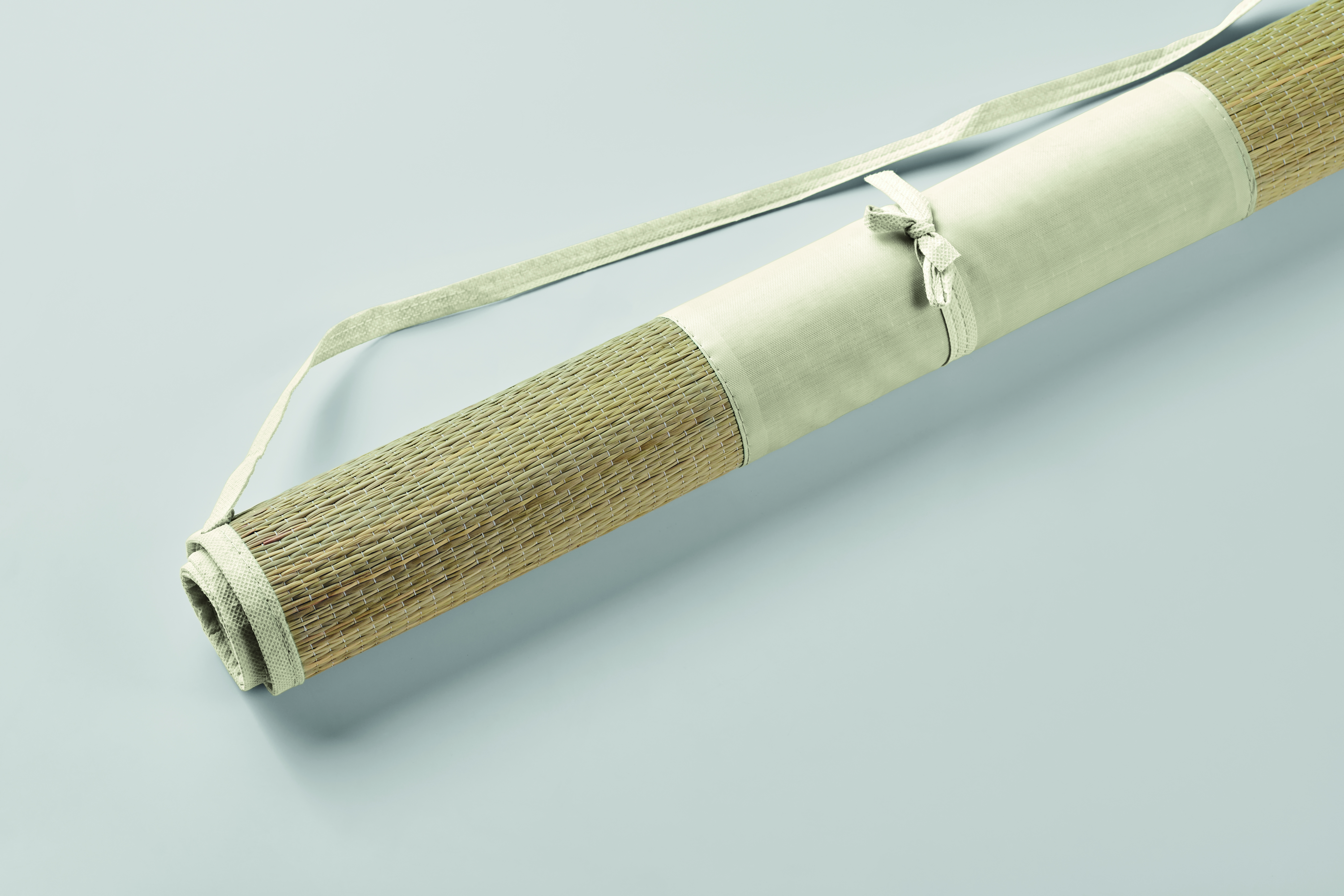 Zwijana mata plażowa z naturalnej słomy z poliestrowym paskiem do przenoszenia.