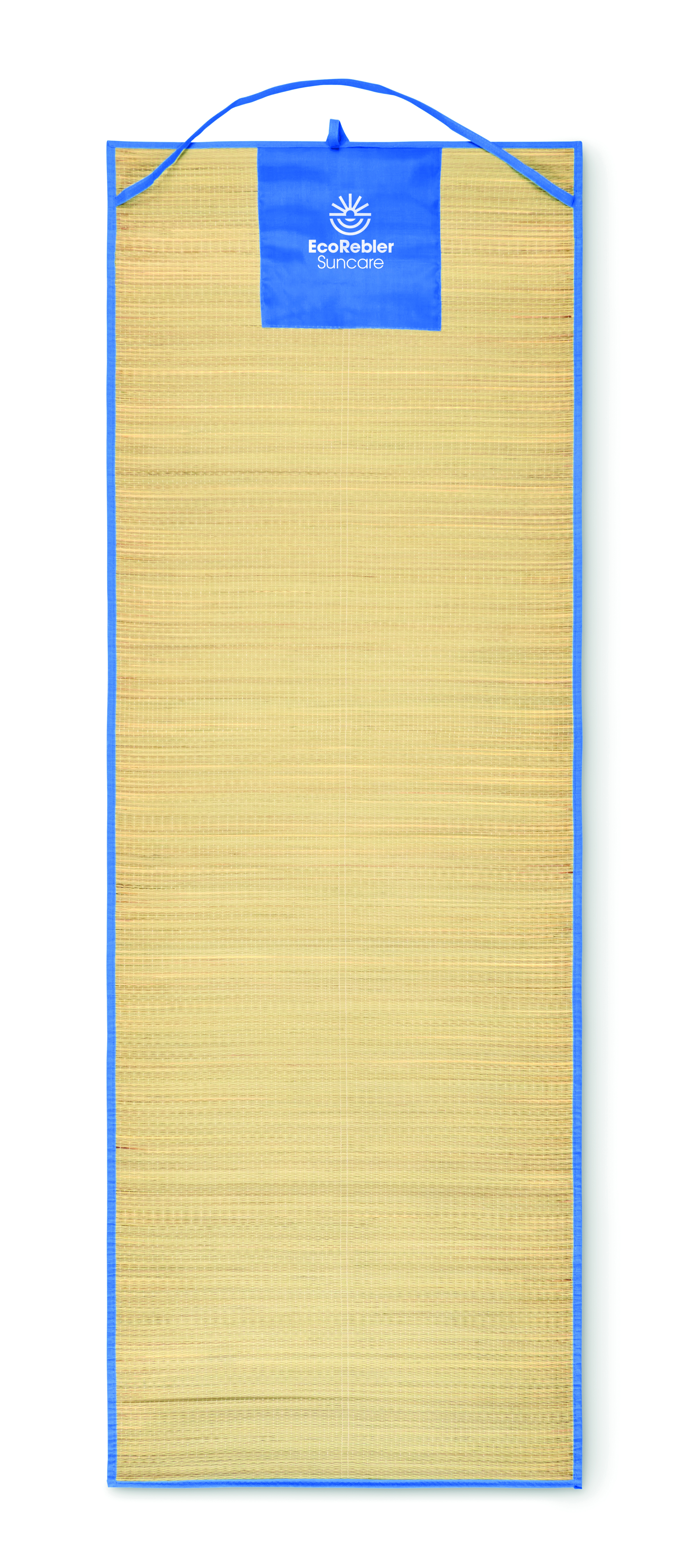 Zwijana mata plażowa z naturalnej słomy z poliestrowym paskiem do przenoszenia.