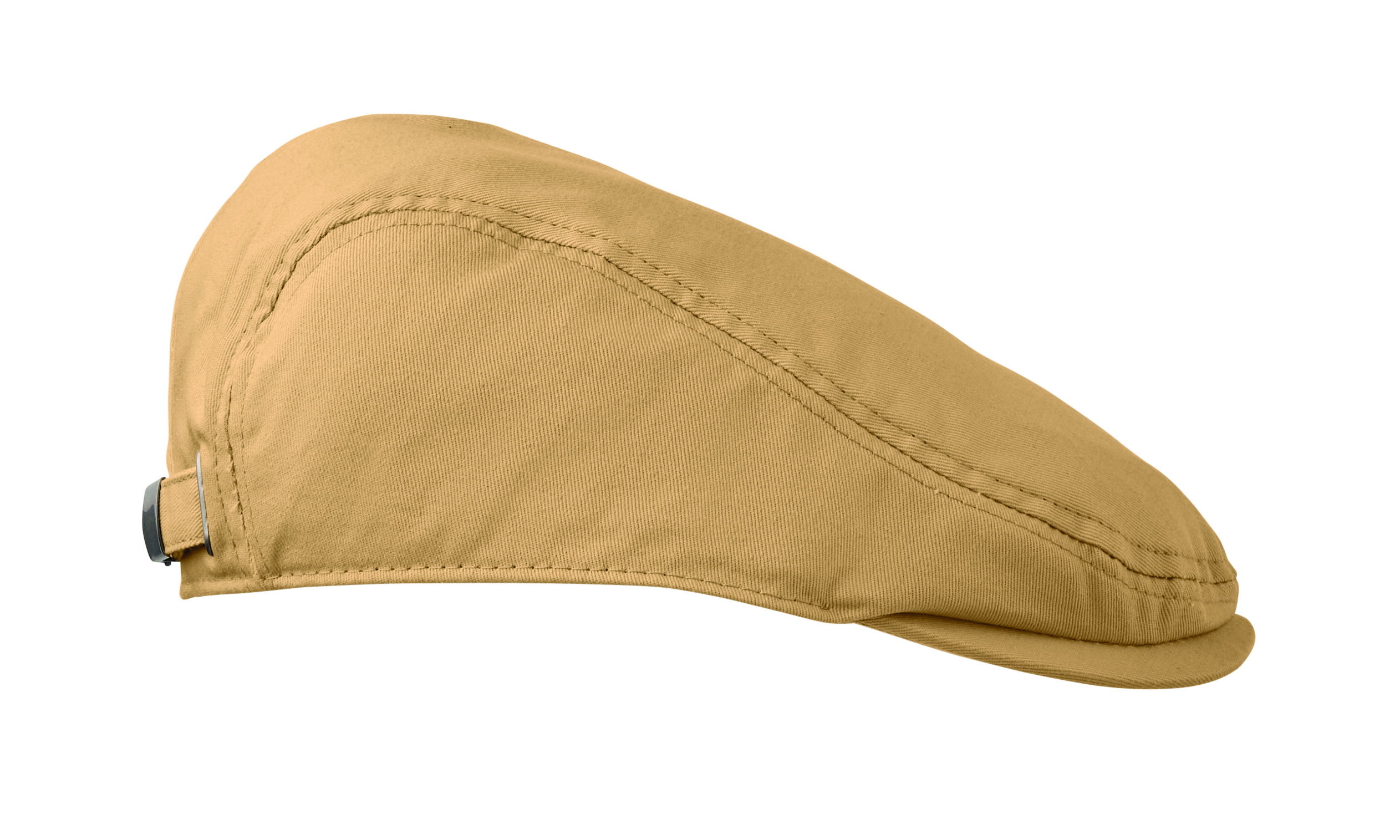 Płaska czapka typu newsboy z bawełny twill o gramaturze 235 gr/m² z zapięciem na metalową sprzączkę.