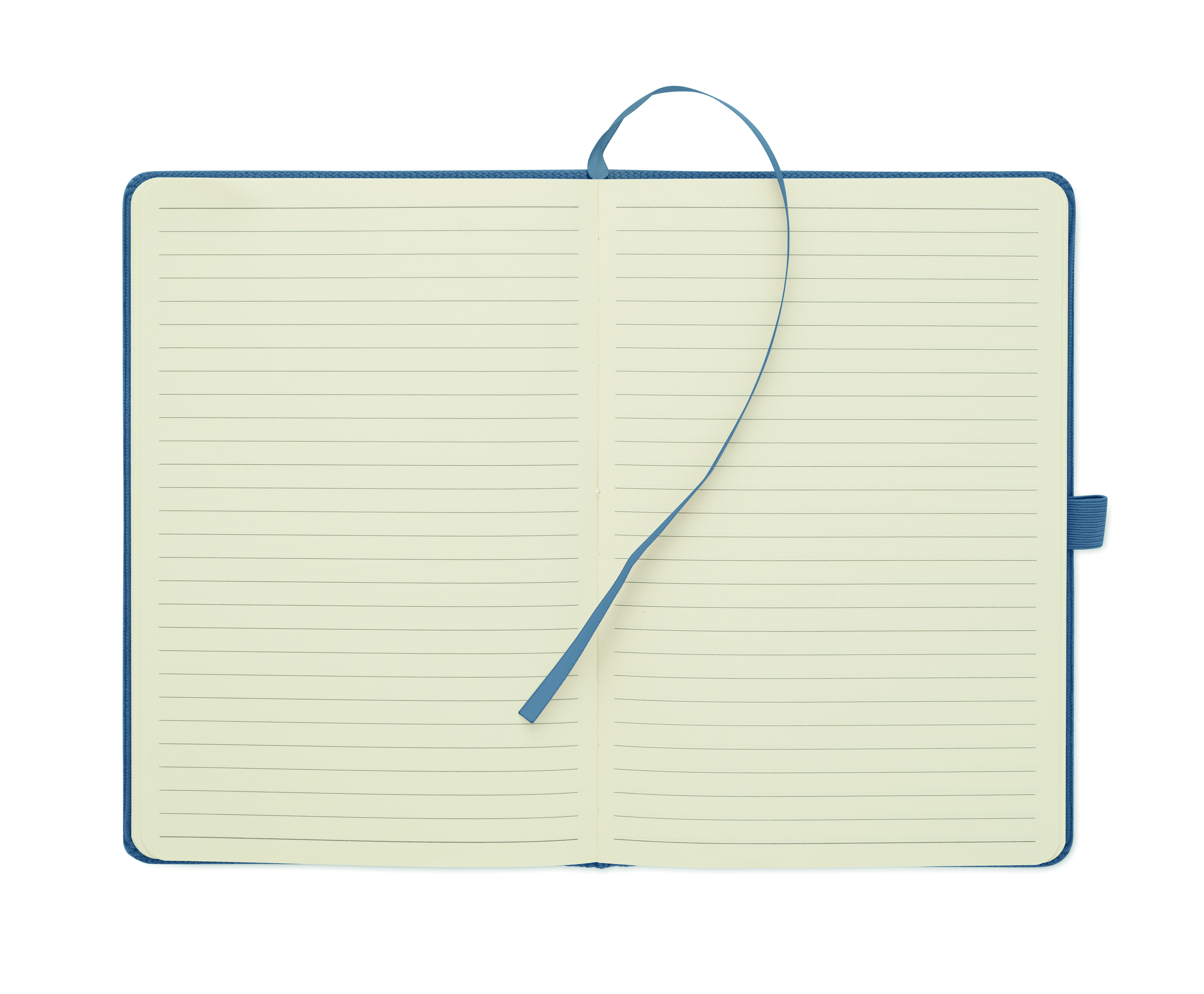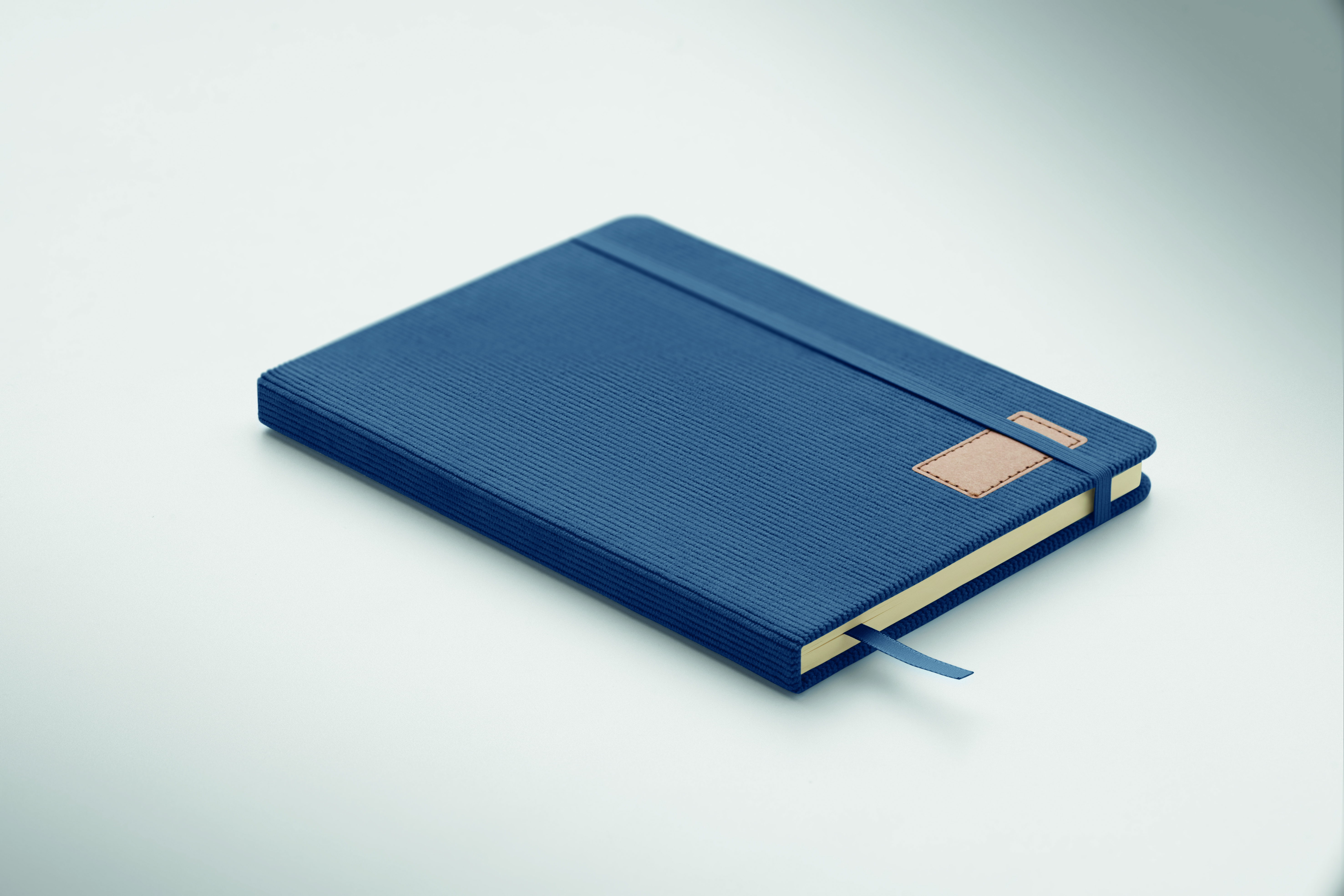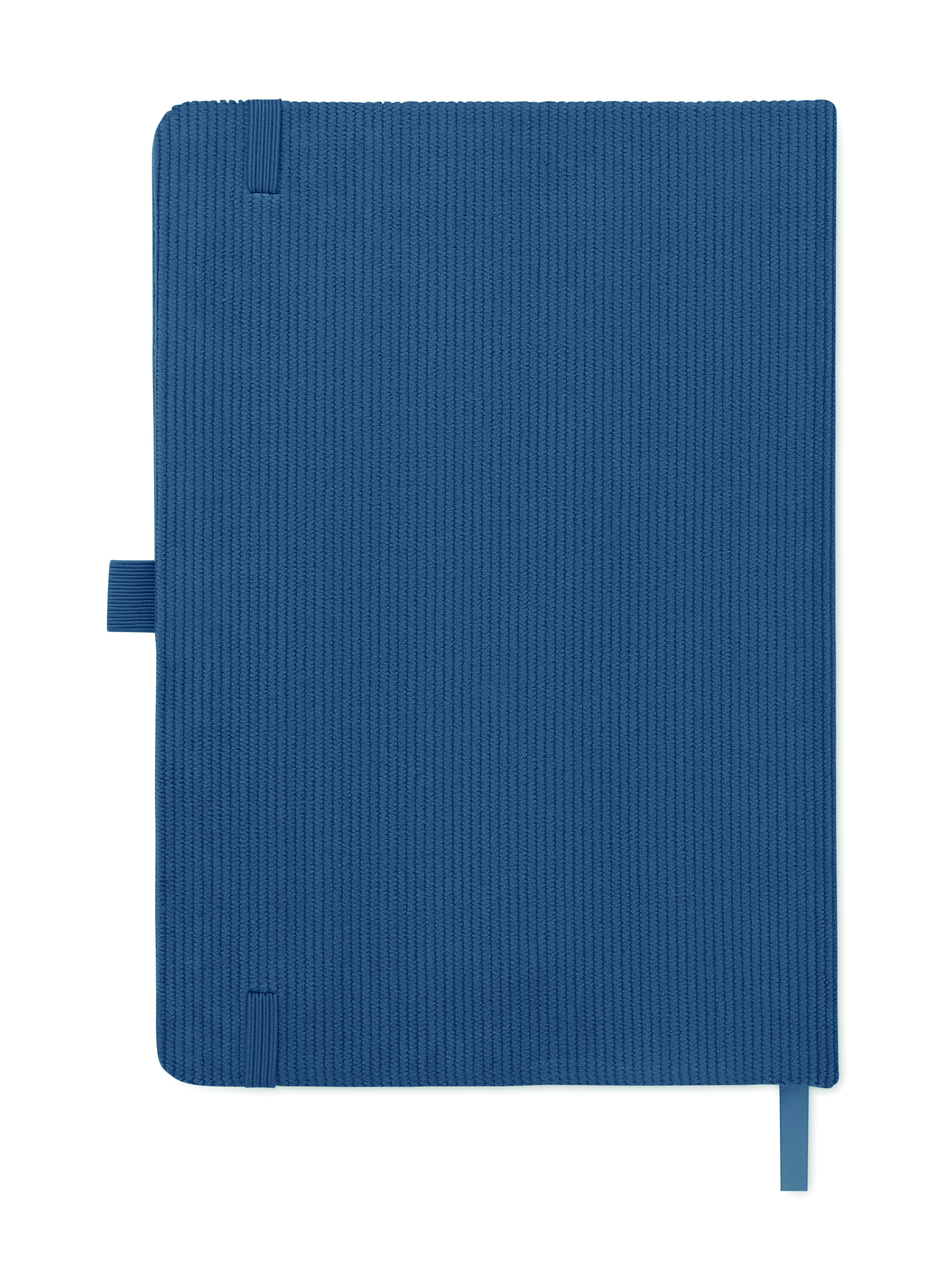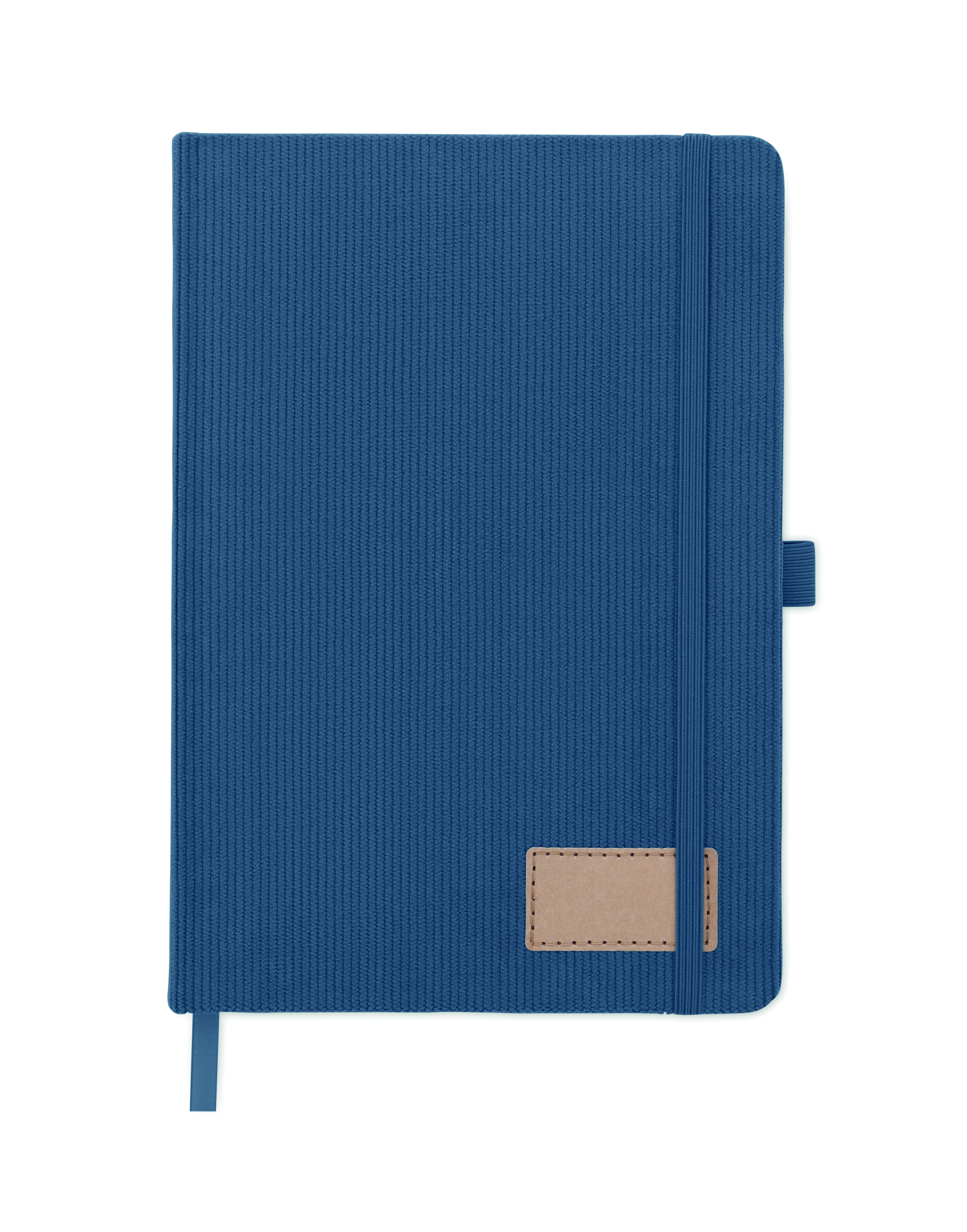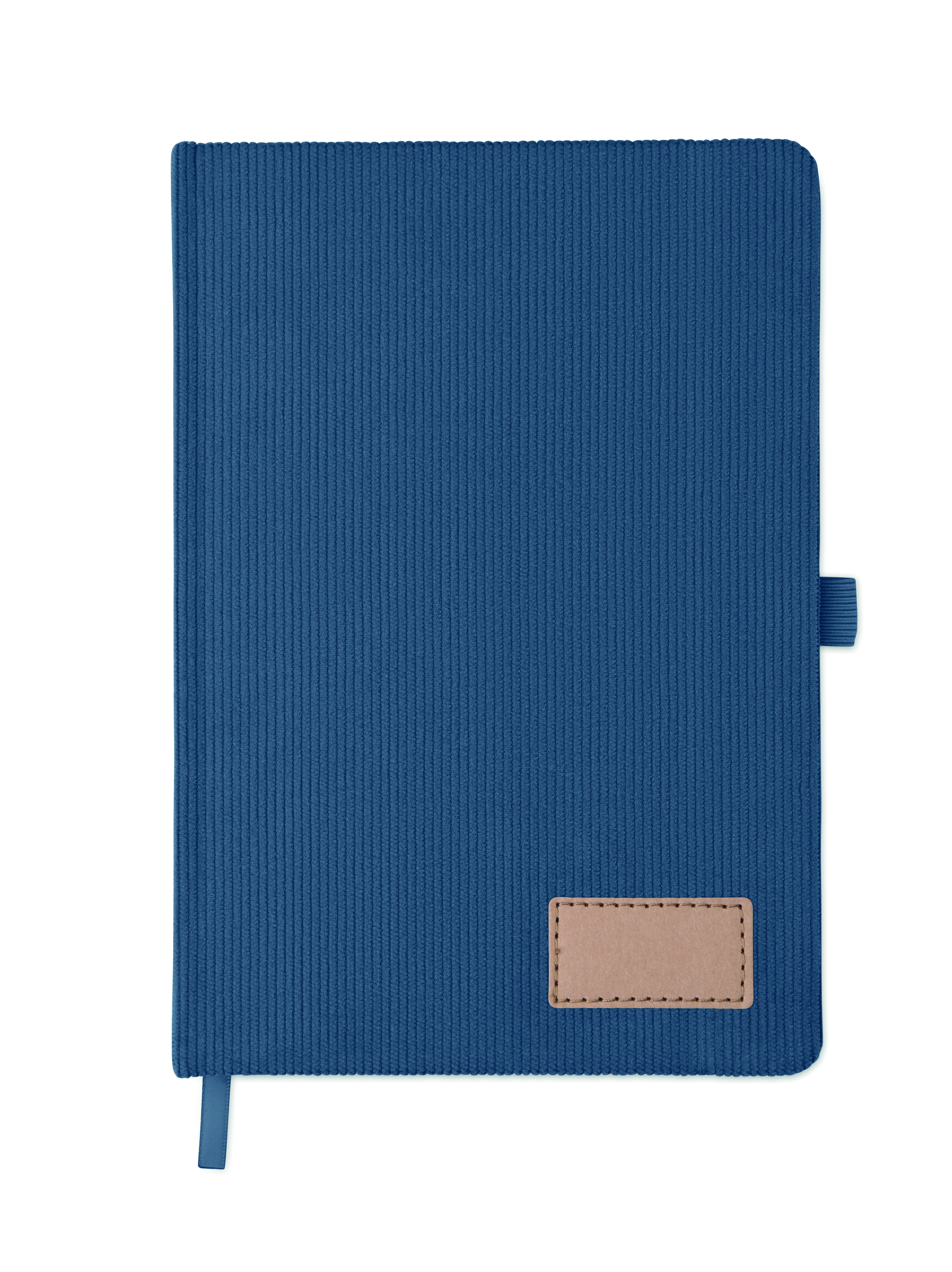 Notatnik A5 z twardą okładką ze sztruksu poliestrowego RPET i 192 stron w linie z papieru makulaturowego (70 gr/m2). Zamykany na gumkę, z pętelką na długopis, wstążką i przywieszką z papieru kraft.