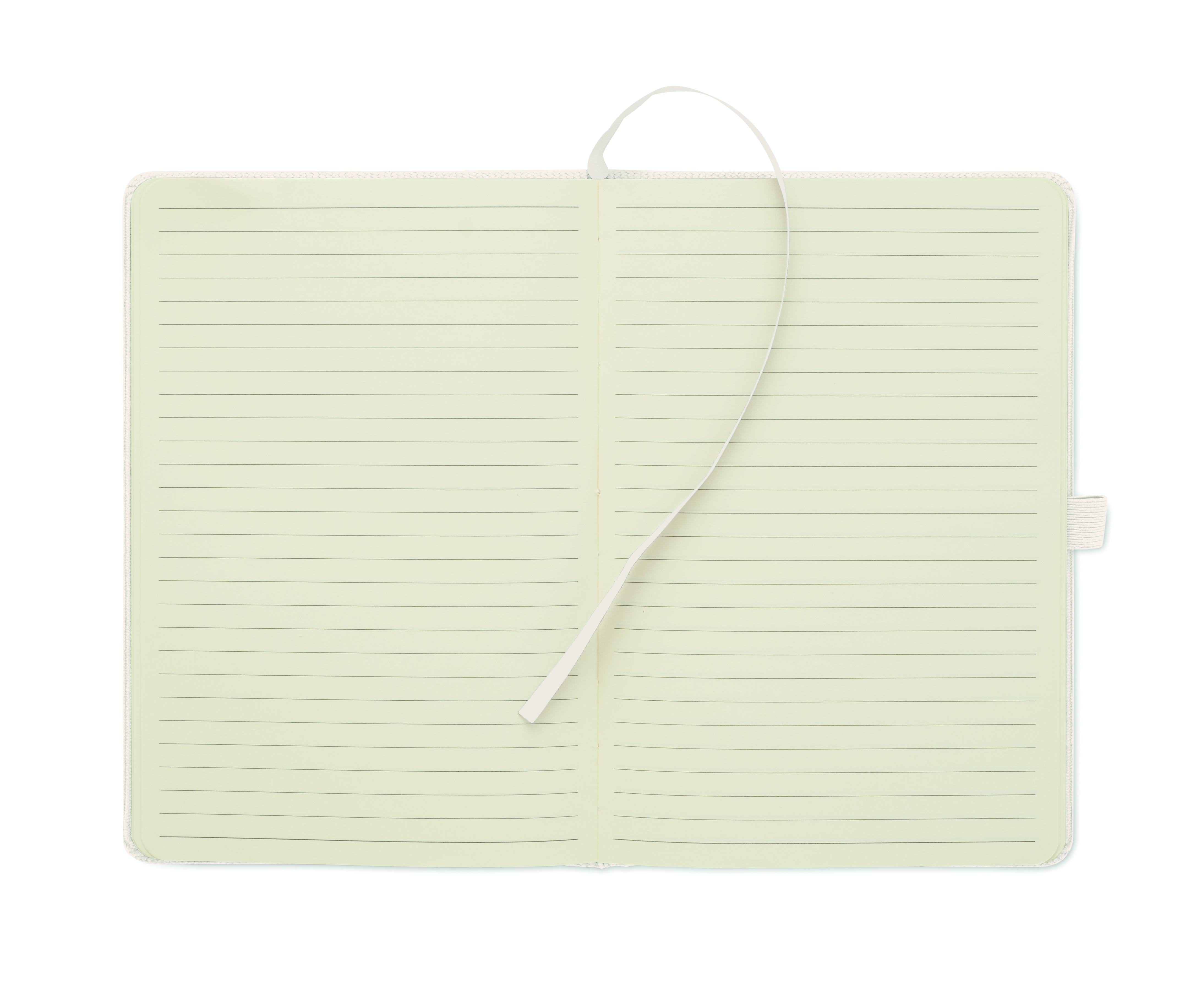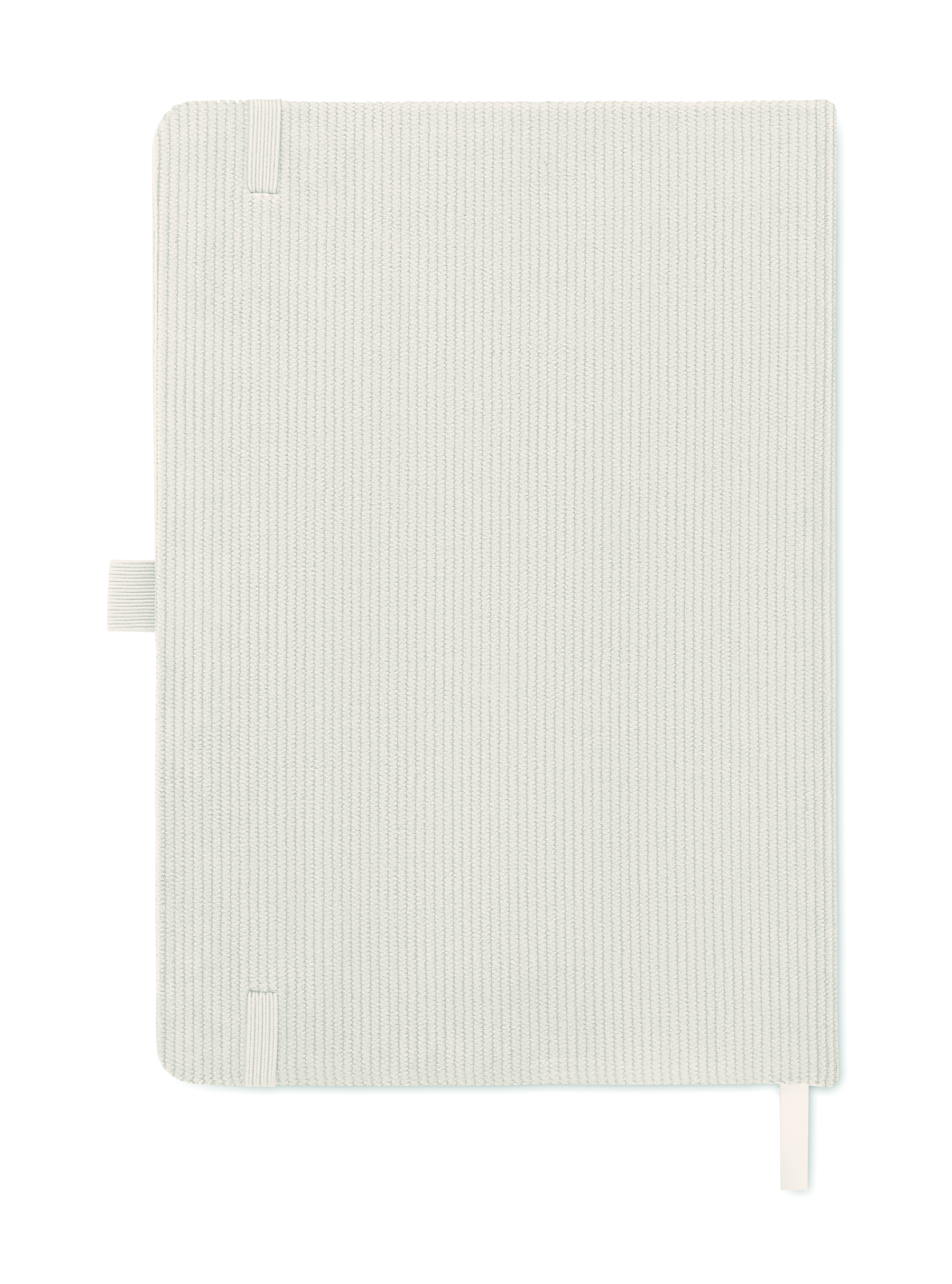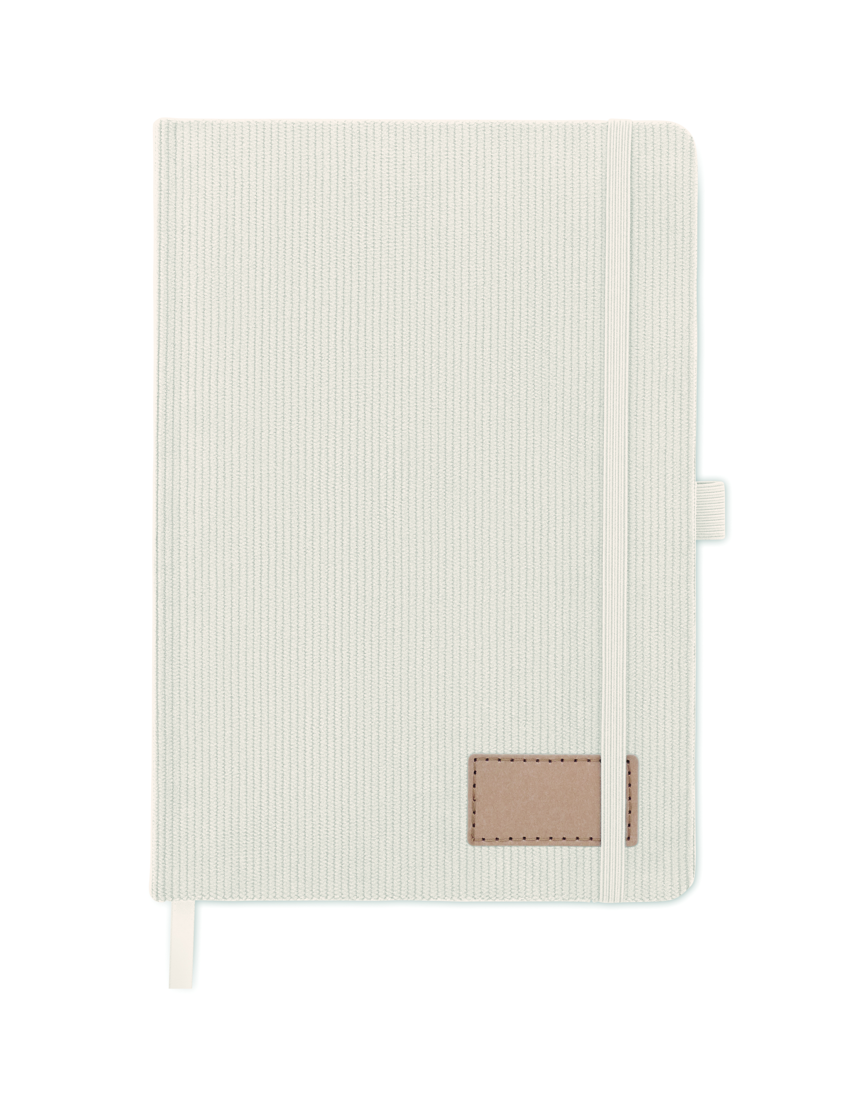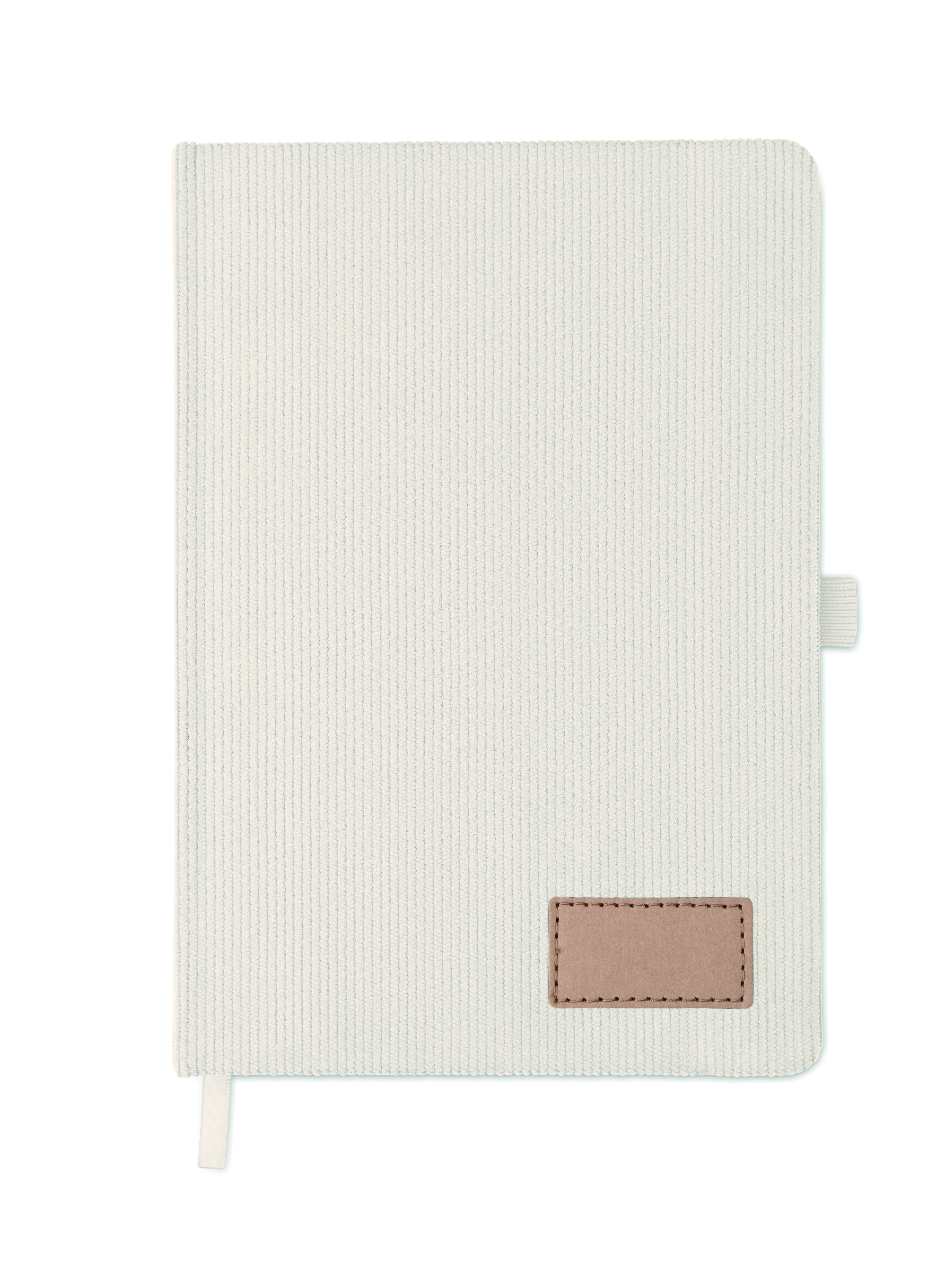 Notatnik A5 z twardą okładką ze sztruksu poliestrowego RPET i 192 stron w linie z papieru makulaturowego (70 gr/m2). Zamykany na gumkę, z pętelką na długopis, wstążką i przywieszką z papieru kraft.