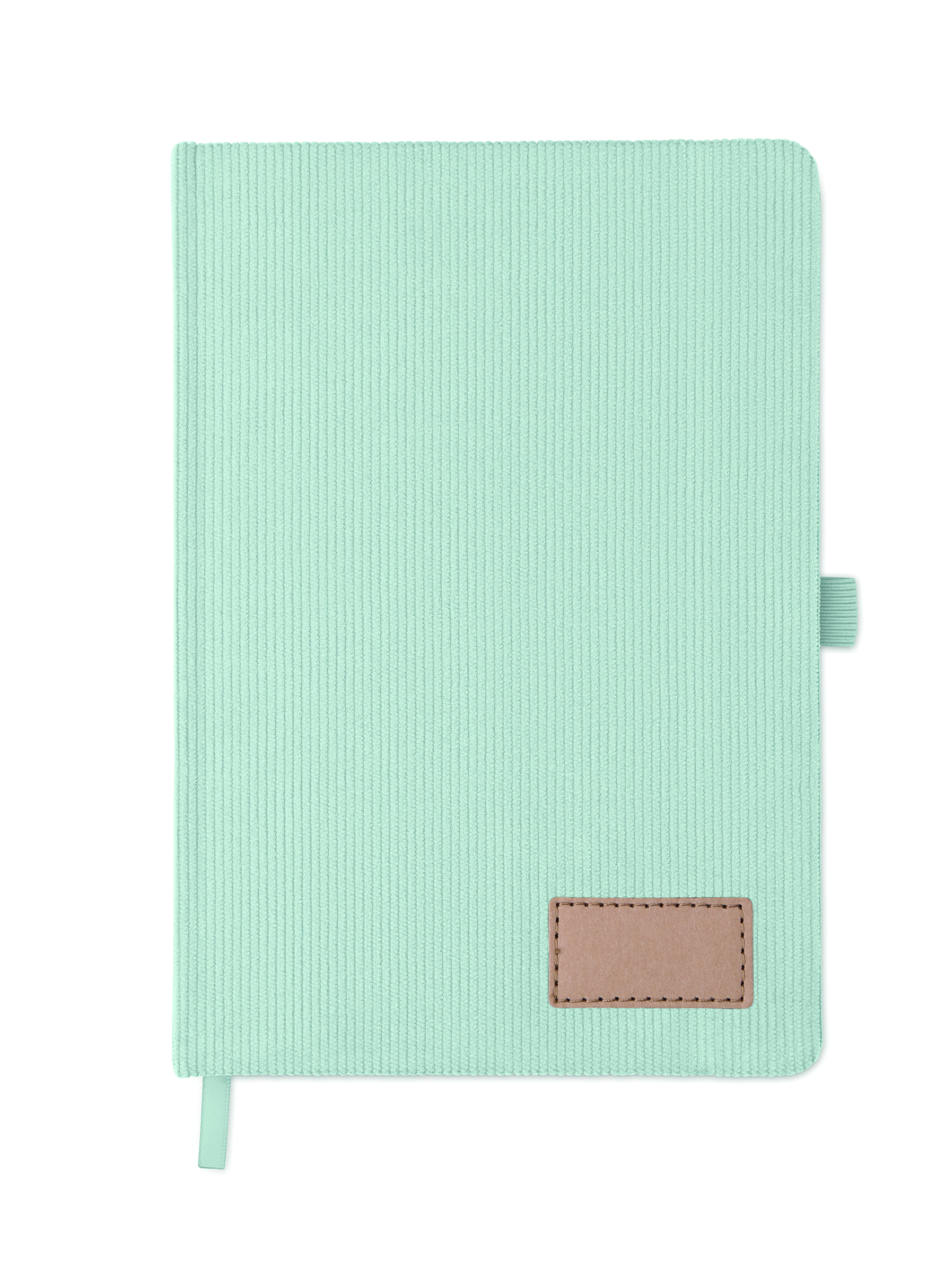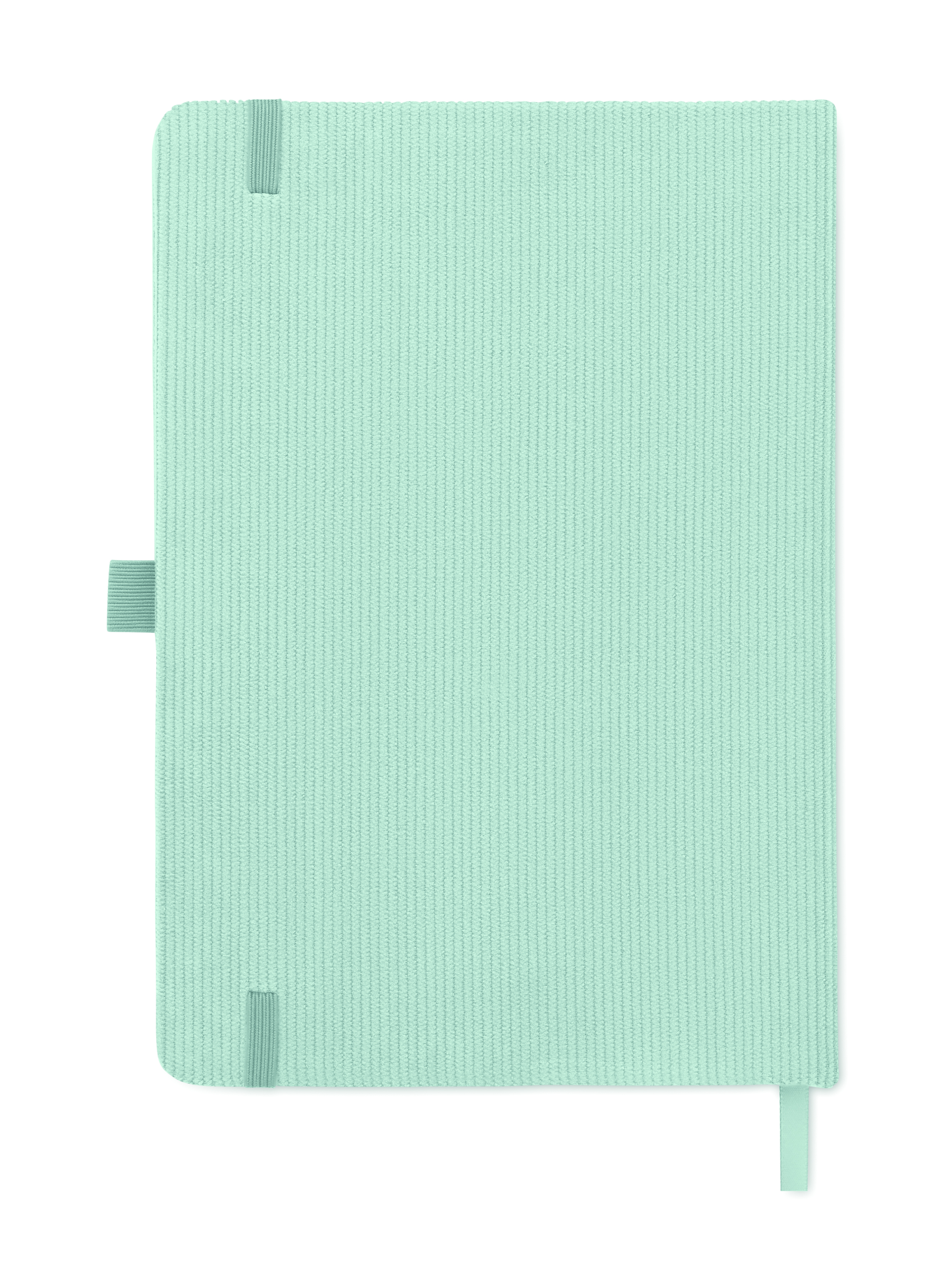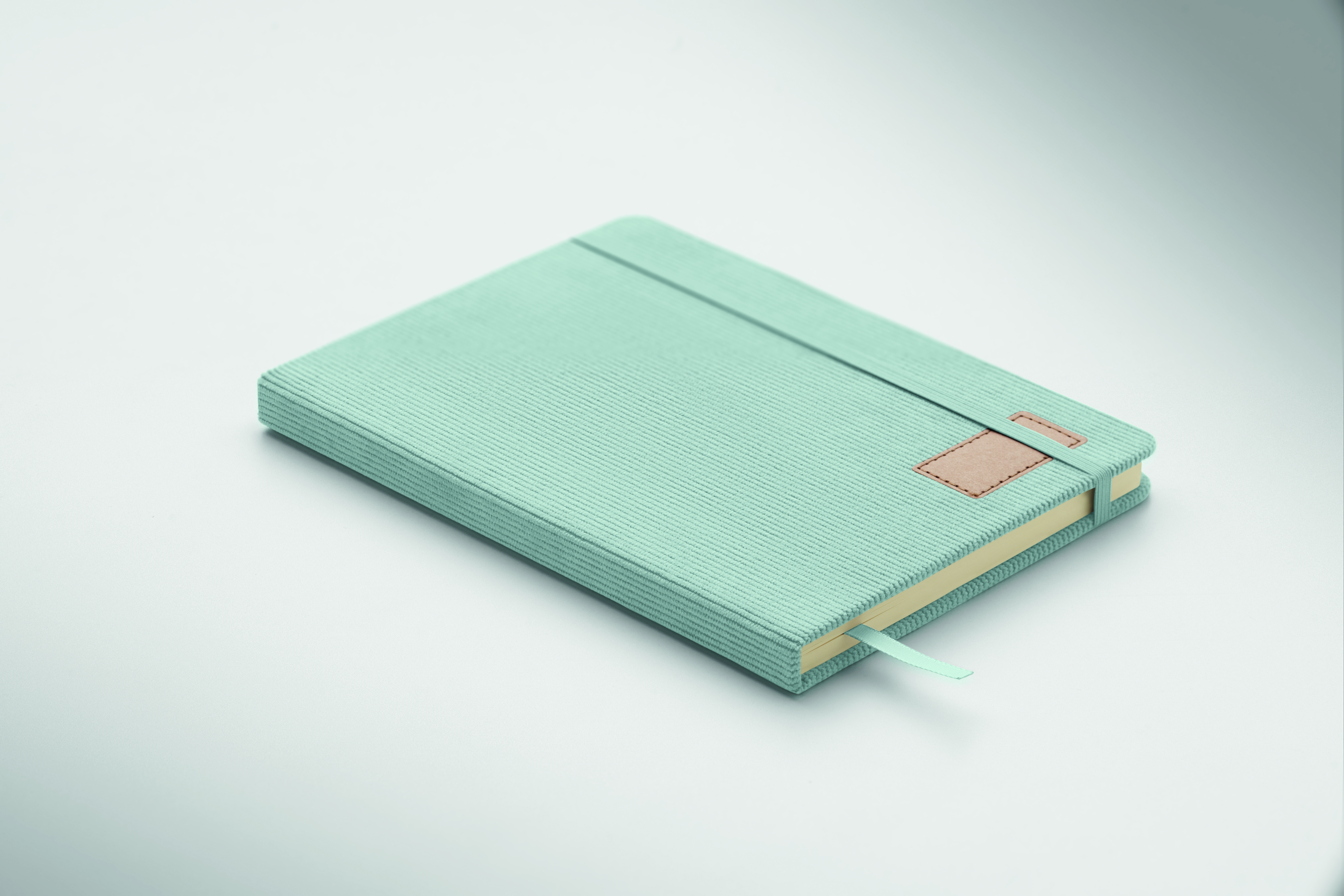 Notatnik A5 z twardą okładką ze sztruksu poliestrowego RPET i 192 stron w linie z papieru makulaturowego (70 gr/m2). Zamykany na gumkę, z pętelką na długopis, wstążką i przywieszką z papieru kraft.