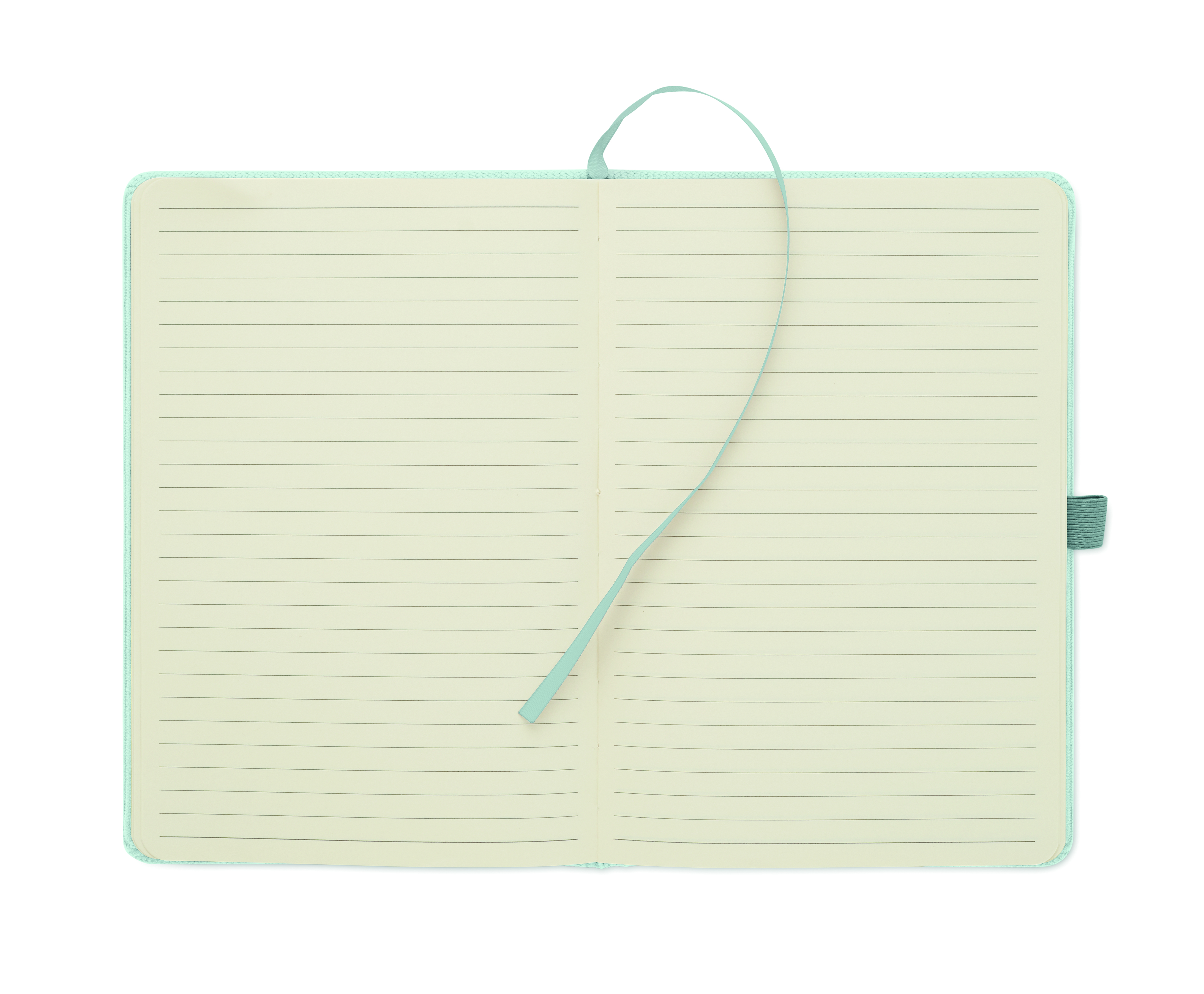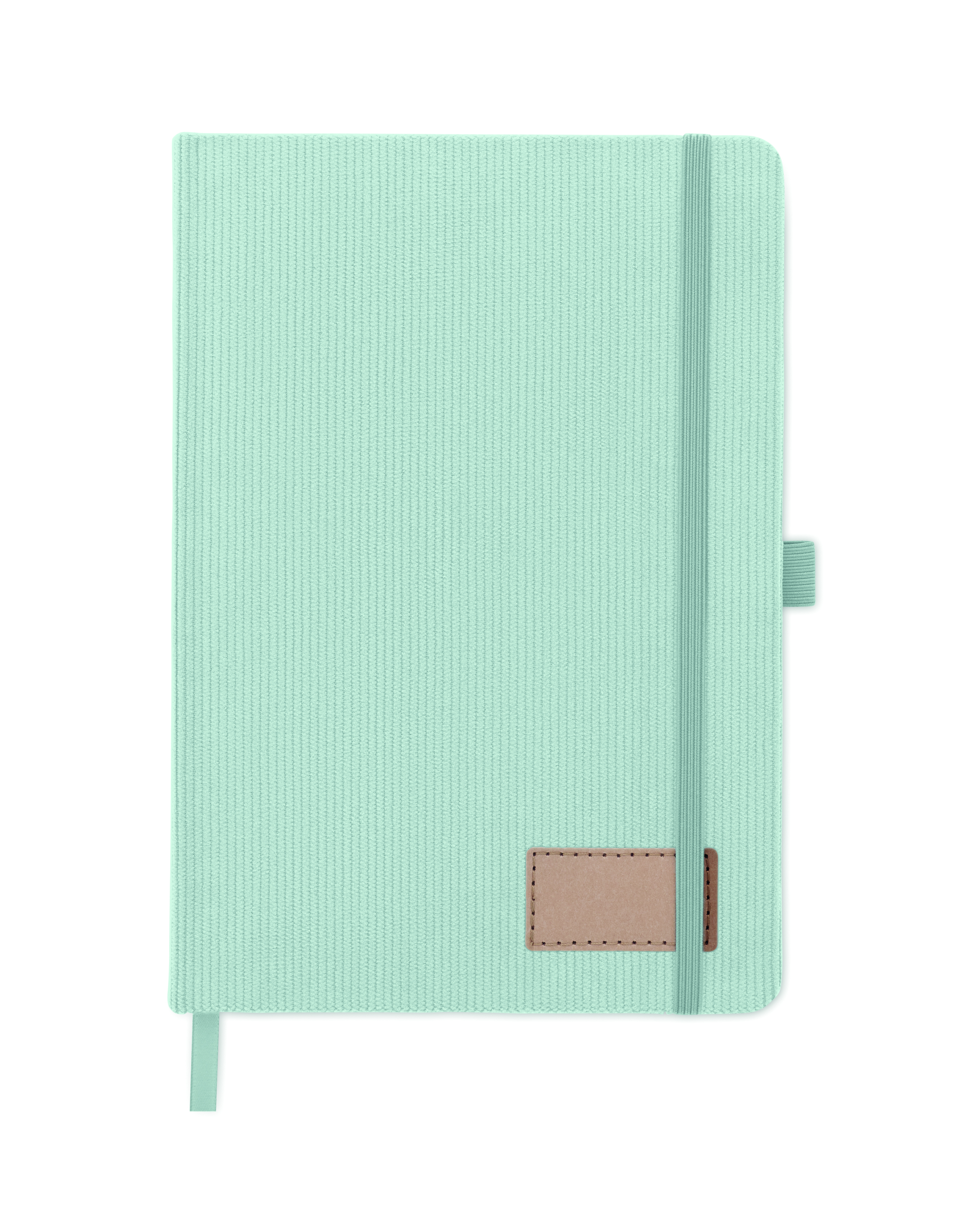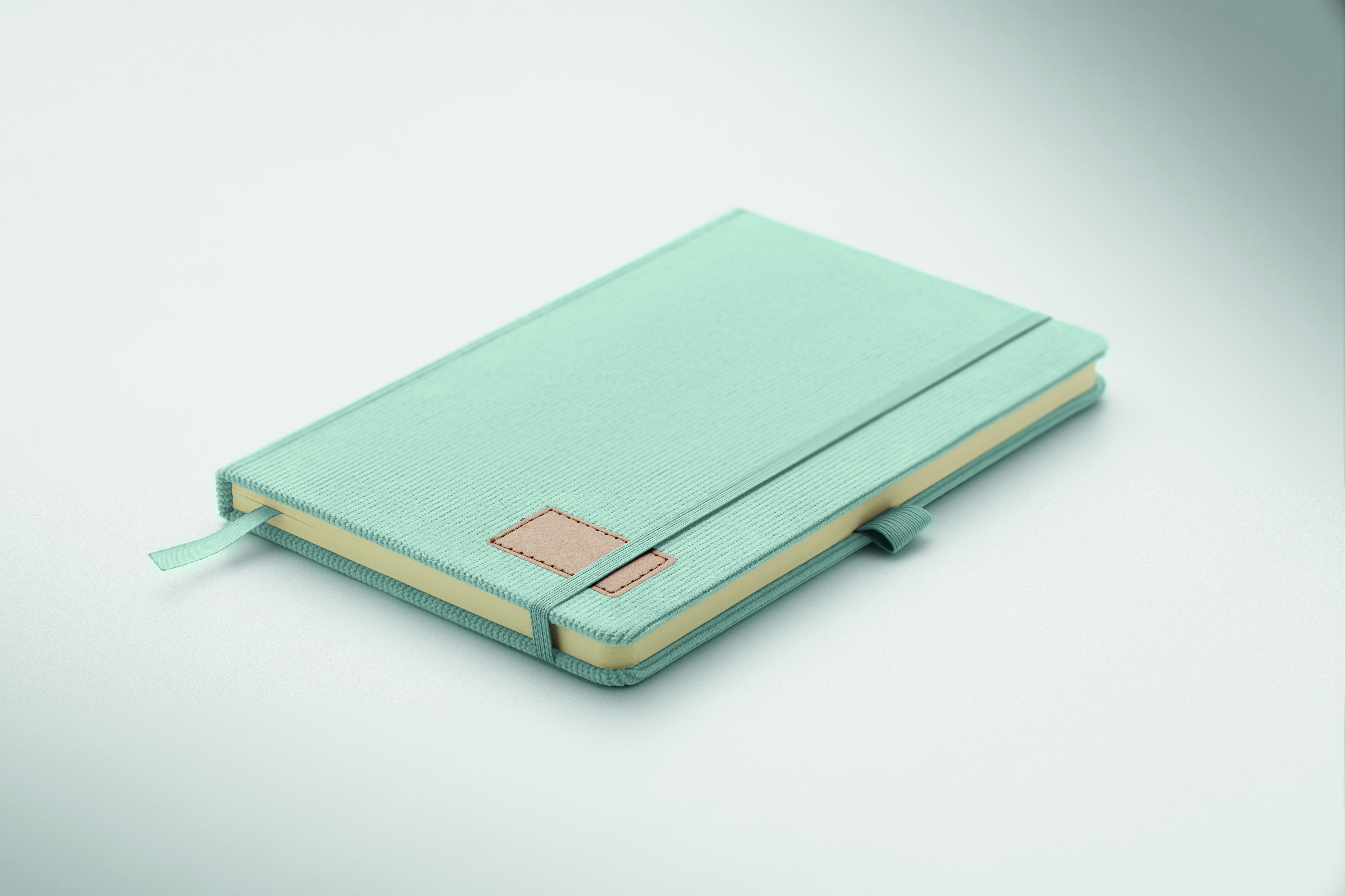 Notatnik A5 z twardą okładką ze sztruksu poliestrowego RPET i 192 stron w linie z papieru makulaturowego (70 gr/m2). Zamykany na gumkę, z pętelką na długopis, wstążką i przywieszką z papieru kraft.
