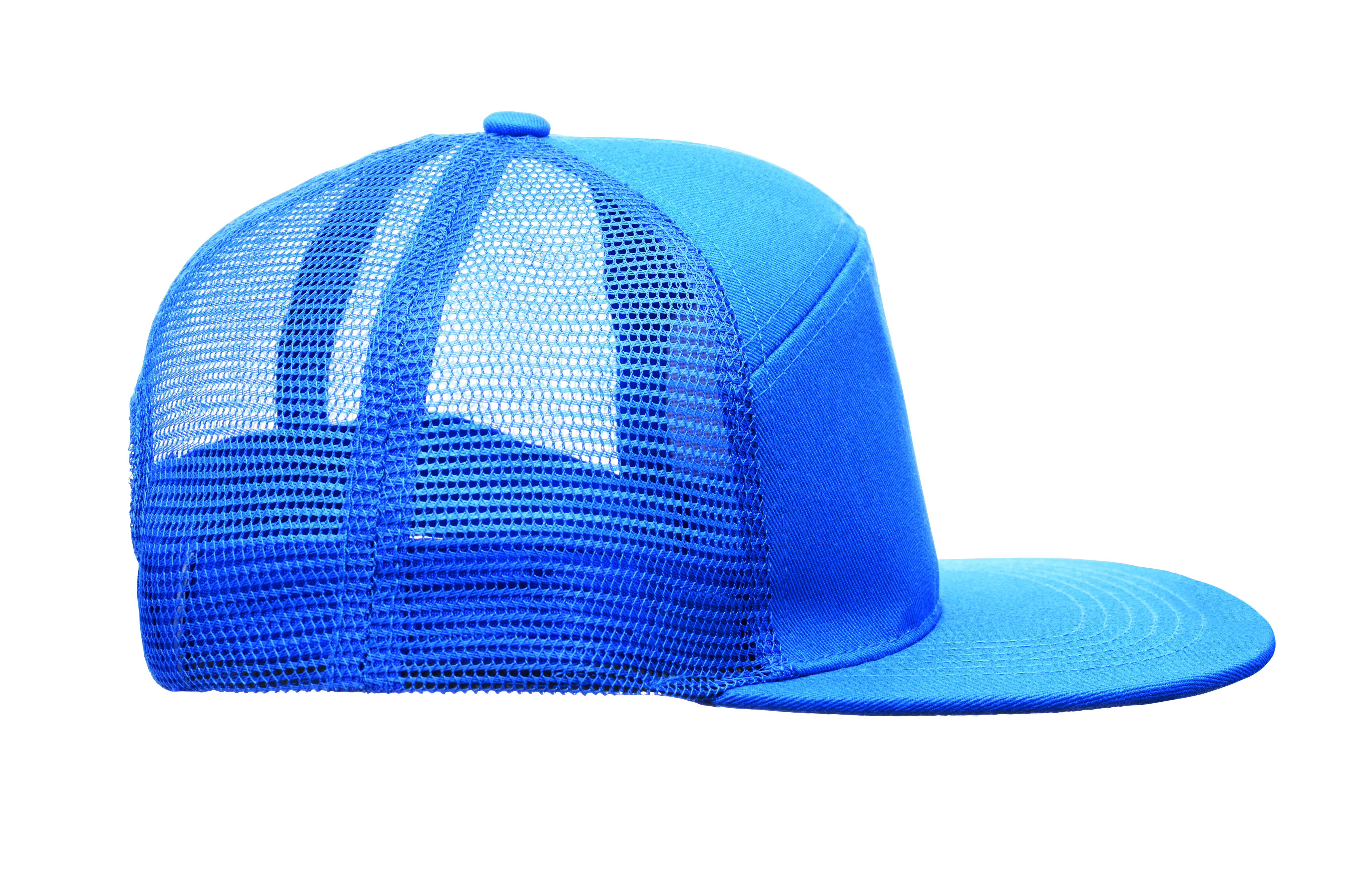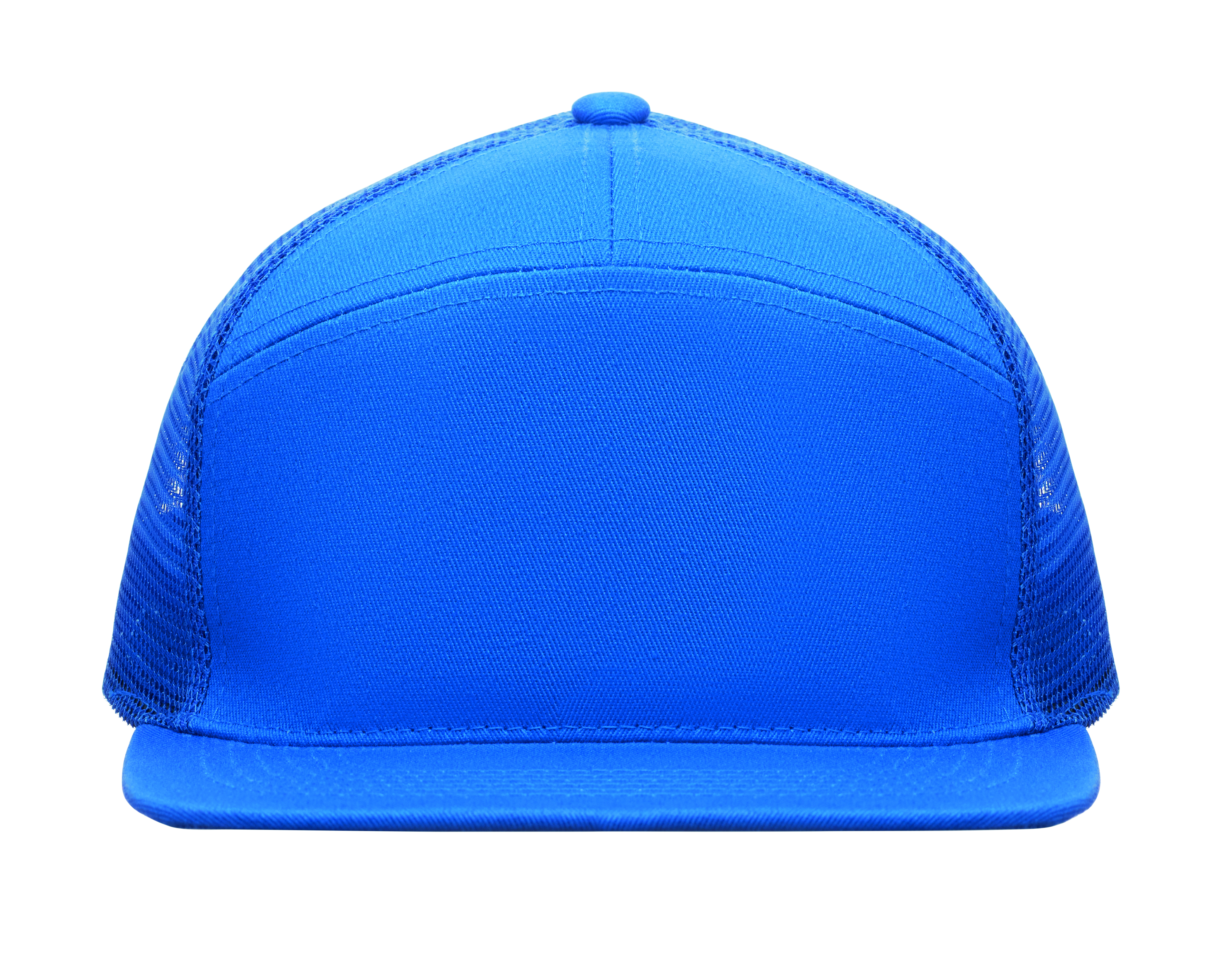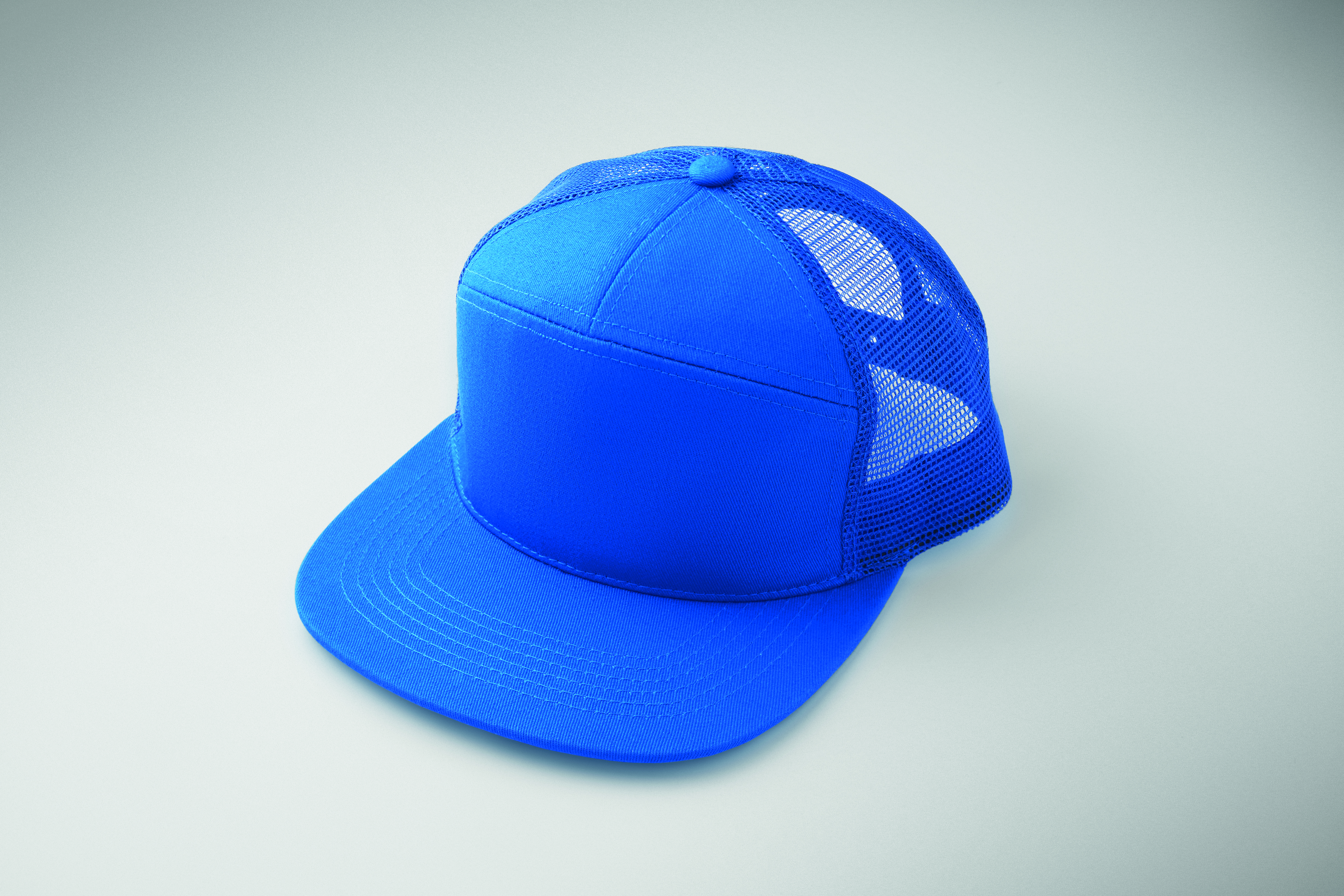 7-panelowa czapka z płaskim daszkiem z bawełnianego twillu z poliestrową siateczką z tyłu i plastikowym zapięciem.