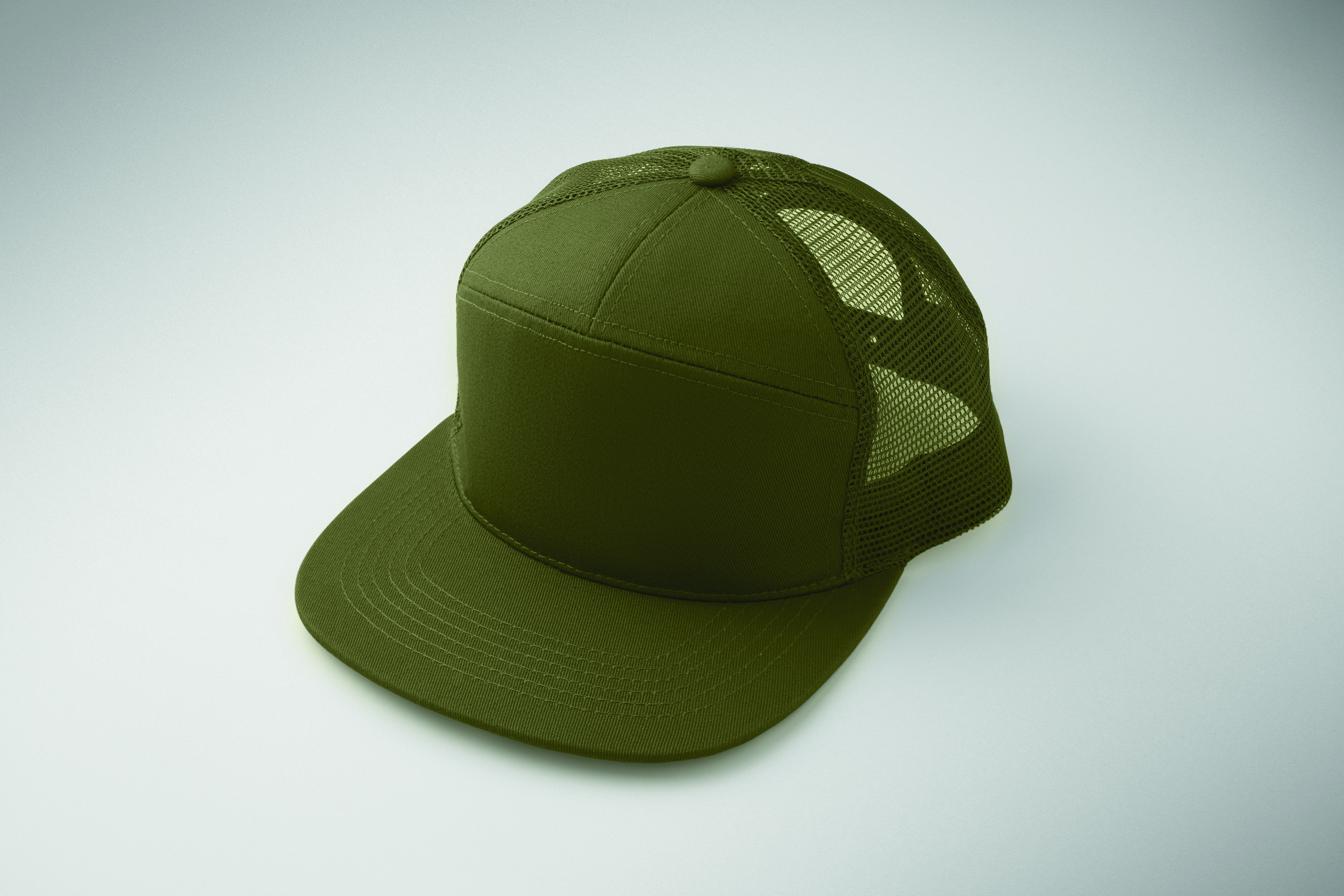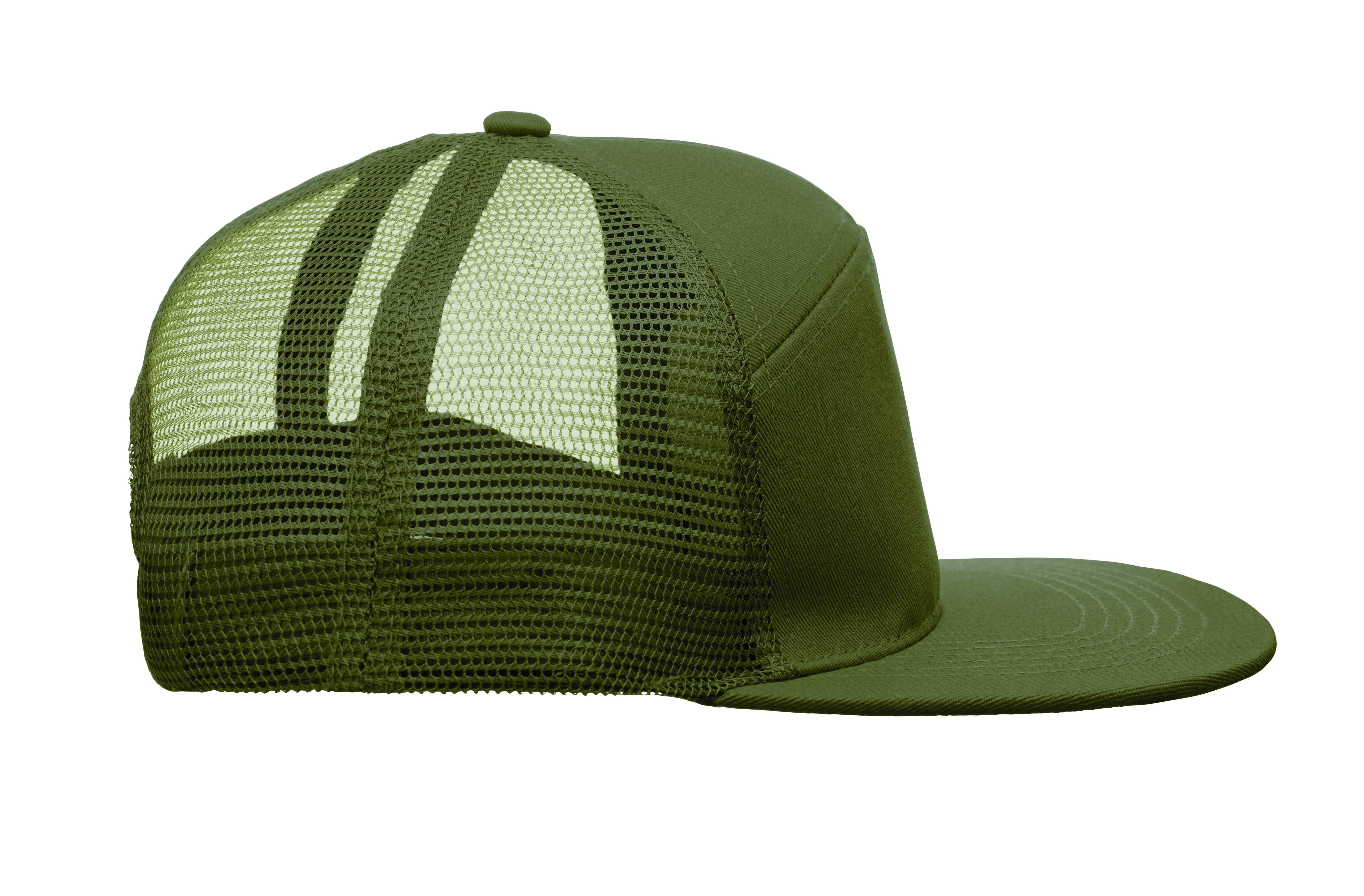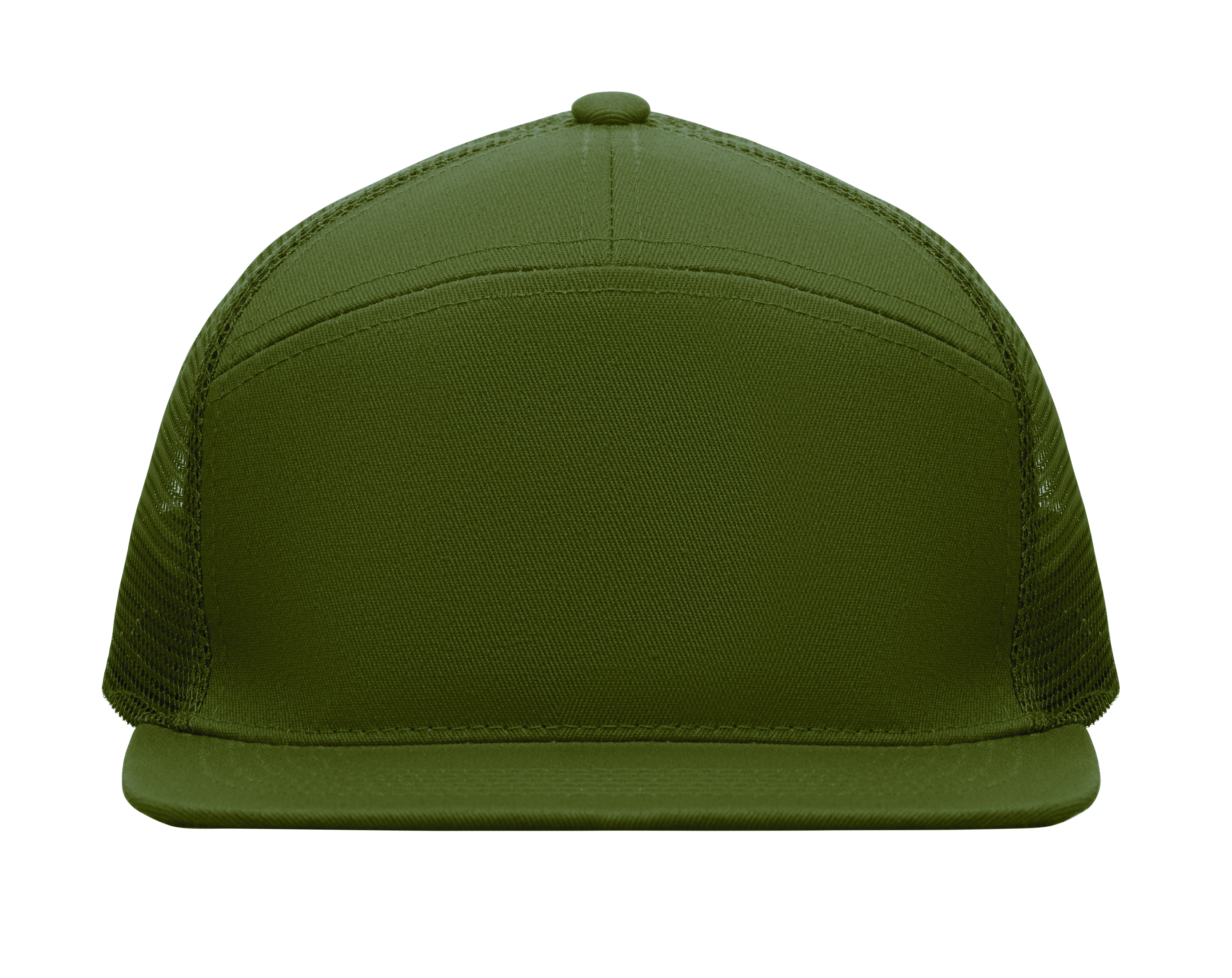 7-panelowa czapka z płaskim daszkiem z bawełnianego twillu z poliestrową siateczką z tyłu i plastikowym zapięciem.