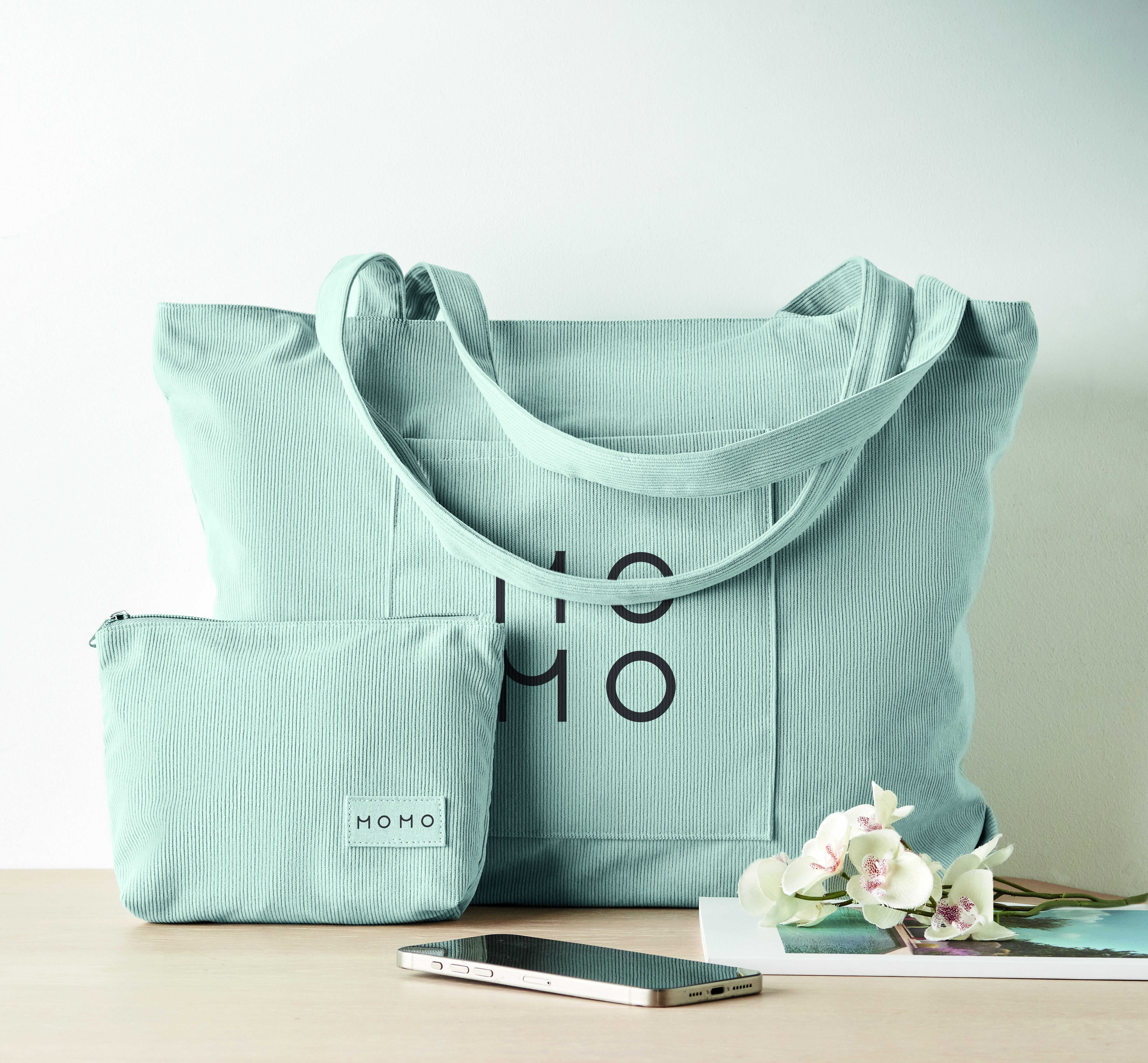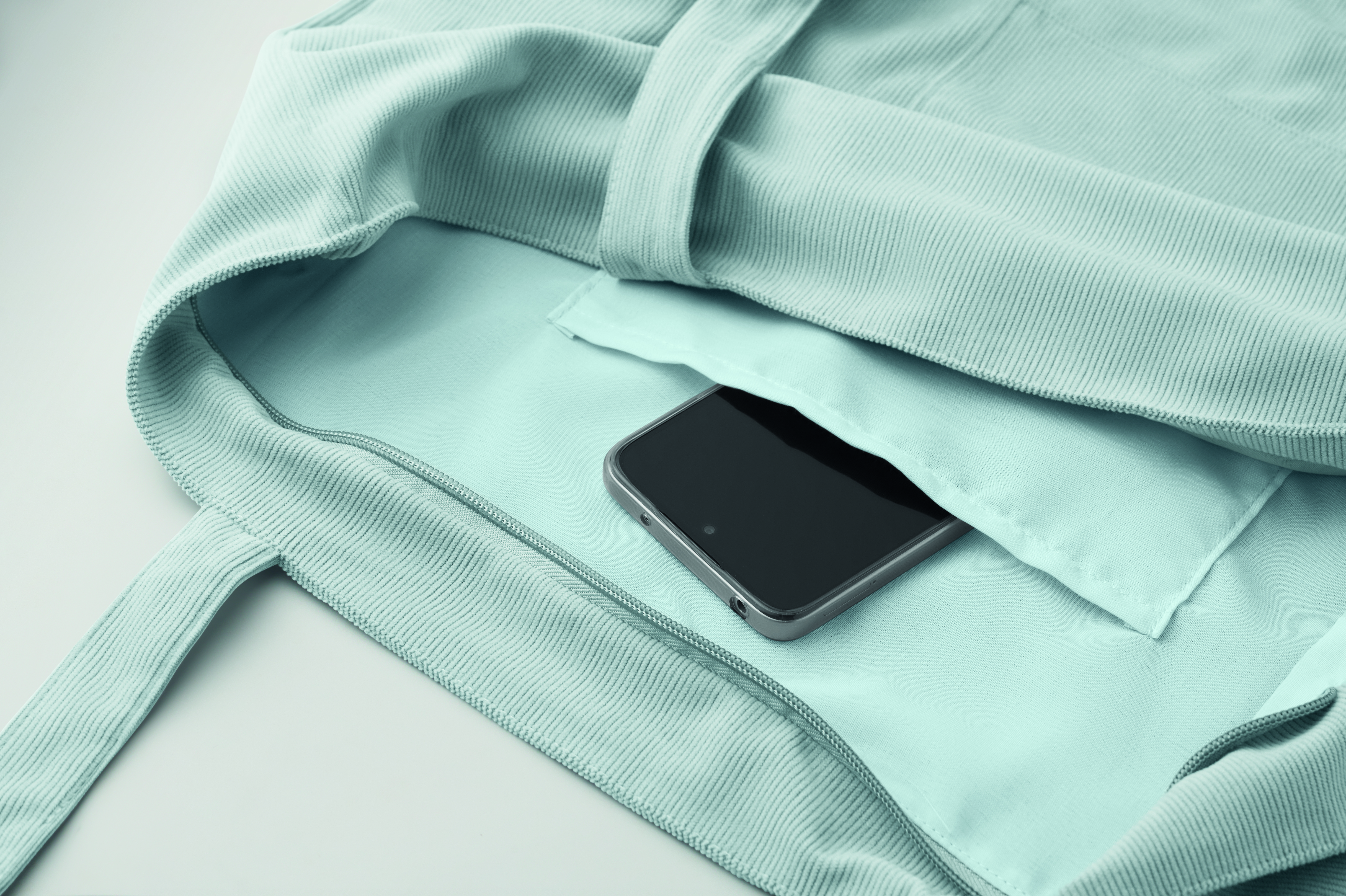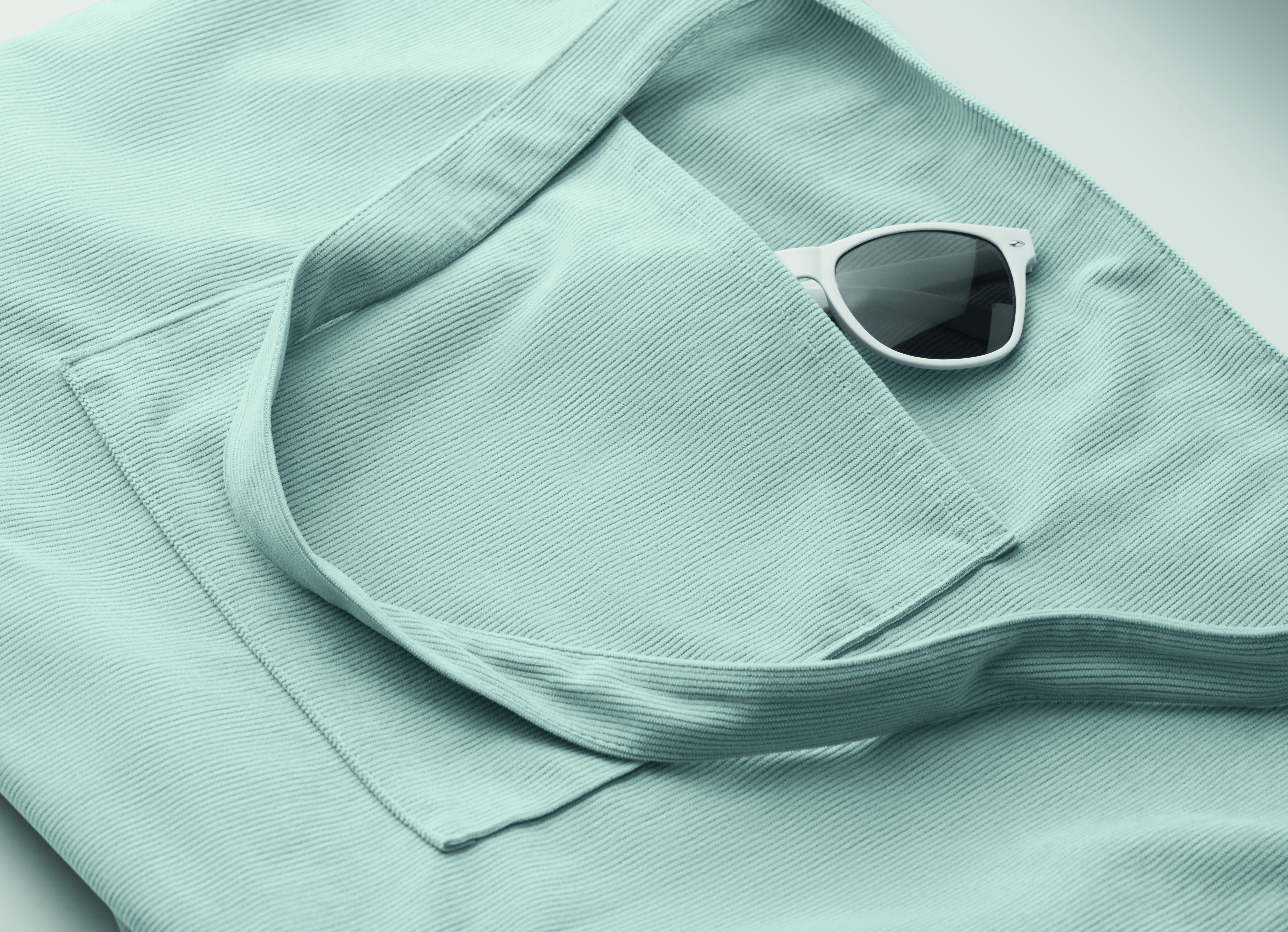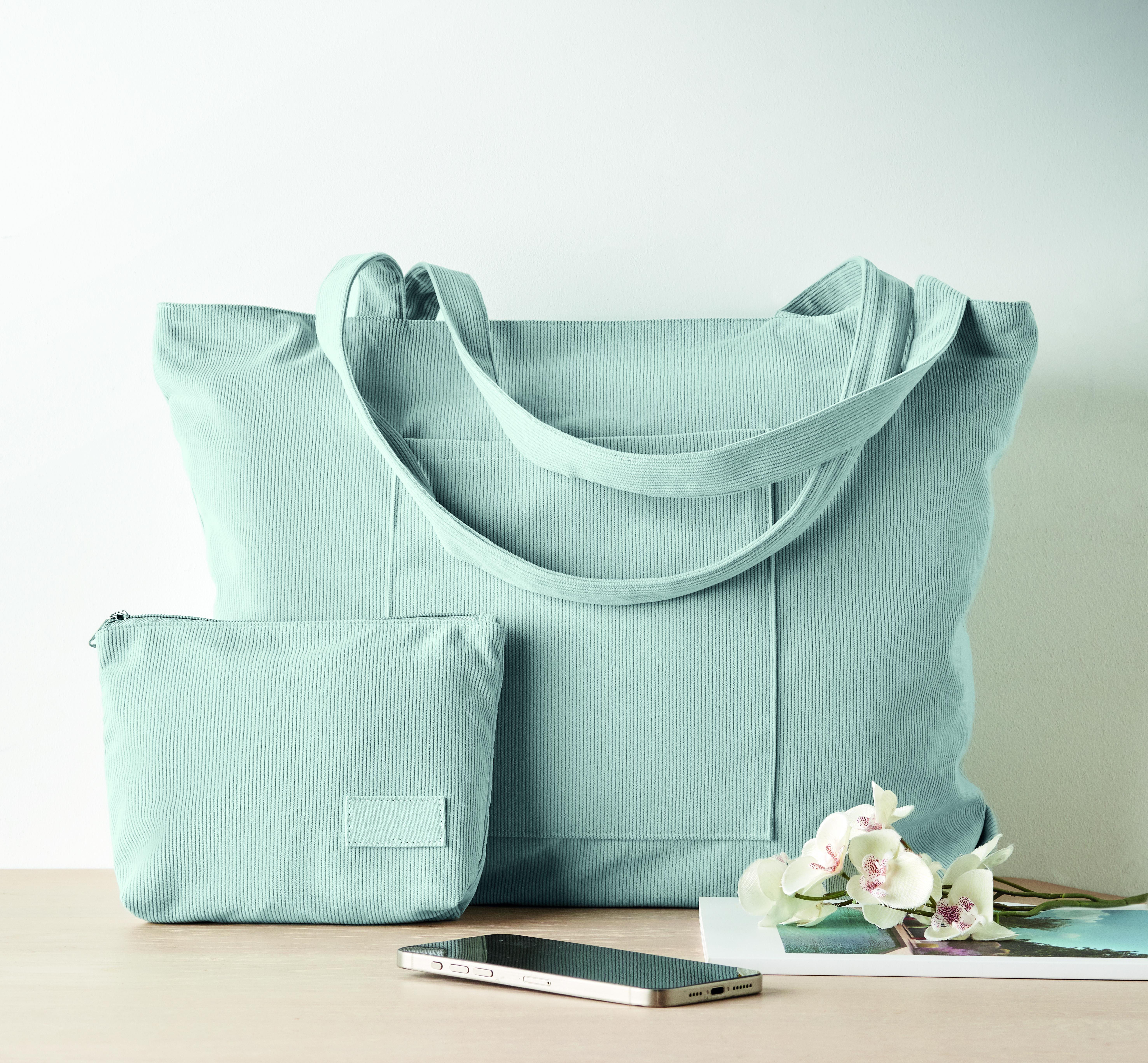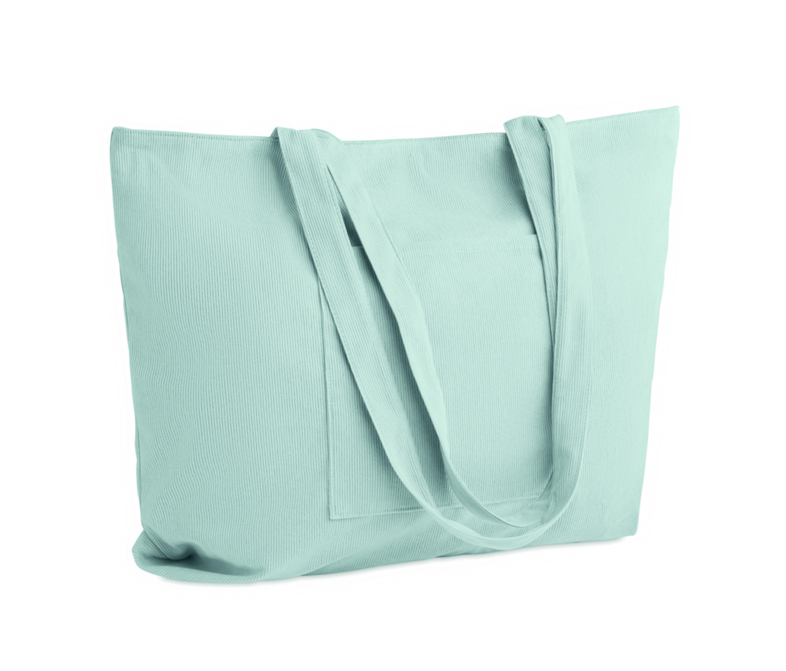 Duża torba na zakupy/plażę z poliestrowego sztruksu z górnym zamkiem błyskawicznym, otwieraną kieszenią z przodu i kieszenią wewnętrzną. 220 gr/m².