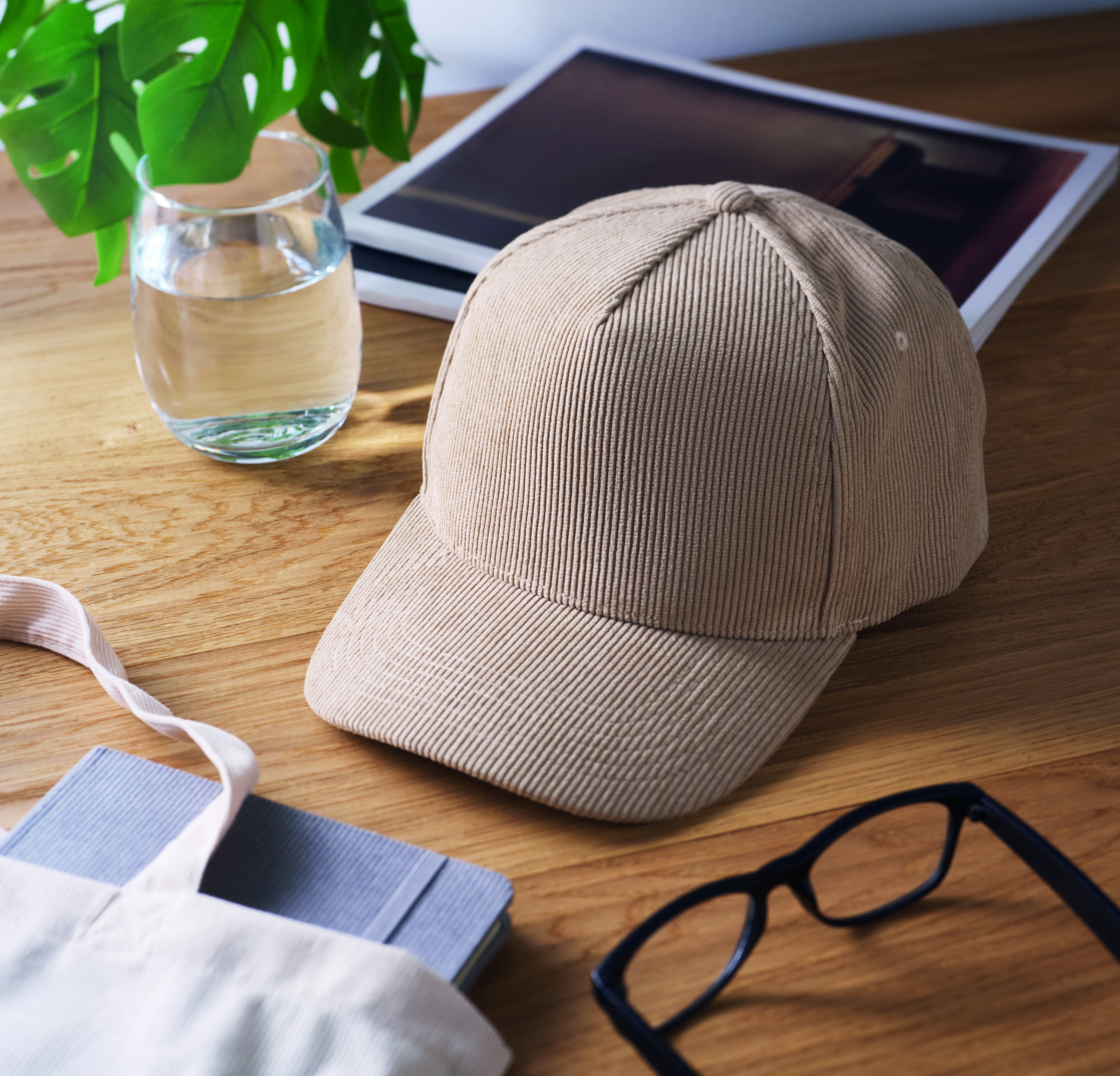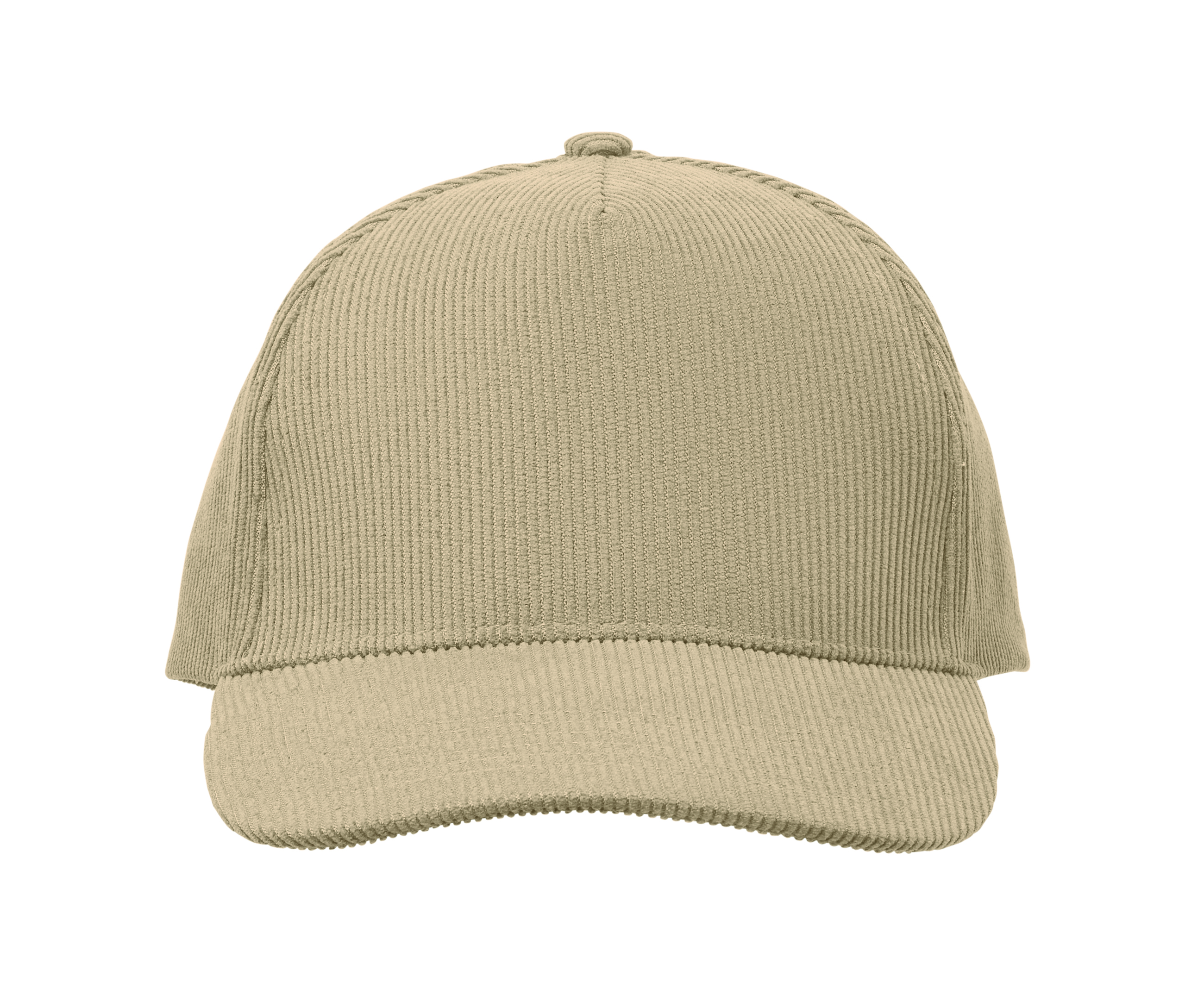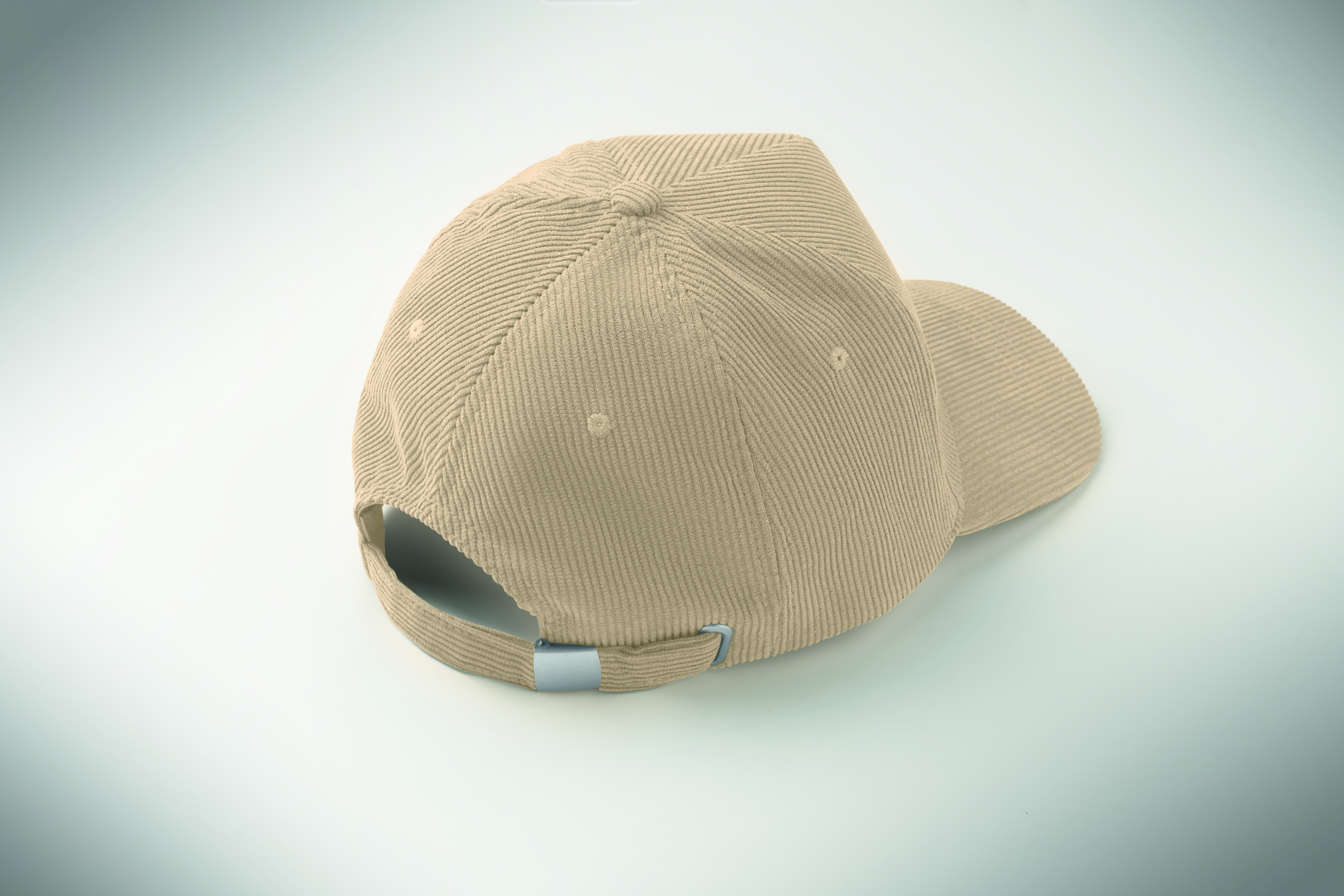 5-panelowa czapka z daszkiem z poliestrowego sztruksu z regulowanym zapięciem na metalową klamrę. 220 gr/m².