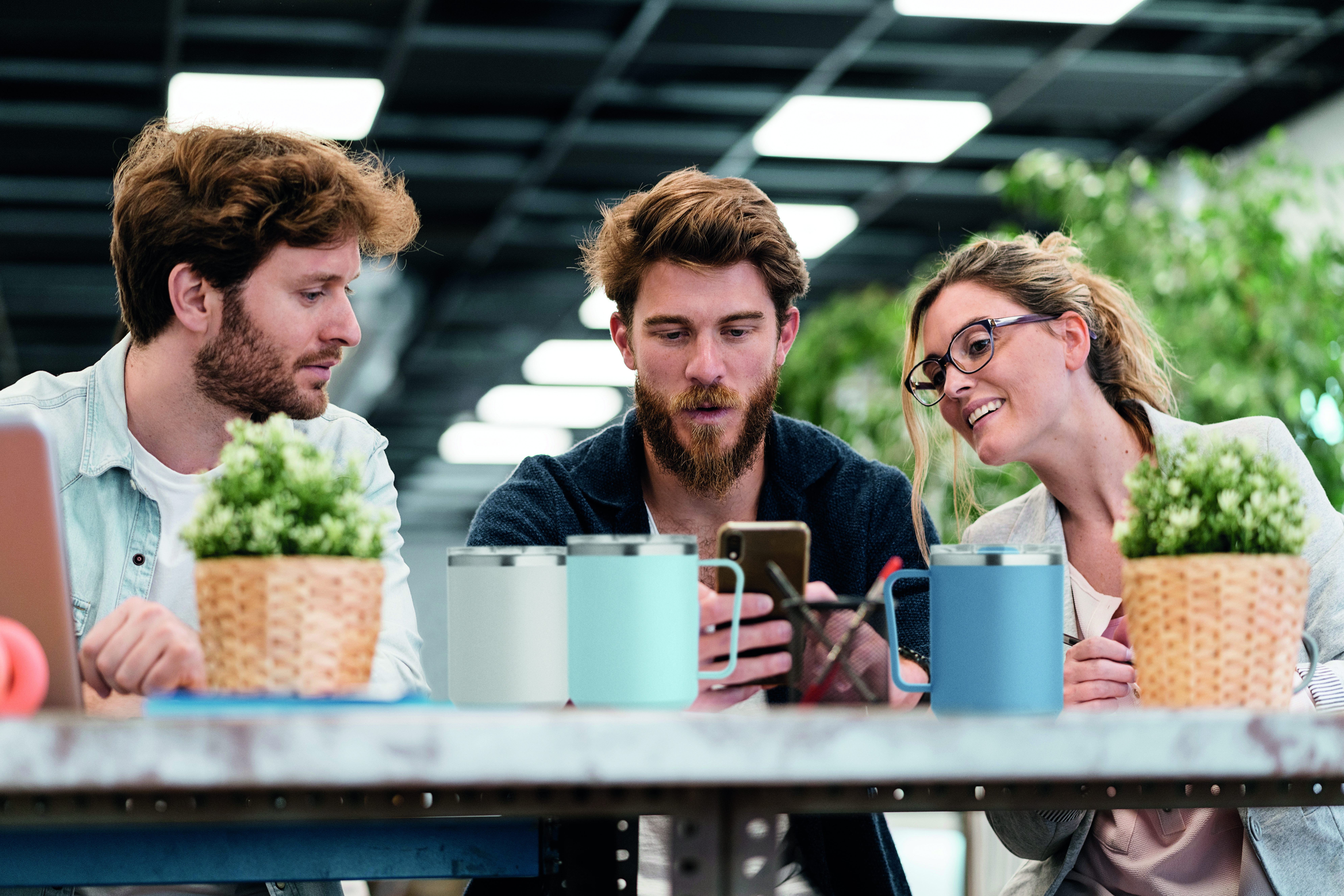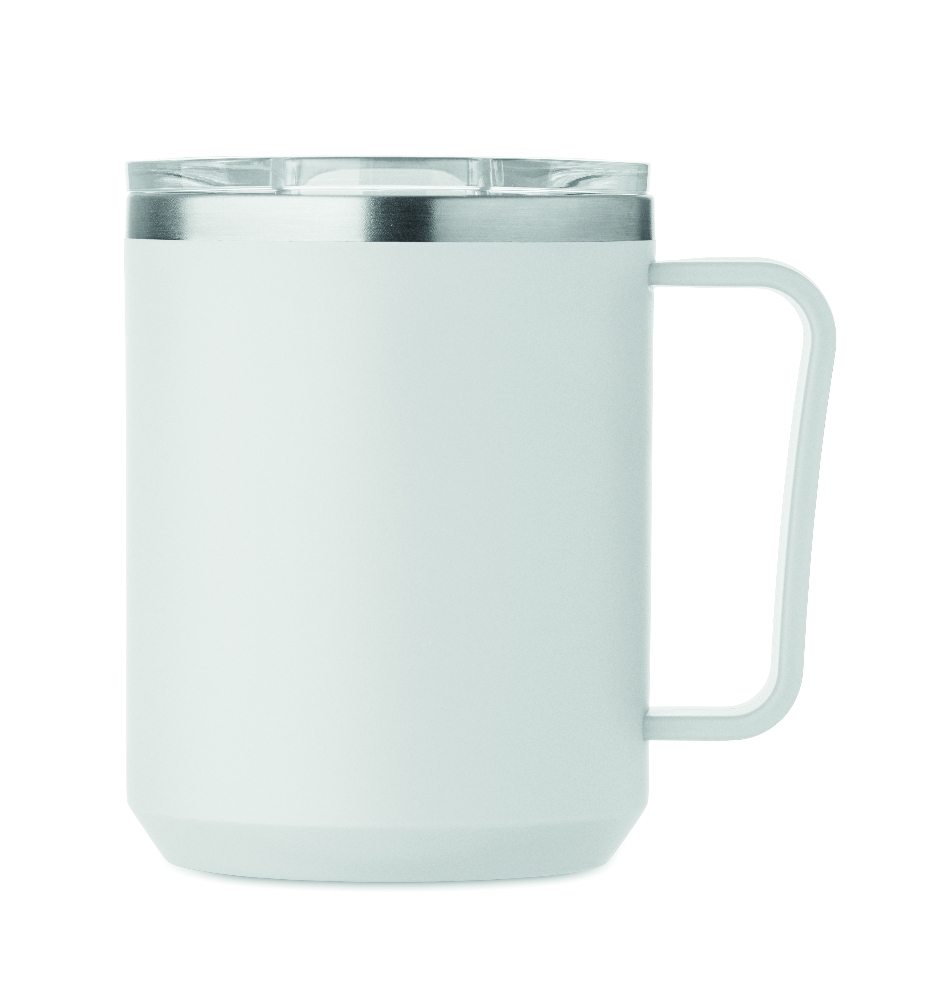 Kubek o podwójnych ściankach. Wnętrze 90% stal nierdzewna z recyklingu i 10% stal nierdzewna oraz zewnętrzna ścianka z PP z recyklingu. Ma przezroczystą pokrywkę przesuwną AS. Pojemność 400 ml.