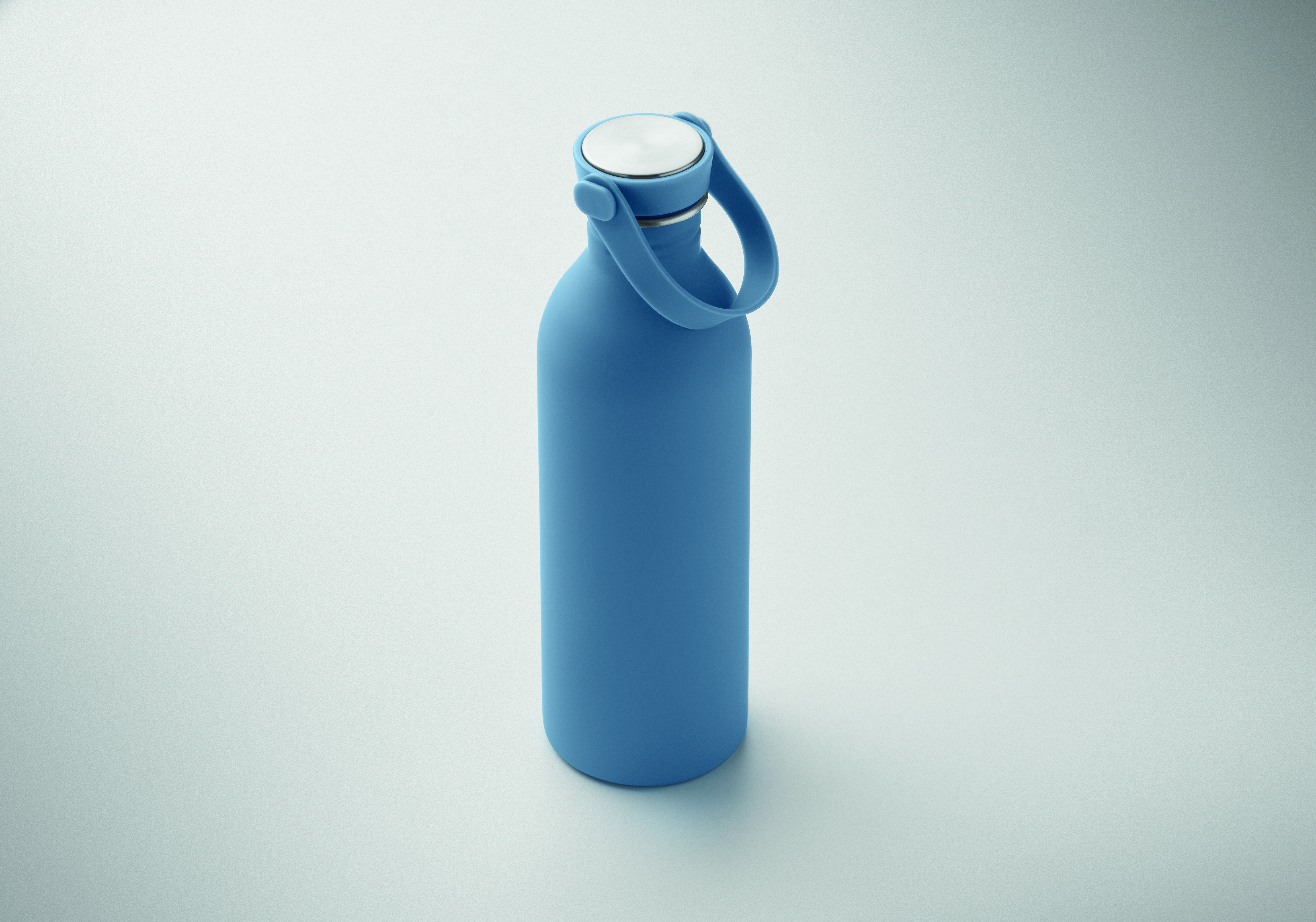 Jednościenna butelka 90% stal nierdzewna z recyklingu 10% stal nierdzewna. Gumowe wykończenie. Pokrywka z PP i SS sylikonowy uchwyt. 500 ml. Butelka jednościenna, może występować przenoszenie ciepła.