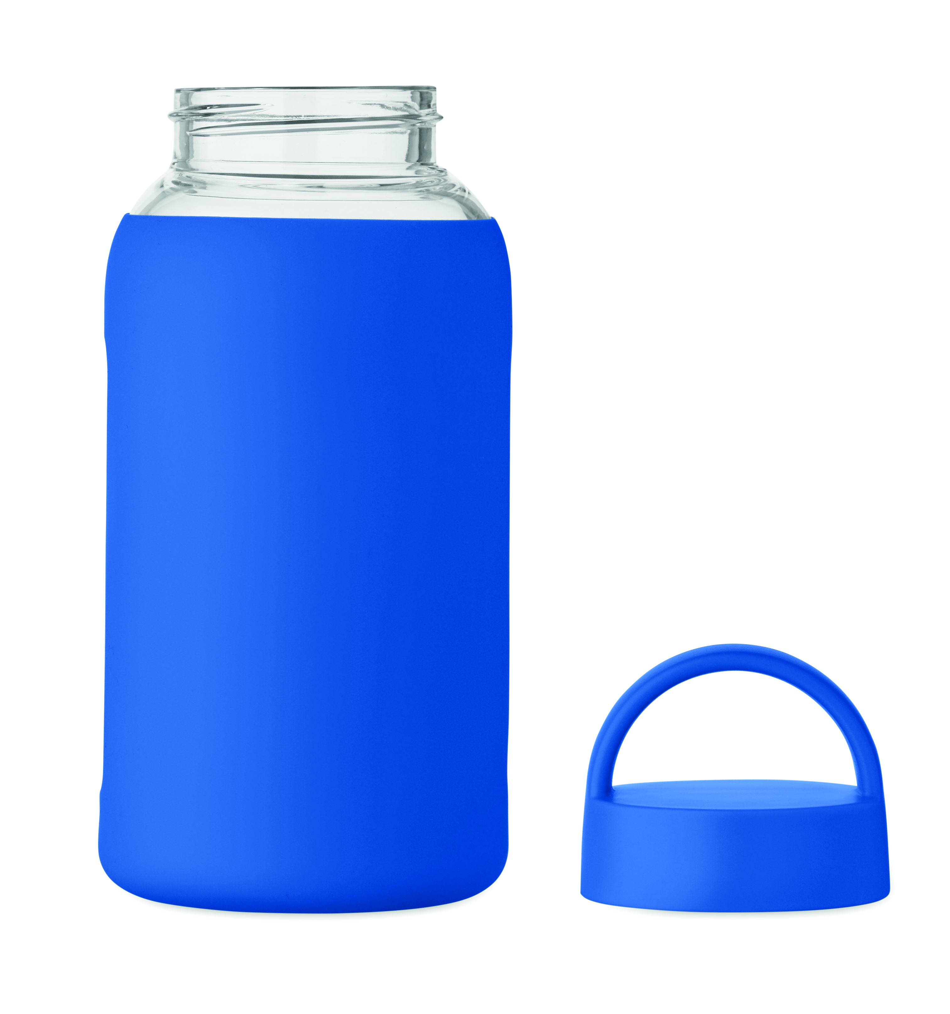 Butelka ze szkła borokrzemowego z silikonowym pokrowcem i pokrywką z PP z uchwytem. Pojemność: 600 ml