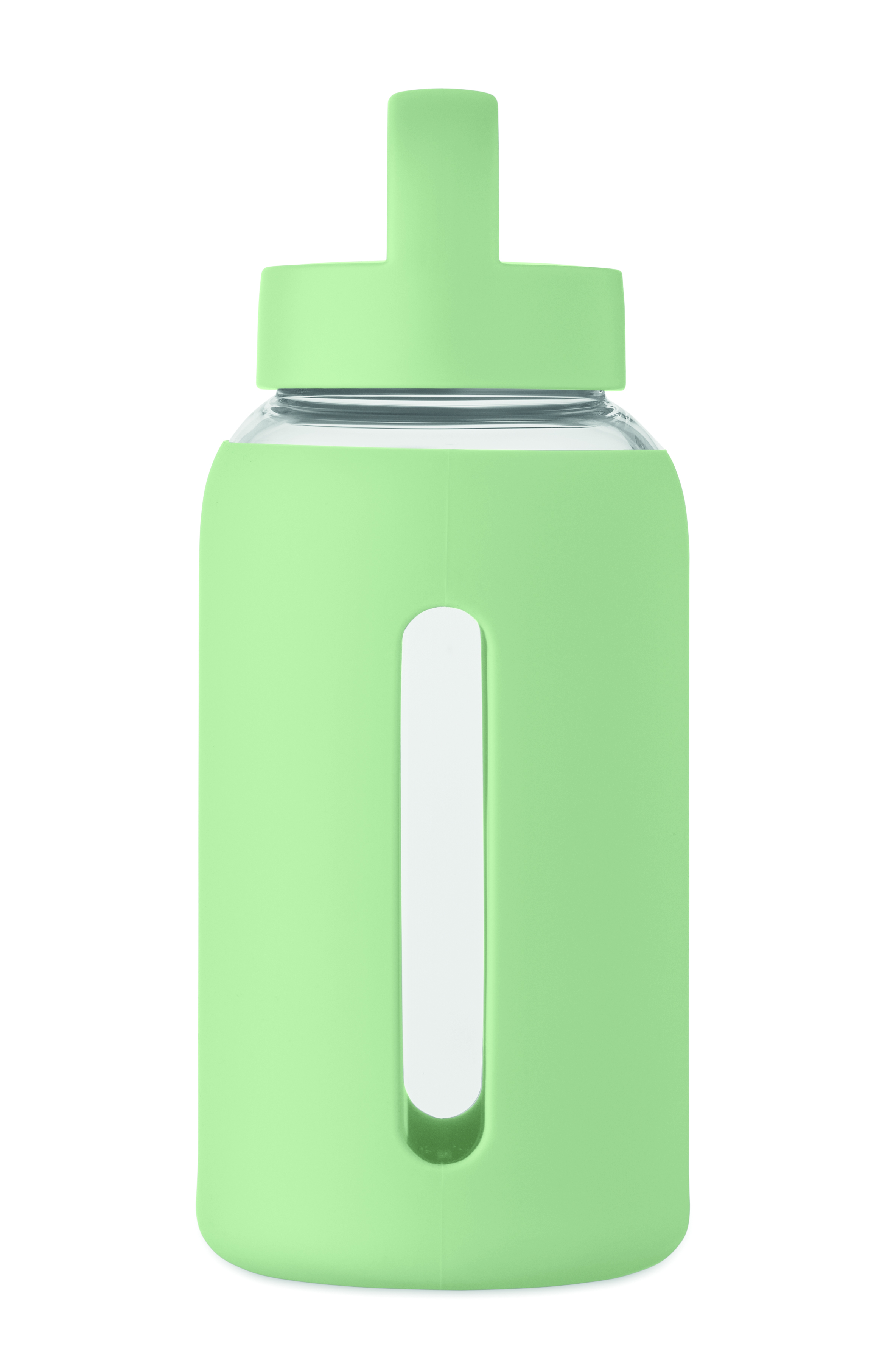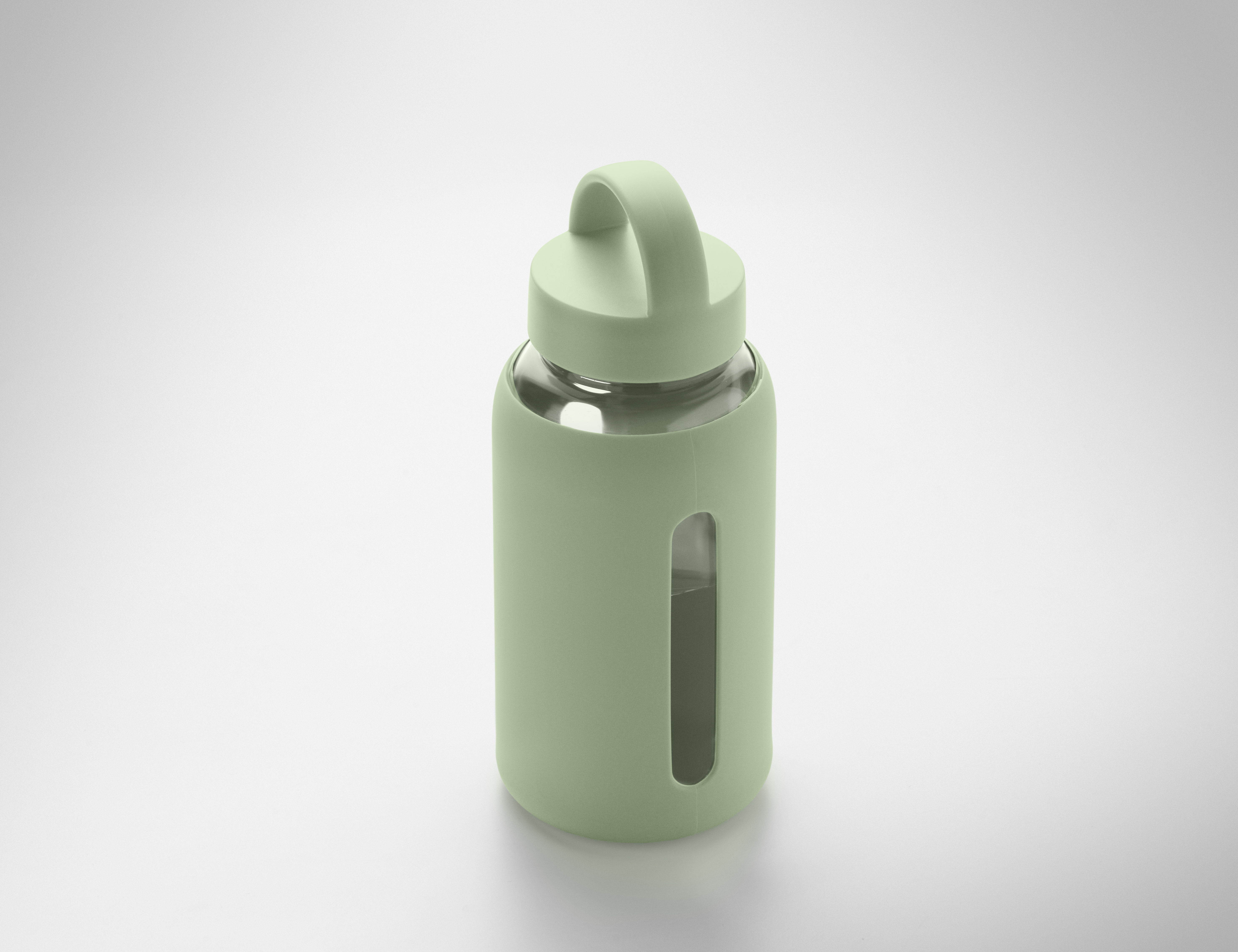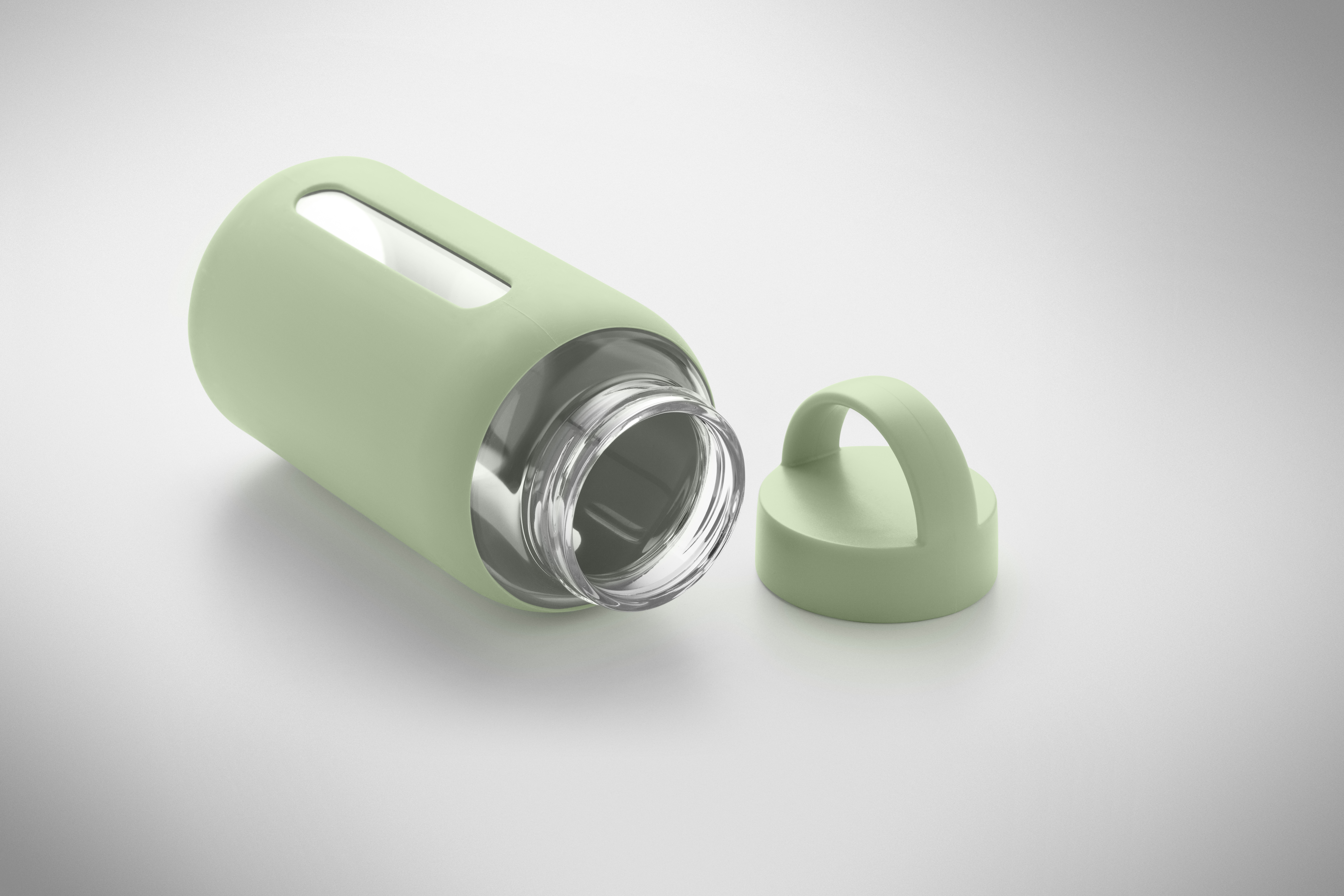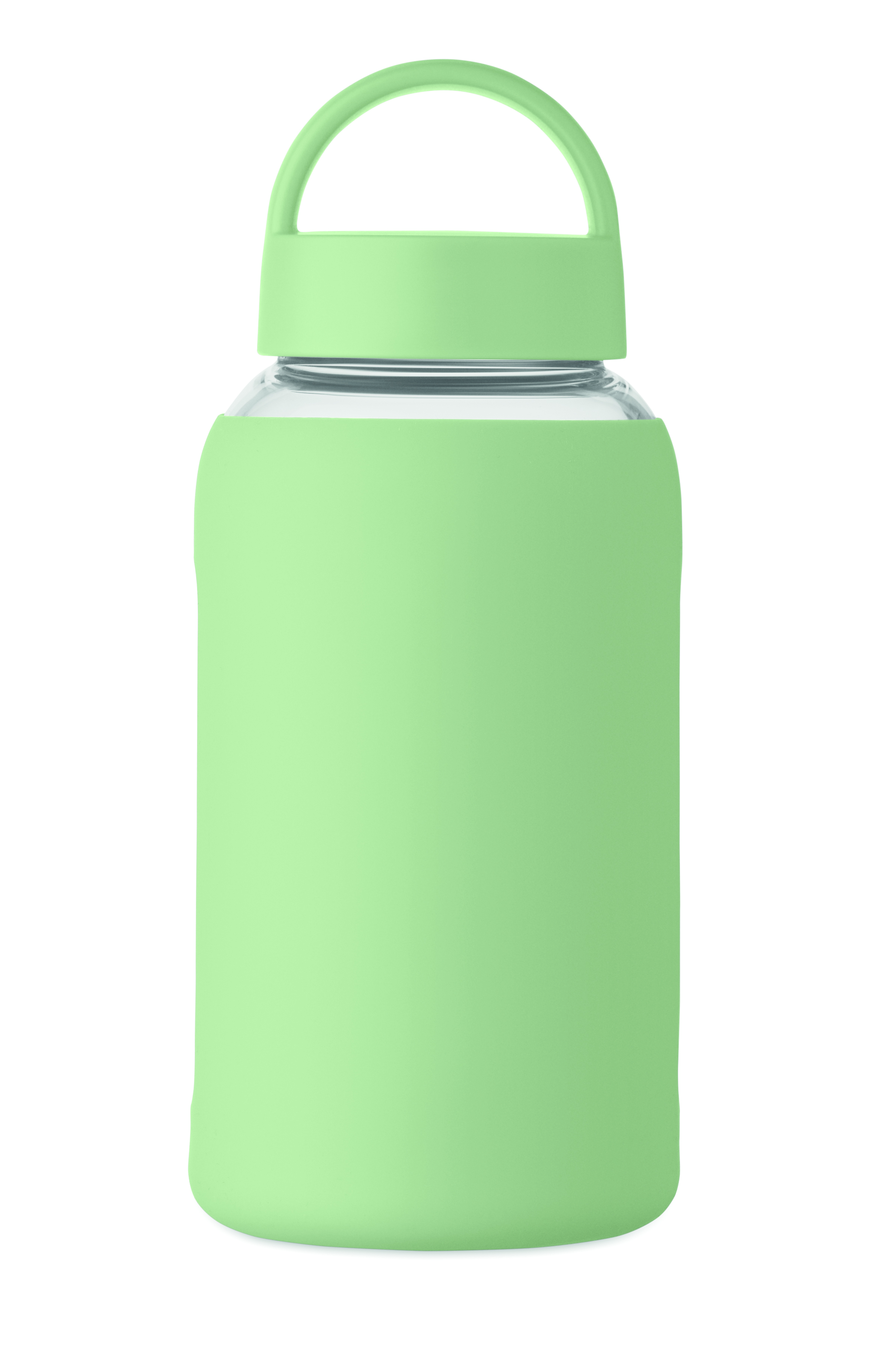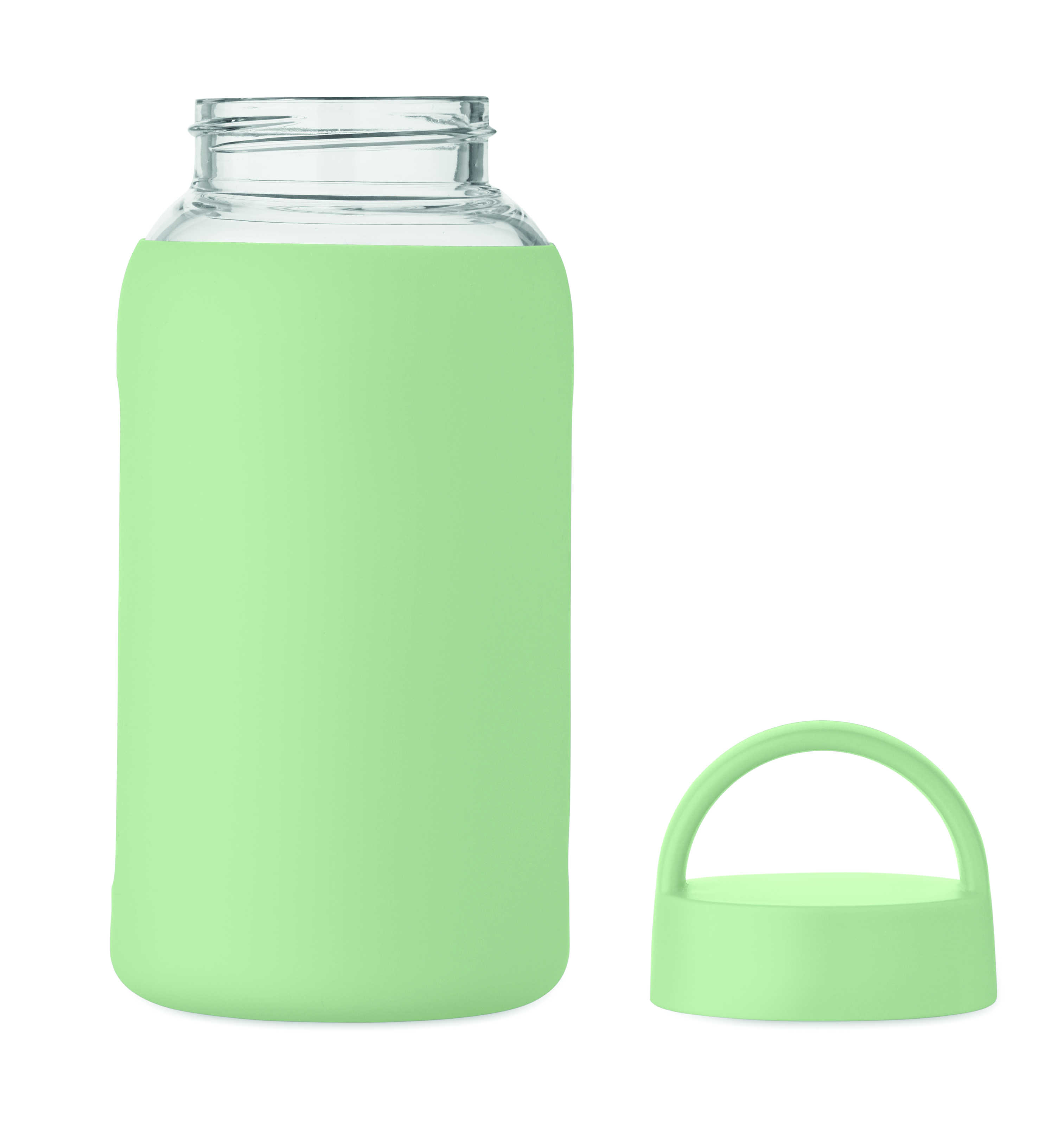 Butelka ze szkła borokrzemowego z silikonowym pokrowcem i pokrywką z PP z uchwytem. Pojemność: 600 ml