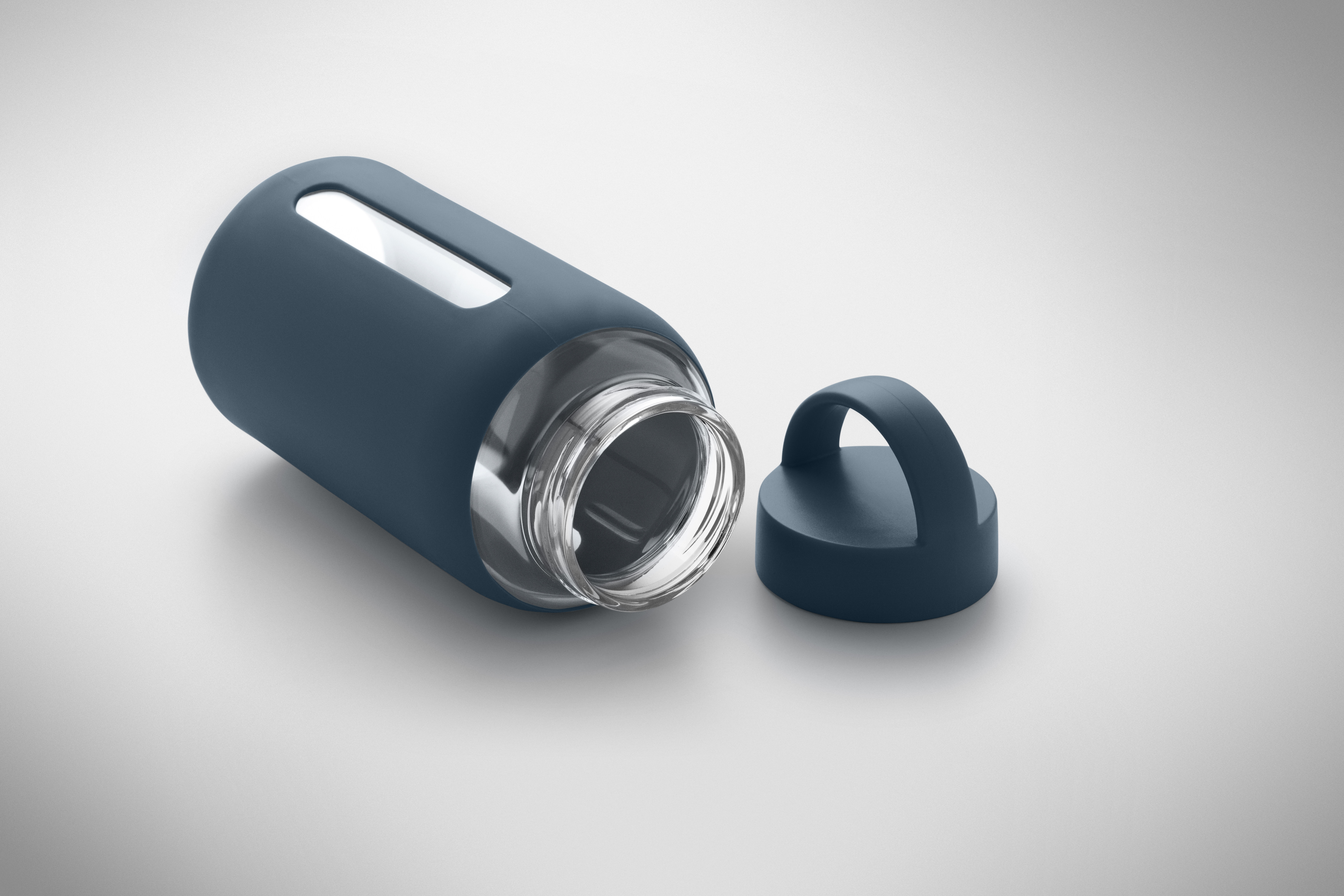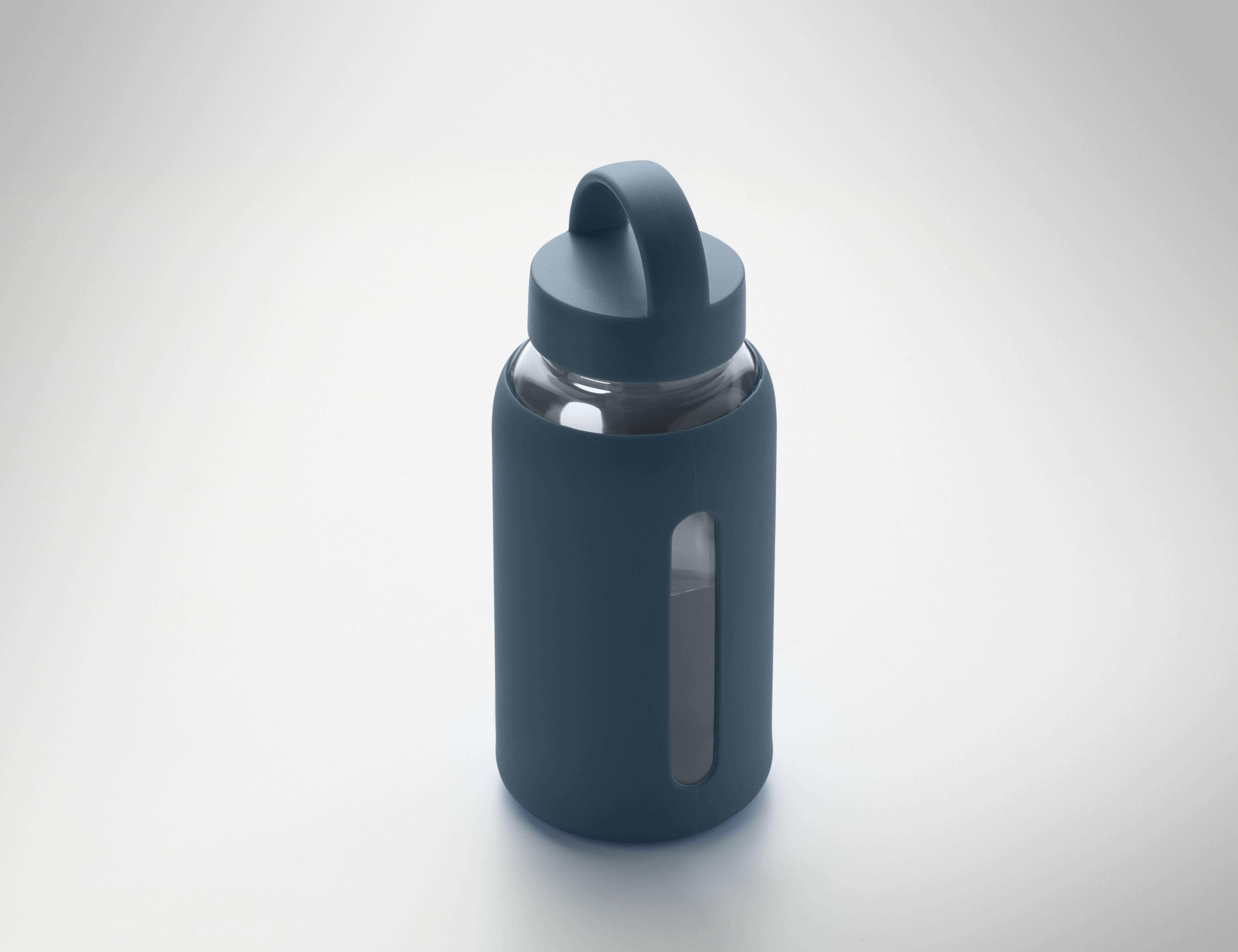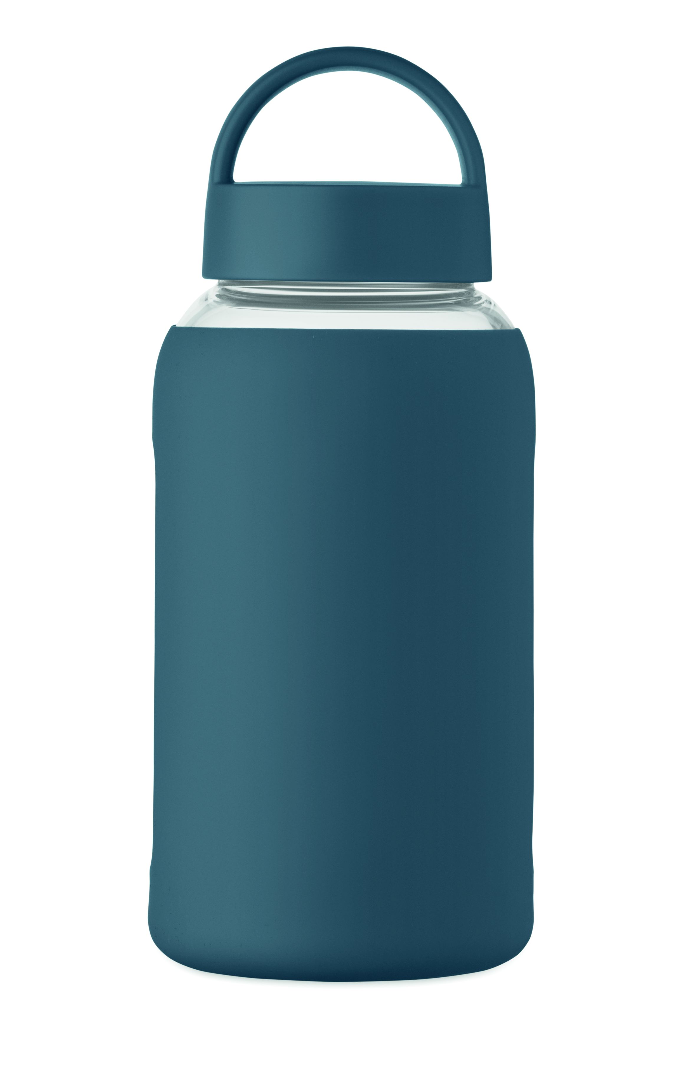 Butelka ze szkła borokrzemowego z silikonowym pokrowcem i pokrywką z PP z uchwytem. Pojemność: 600 ml