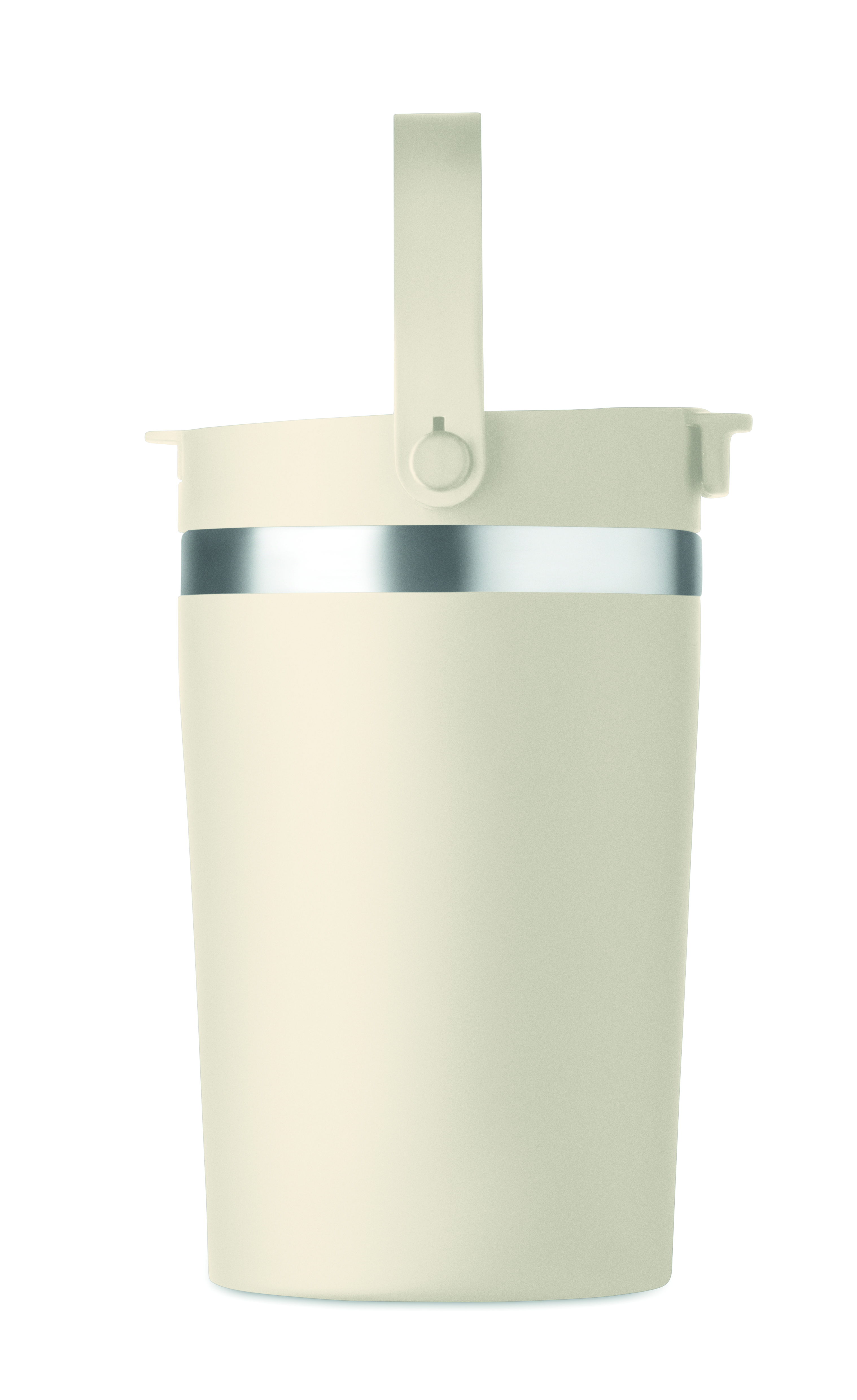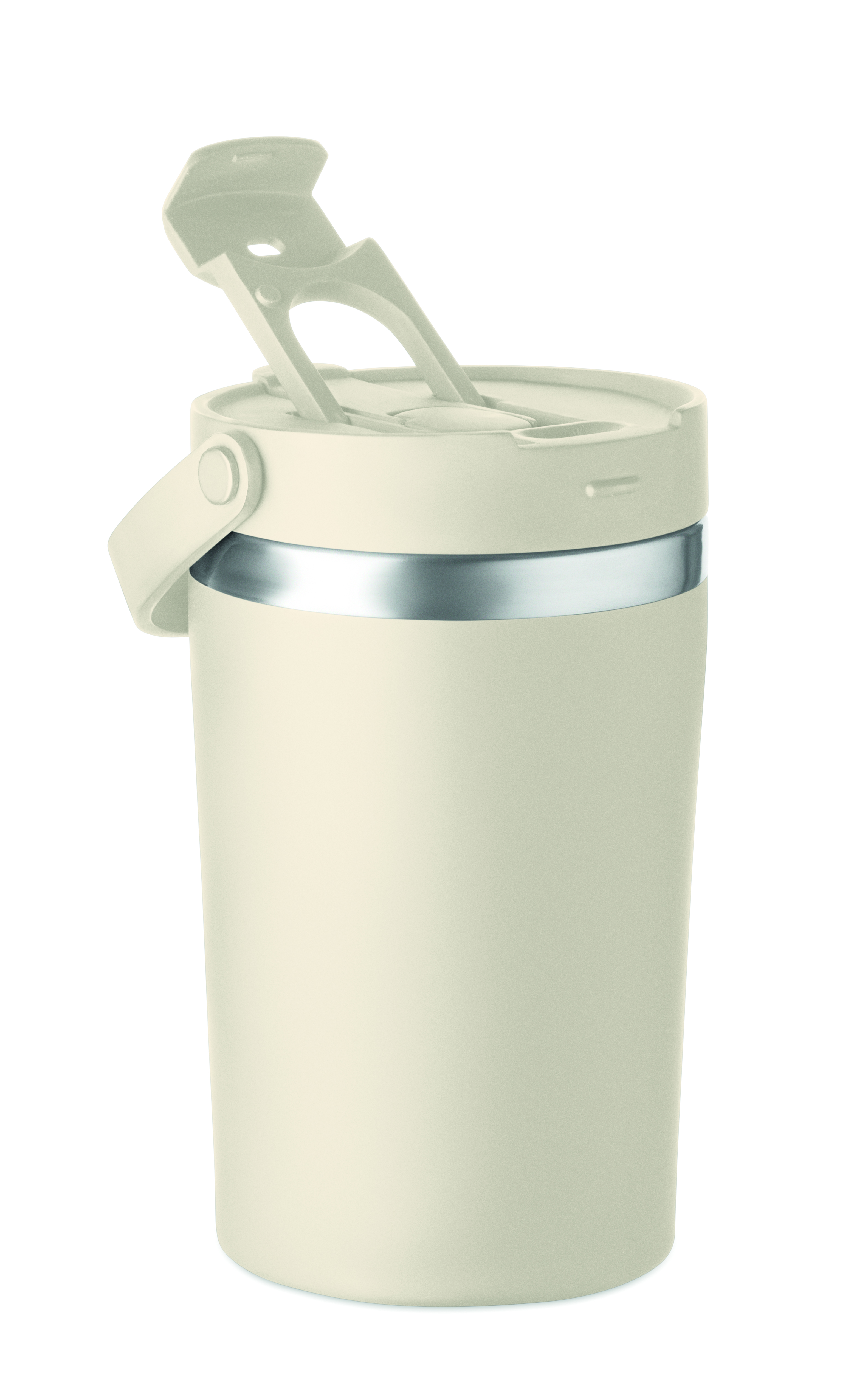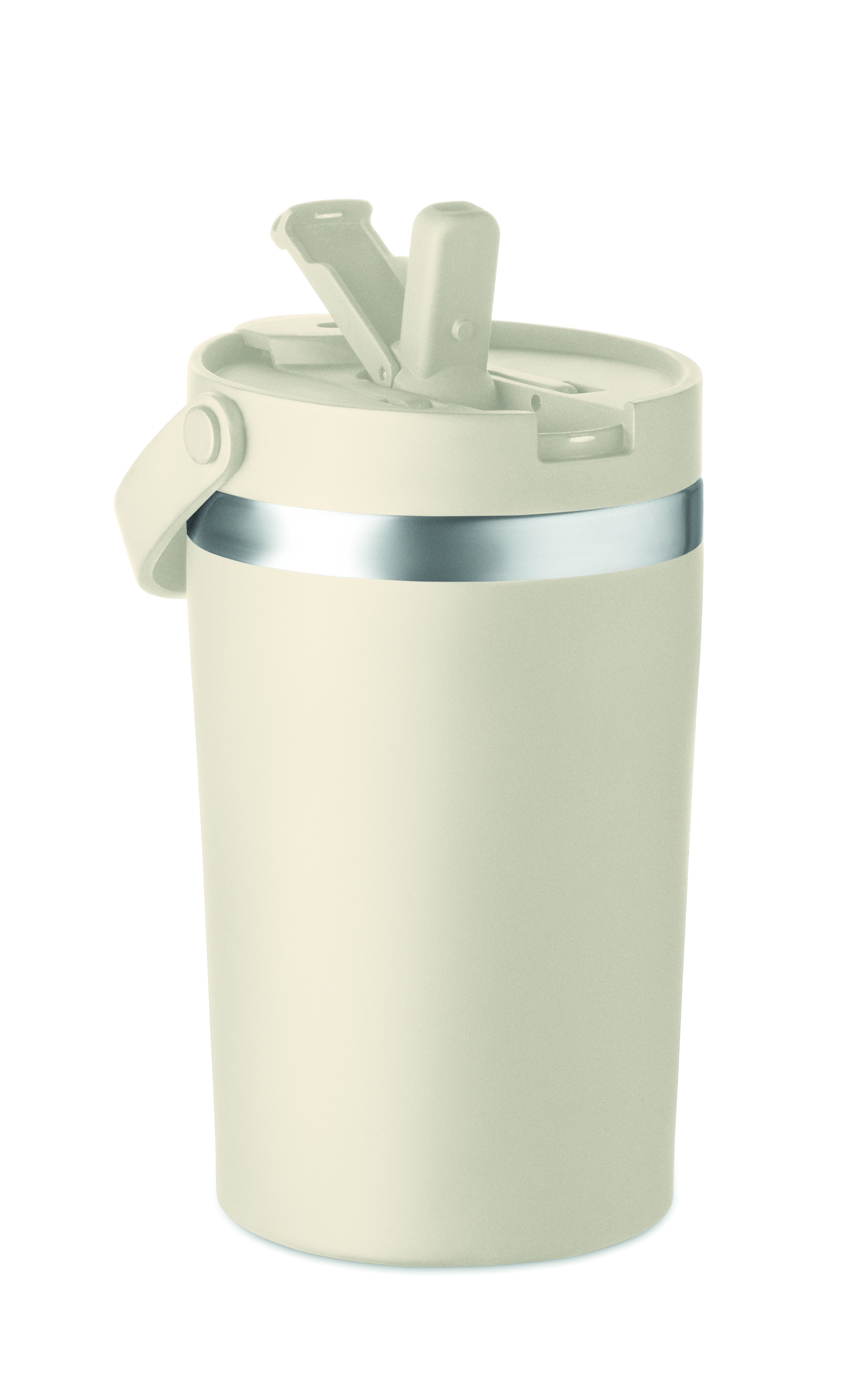 Dwuścienny kubek ze stali nierdzewnej (90% stal nierdzewna z recyklingu i 10% stal nierdzewna) z pokrywką z PP 2 w 1 i słomką oraz paskiem z RPET. Nie przecieka i jest wytrzymały. Pojemność: 350 ml.