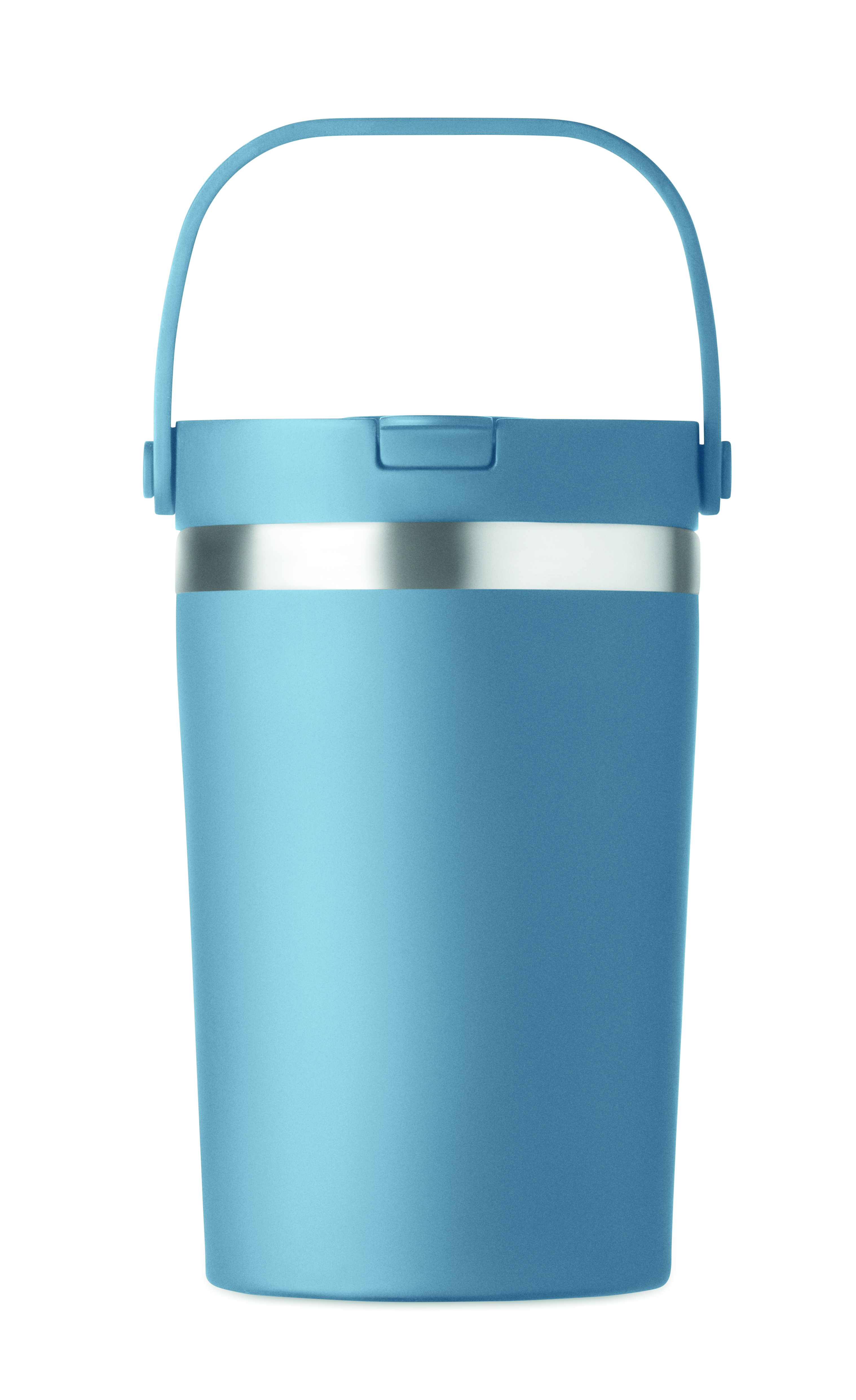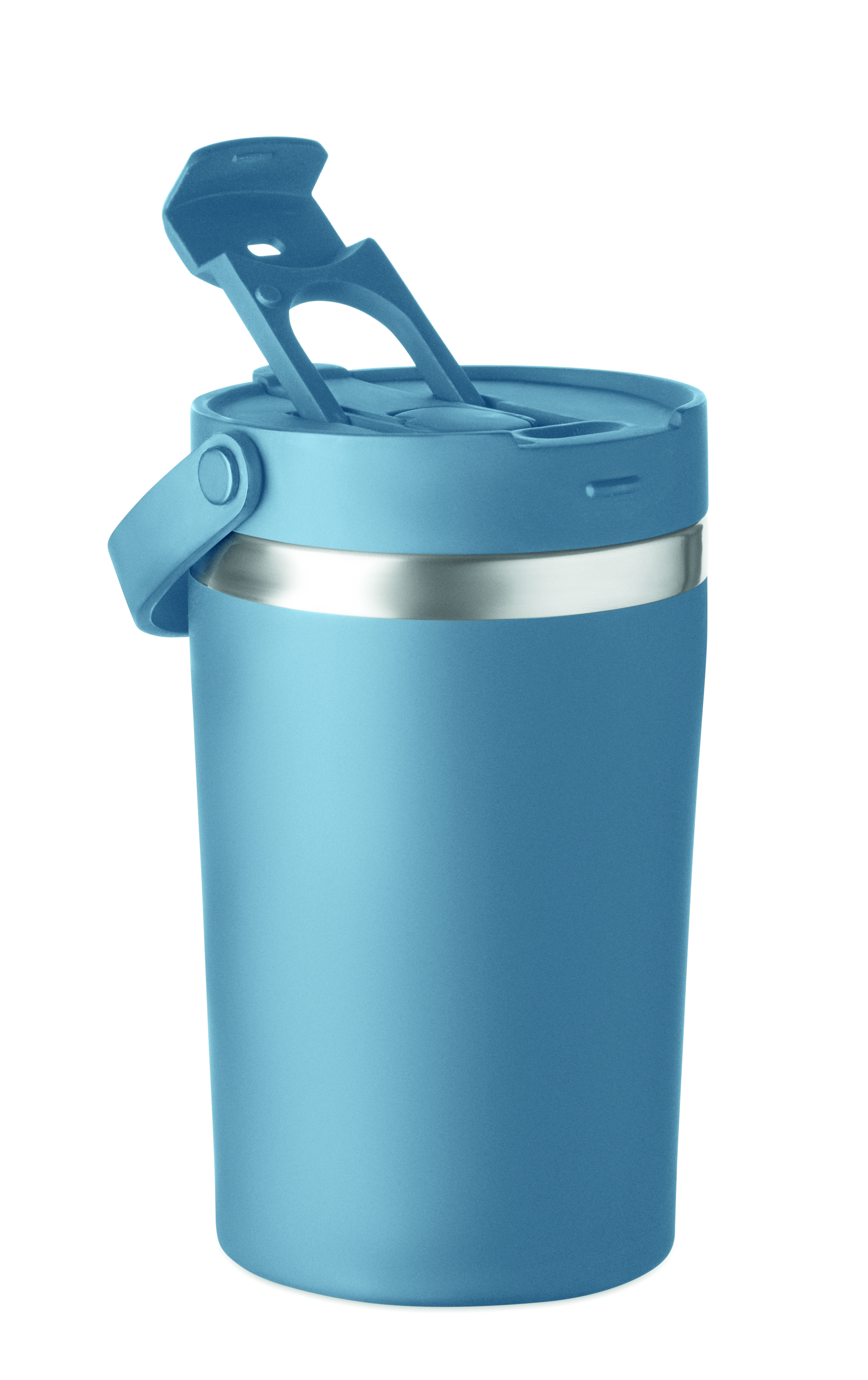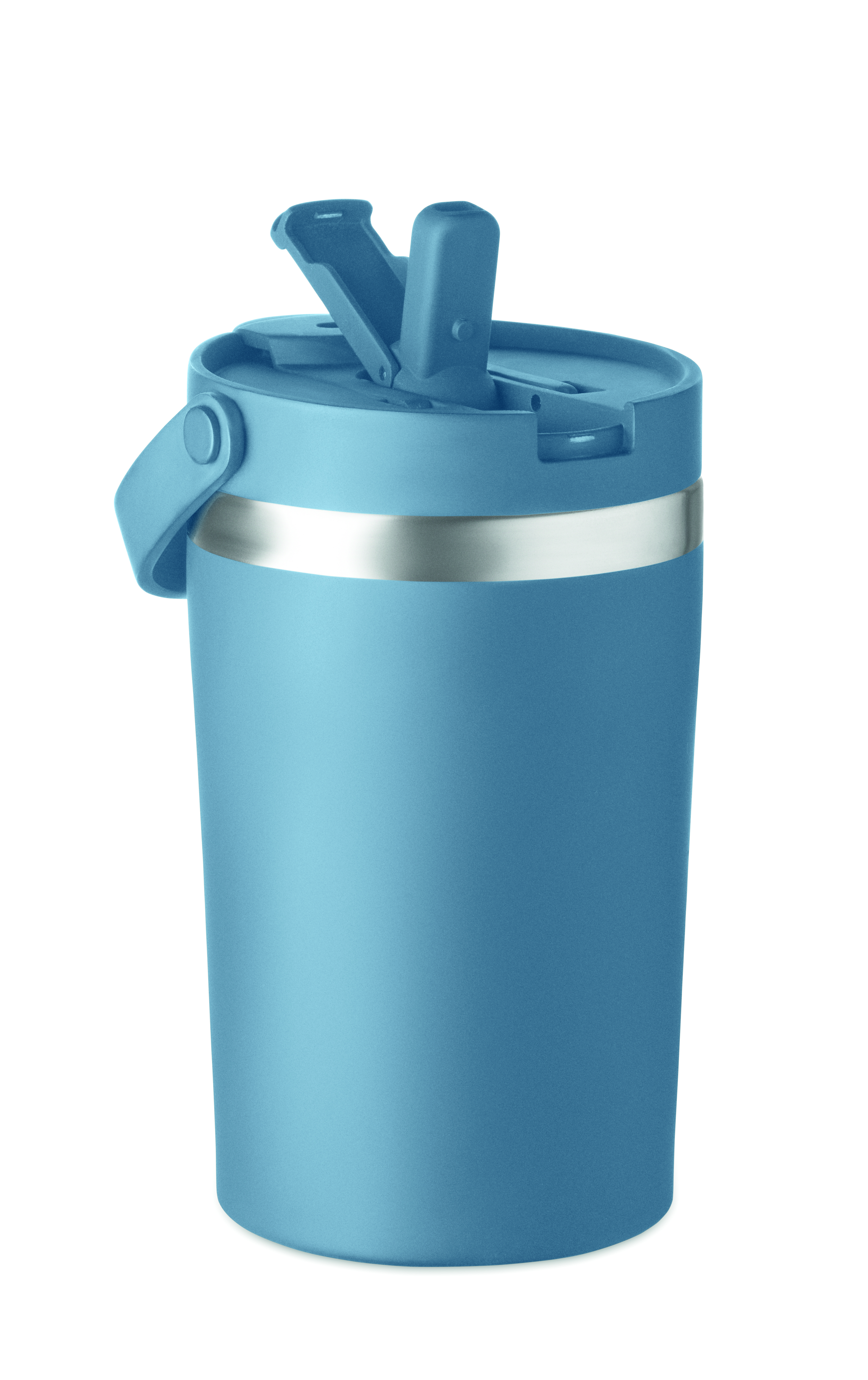 Dwuścienny kubek ze stali nierdzewnej (90% stal nierdzewna z recyklingu i 10% stal nierdzewna) z pokrywką z PP 2 w 1 i słomką oraz paskiem z RPET. Nie przecieka i jest wytrzymały. Pojemność: 350 ml.